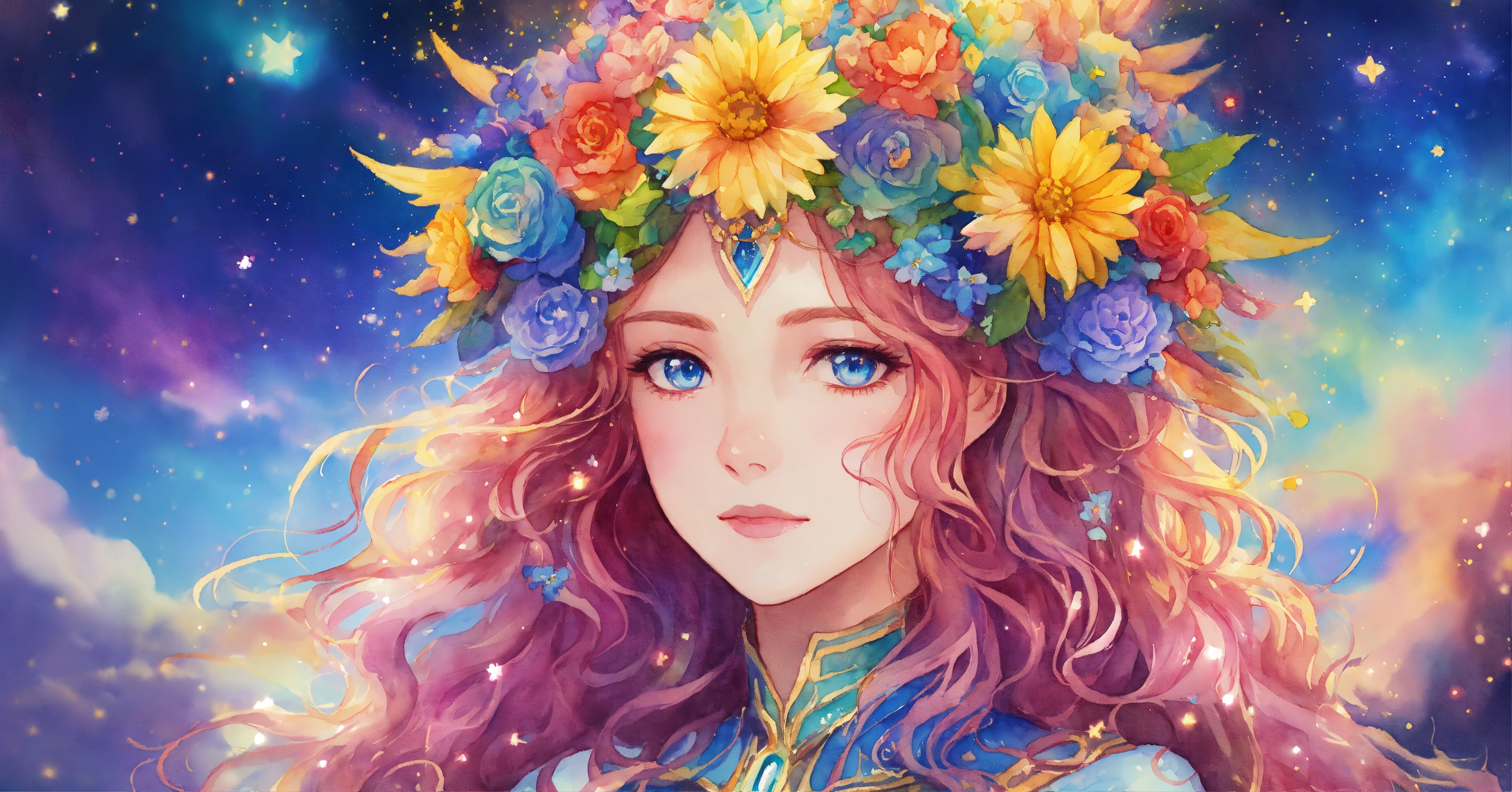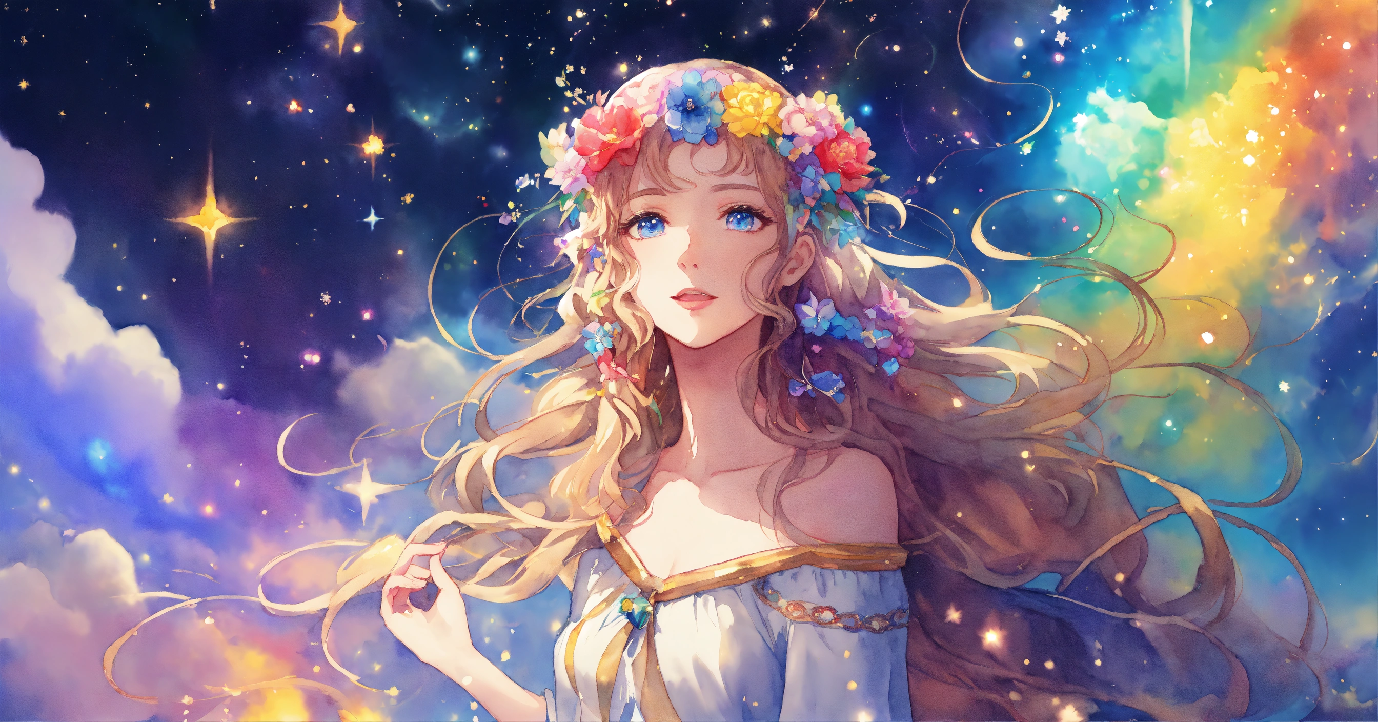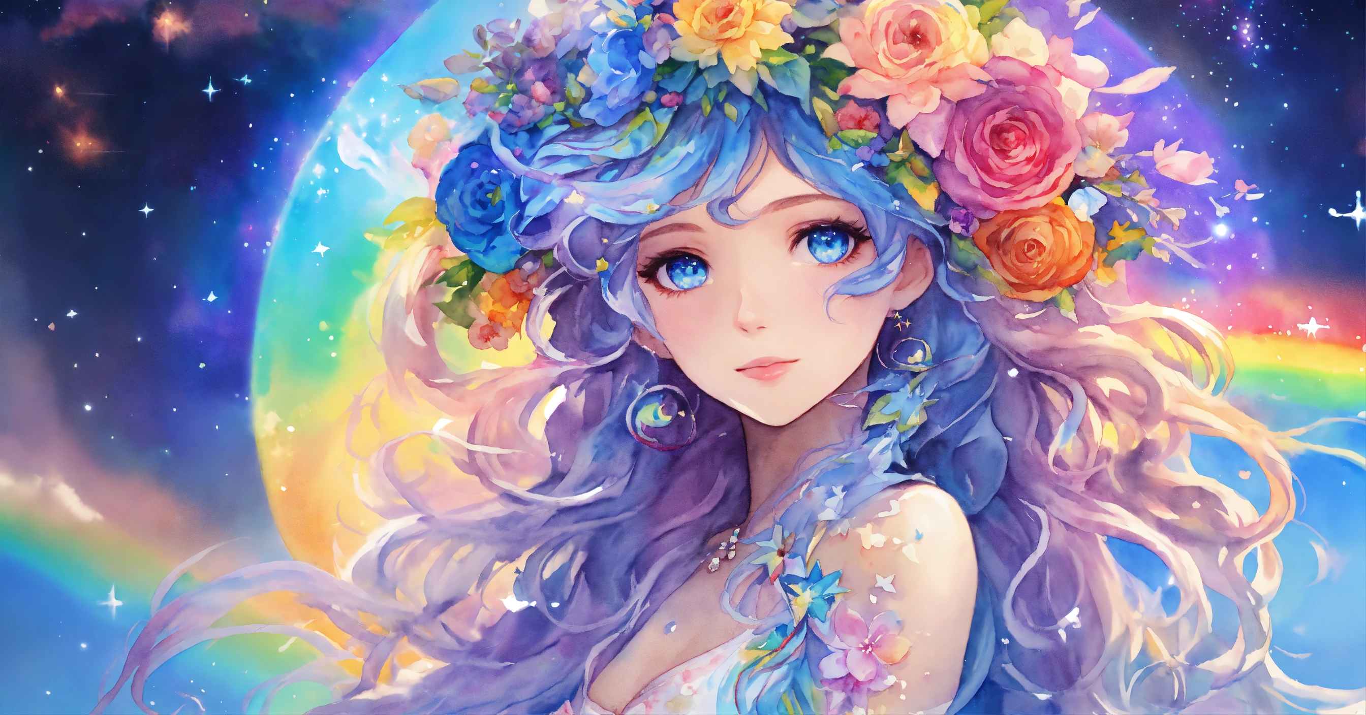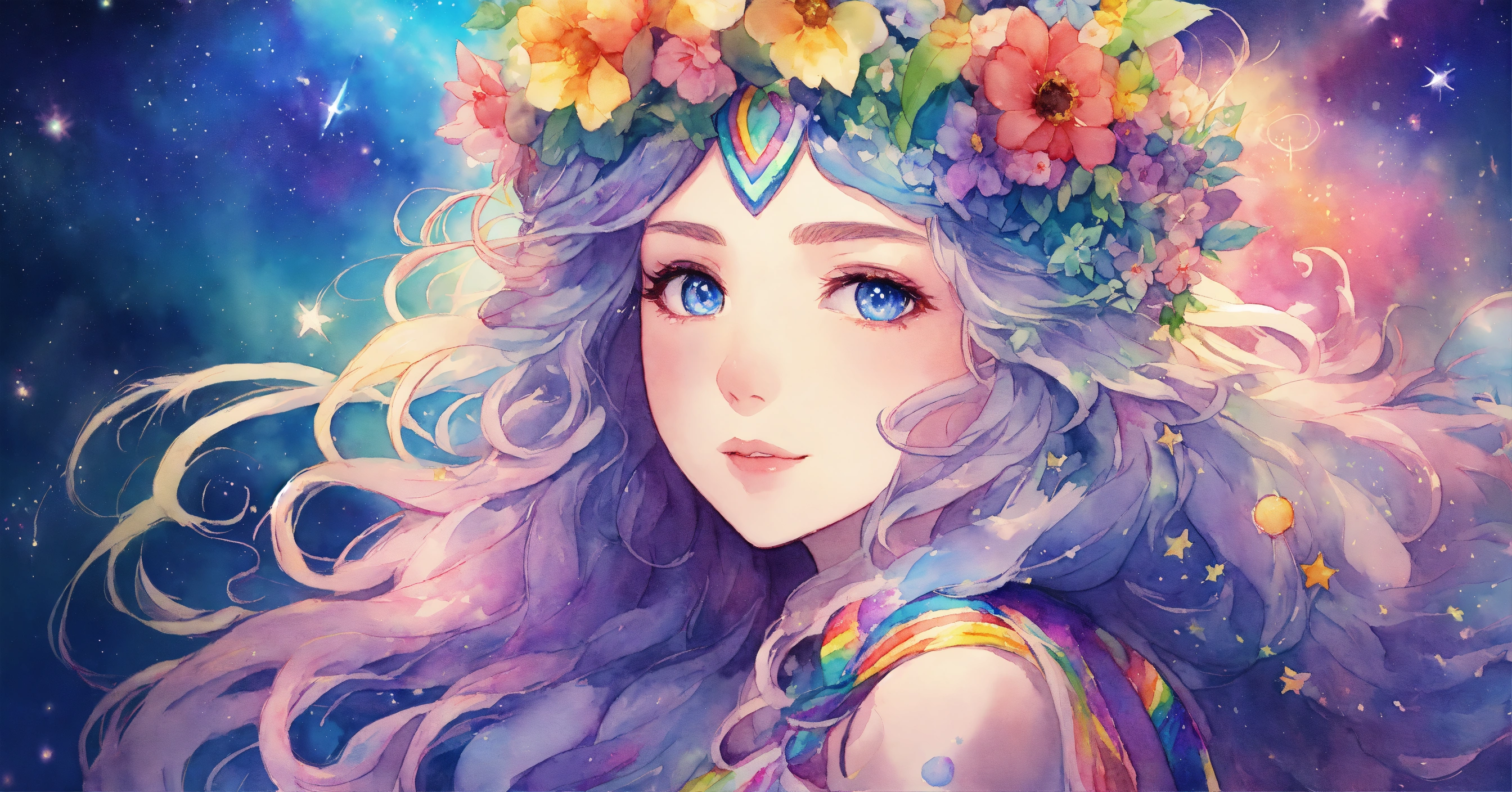 Watercolor of rainbow anime, beautiful angel, from far away, stars and space, in a magical land, blue eyes, long curly hair, wearing a flower crown, rainbow vibrant colors, in space, stars, cosmic, floral design, vulmetric lighting, 8k resolution, highly detailed