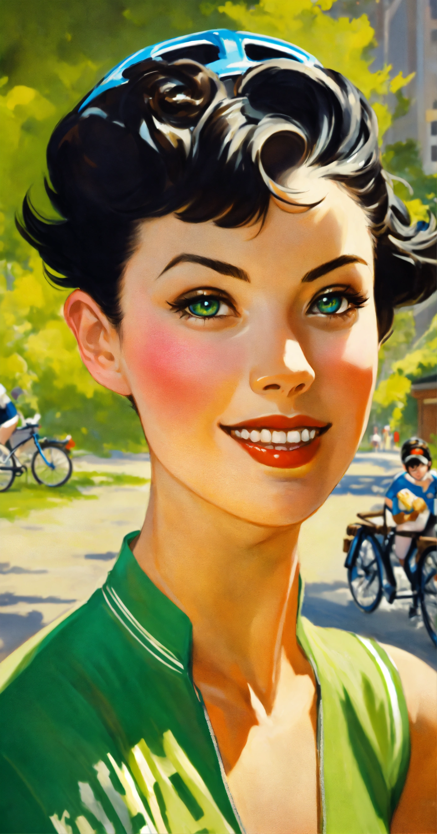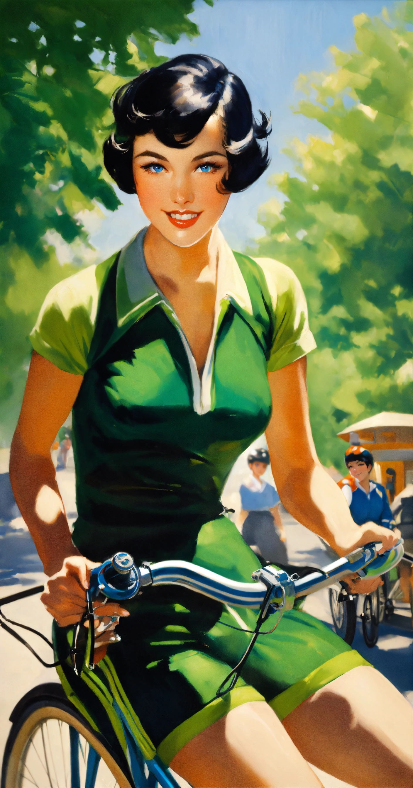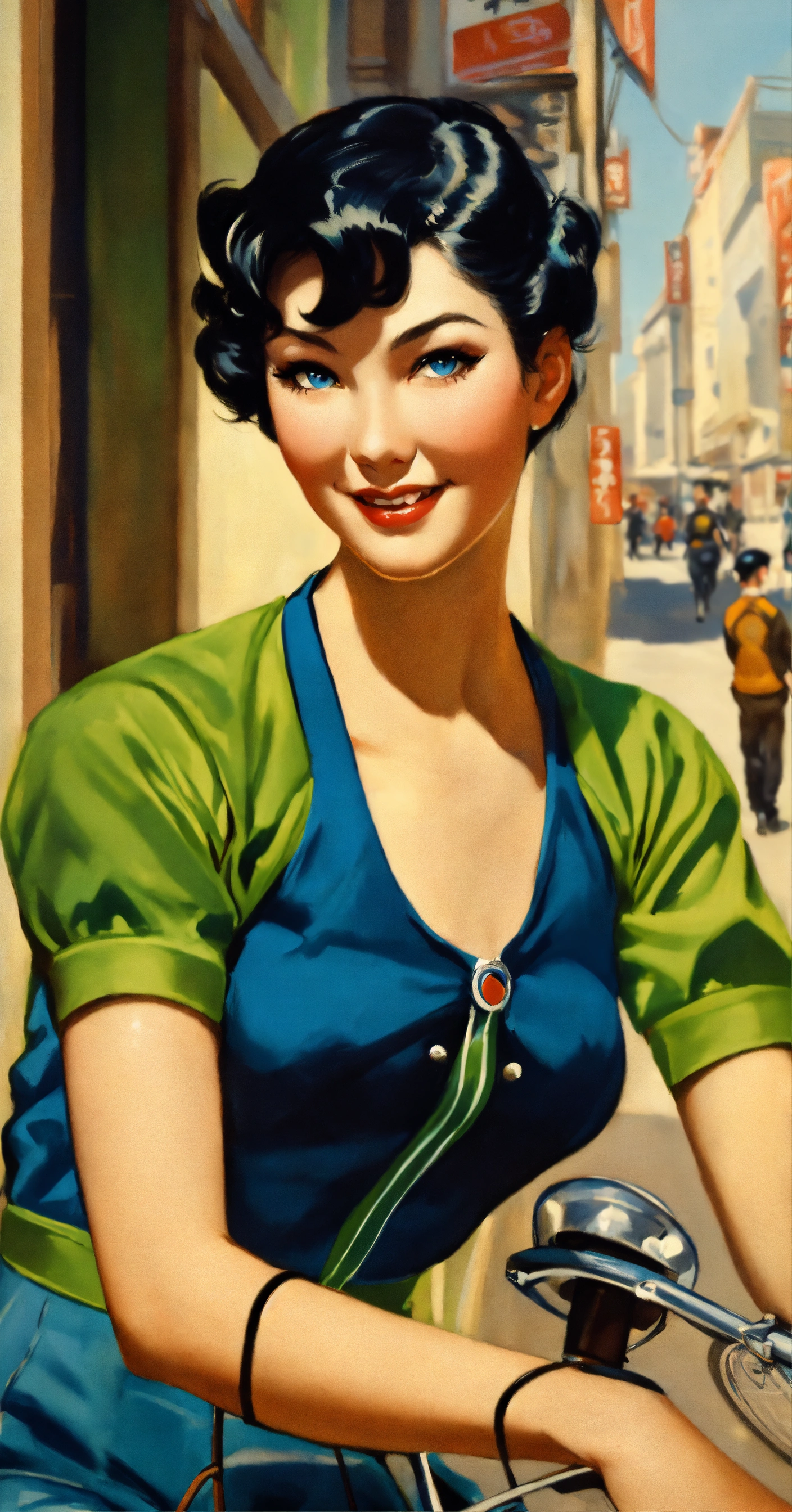 Gil elvgren art style, of a beautiful young cyclist woman, with short pixie style black hair, blue eyes, winking eyes, black and green cyclist jersey, in japan street, no bicycle, half body