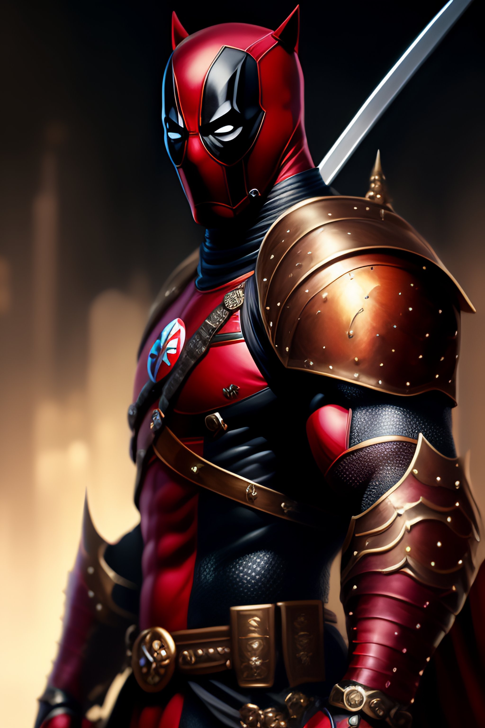 Full body potrait extremely muscular deadpool medieval knight portrait, fantasy, intricate, elegant, highly detailed, digital painting, artstation, concept art, smooth, sharp focus, illustration, art by artgerm and greg rutkowski and alphonse mucha