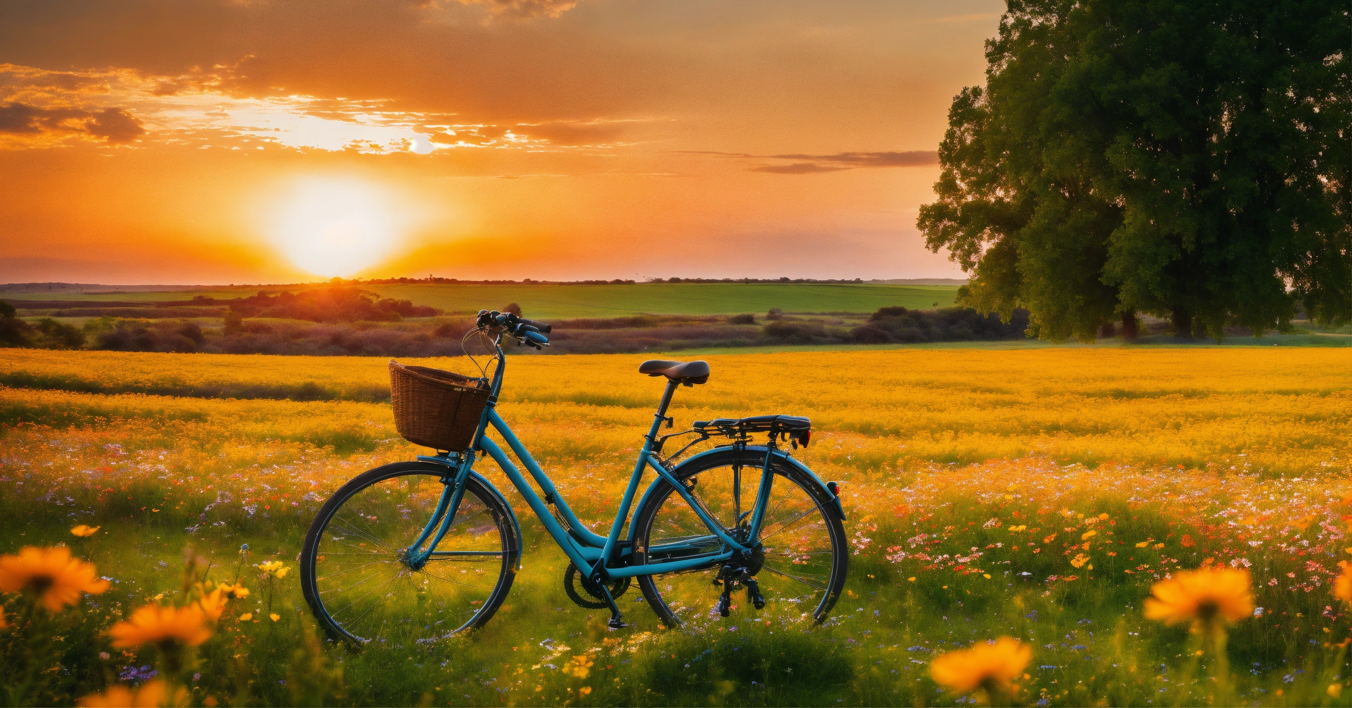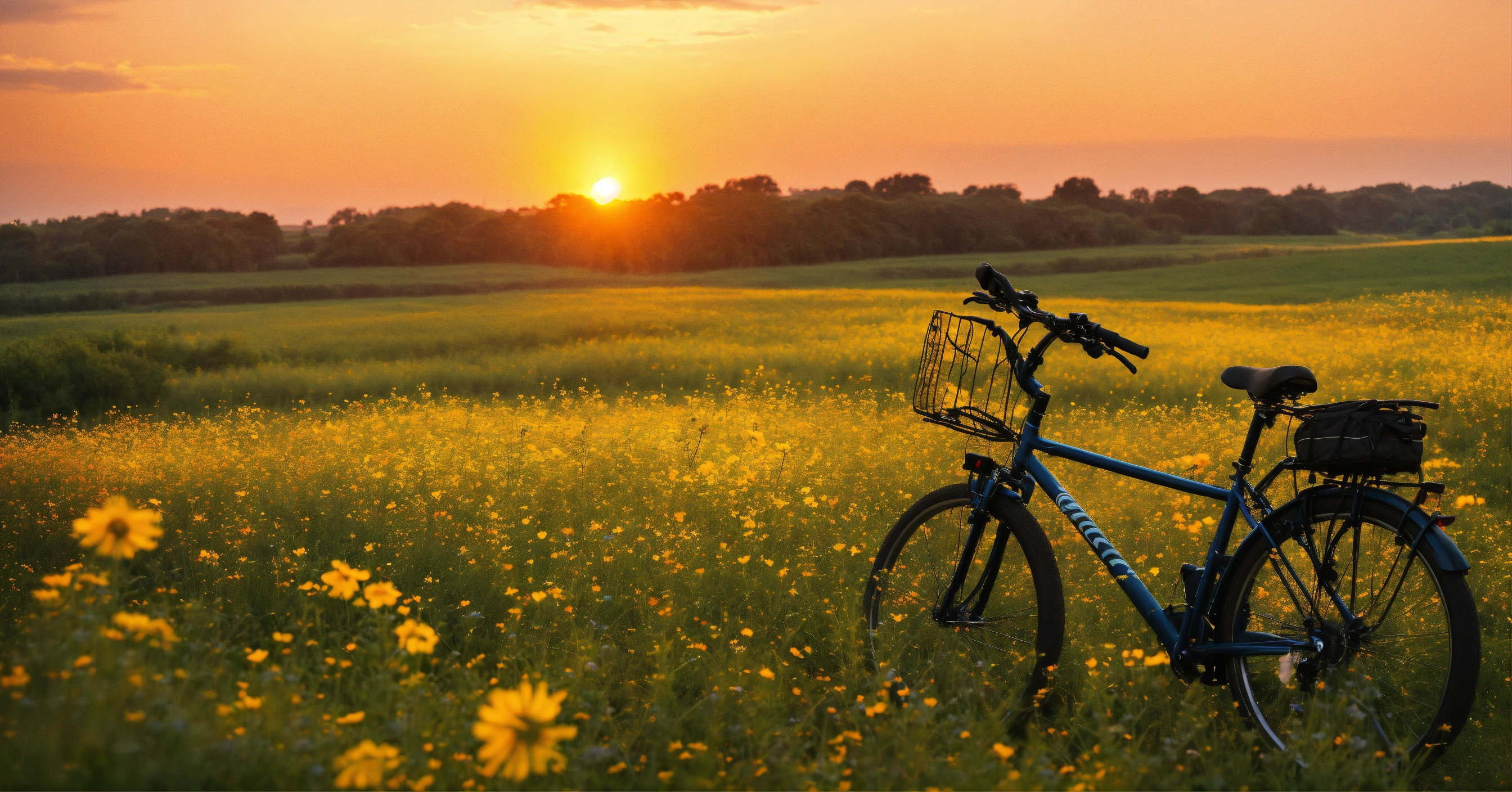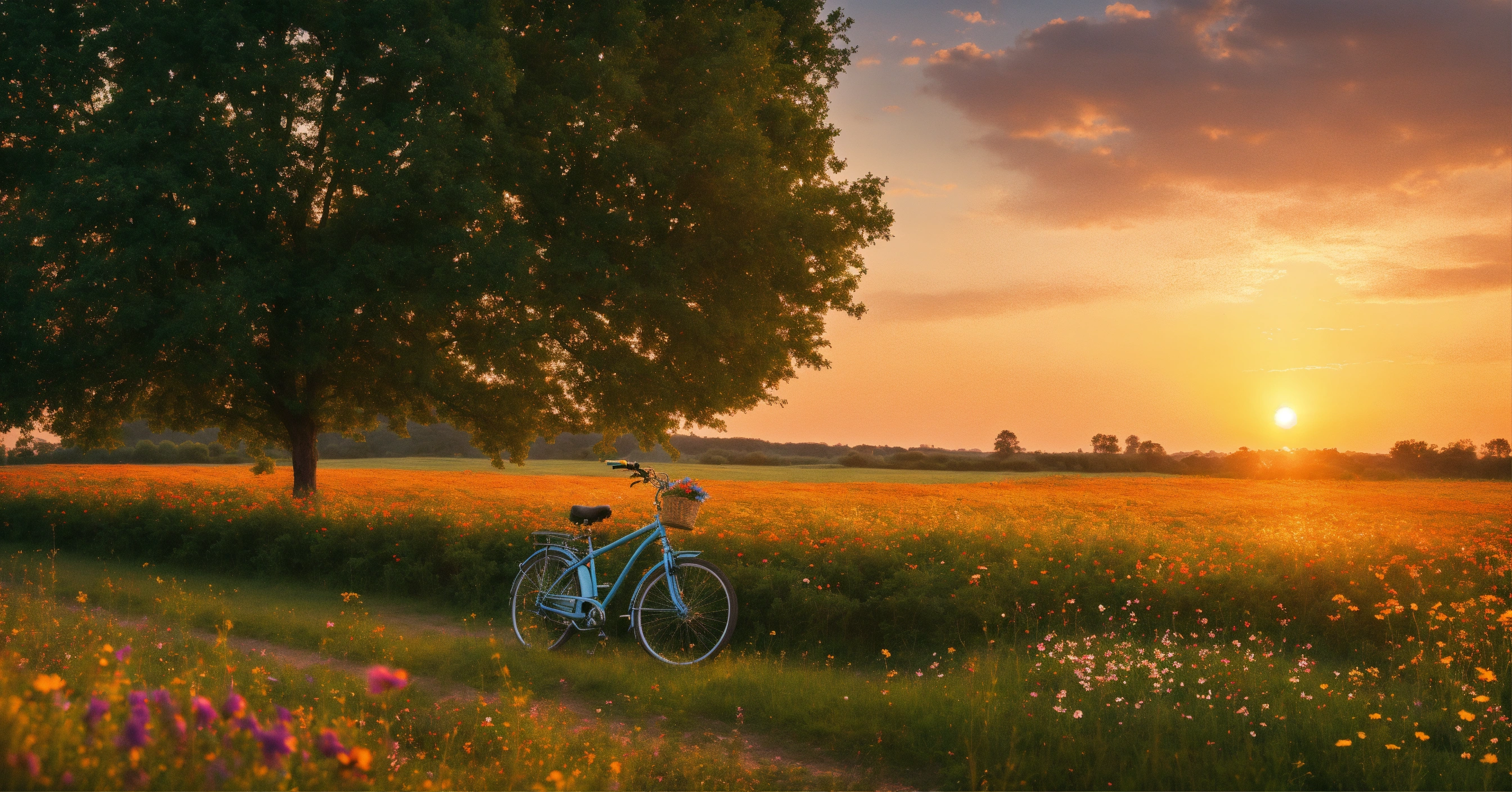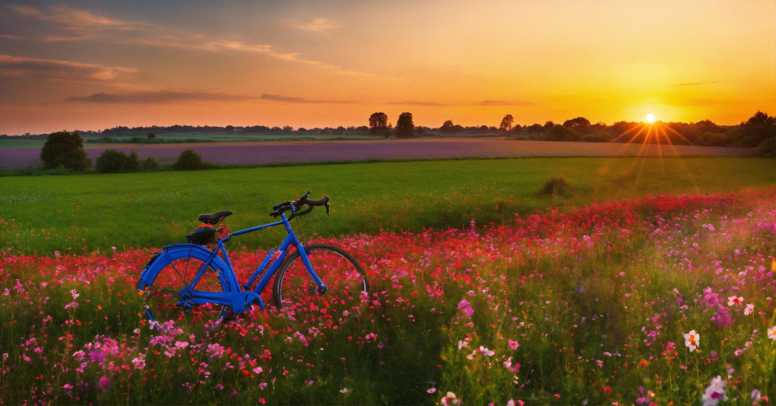 Beautiful field with wild flowers landscape image with bicycle at sunset, perfect compostion, high quality photo, volumetric smooth light, high resolution photo