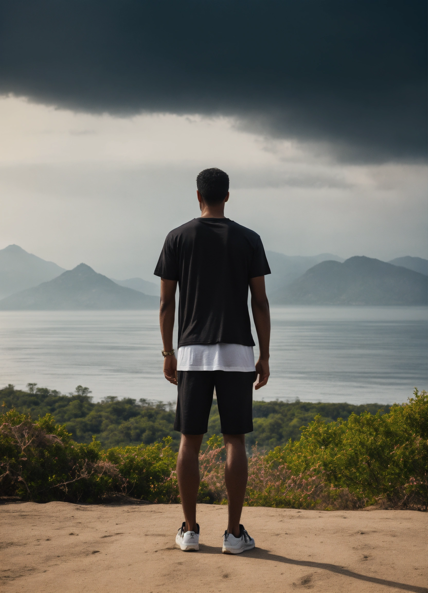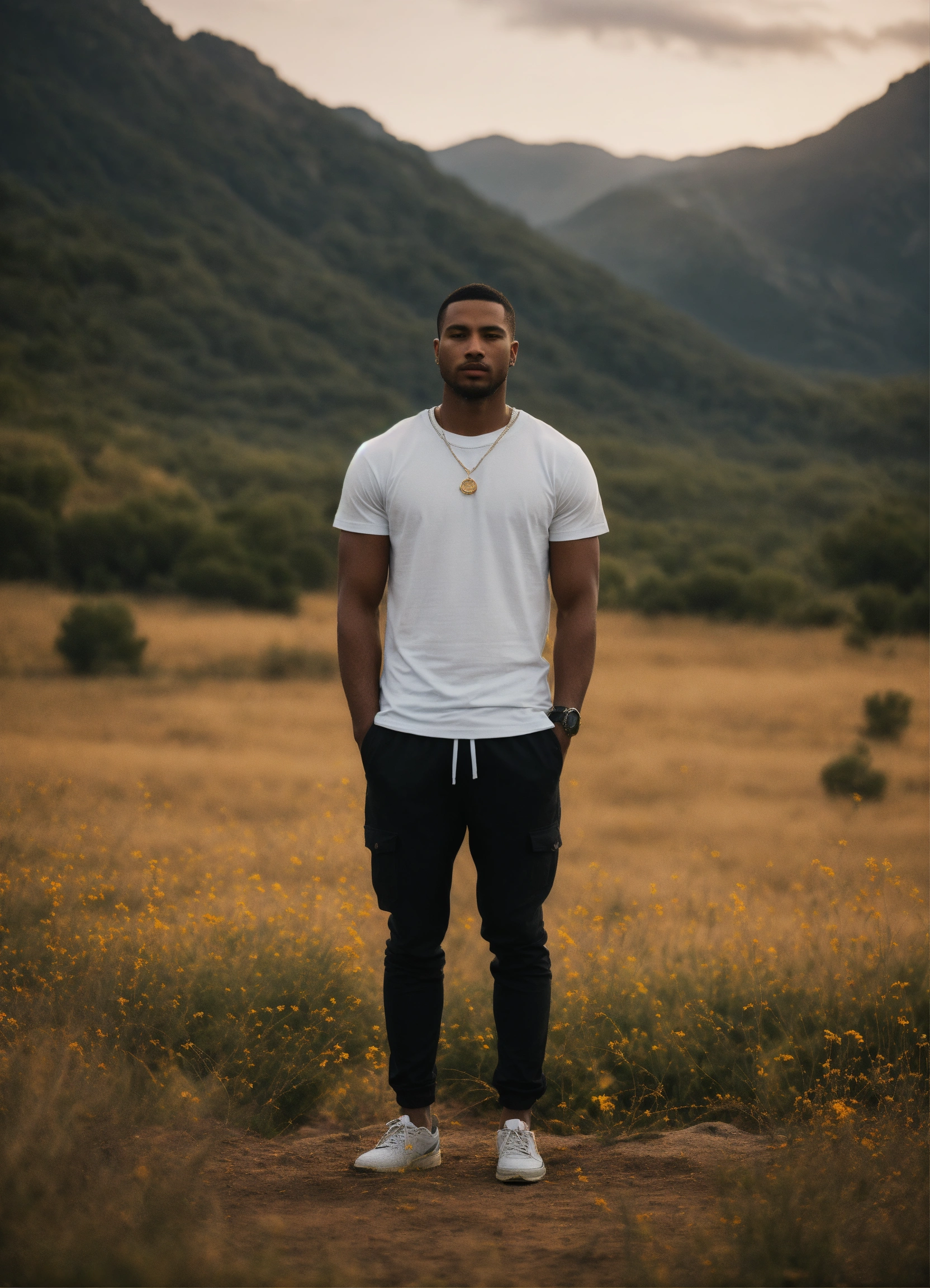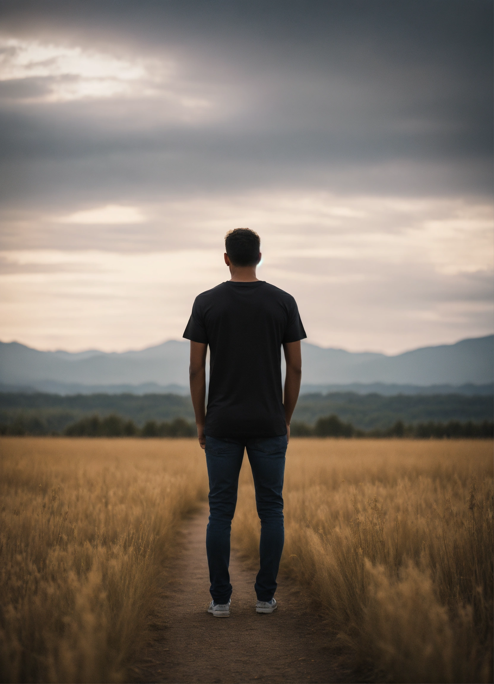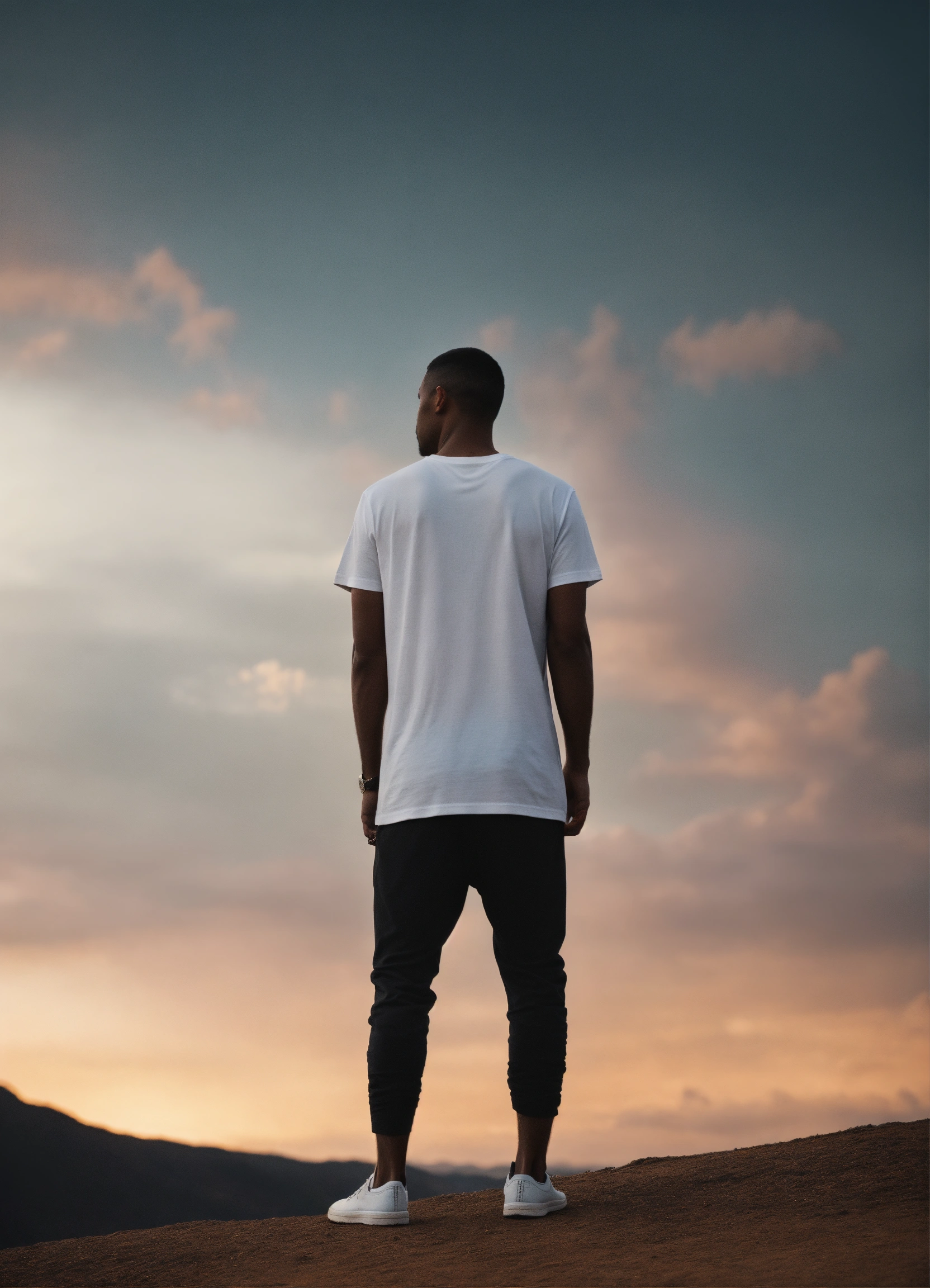 Capture the essence of unity, love, and spiritual connection with a powerful visual. in this image, an individual stands confidently, wearing a blank black or white t-shirt. the person stands against a backdrop that signifies harmony, peace, and hope – perhaps a serene natural landscape, or an artistic representation of unity.
