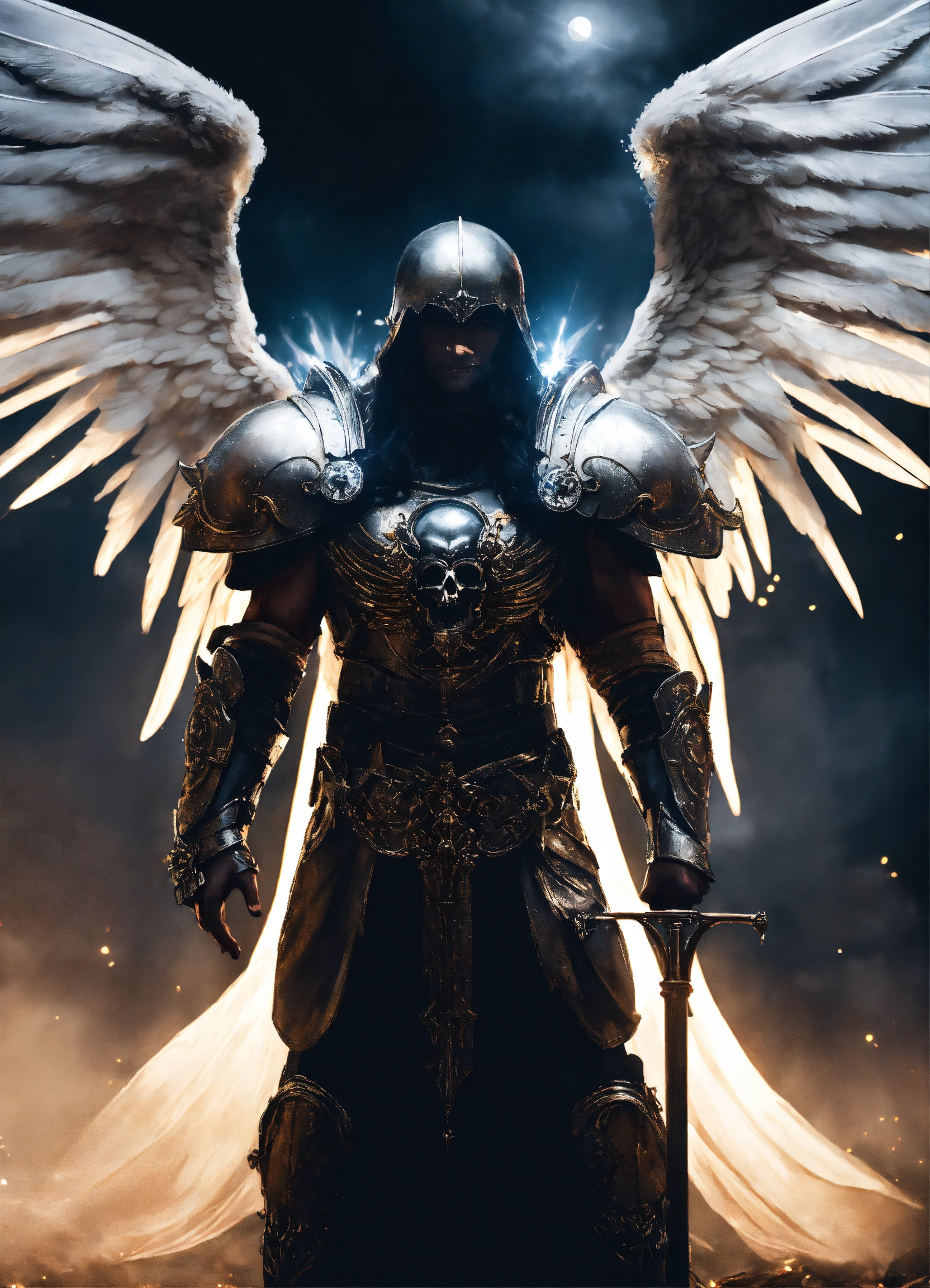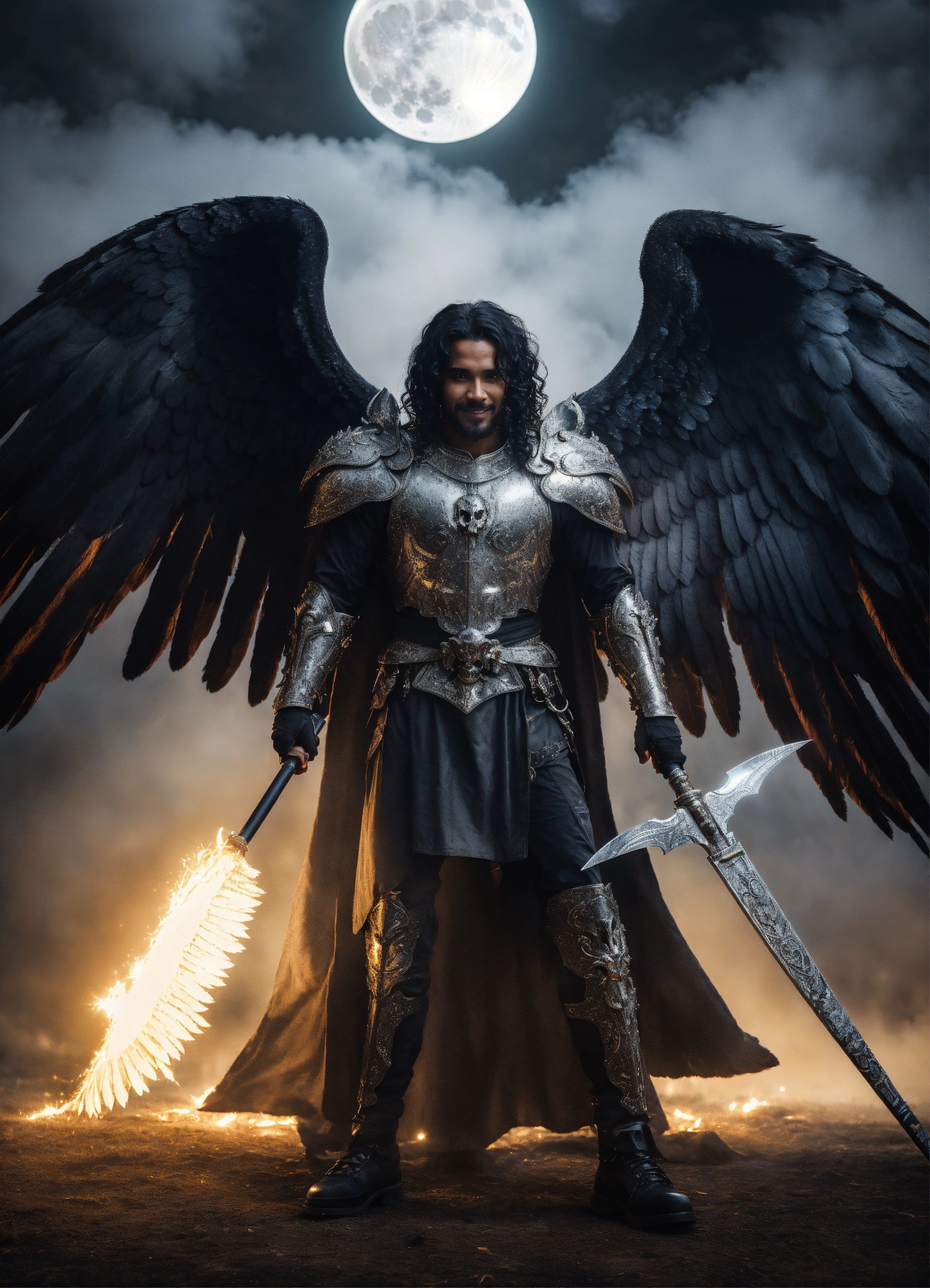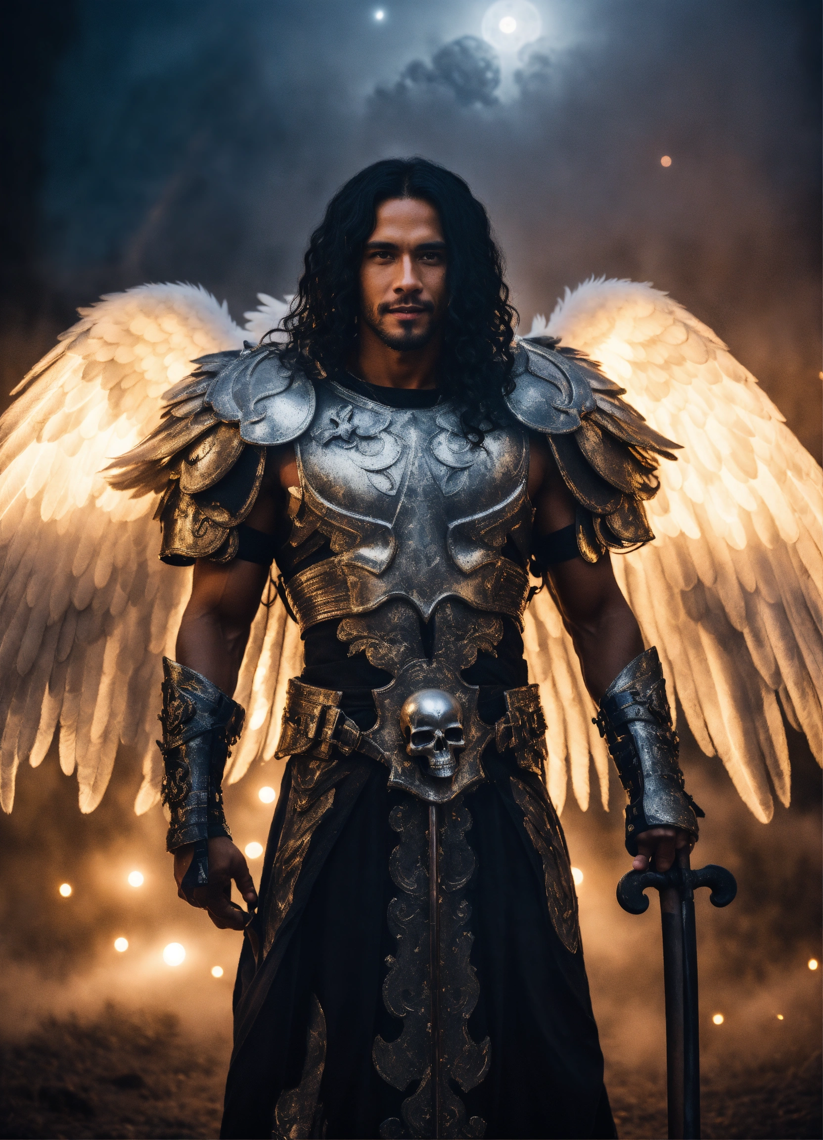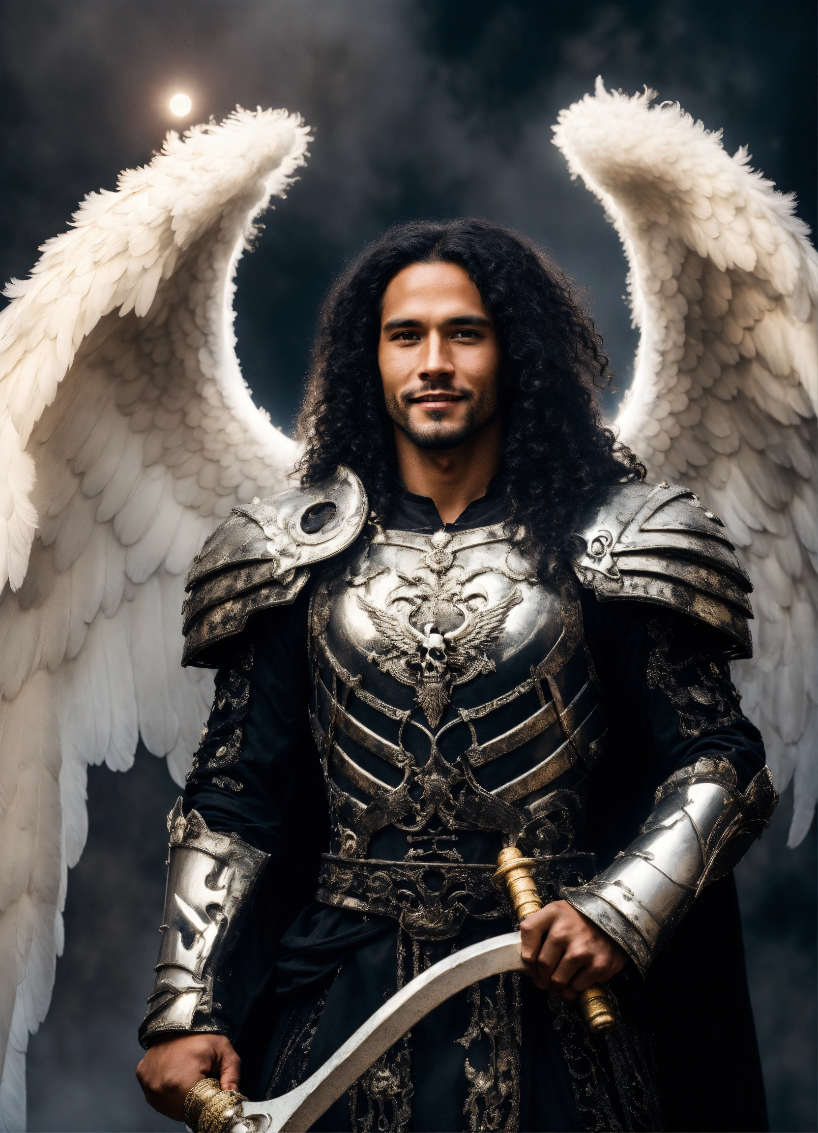 Close-up photographic portrait of 35 year old robust, fit, masculine archangel of death with massive angel wings, male supermodel mixture of black and latino descent, background is misty fog and full moon, explosion of sparkling holy spirit lights, holding a scythe, death, transition, hope, power, destination is heaven, renewal, willing sacrifice, surrender to the light, servant of god, holy comforter, wide happy smile and staring intensely at camera, long black hair with curls, eyes centred in shot, wearing futuristic platinum battle armour with skull details over a sparkling white tunic, ethereal, symmetrical, fantasy photoshoot. film grain.