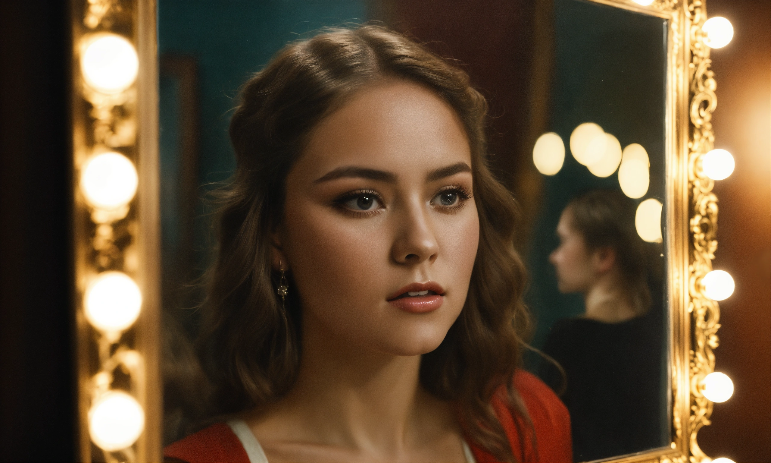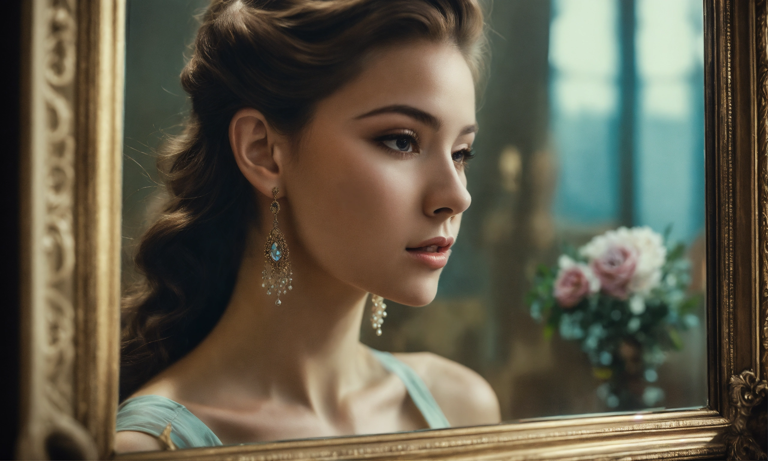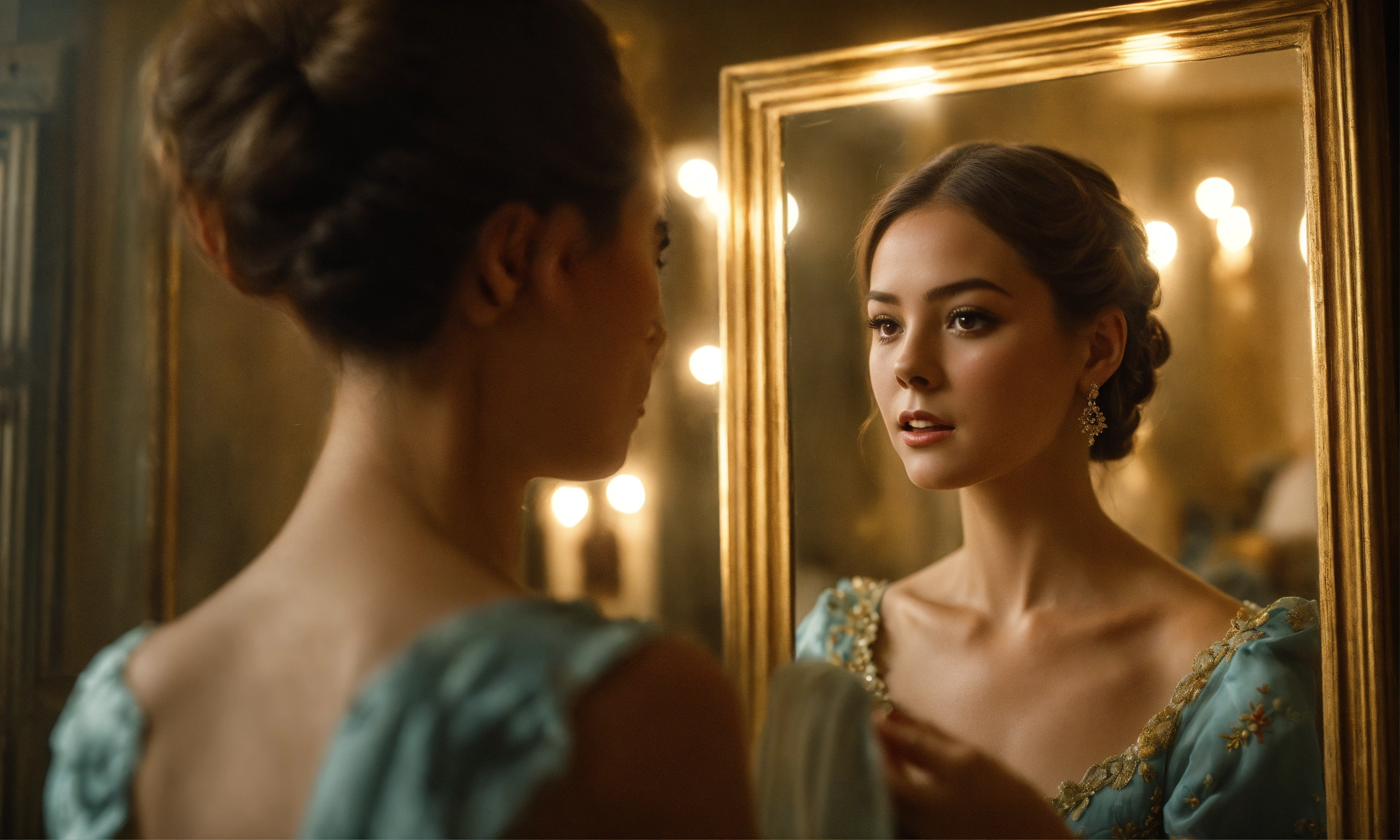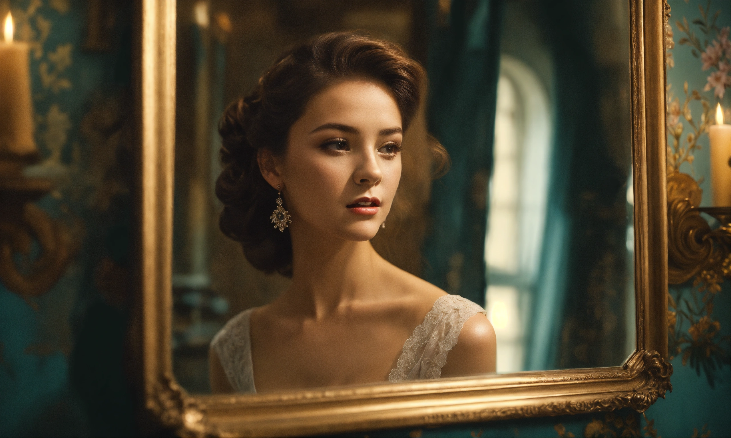 A reflection shot in the vintage mirror captures the young beautiful lady's awe-struck expression as she admires her new appearance, with the mirror itself appearing almost magical. stunning 8k matte oil painting