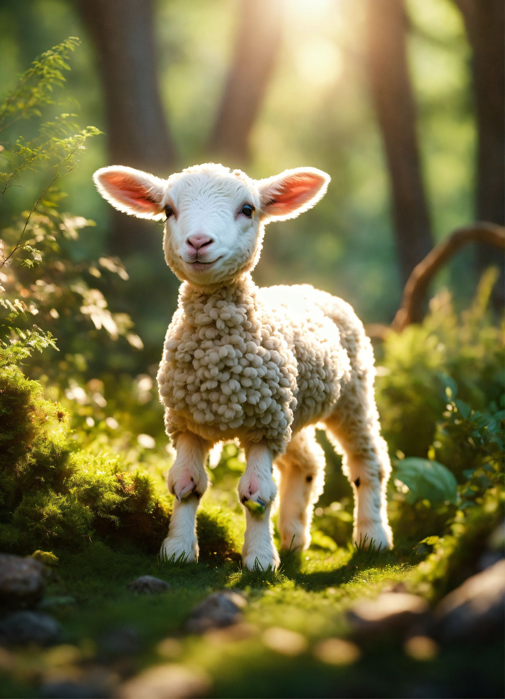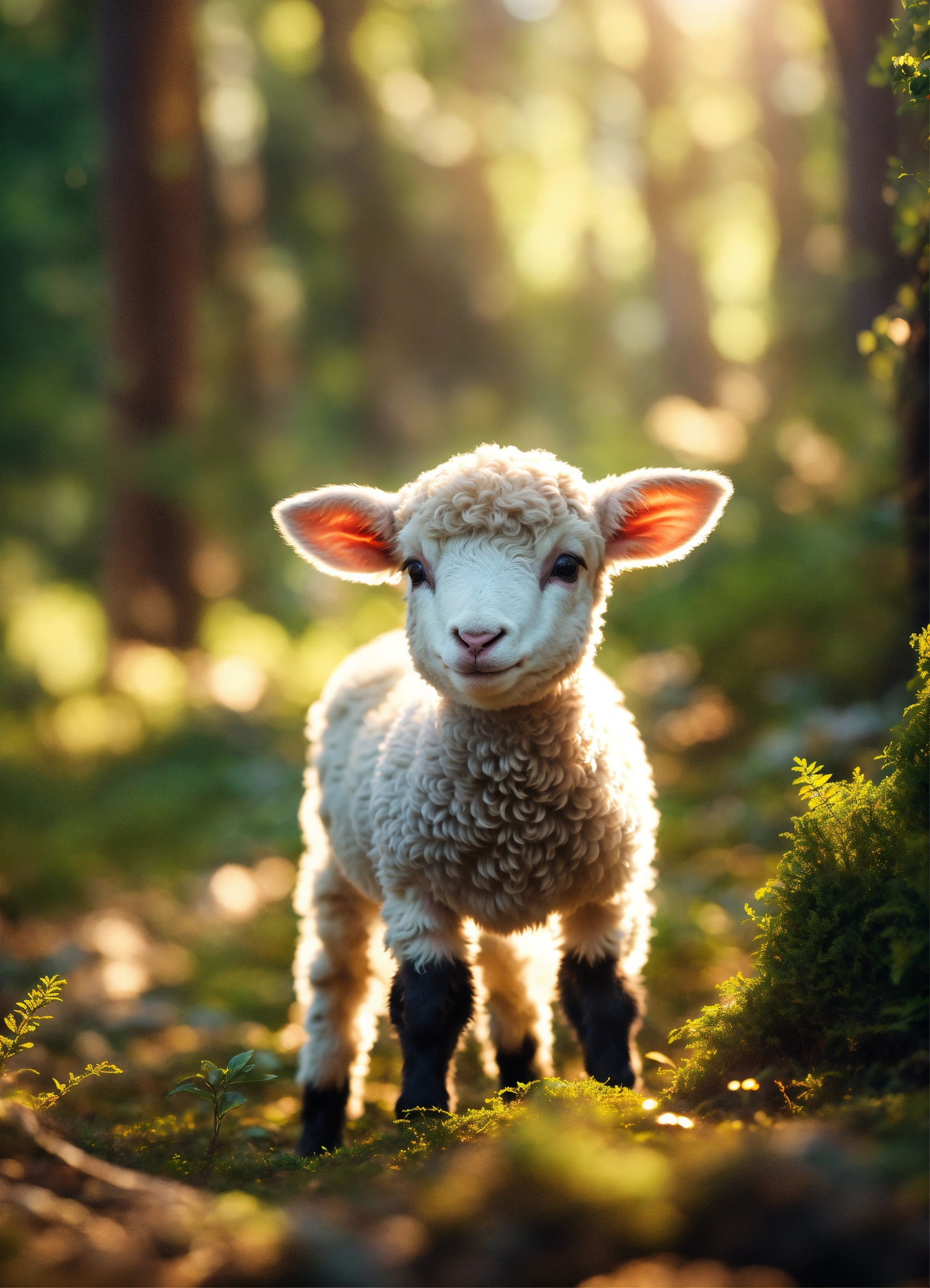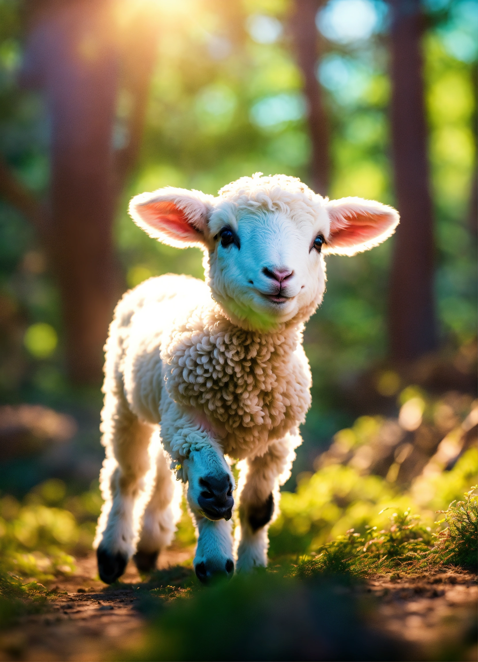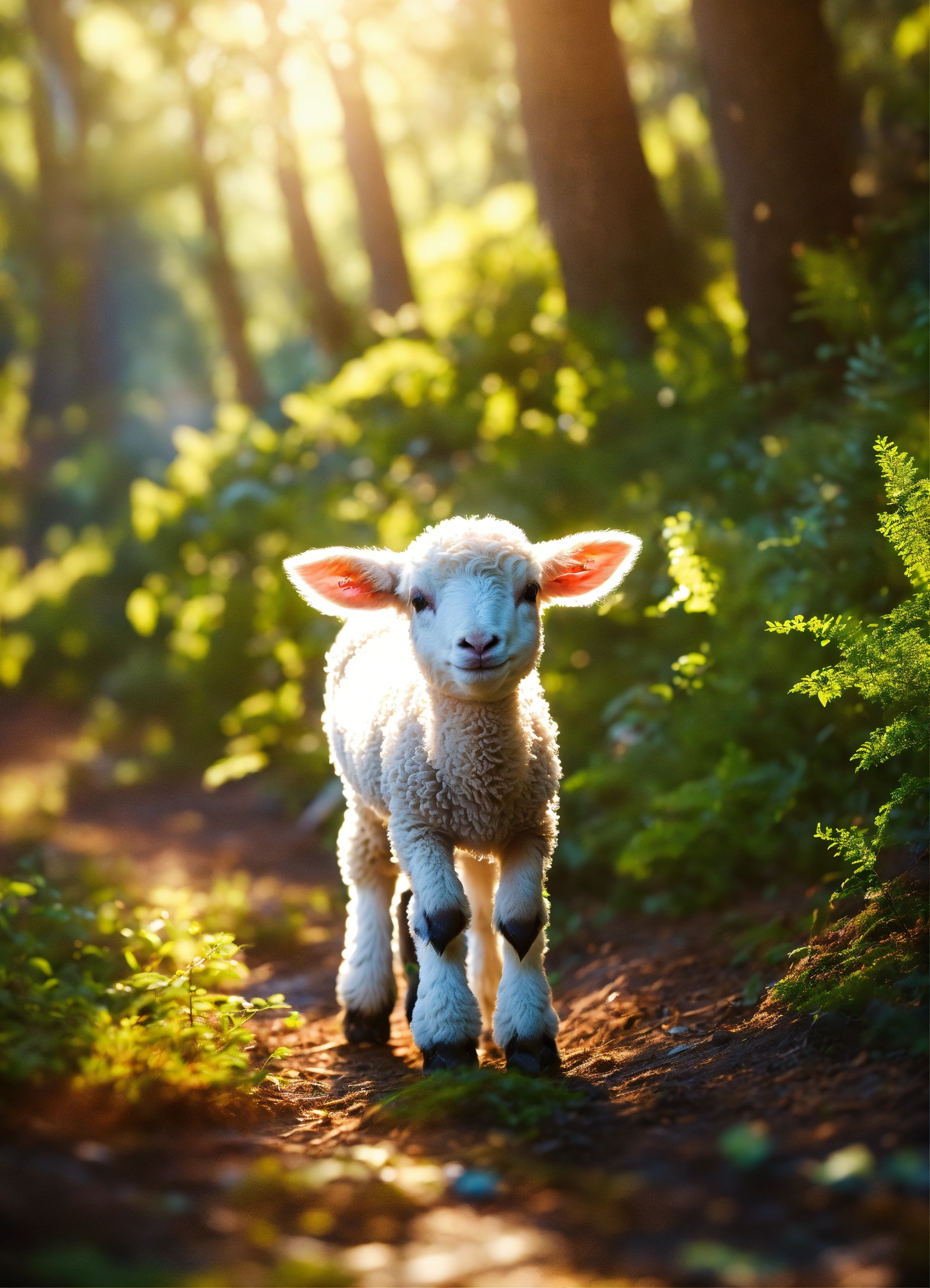 4d photographic image of a little lamb happily playing in a sunlit forest, surrounded by lush greenery. realistic, vivid colors octane render trending on artstation, artistic photography, photorealistic concept art, soft natural volumetric cinematic perfect light, uhd