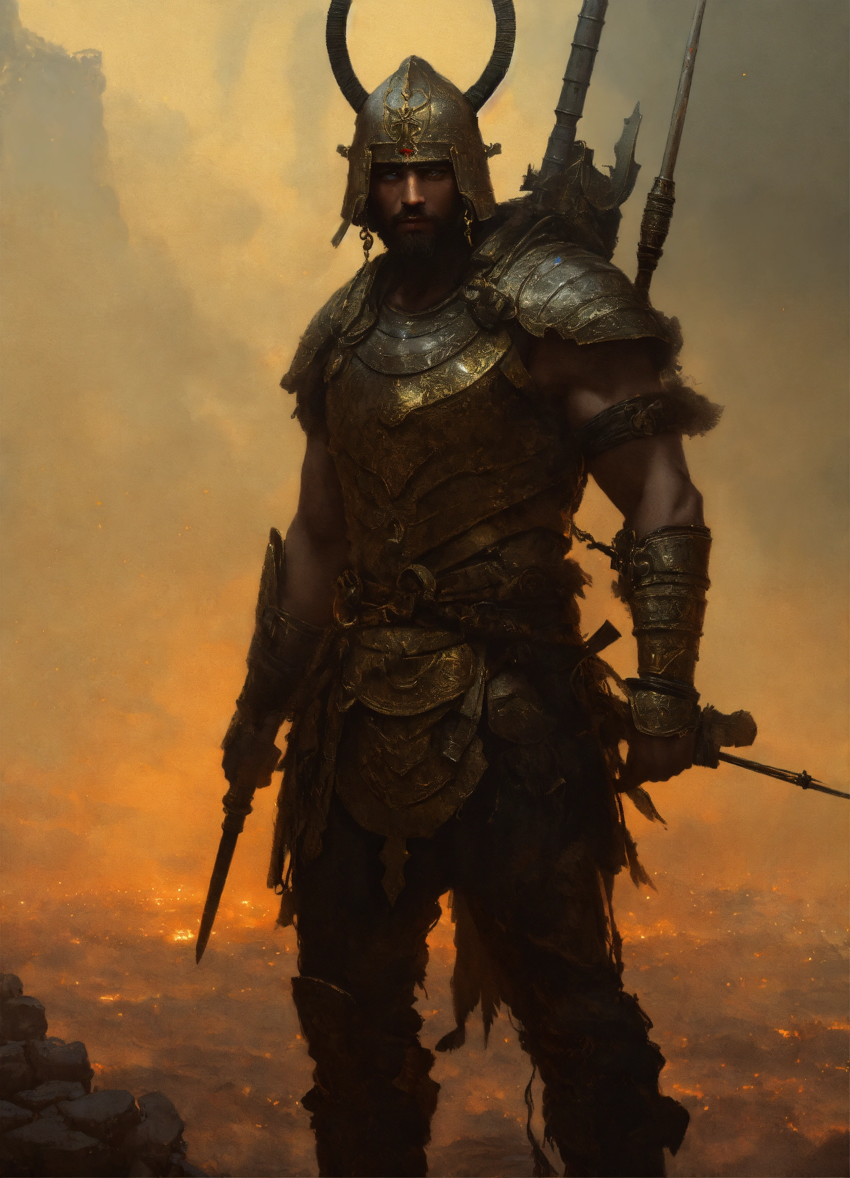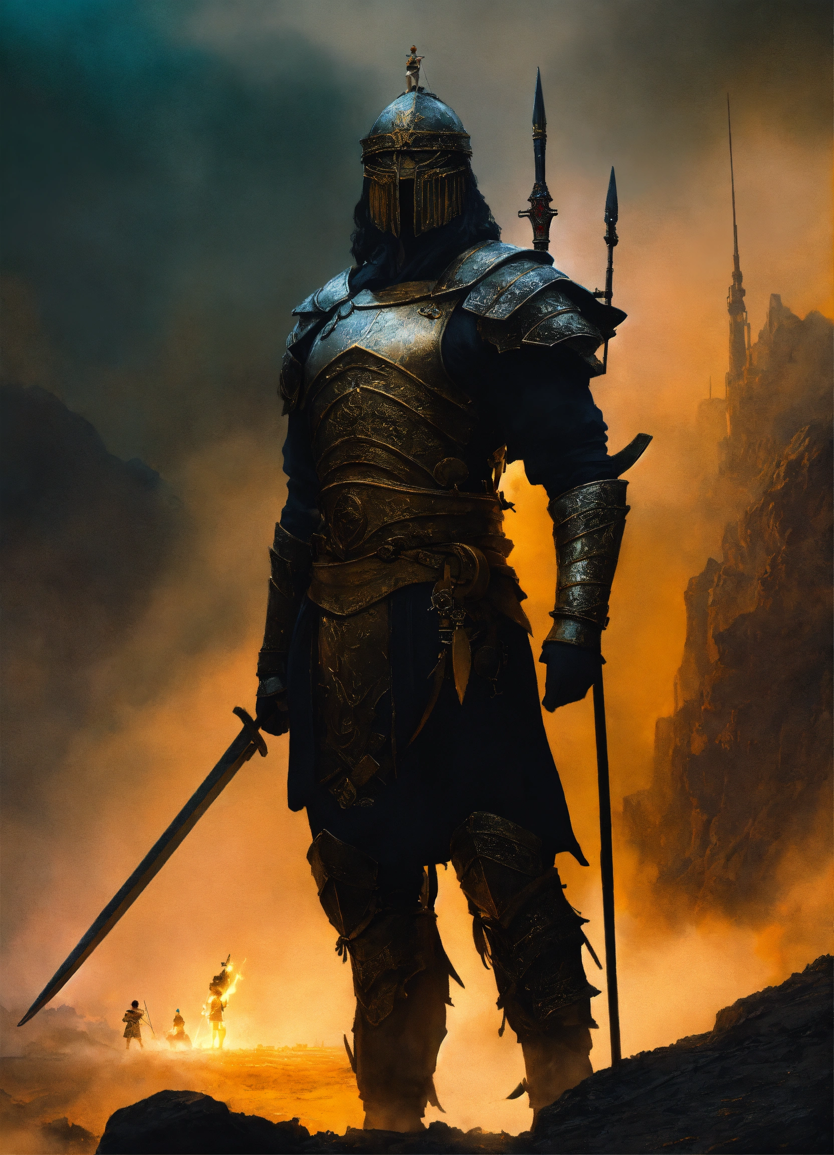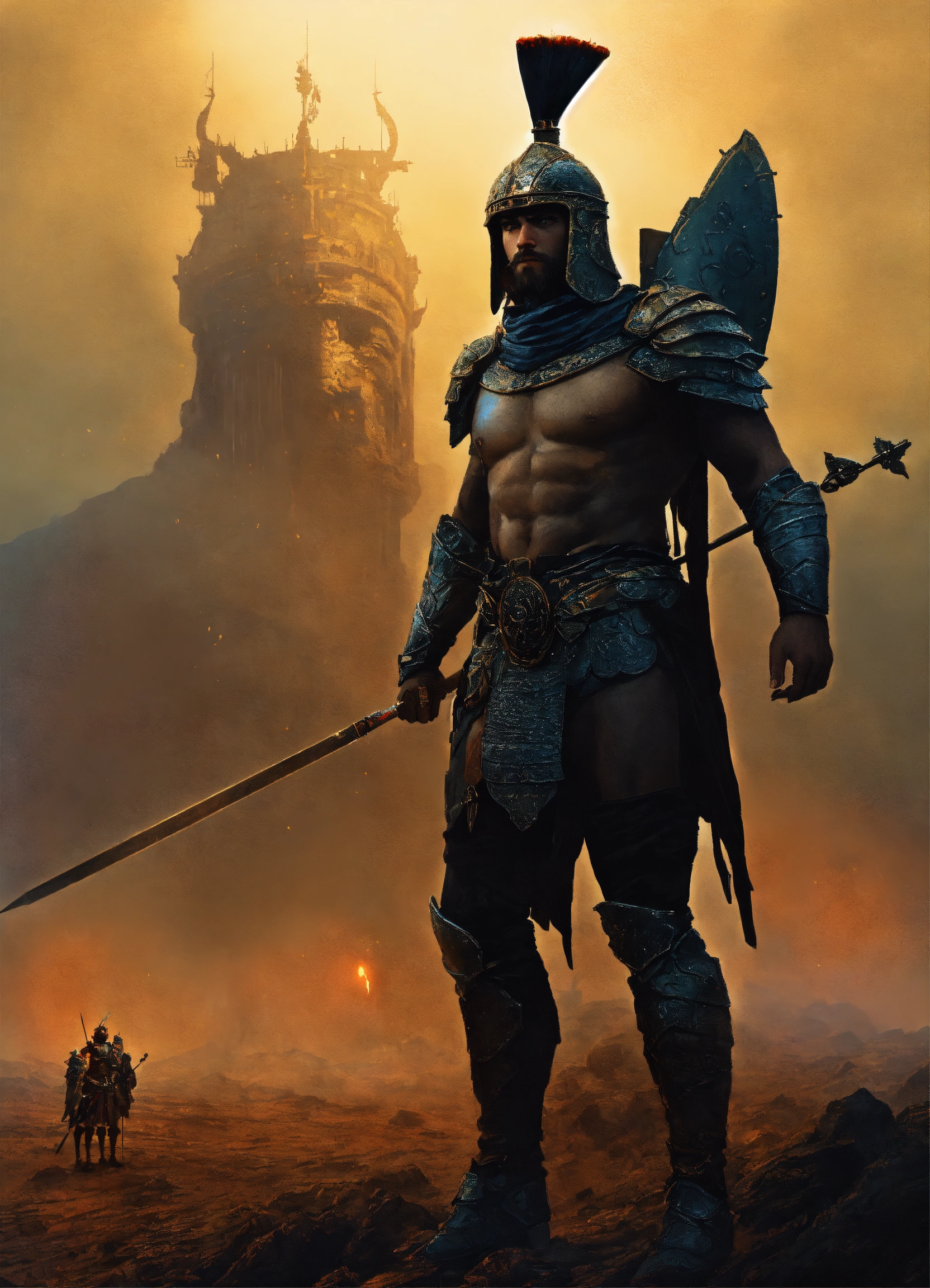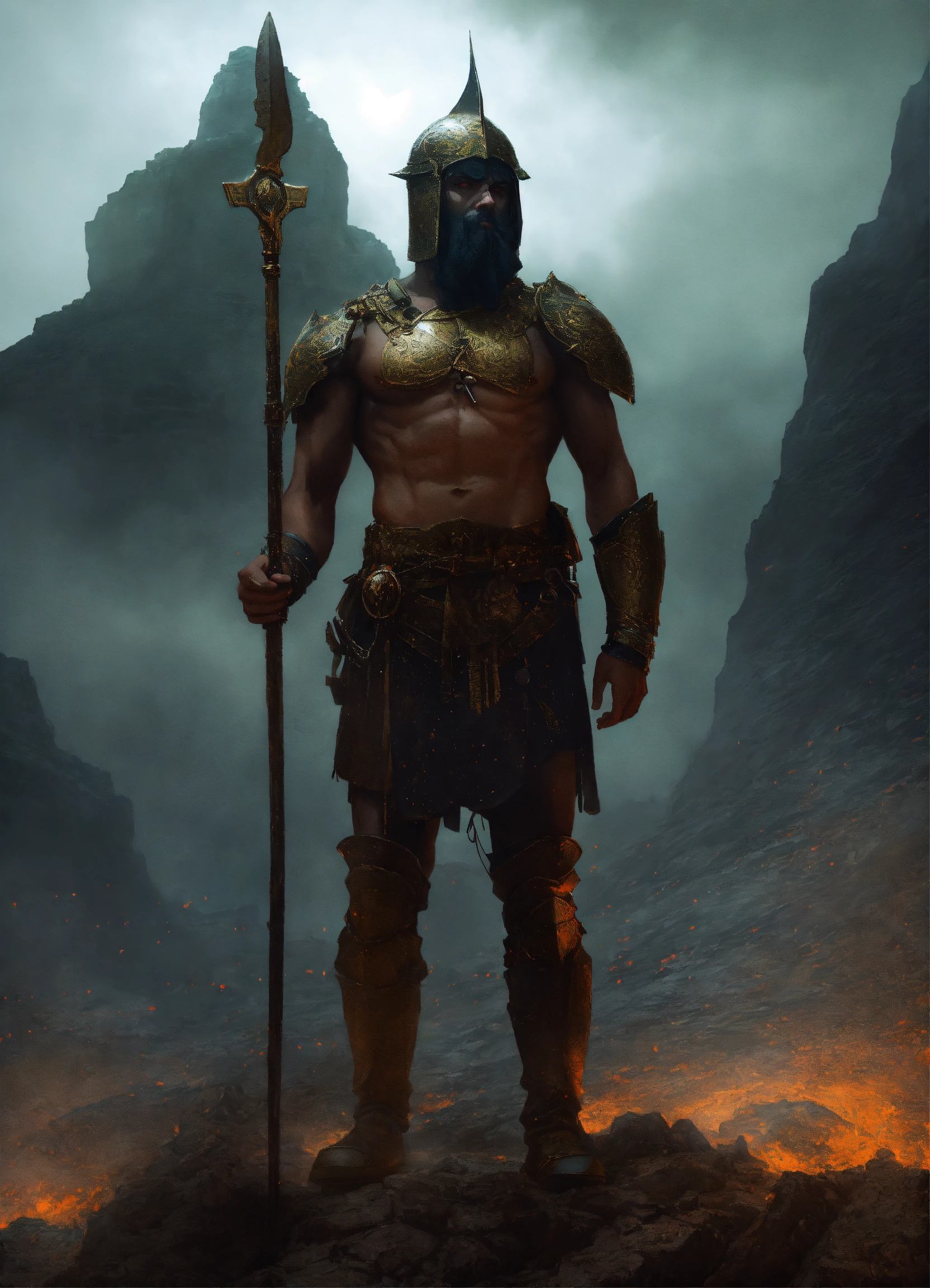 Goliath in phillistine armor standing above a young david the israelite holding a sling shot, dense black oil, metallic, fog and dust, hyperrealistic macro photo by wlop and zdzislaw beksinski [glowing eyes]"