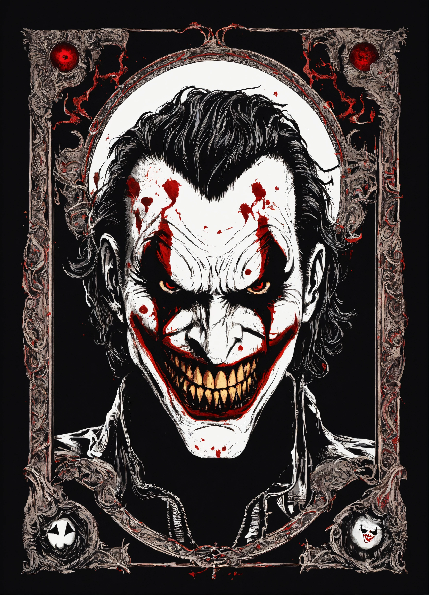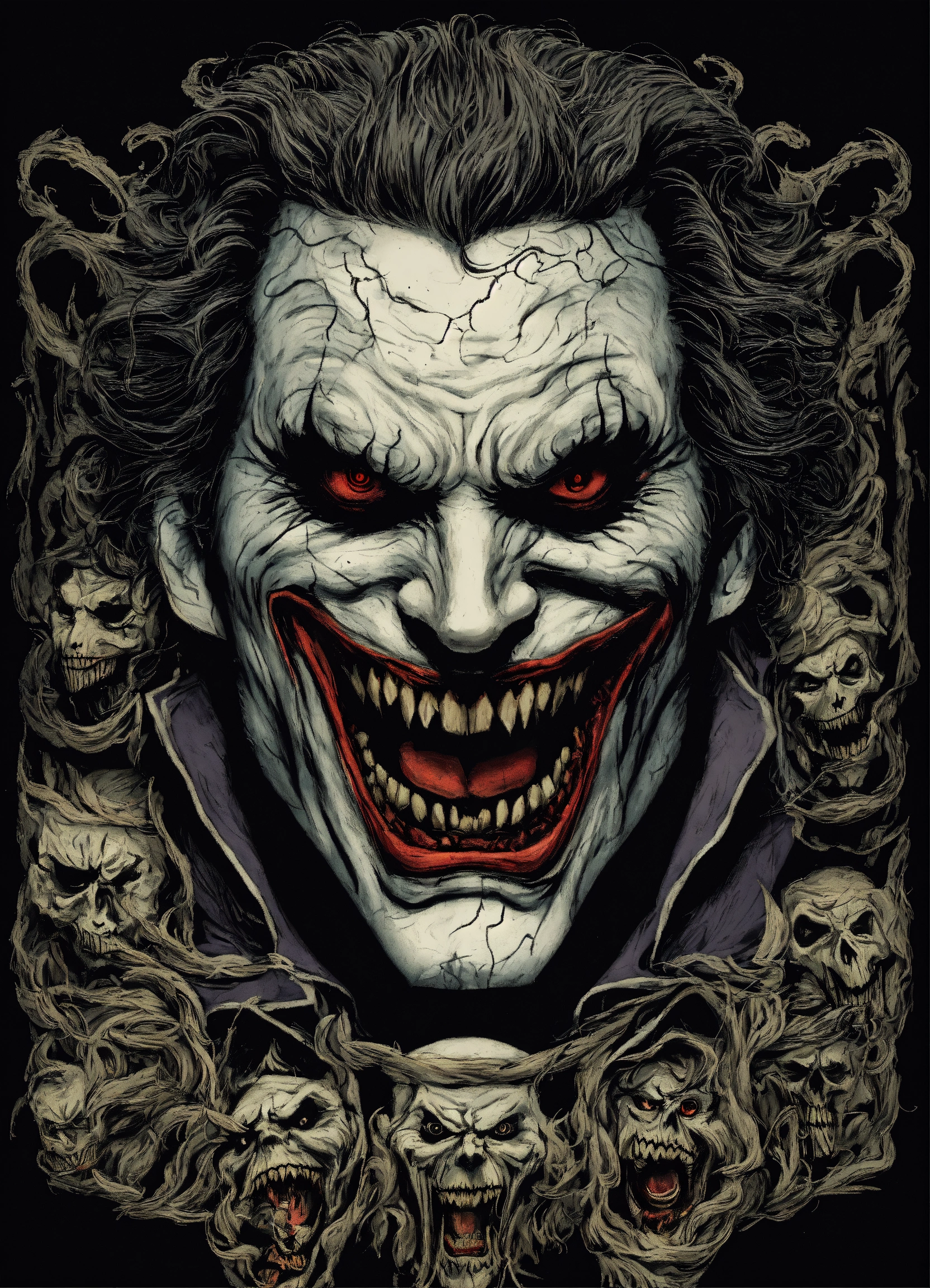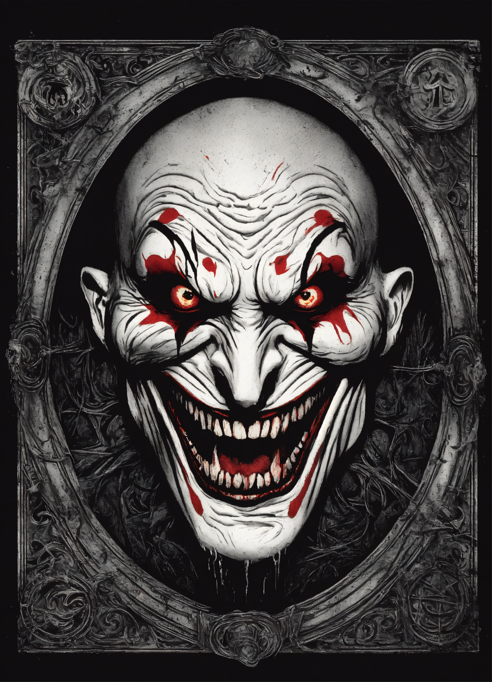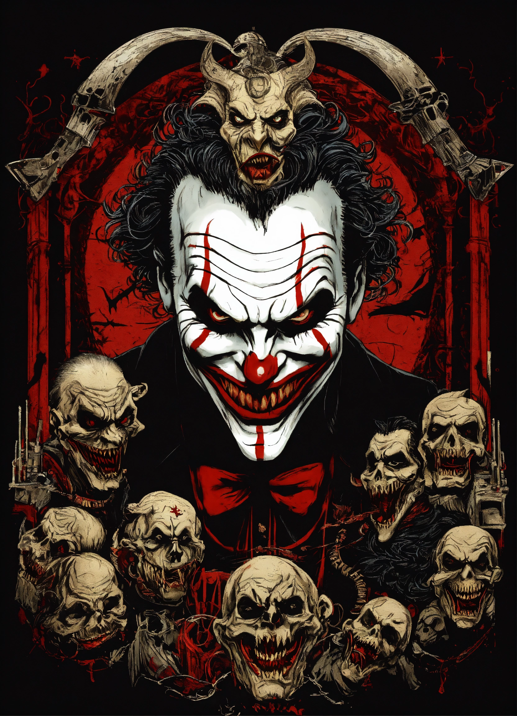 Satanic symbols, angry joker face, strange, terror, thriller, spooky, creepy, scary, thriller, fear, highly detailed, tshirt design, black background