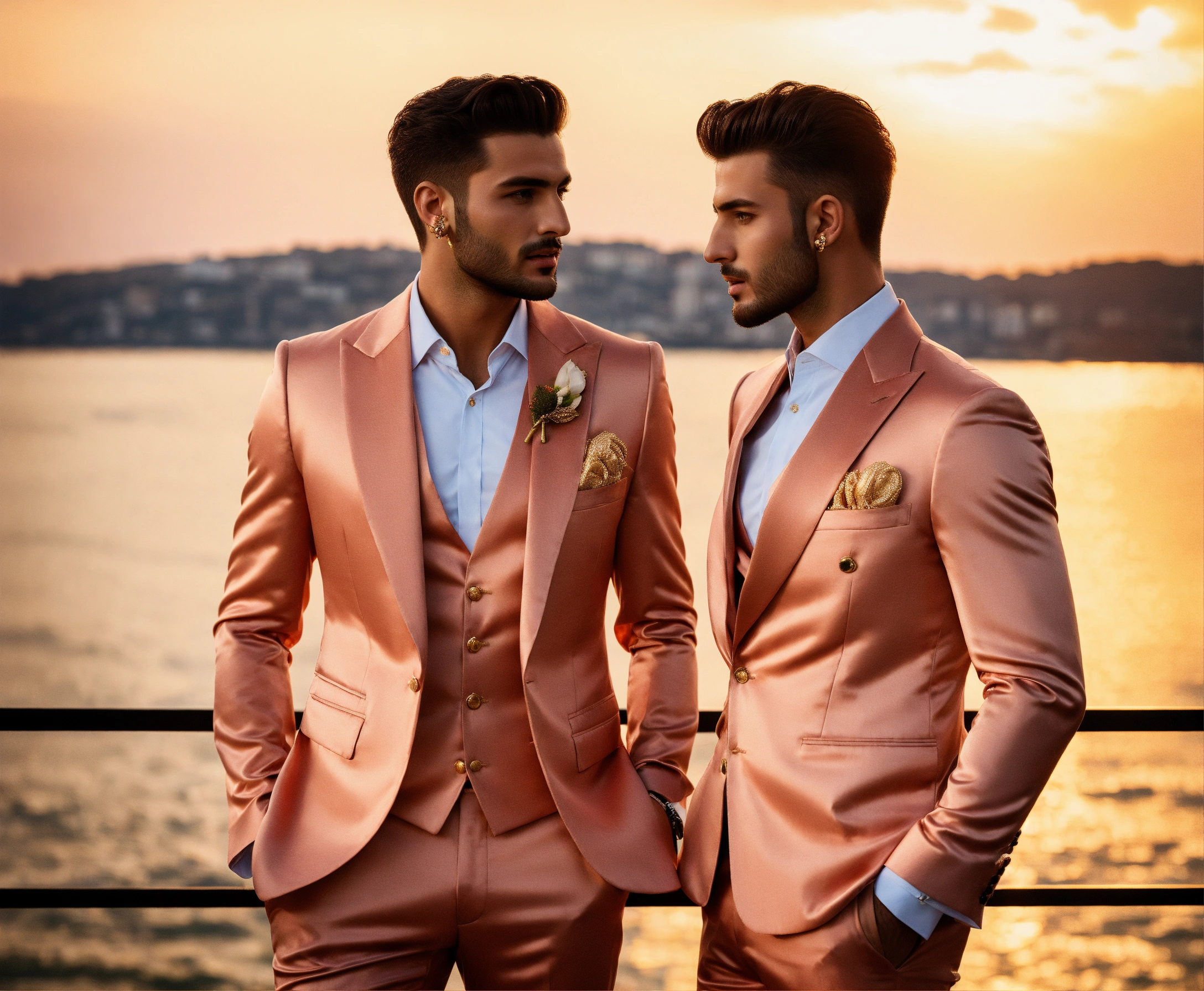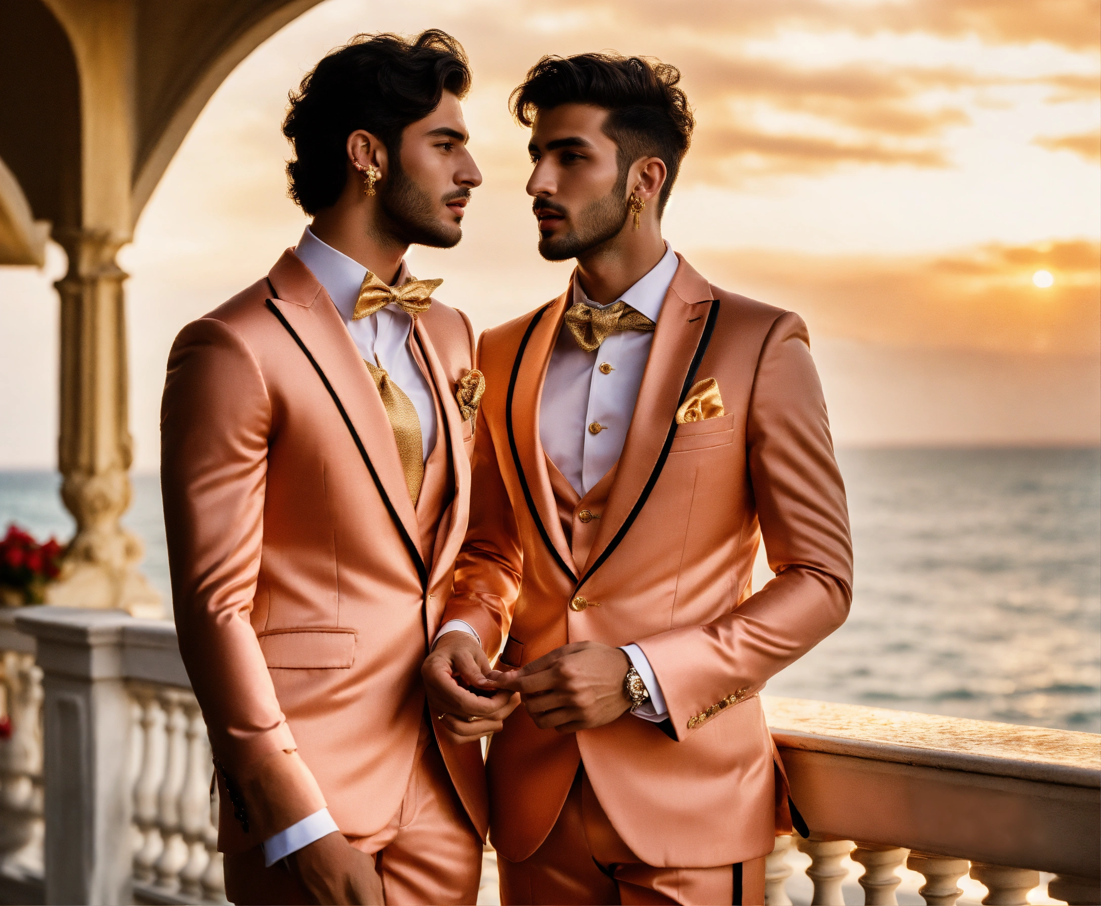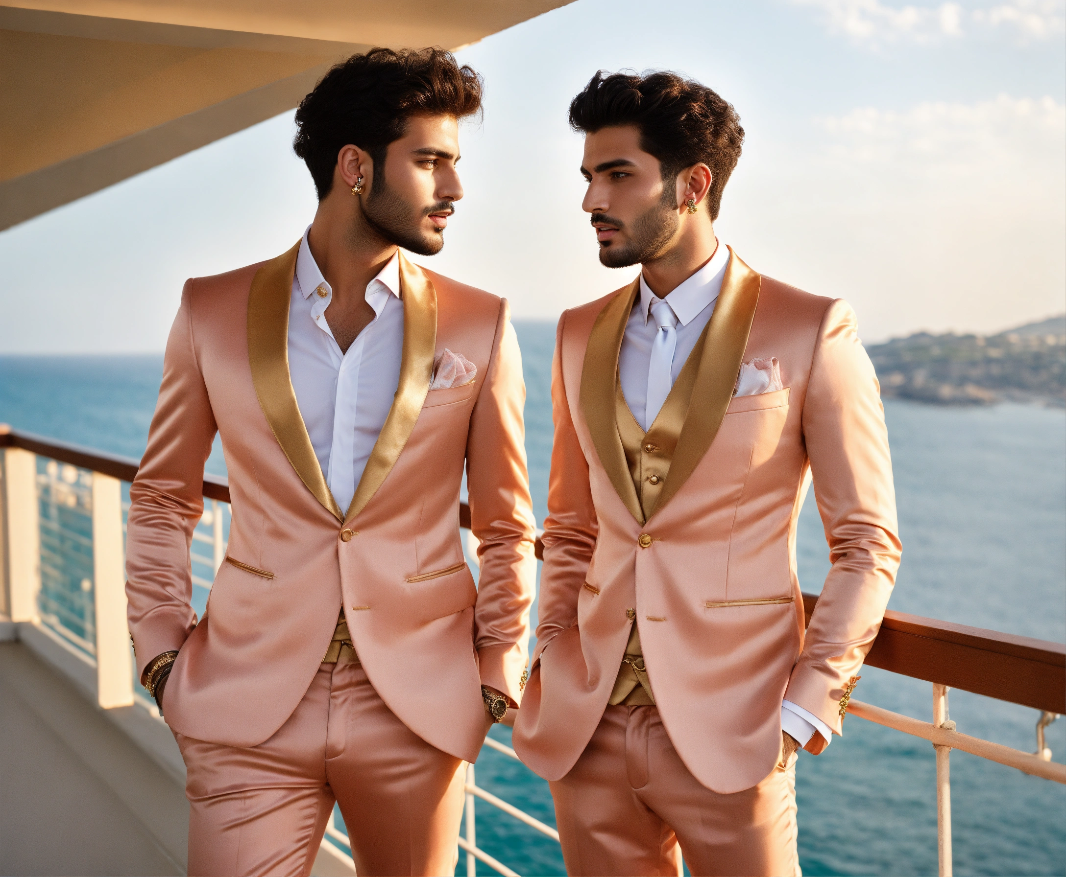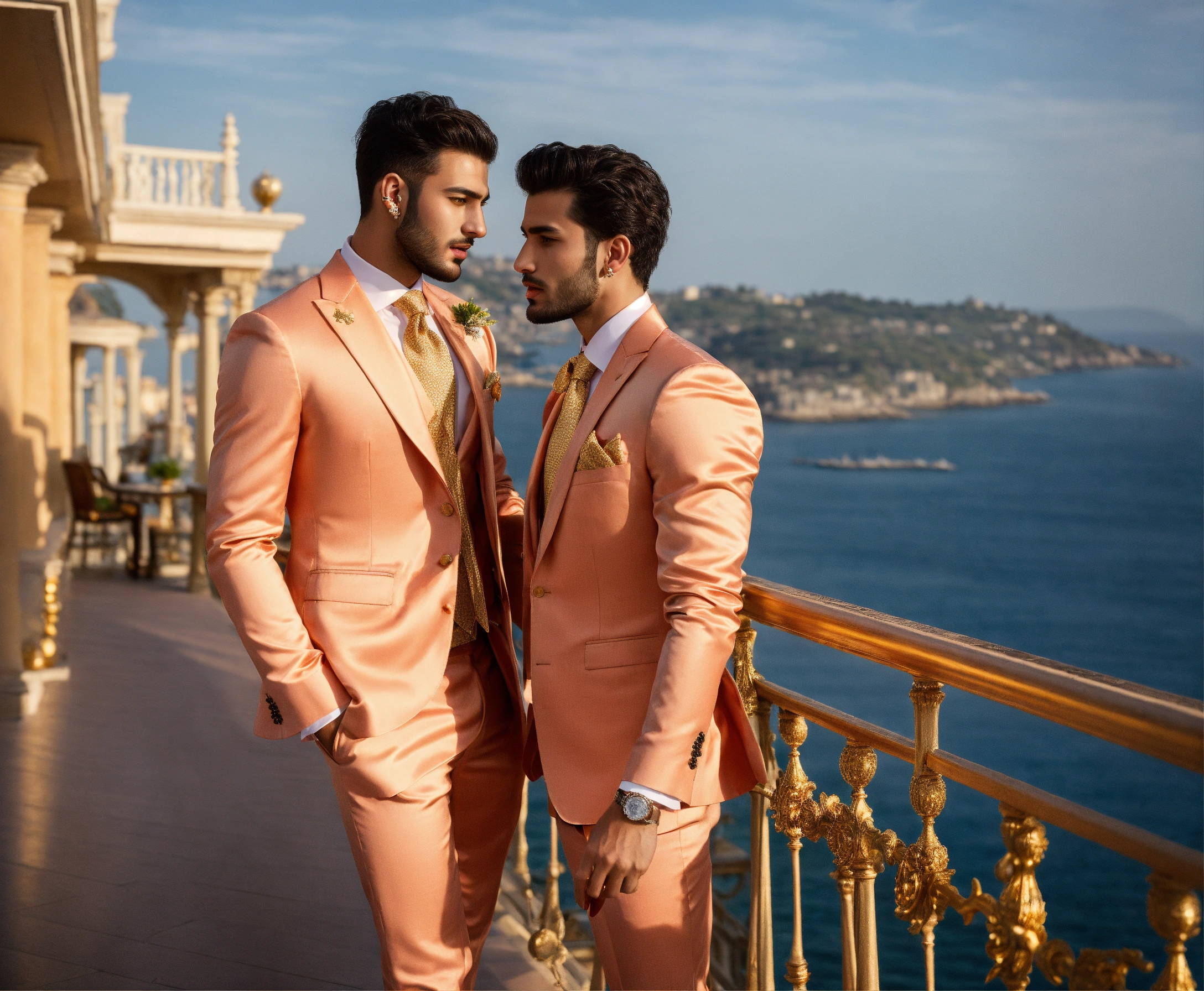 Two turkish young male models in satin peach vested suit and golden tie, golden earings, talking on a balcony by the sea
