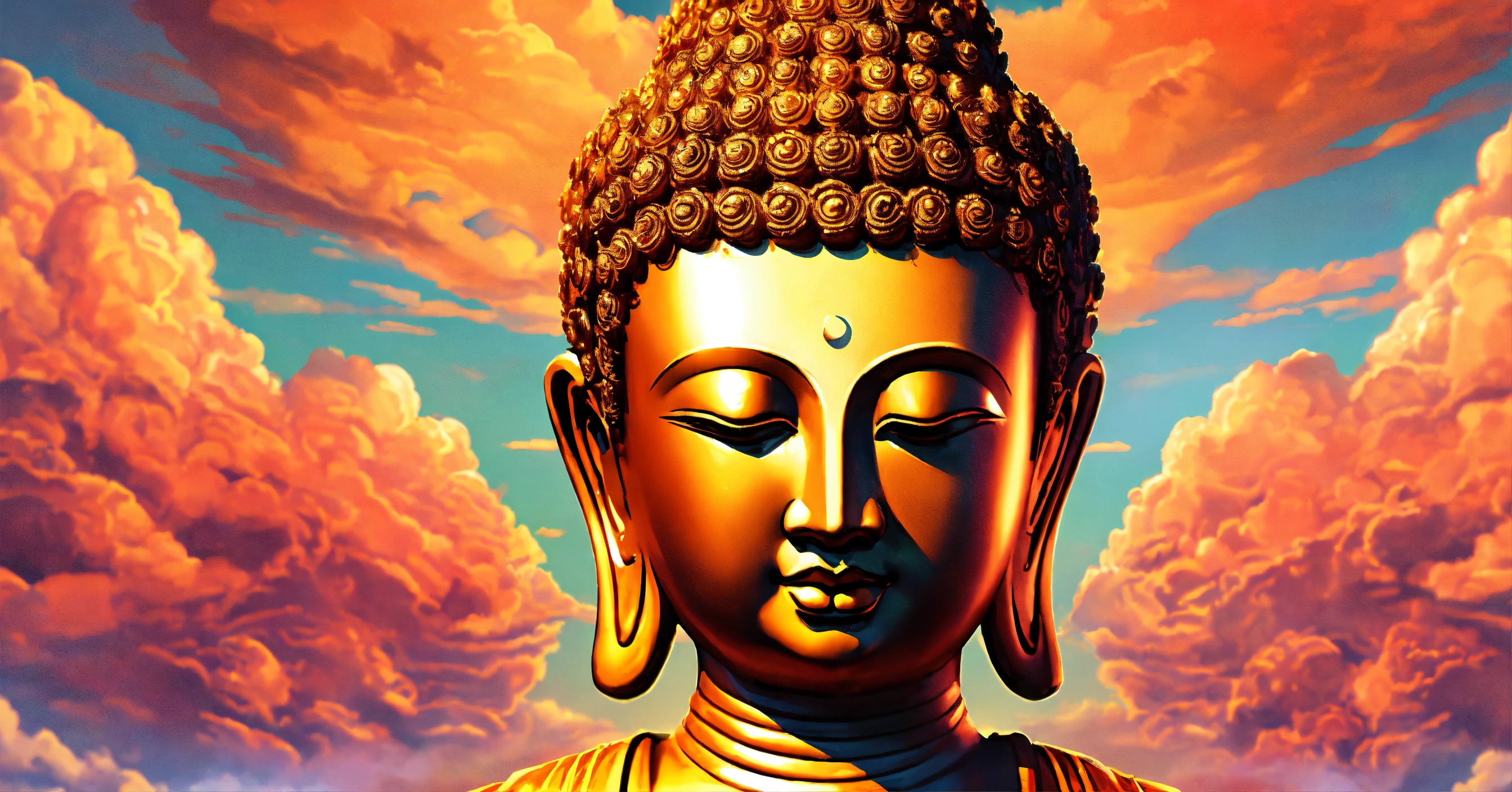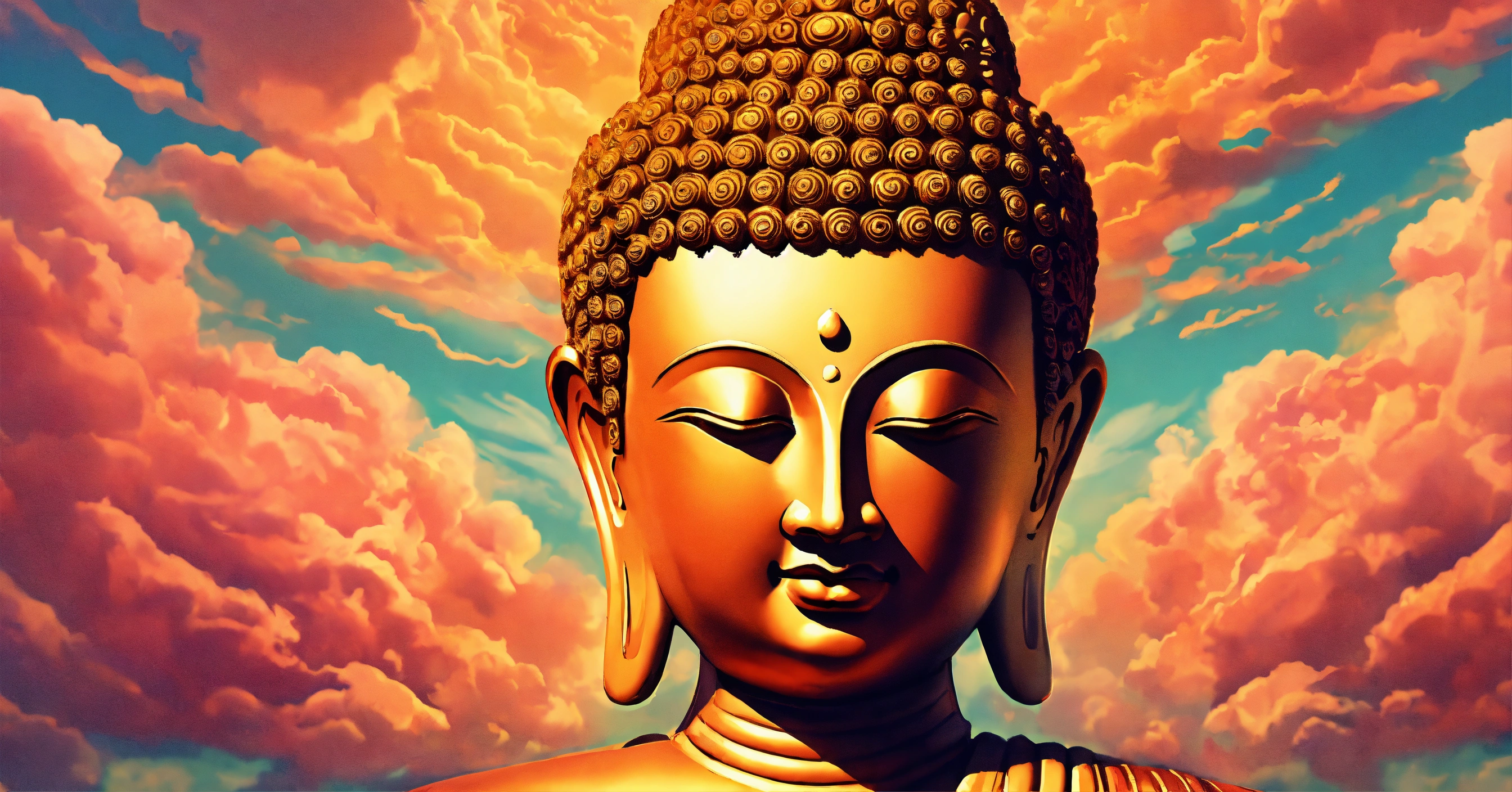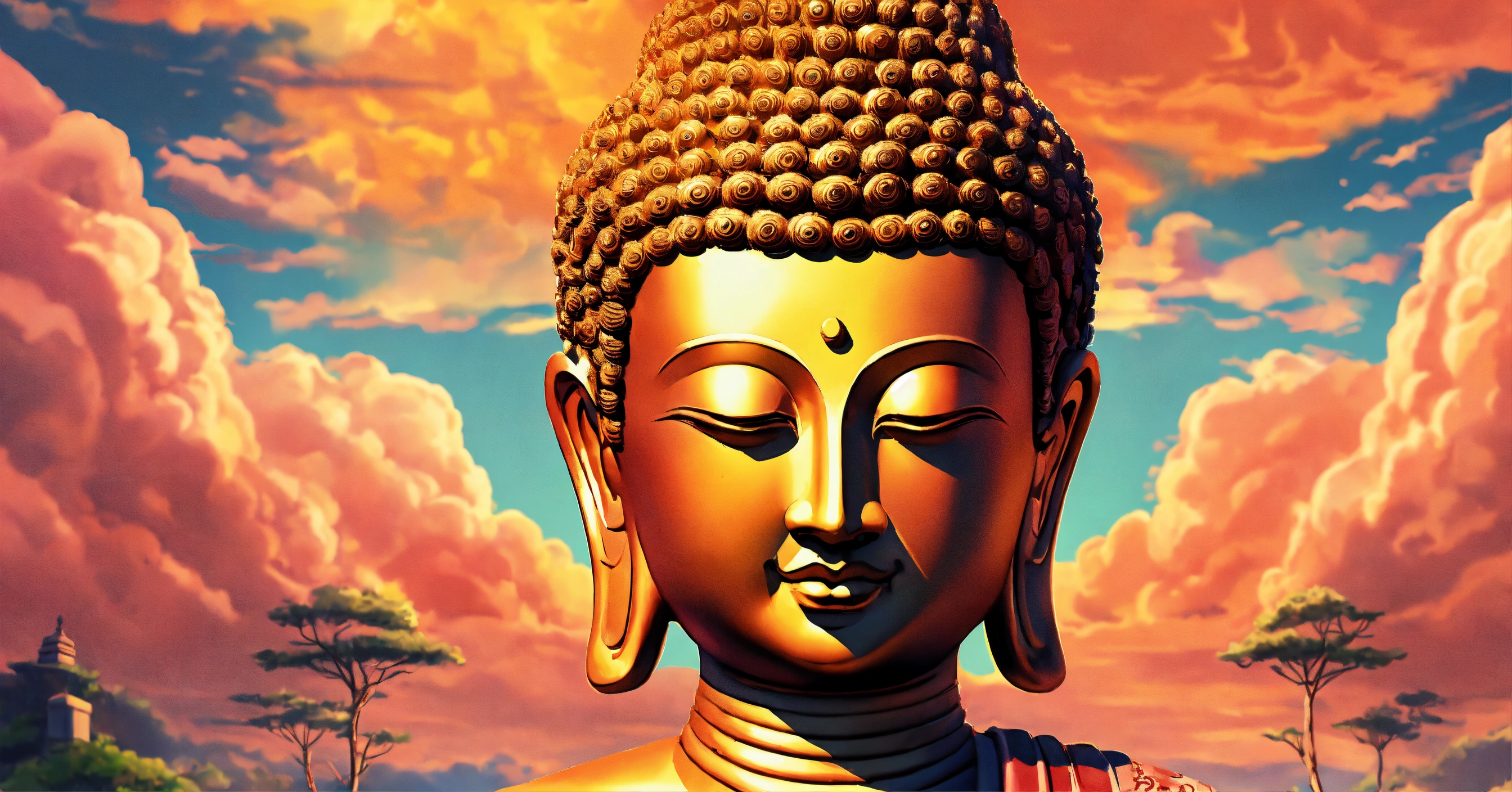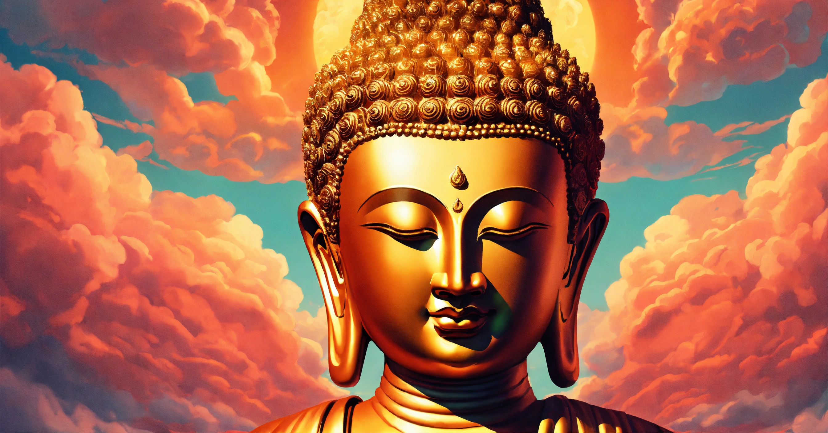 The buddha's head portrayed as a cloud in the sky, lots of clouds, 4k, cartoon digital art style, sunset colours, very detailed