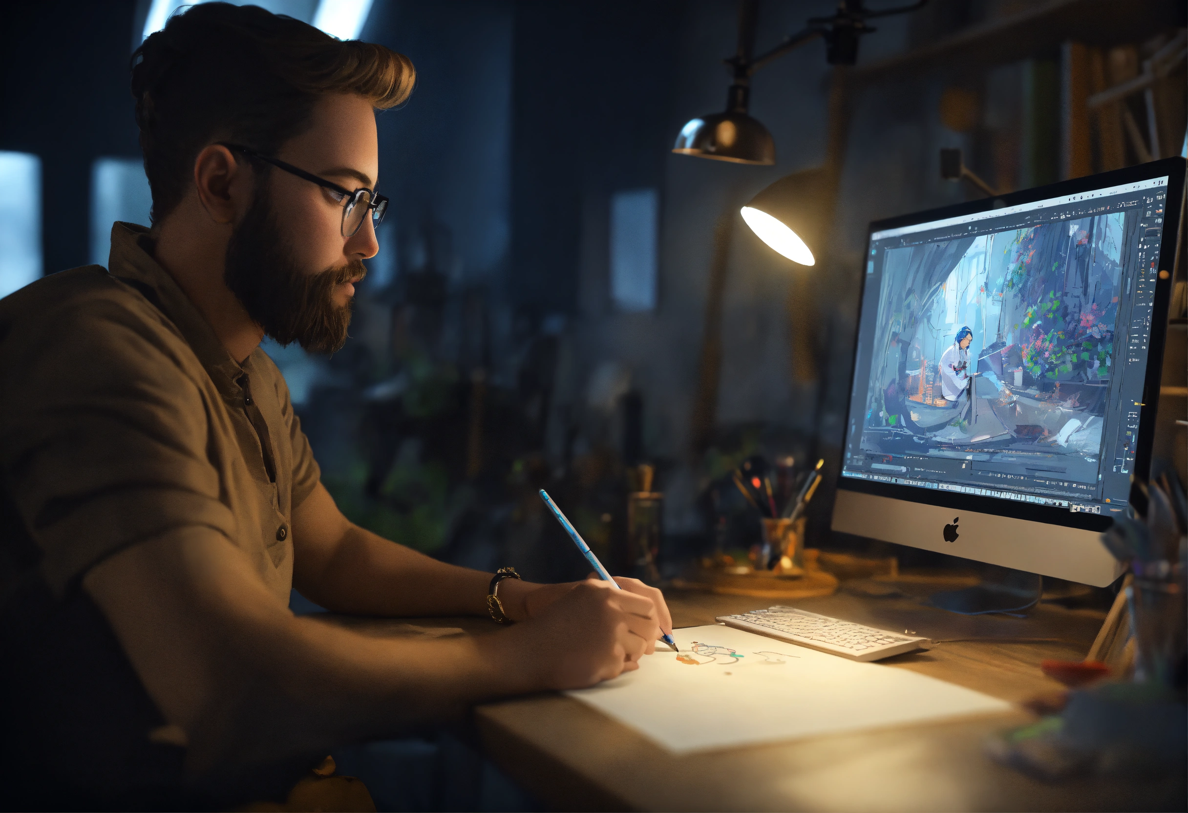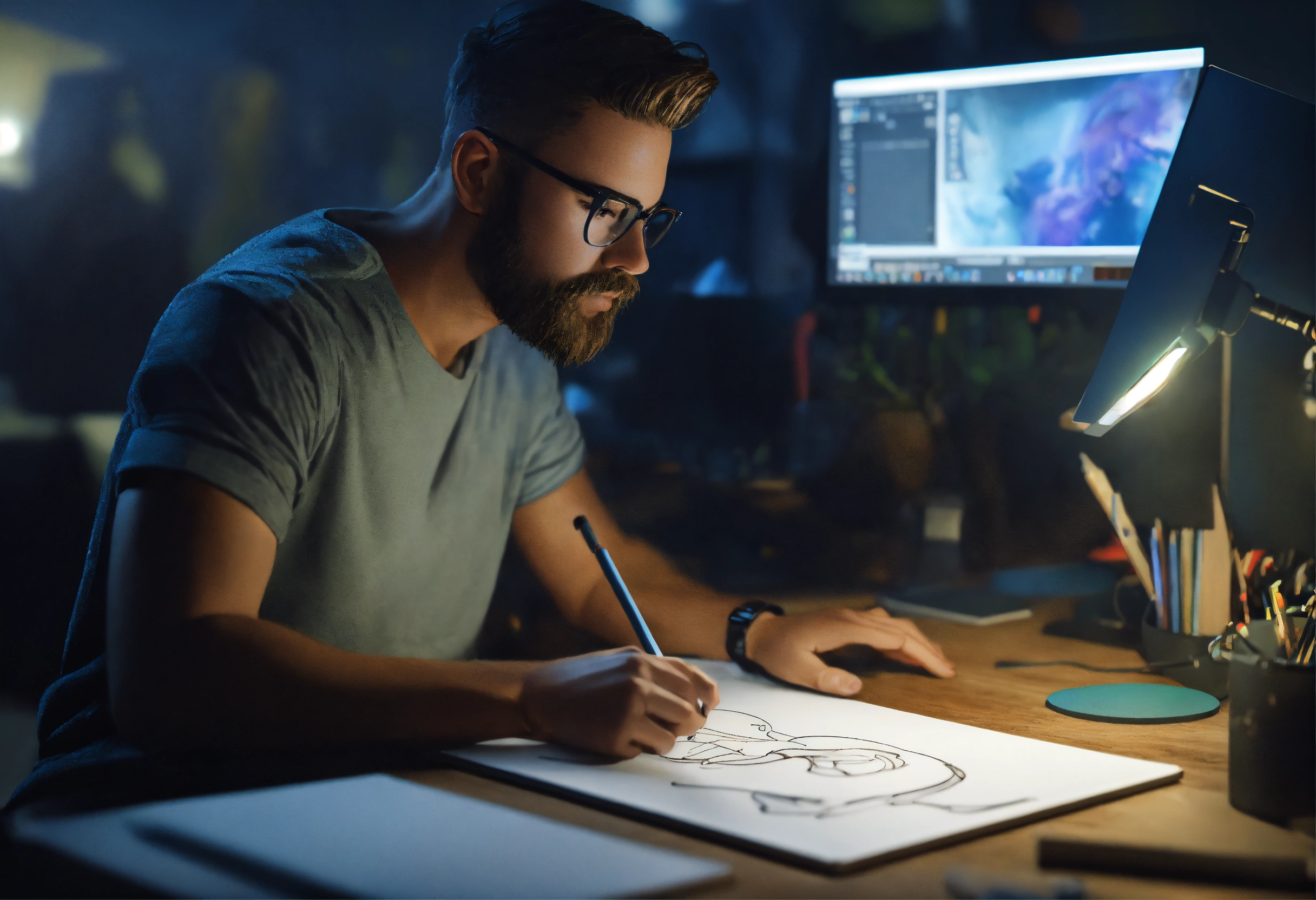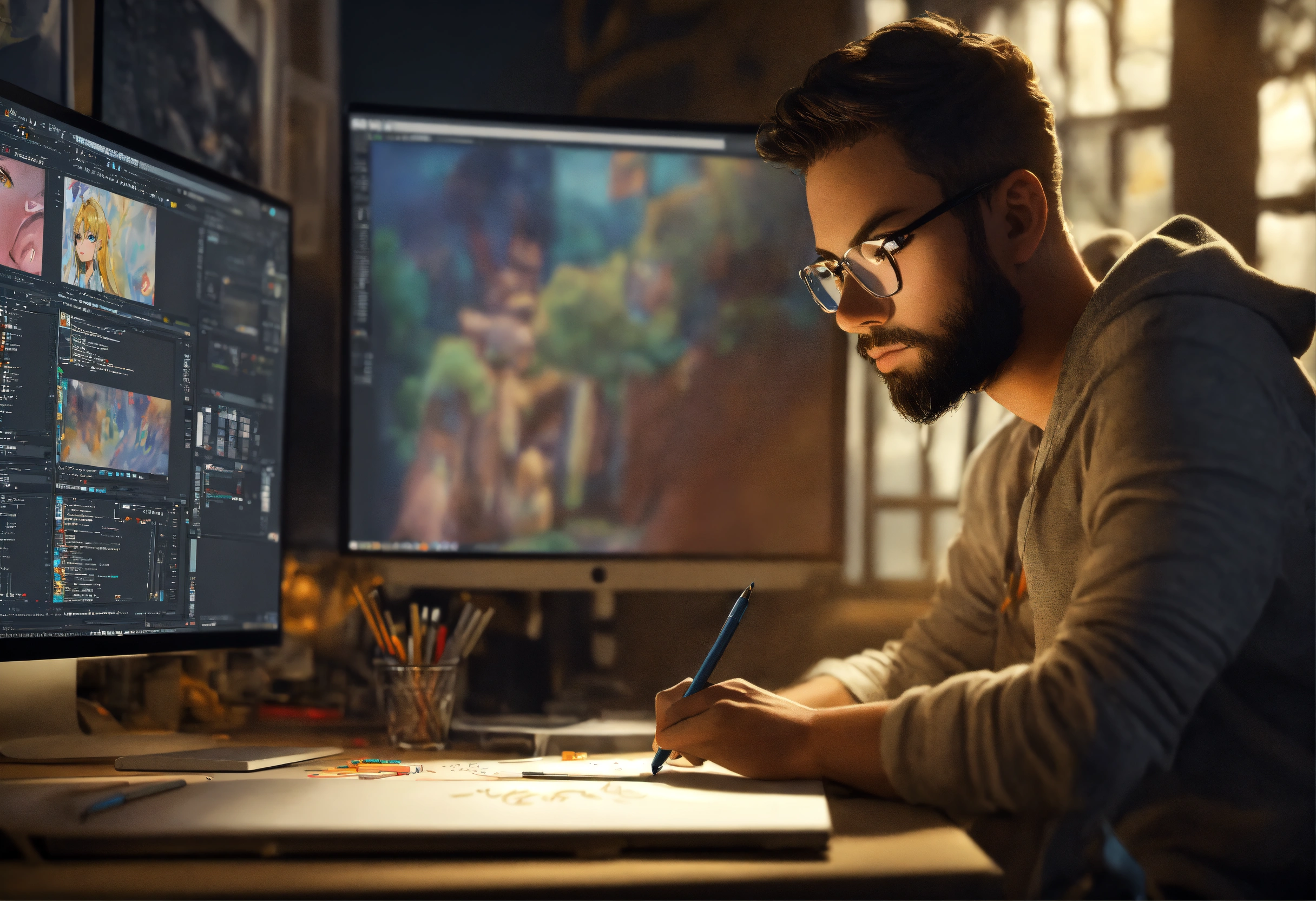 An illustrator draws a character on a computer using a graphics tablet. sitting at the computer in the studio. we see the drawing on his computer screen. realistic. a clear correct focus. beautiful symmetrical face. full frame. 3d, hd, real image, complex details, depth of field, beautiful lighting, 8k.