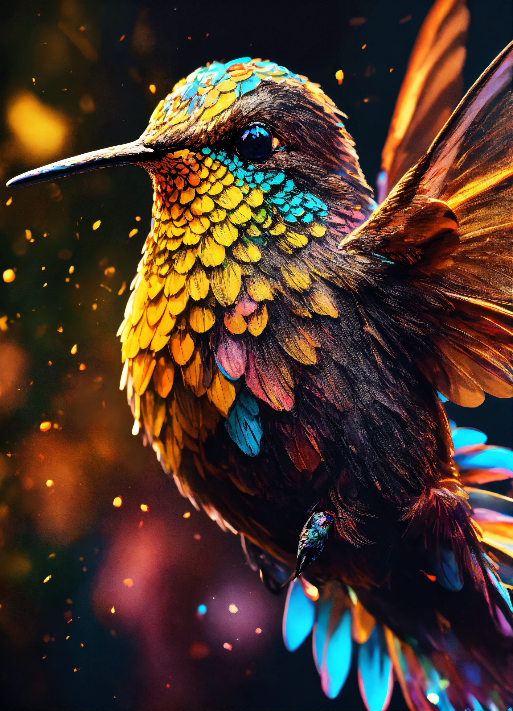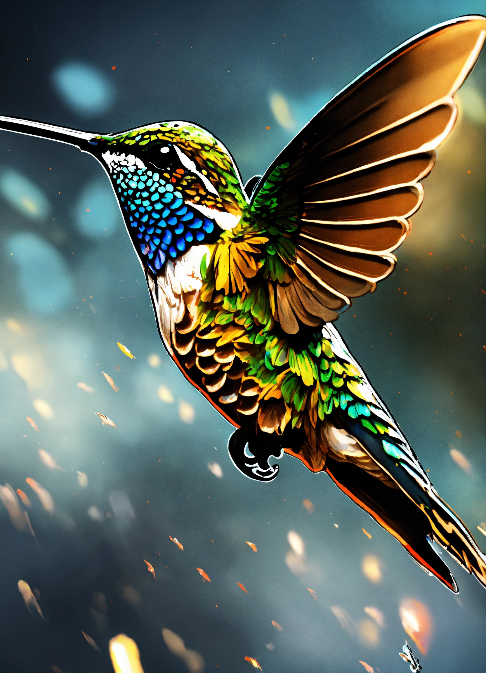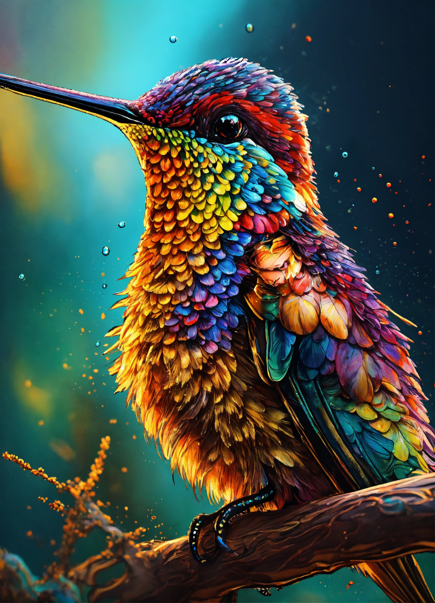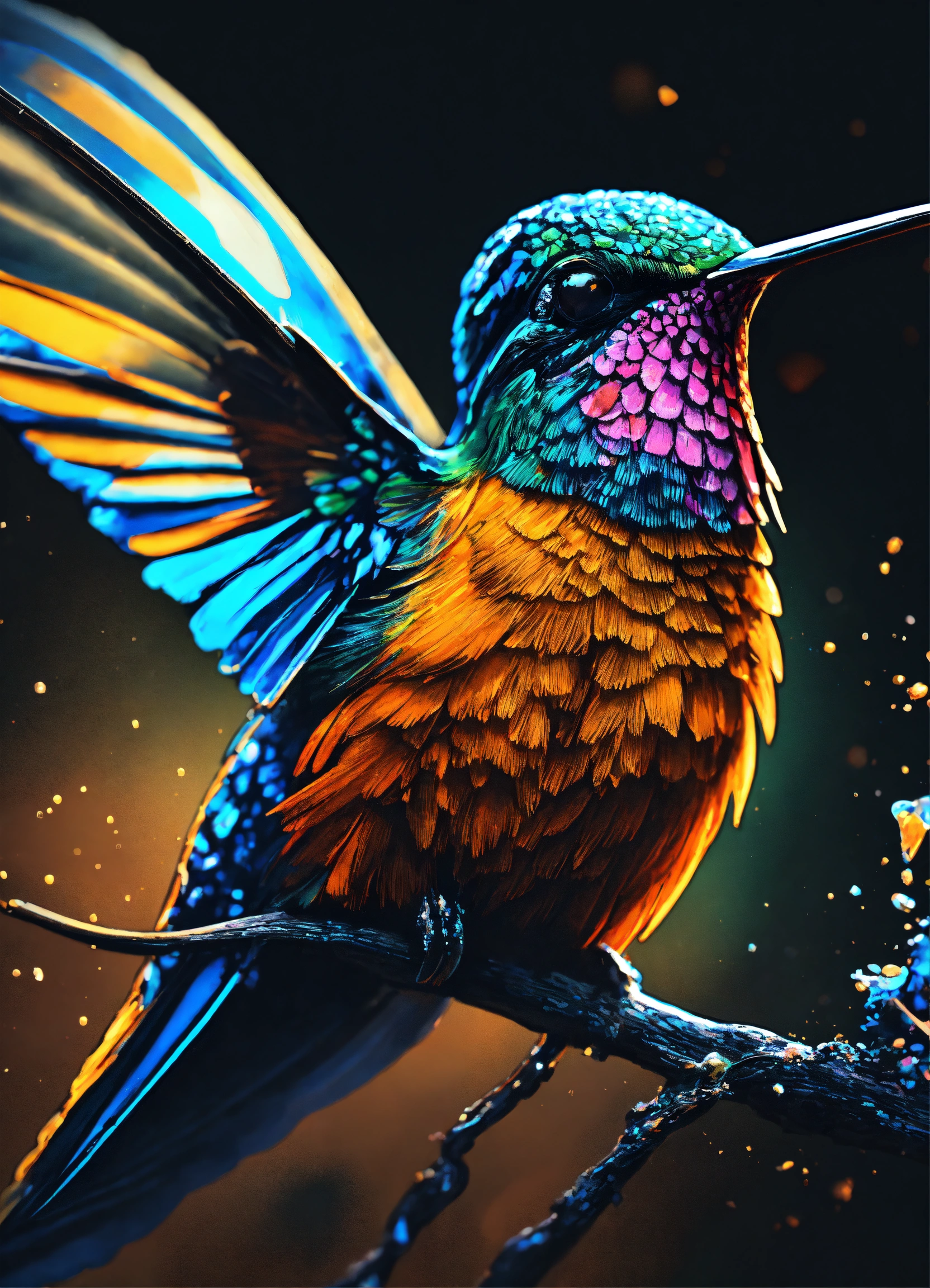 ((a hummingbird)), hyperdetailed eyes, tee-shirt design, line art, black background, ultra detailed artistic, detailed gorgeous face, natural skin, water splash, colour splash art, fire and ice, splatter, black ink, liquid melting, dreamy, glowing, glamour, glimmer, shadows, oil on canvas, brush strokes, smooth, ultra high definition, 8k, unreal engine 5, ultra sharp focus, intricate artwork masterpiece, ominous, golden ratio, highly detailed, vibrant, production cinematic character render, ultra high quality model