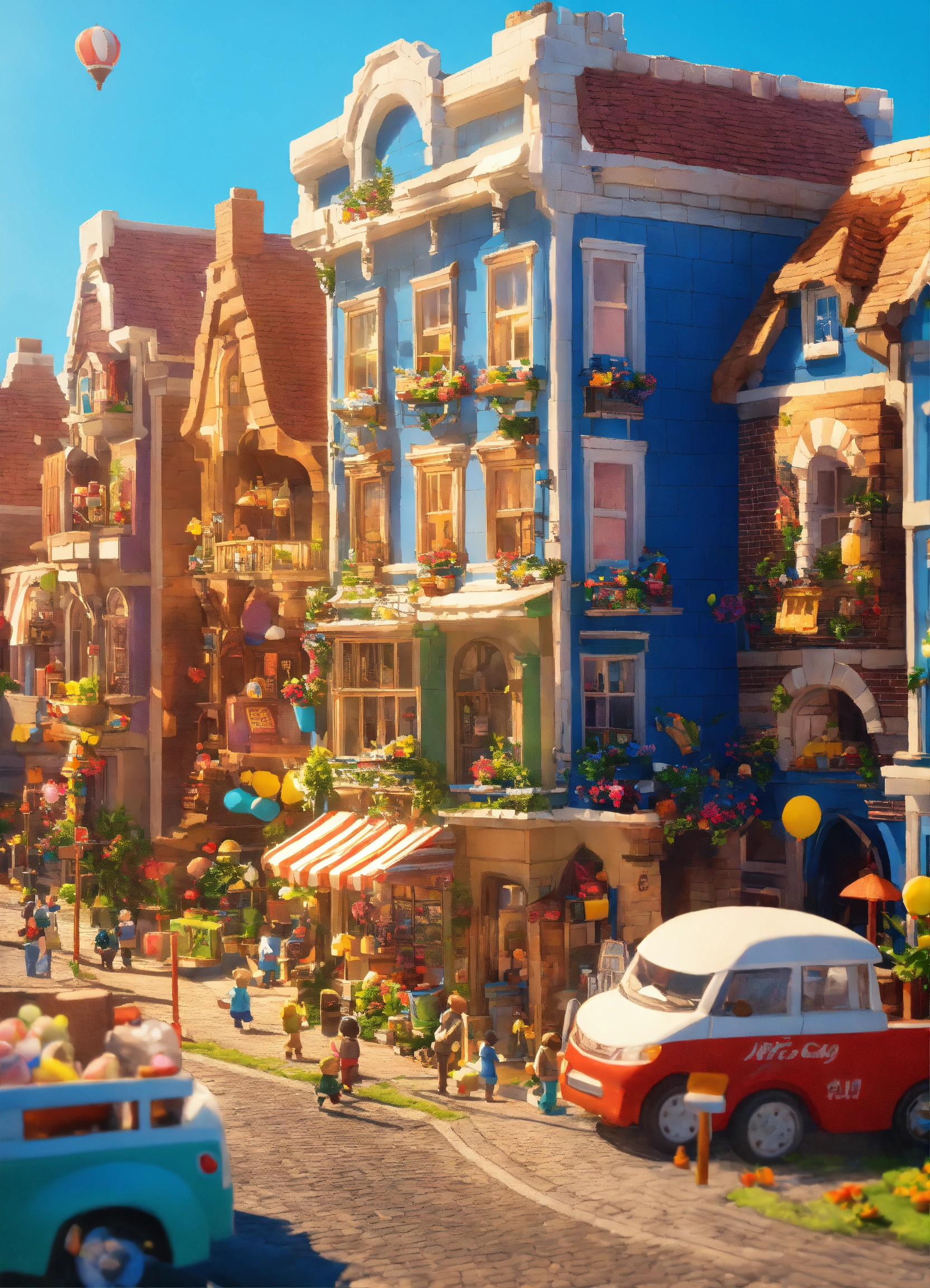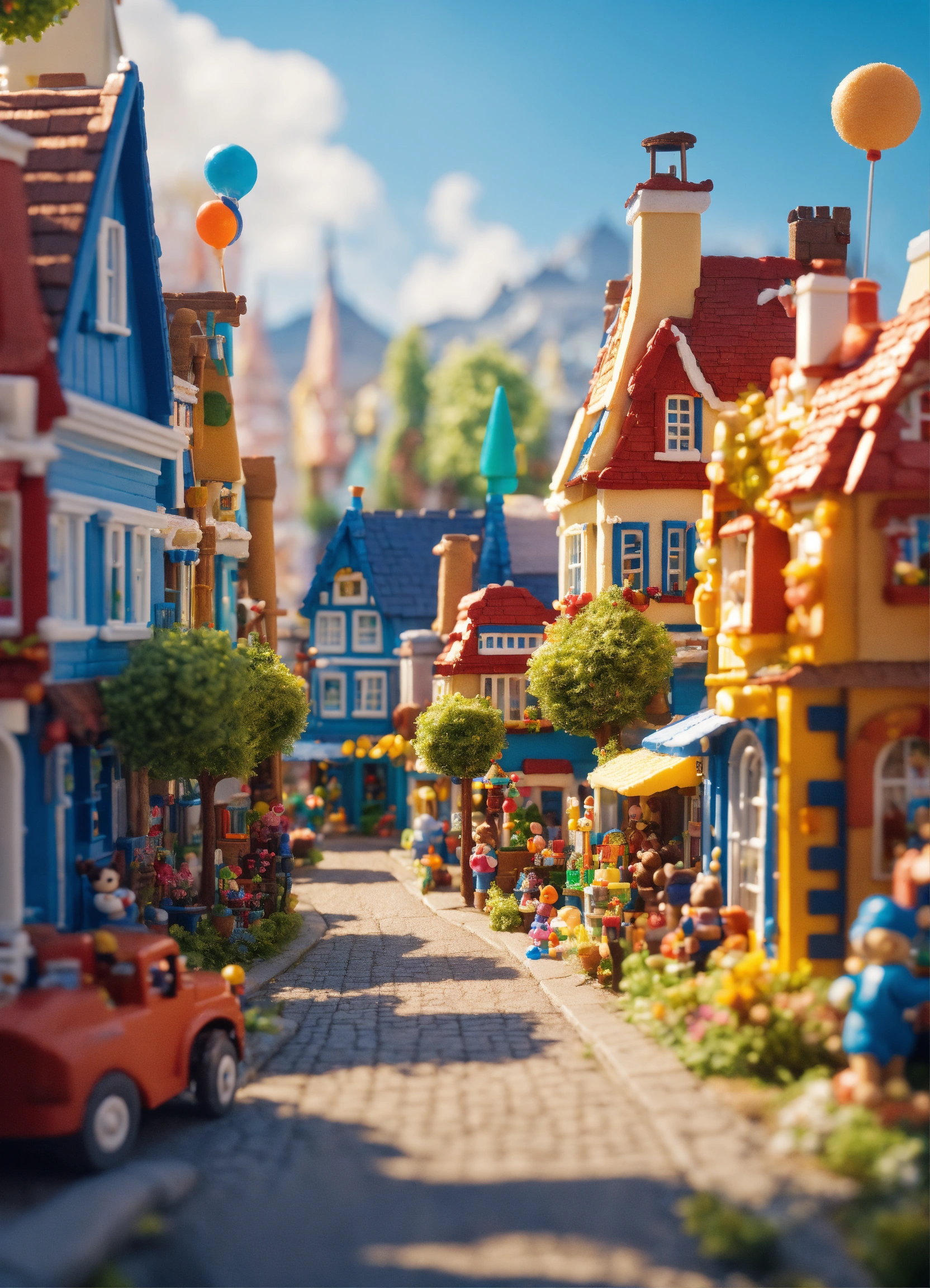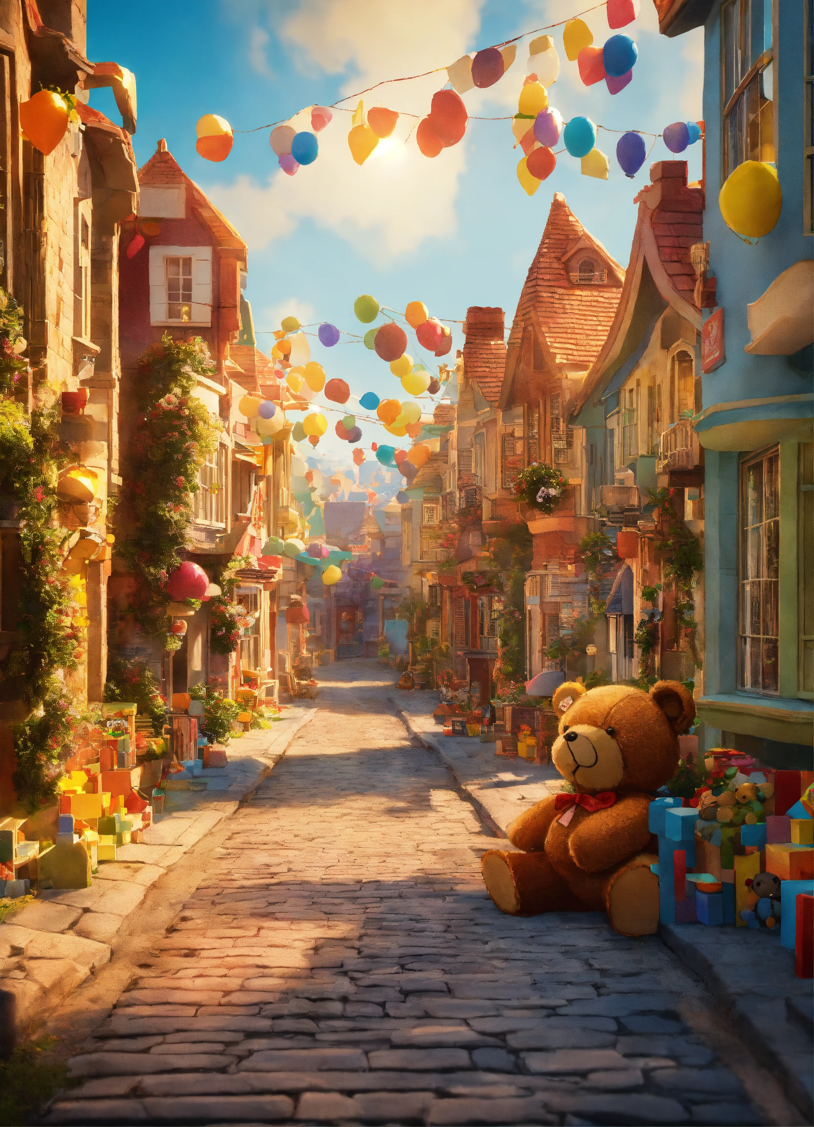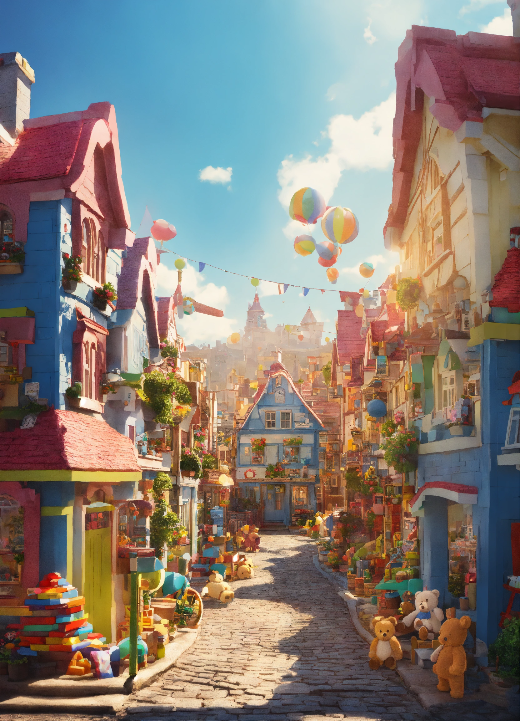 Create an image of a city street with whimsical fantasy houses where the entire infrastructure is constructed from toys like teddy bears, toy blocks, and soft milk. the image should depict a sunlit street with whimsical houses made entirely of toys and milk. it should be captured in broad daylight with full resolution, 4k quality, resembling a movie poster. the predominant colors should be blue and white.