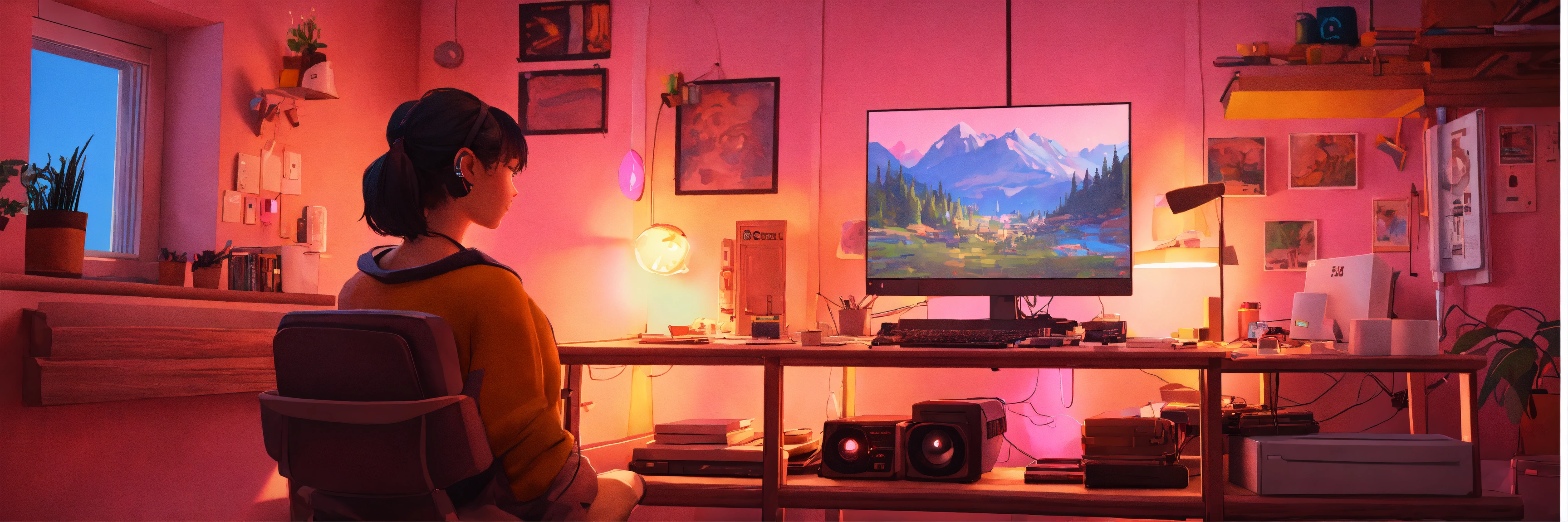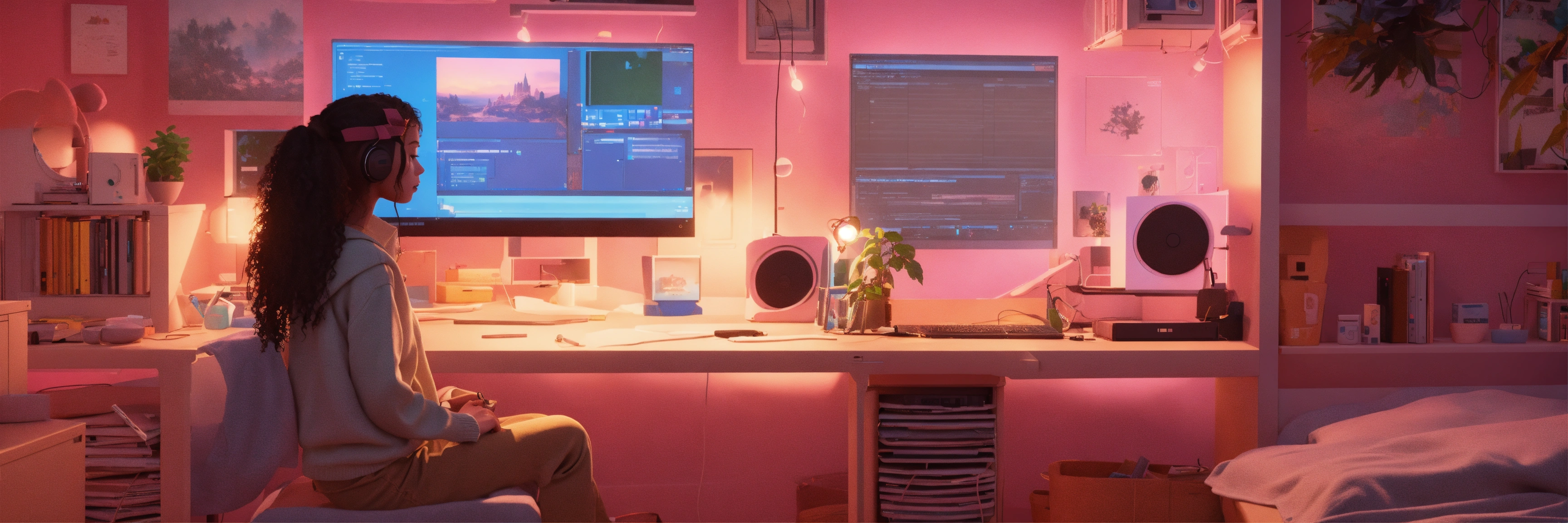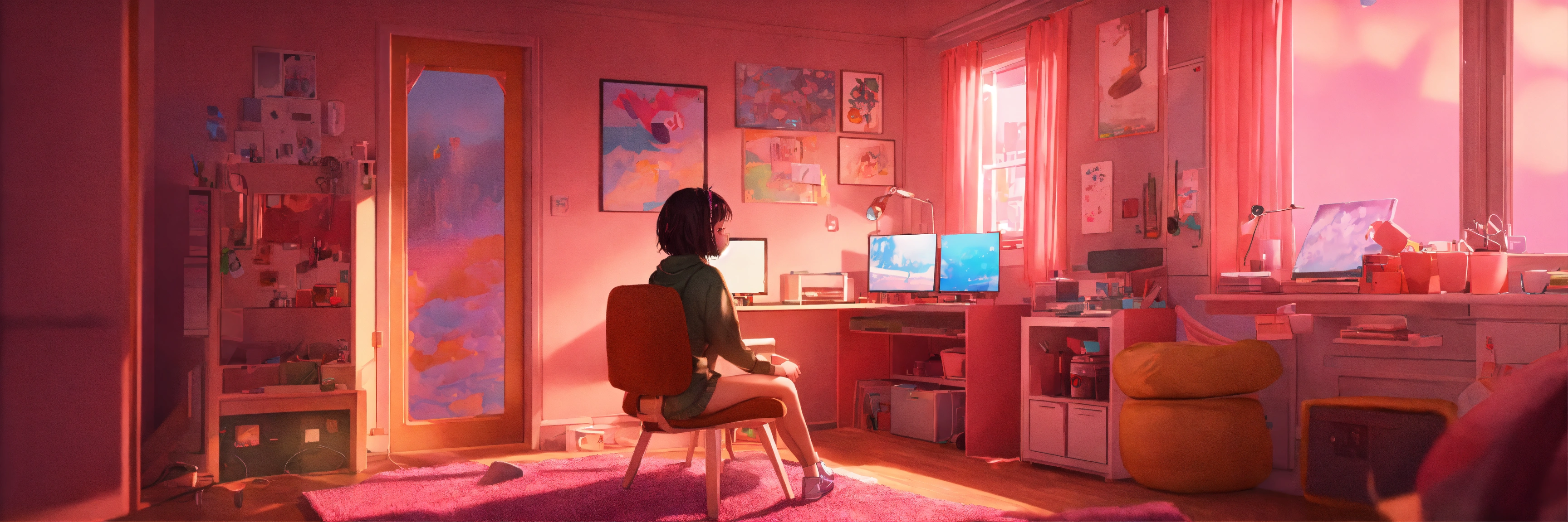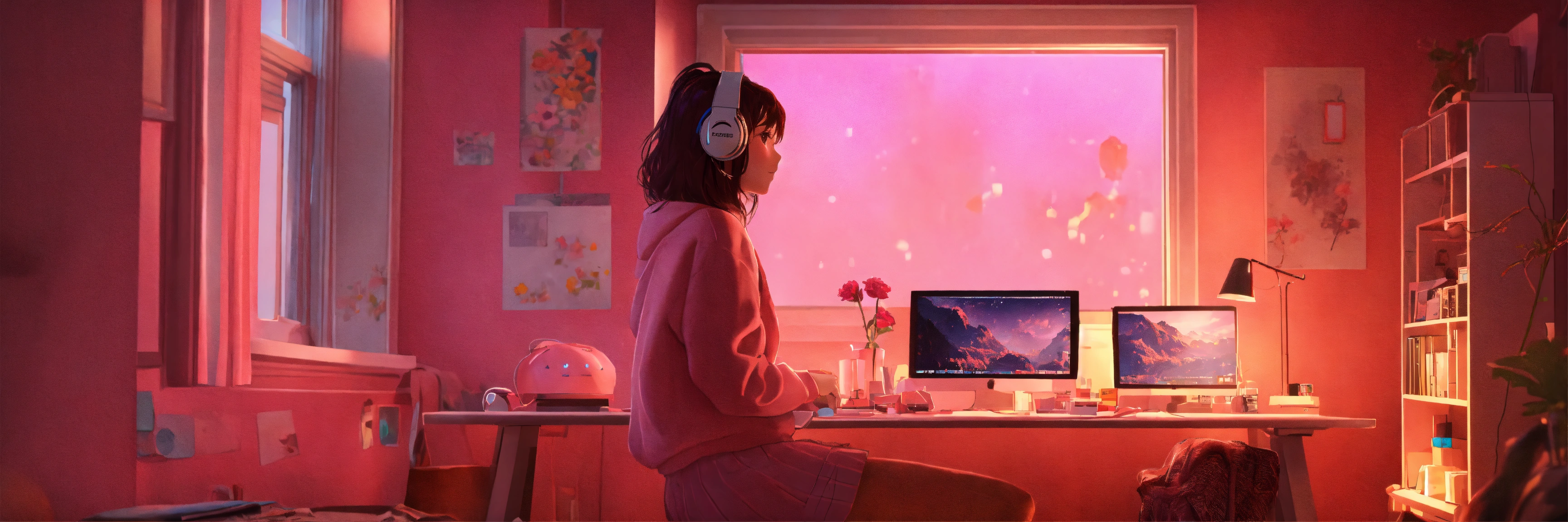 Cute lofi girl in front of his computer in her cozy and messy room, unreal engine 5 render, gorgeous lighting, pastel pink hues, 8k render, award-winning art