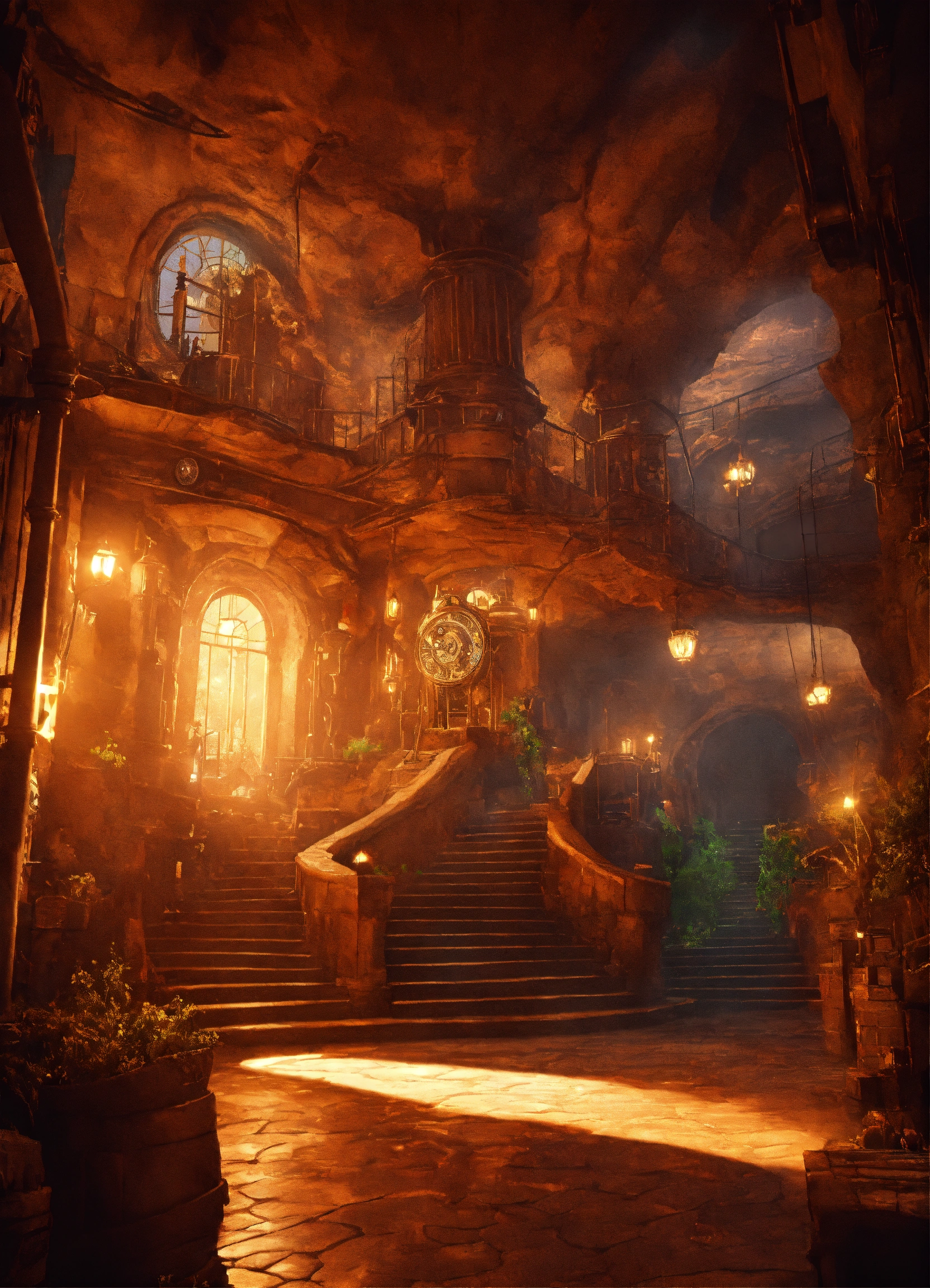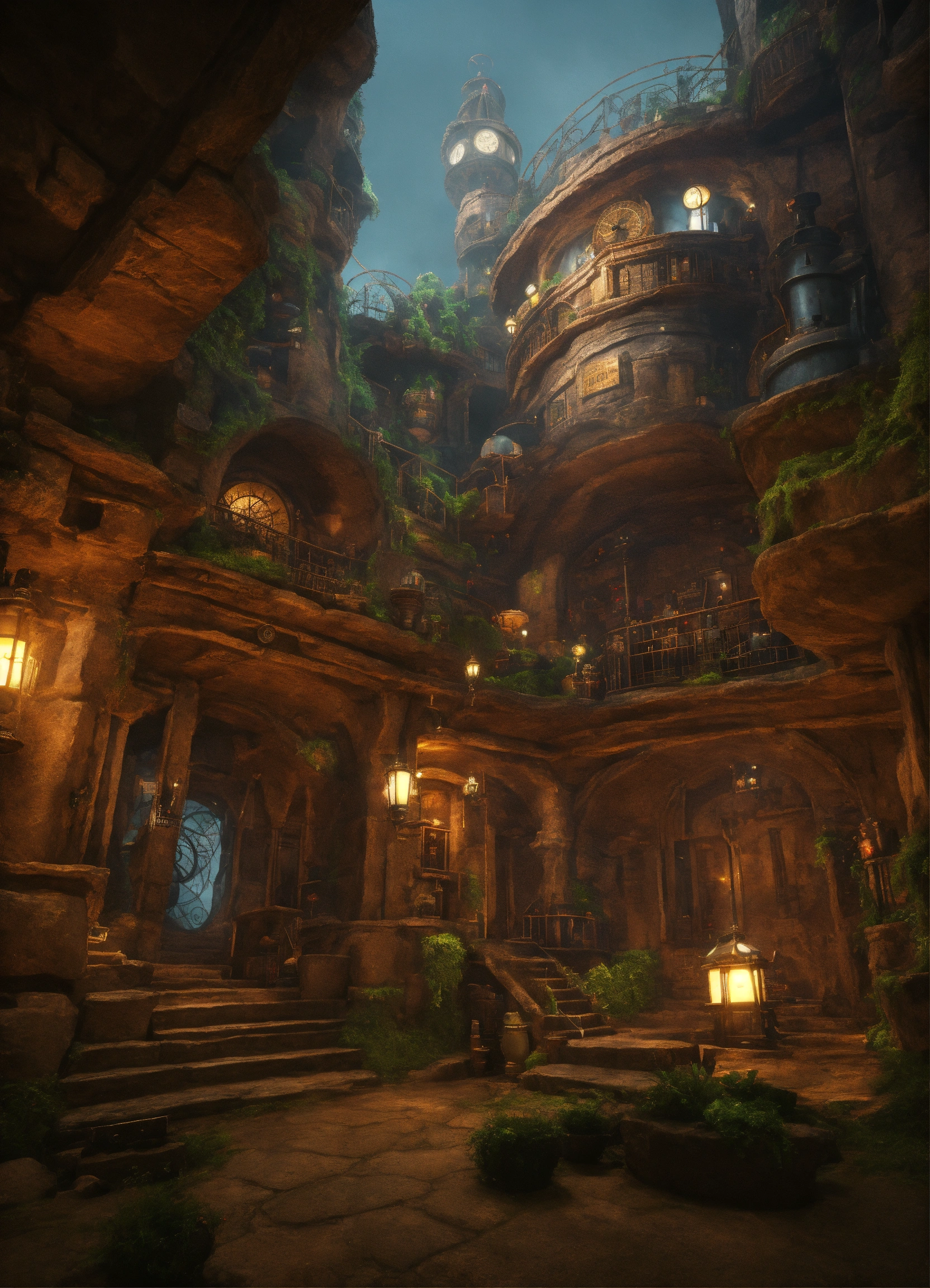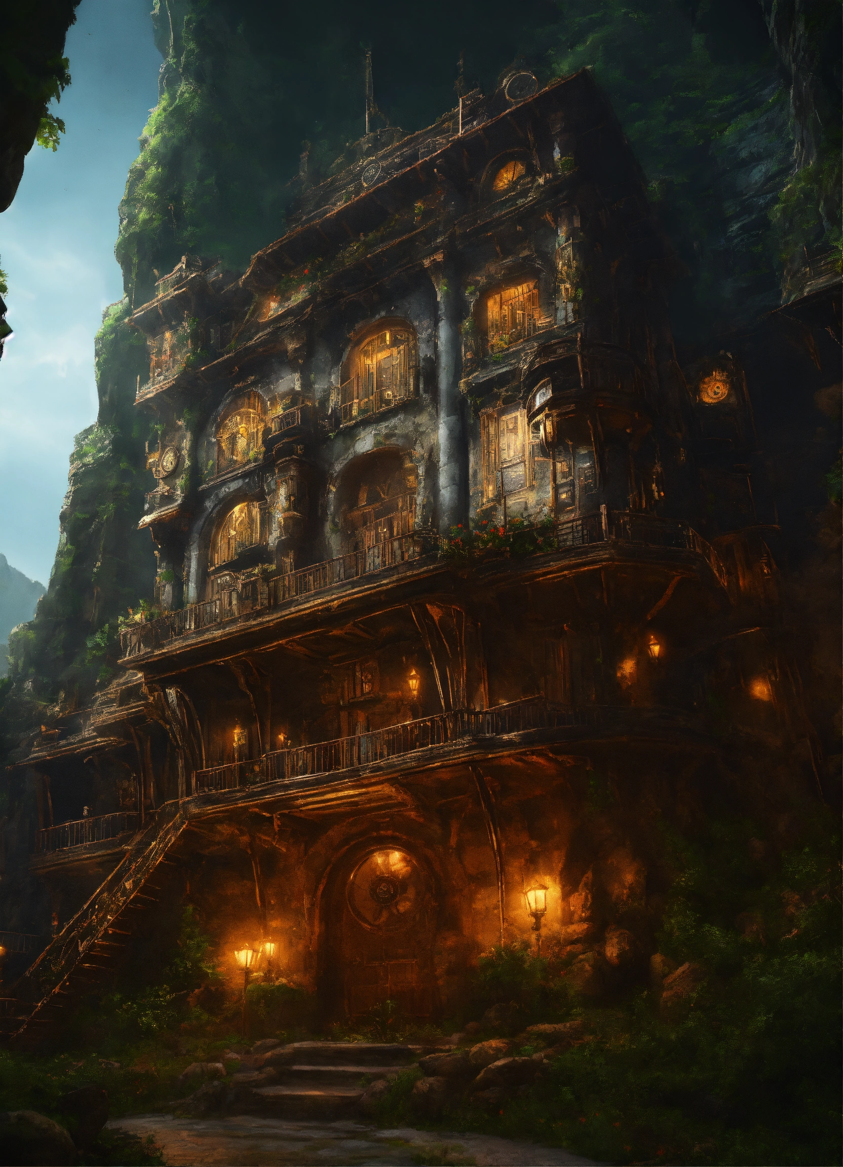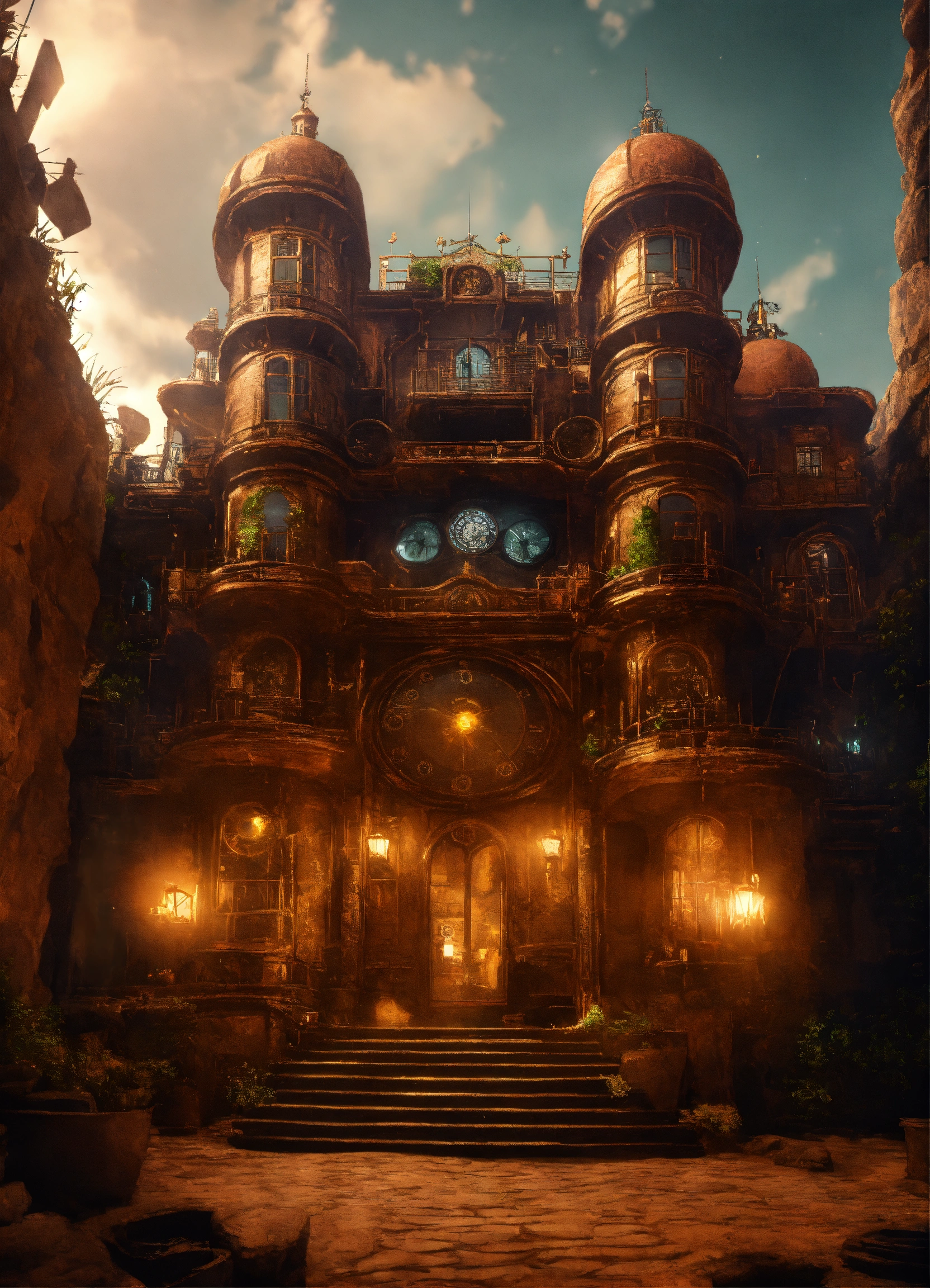 A clockwork mansion exterior. it is inside an underground city. there is no sky. there are robots skulking outside. 4k, ultra-realistic. photo quality. fantasy.