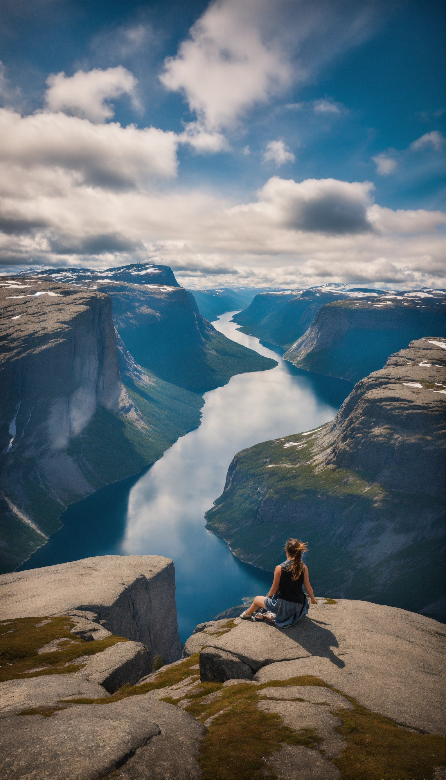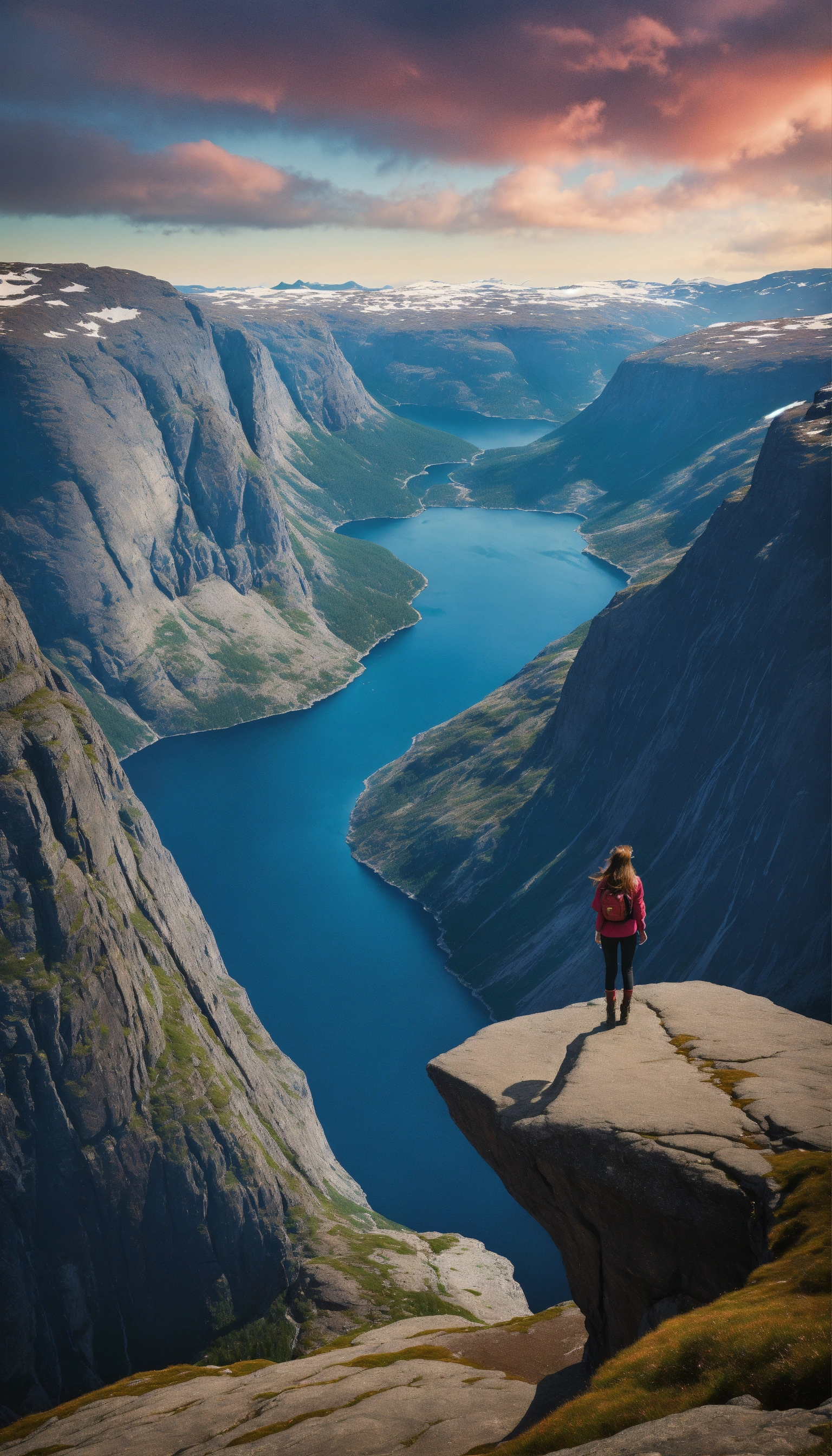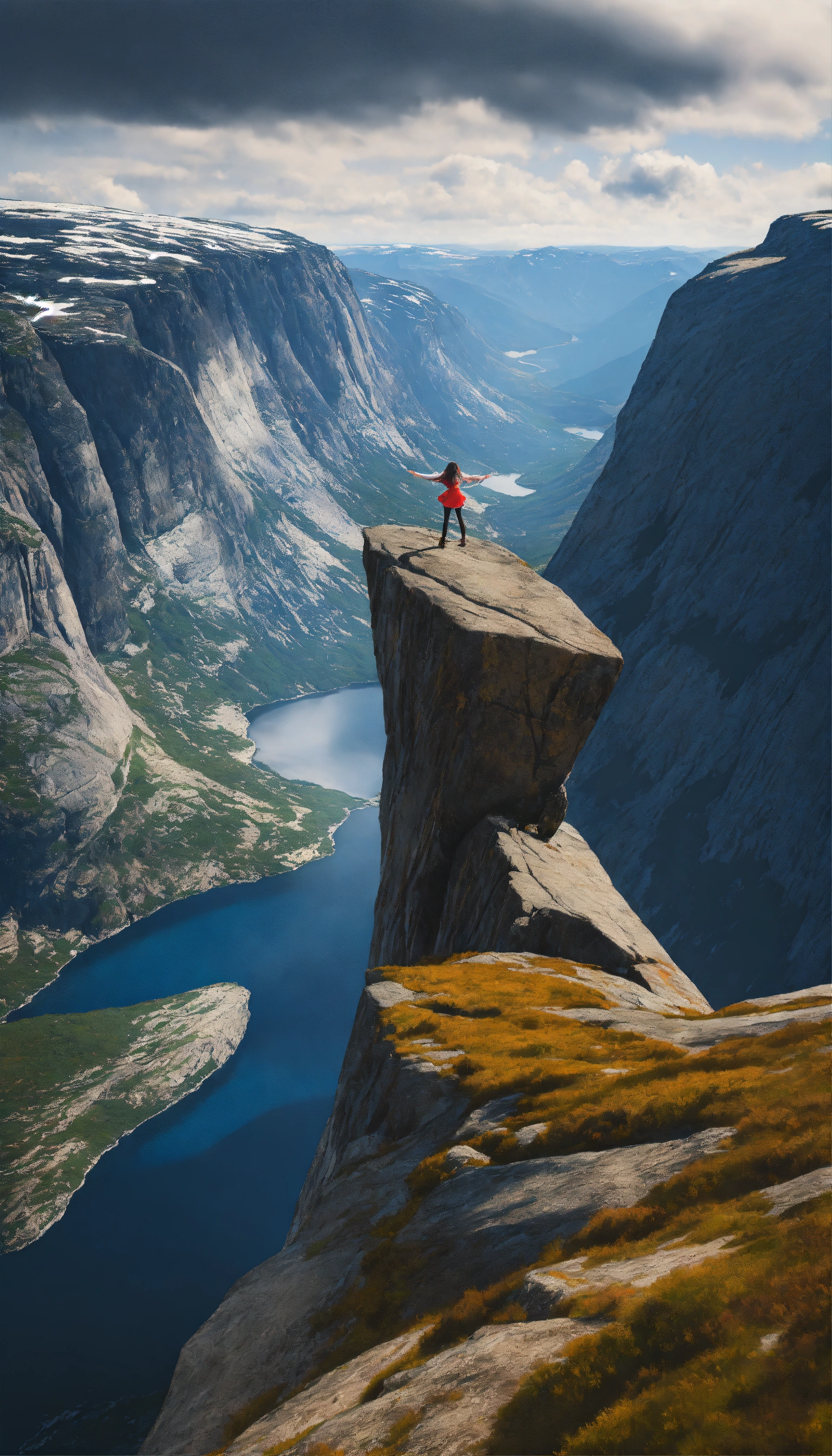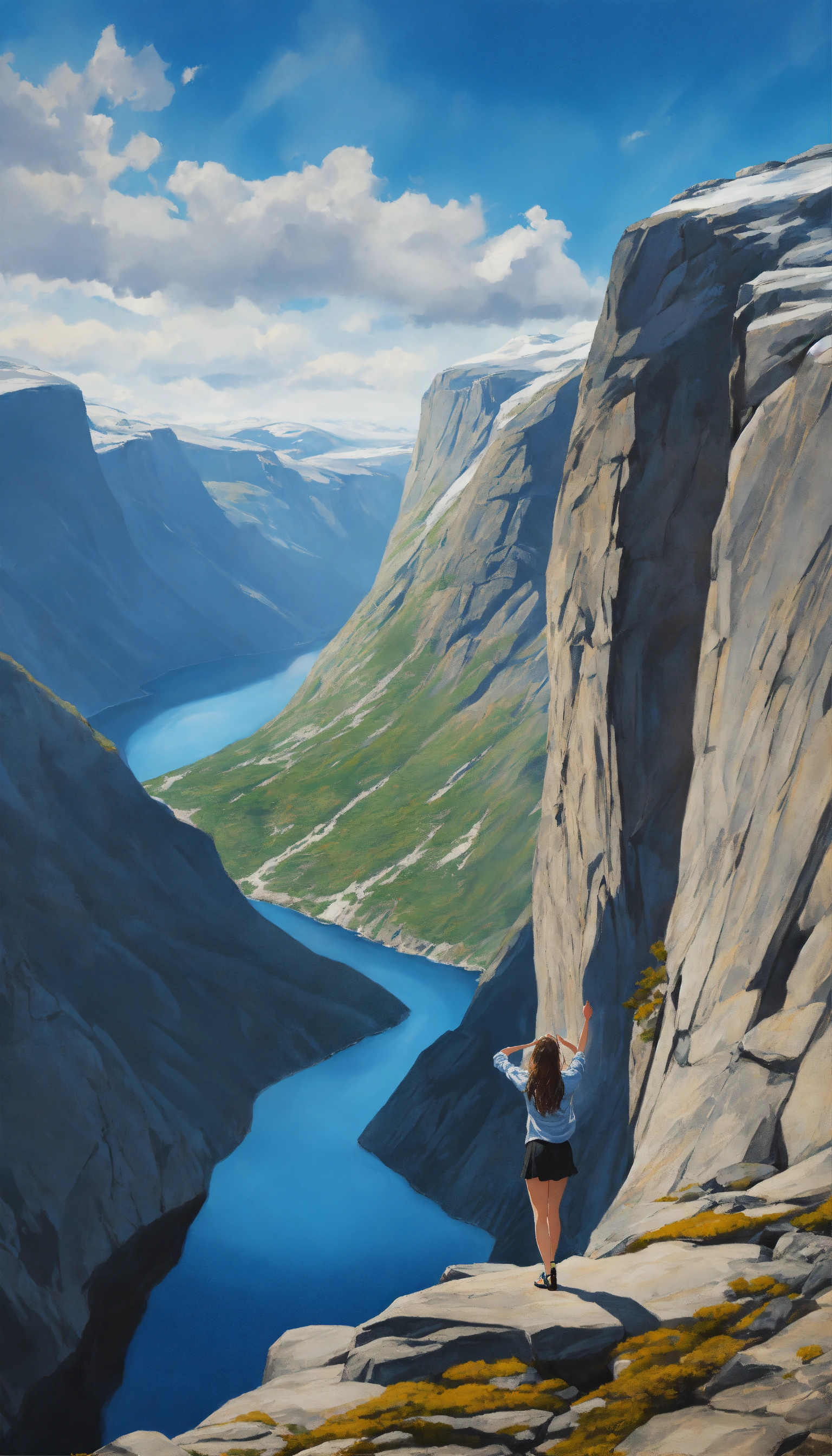 Please paint me a picture of the massive trolltunga at kjerag mountain in norway. standing on the rock is a girl with long hair flowing in the wind, her arms raised high towards the sky. the vast space around is cooled by the breeze, with deep blue skies and clouds. please create it in a surrealistic style with a color scheme that radiates the grandeur of the place, capturing sharp, detailed features.