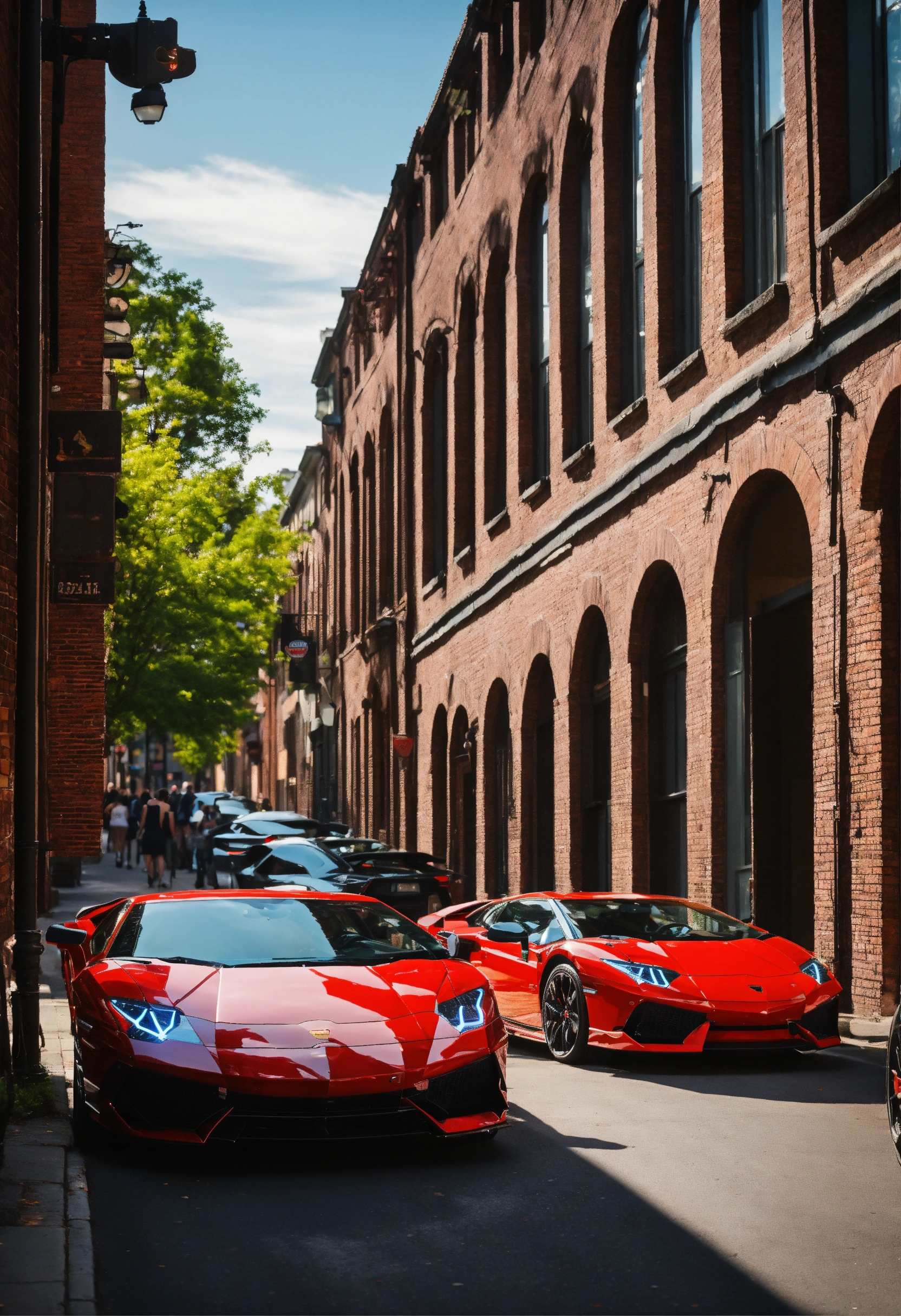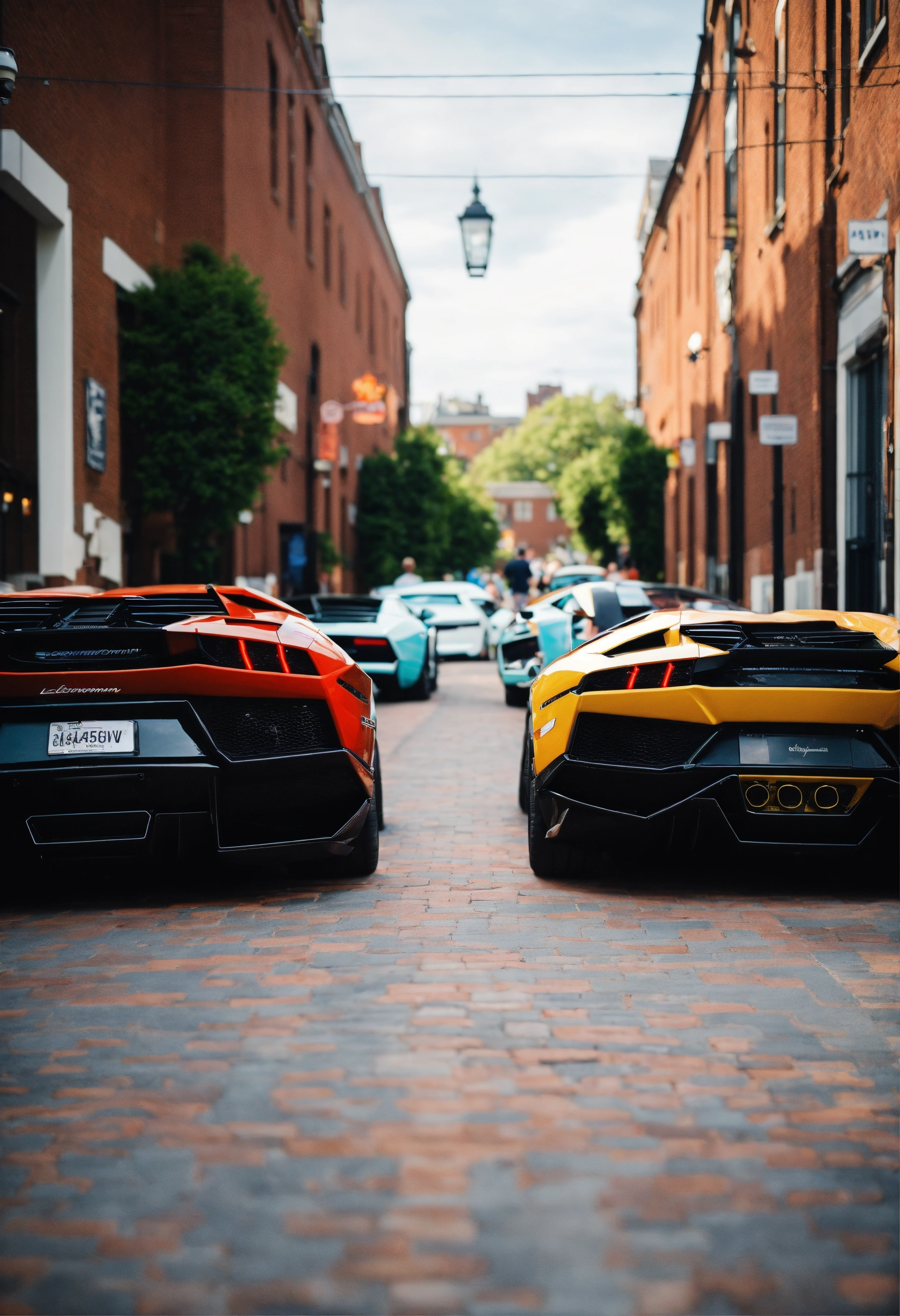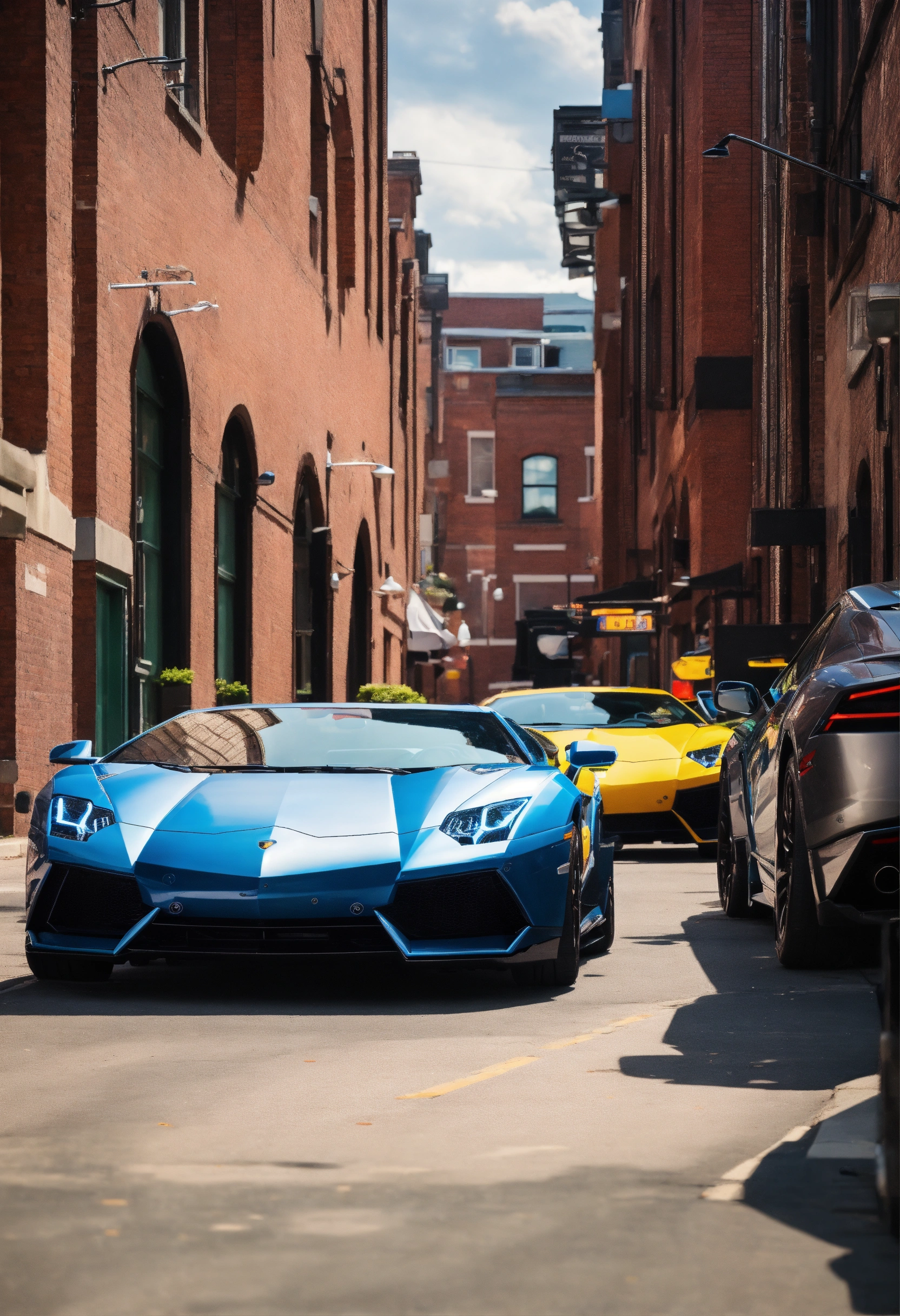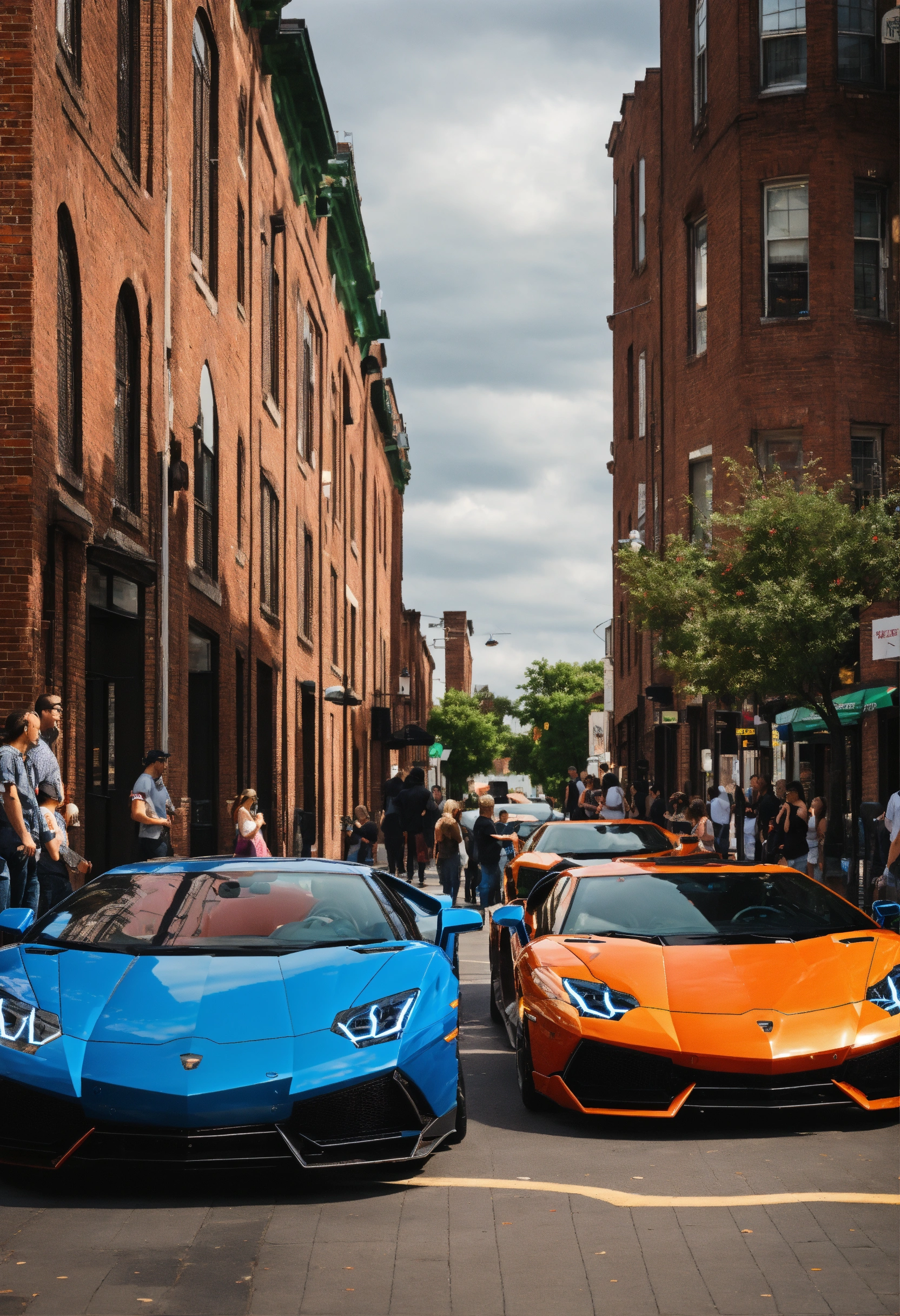 3 lamborghinis in a row on a short street, red brick buildings on left side, block party scene car show people in the street