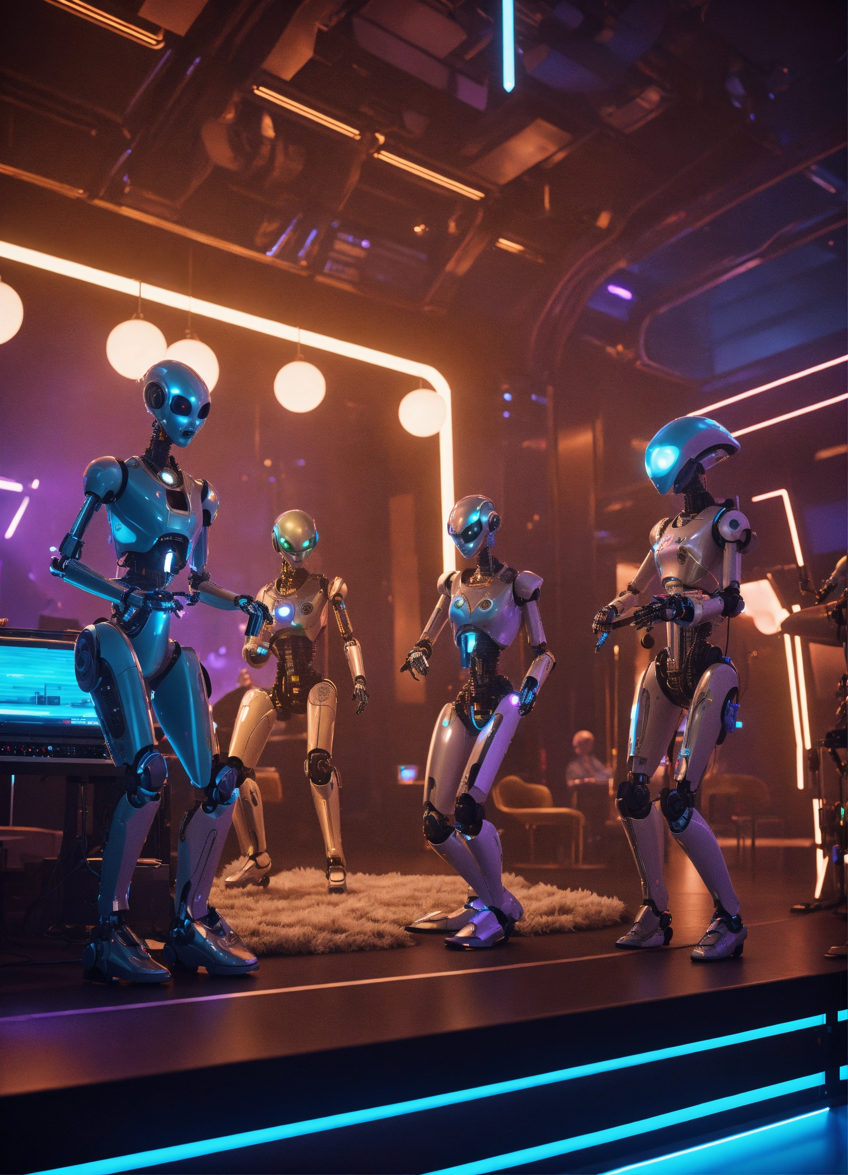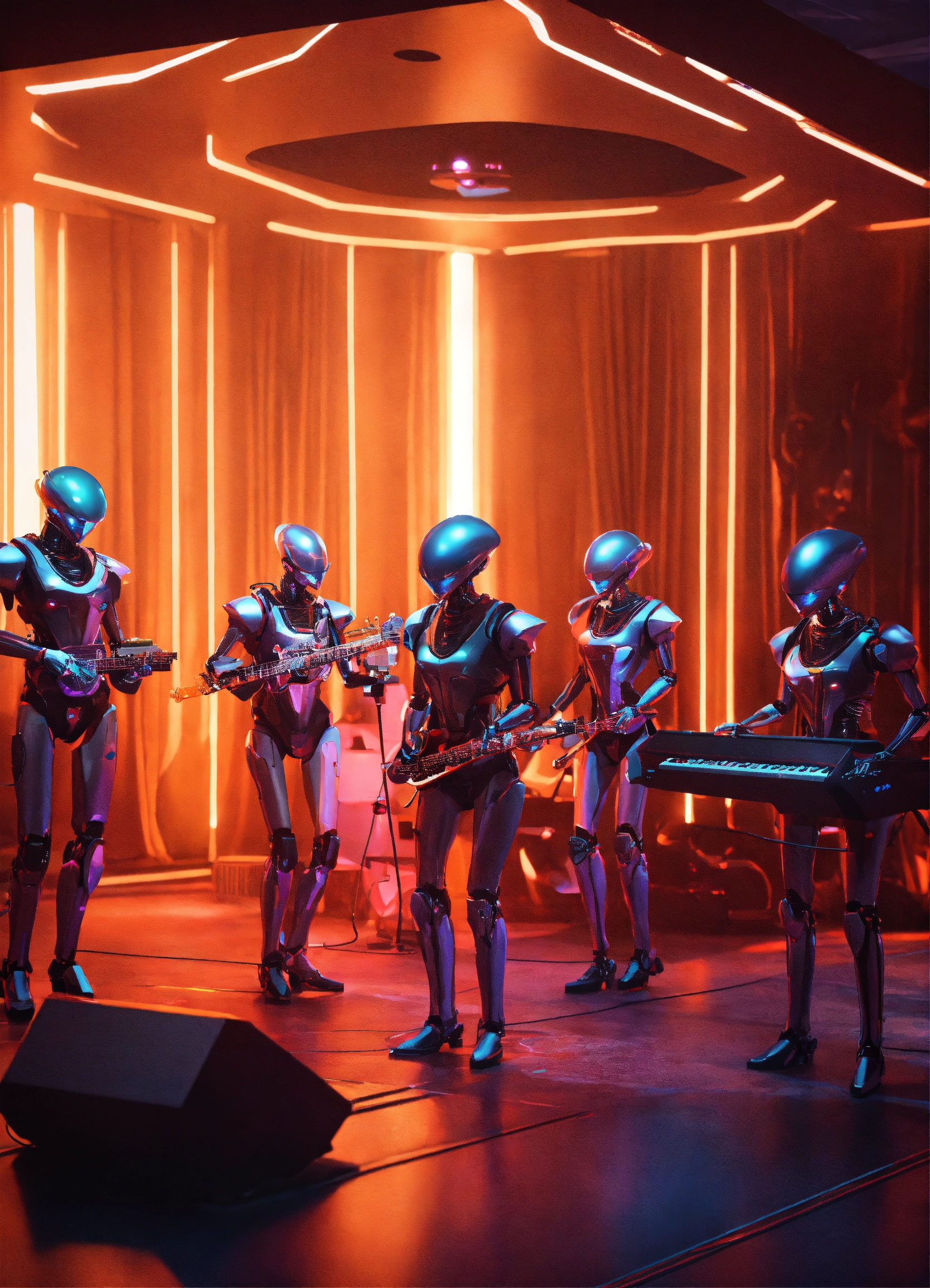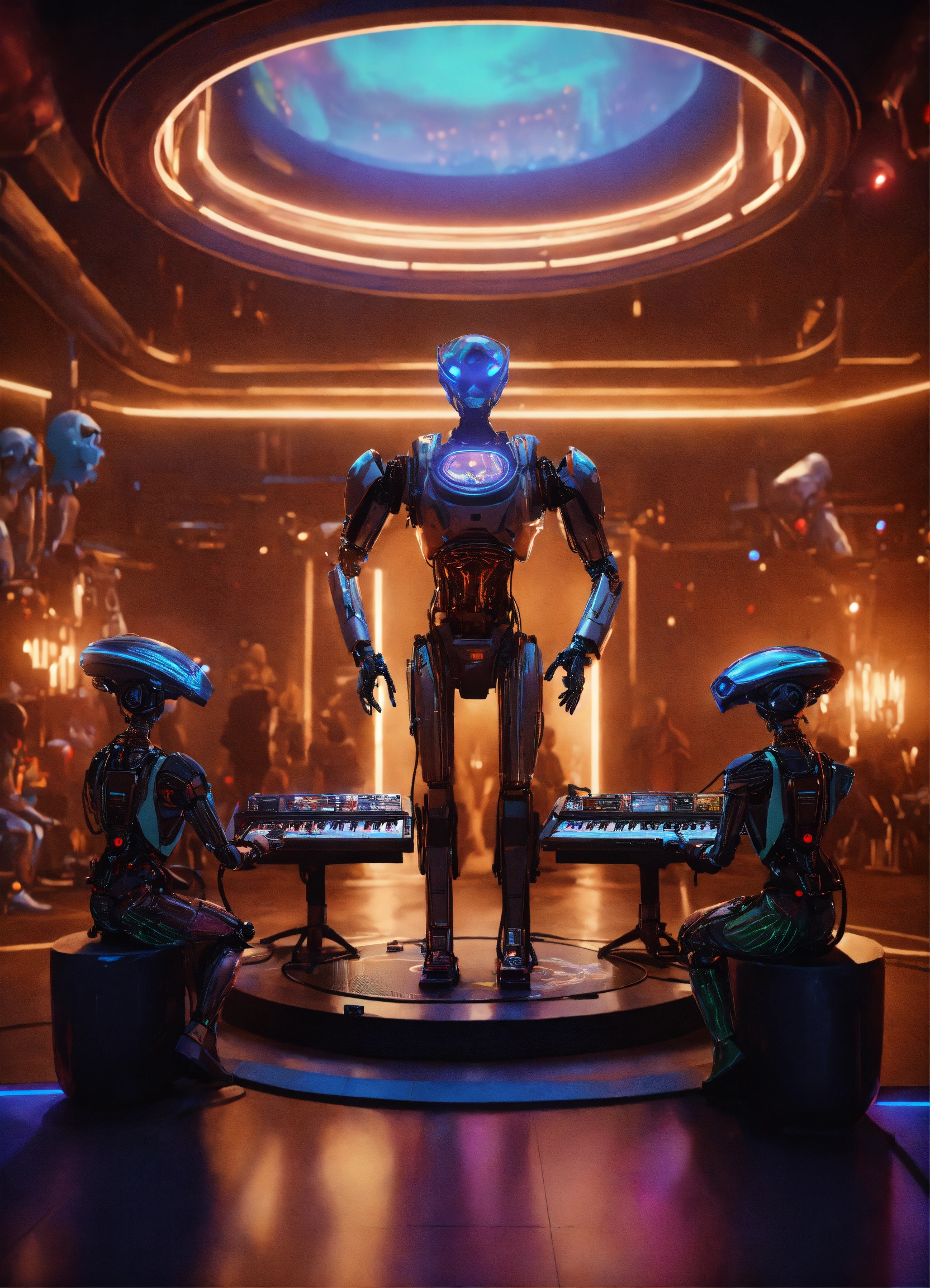 Band of 4 robot musicians with alien electric instruments playing hypnotic music on stage to a crowd of zombie like people in a luxury space port lounge reception area, realistic, futuristic, sci-fi, 8k, unreal engine, pixar, disney, zaha hadid