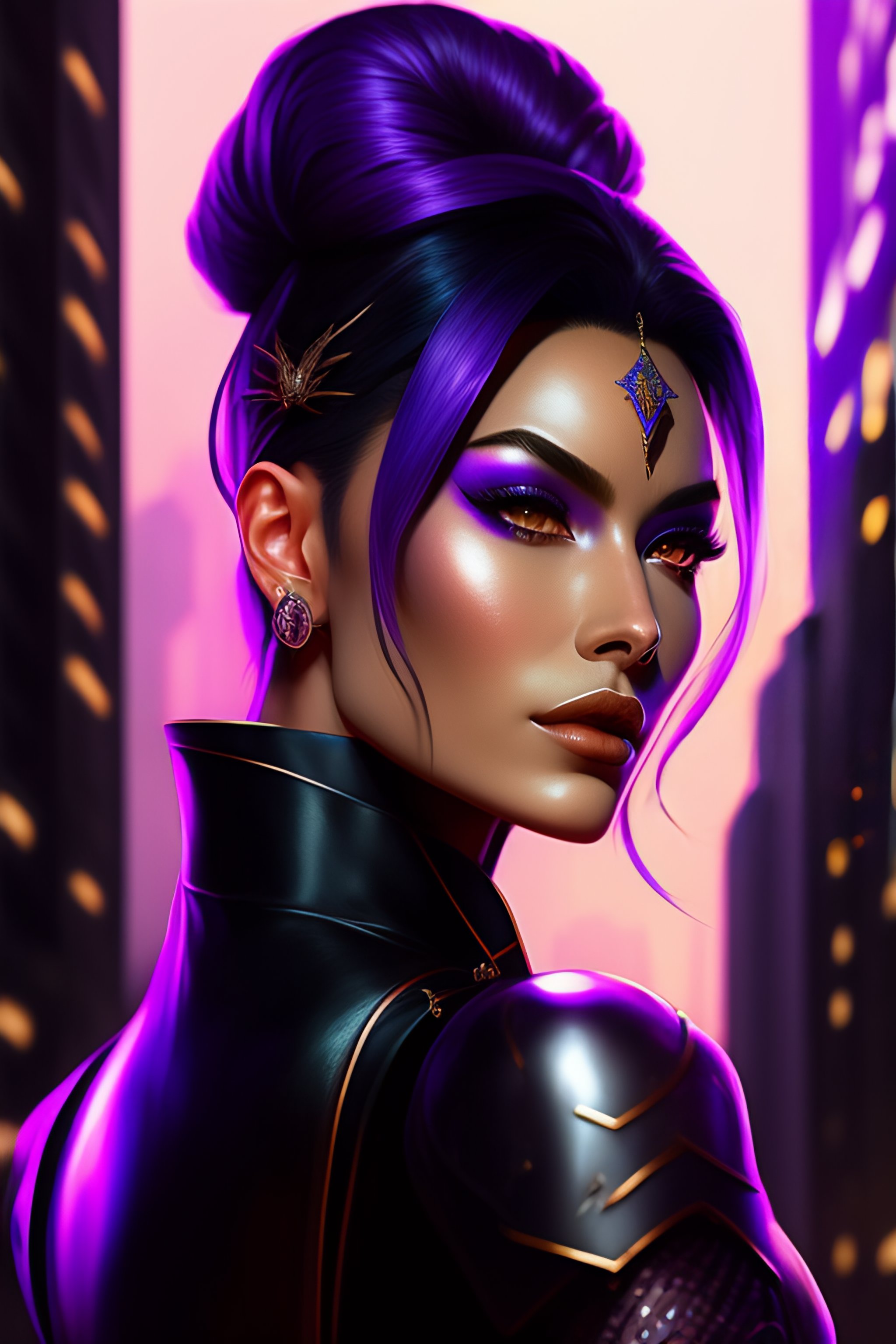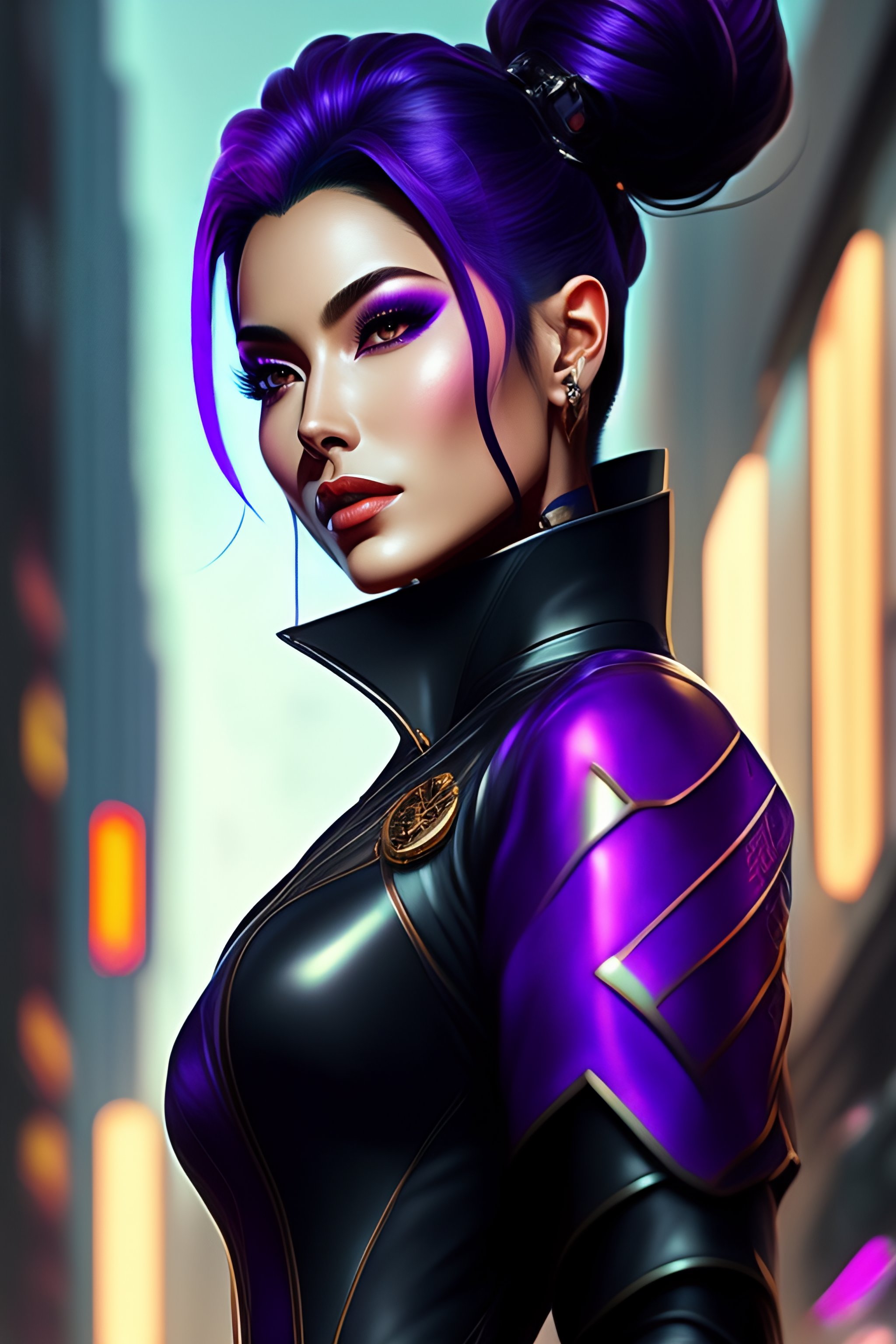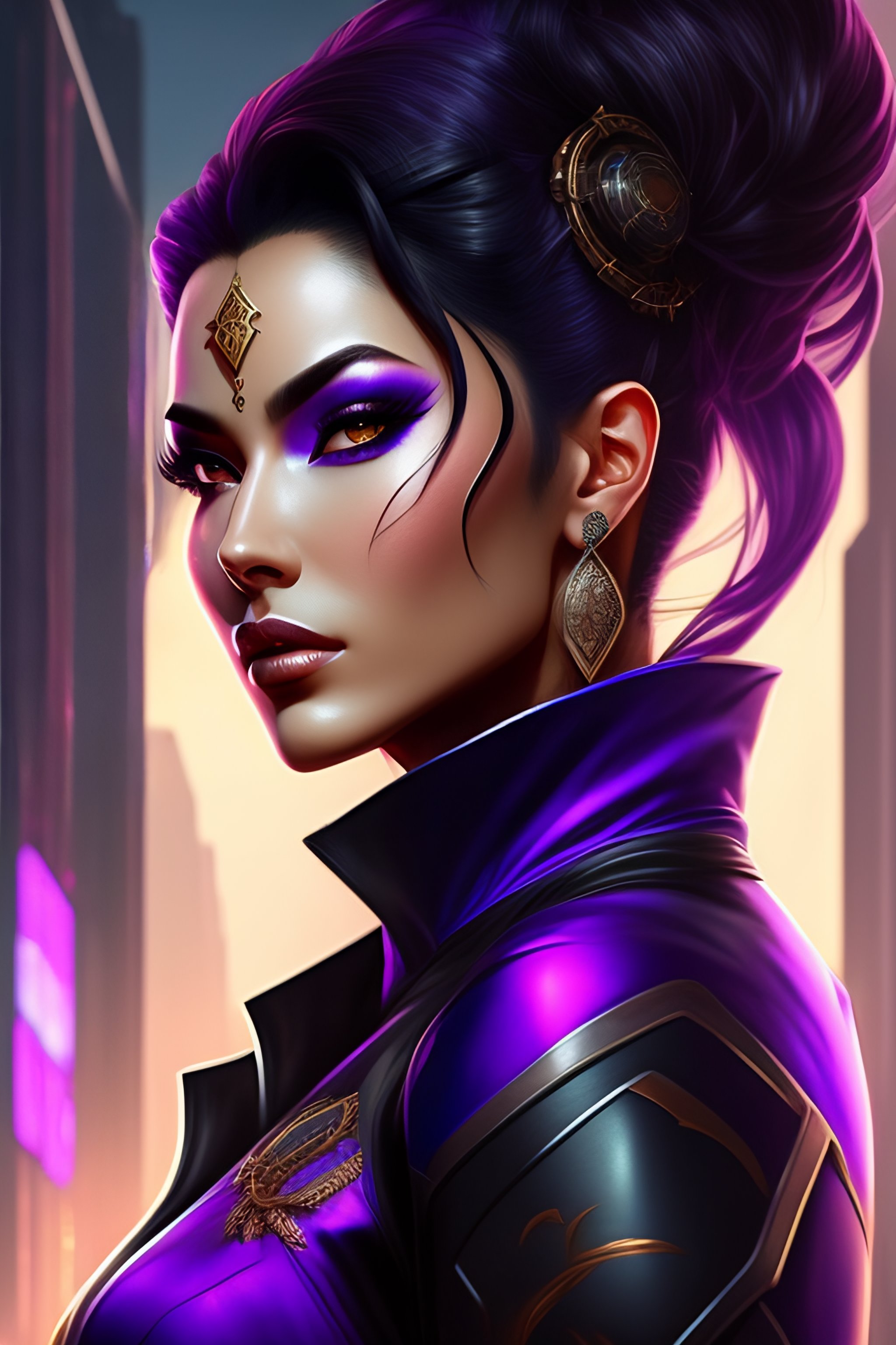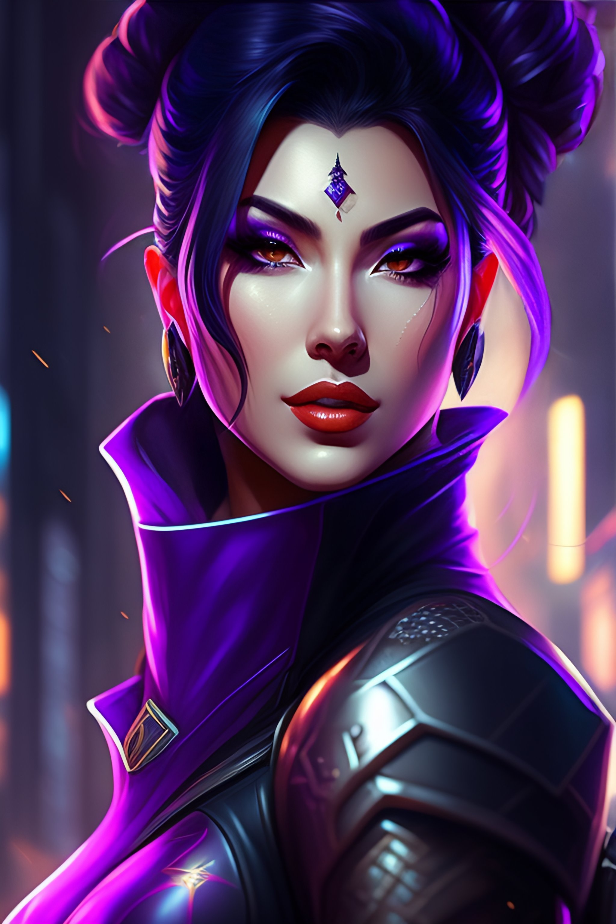 Portrait of widowmaker from overwatch looking back over shoulder with spider tattoo on back, armored black and purple ninja wardrobe, in city cyberpunk night, sci-fi and fantasy, intricate and very very beautiful and elegant, highly detailed, digital painting, artstation, concept art, smooth and sharp focus, illustration, art by tian zi and wlop and alphonse mucha