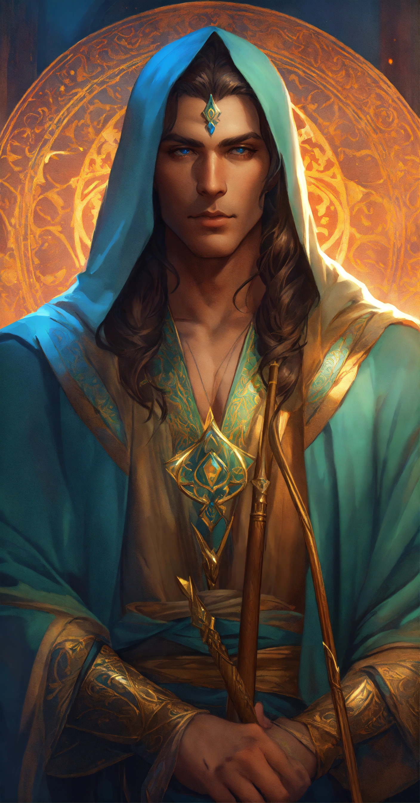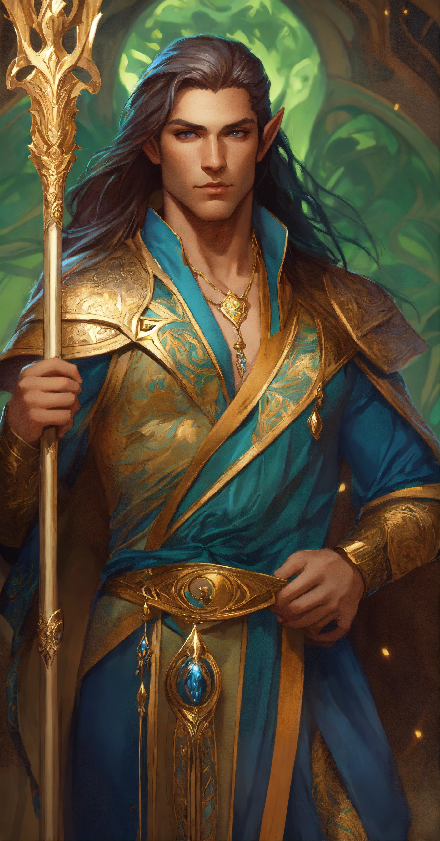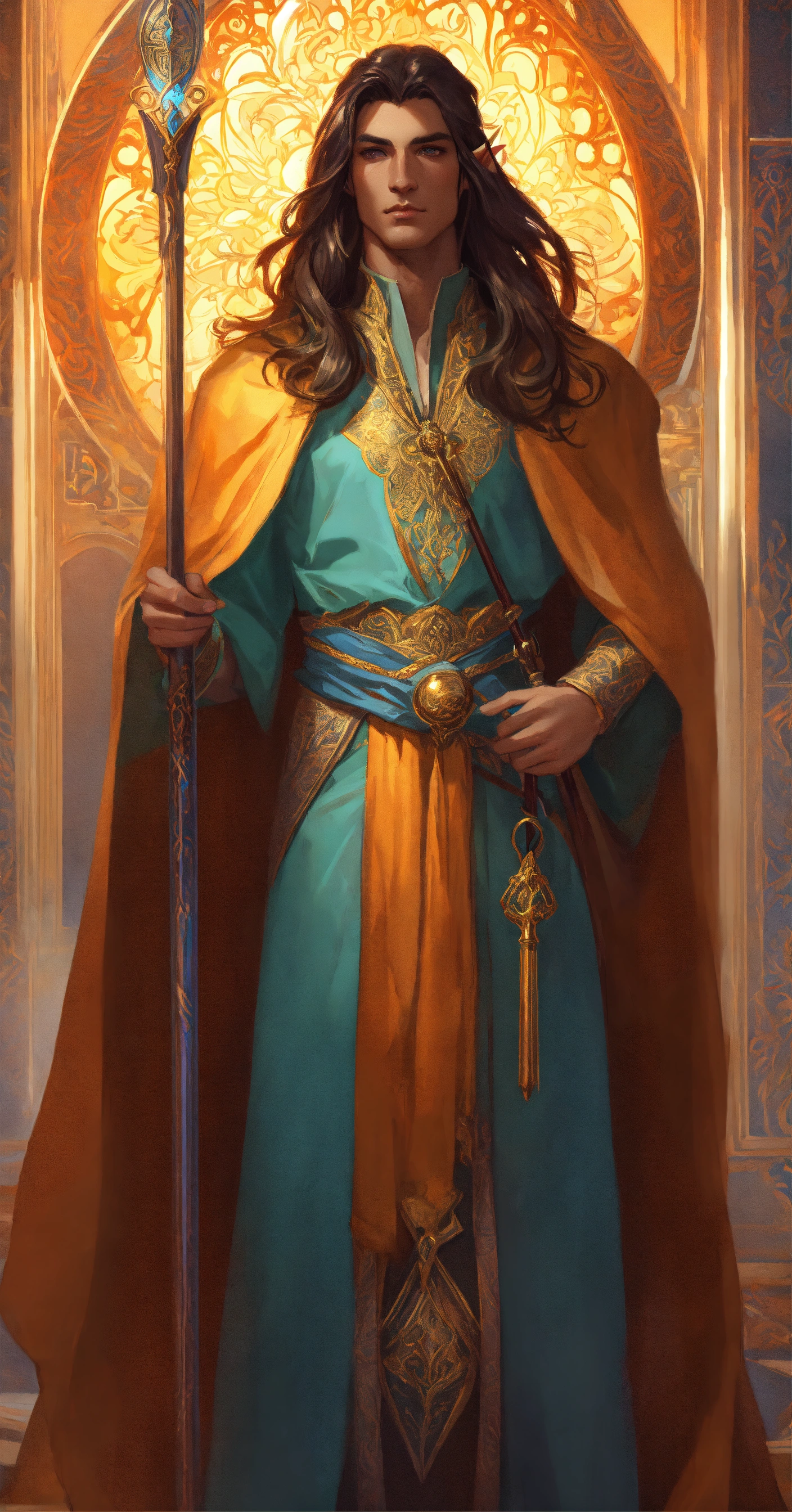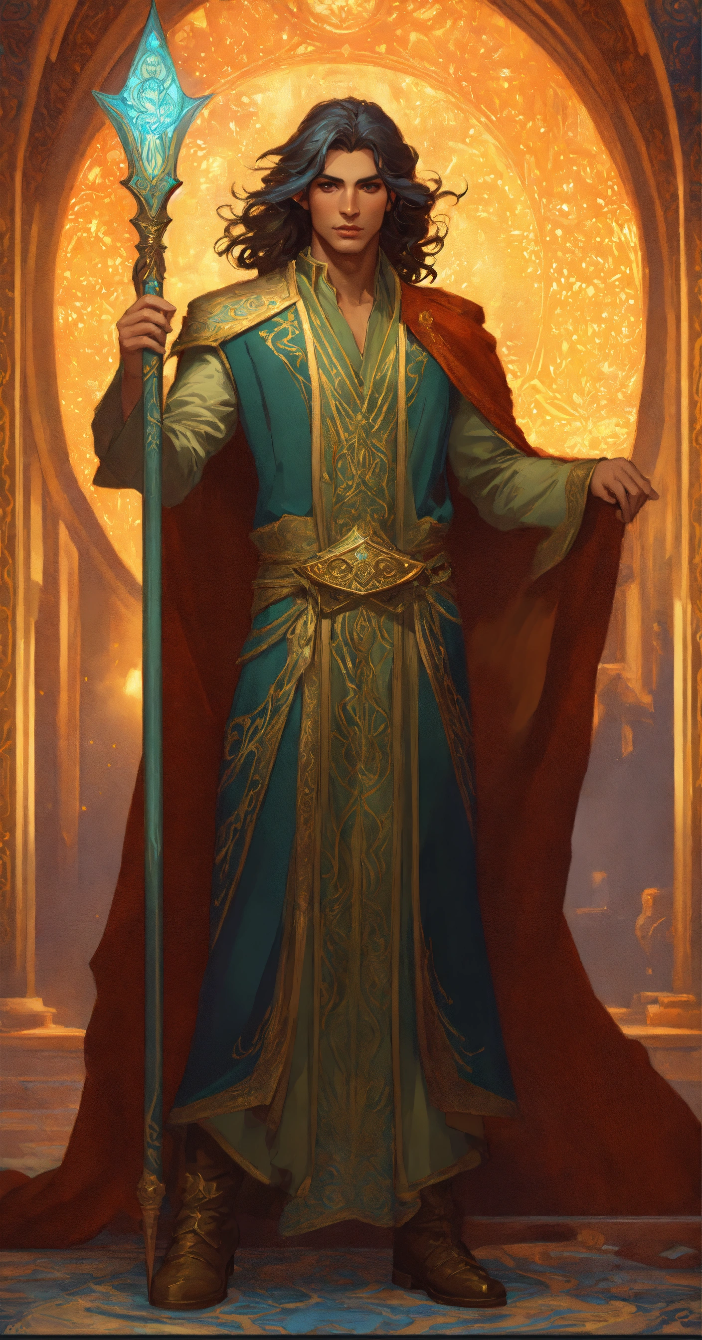 Persian male elf wizard with magical staff, high cheekbones, full body, long hair, highly detailed, digital painting, artstation, concept art, smooth, sharp focus, illustration, art by artgerm and greg rutkowski and alphonse mucha, erte, 8 k
