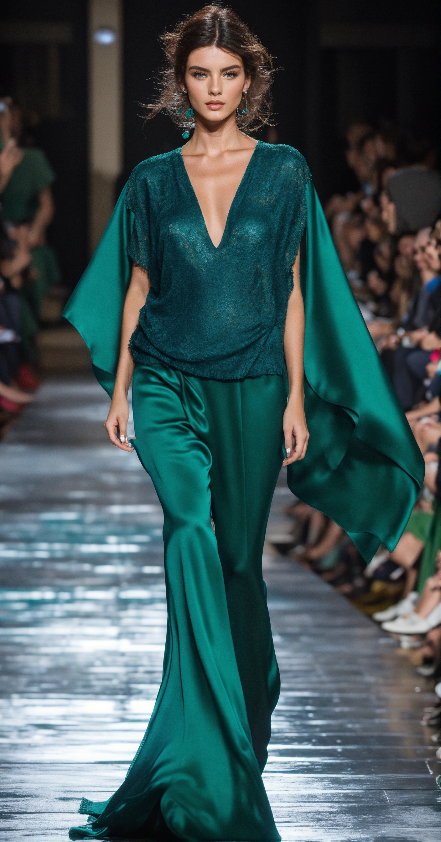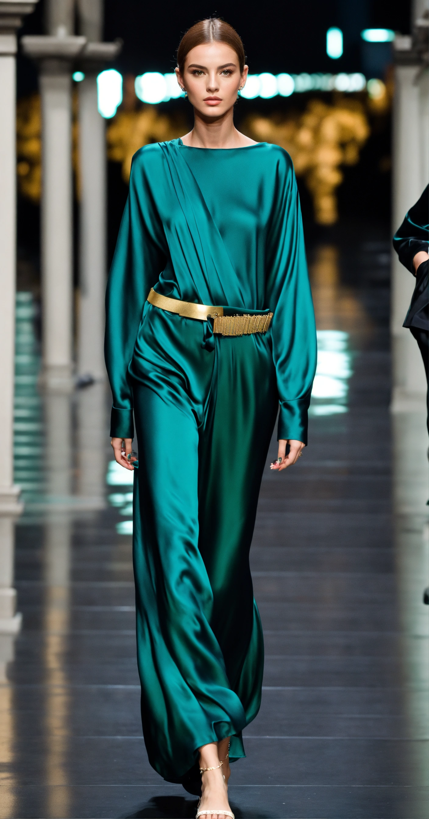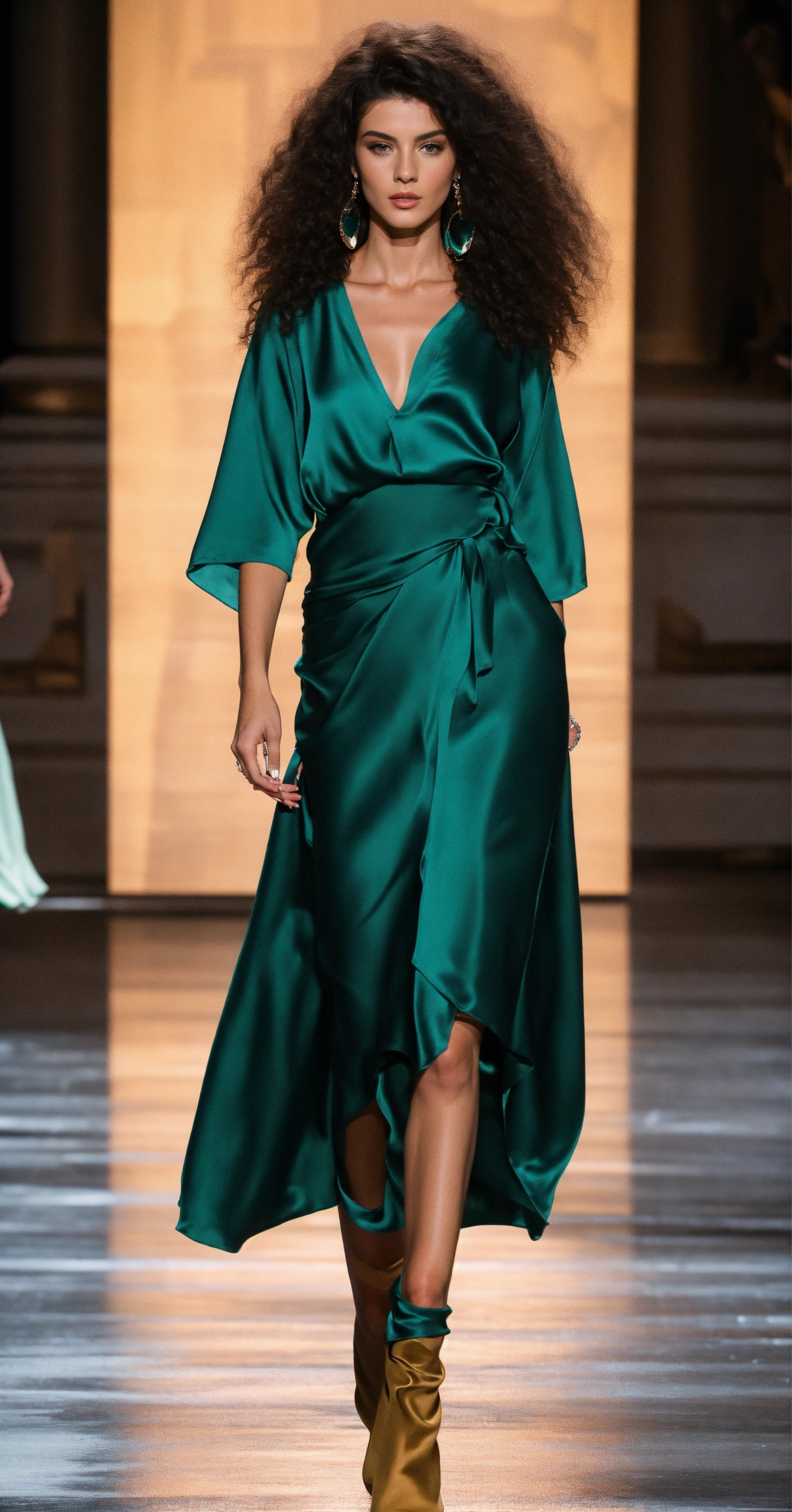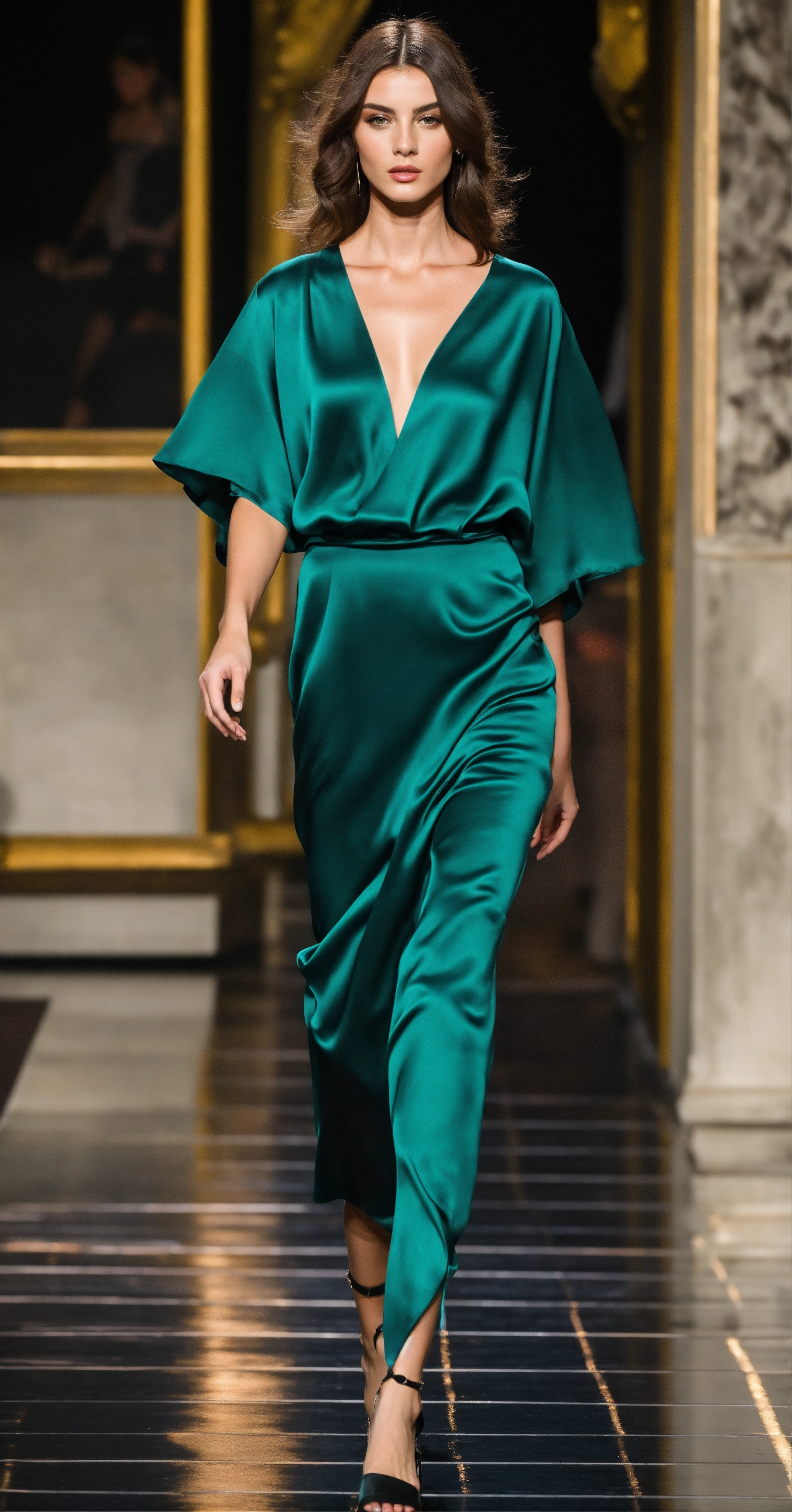 Ultra realistic full body photo of italian female model walking the runway modeling novelty interesting complex unusual street romantic modern brave funky dark teal green silk comb8ned with jersey dolman top