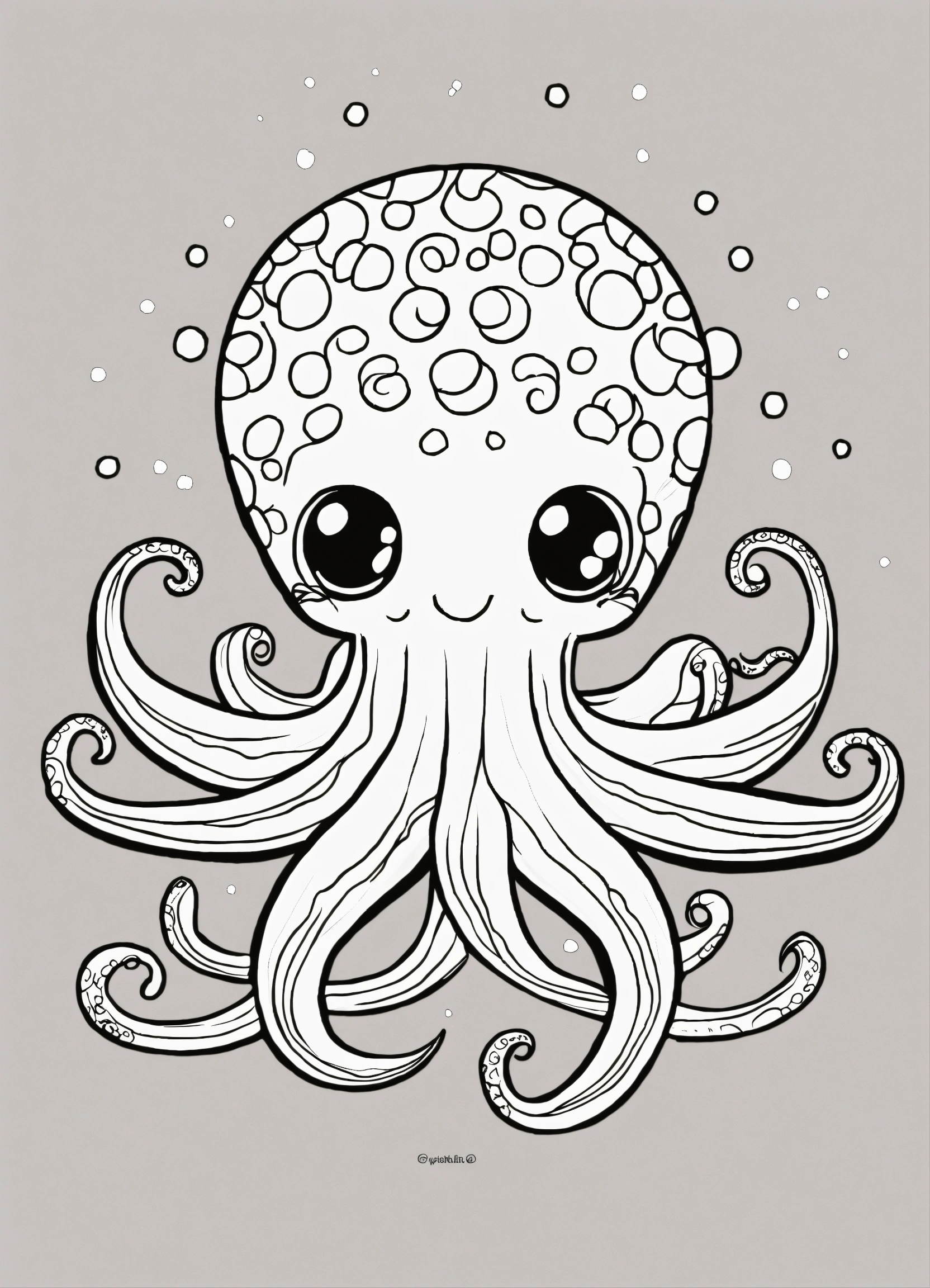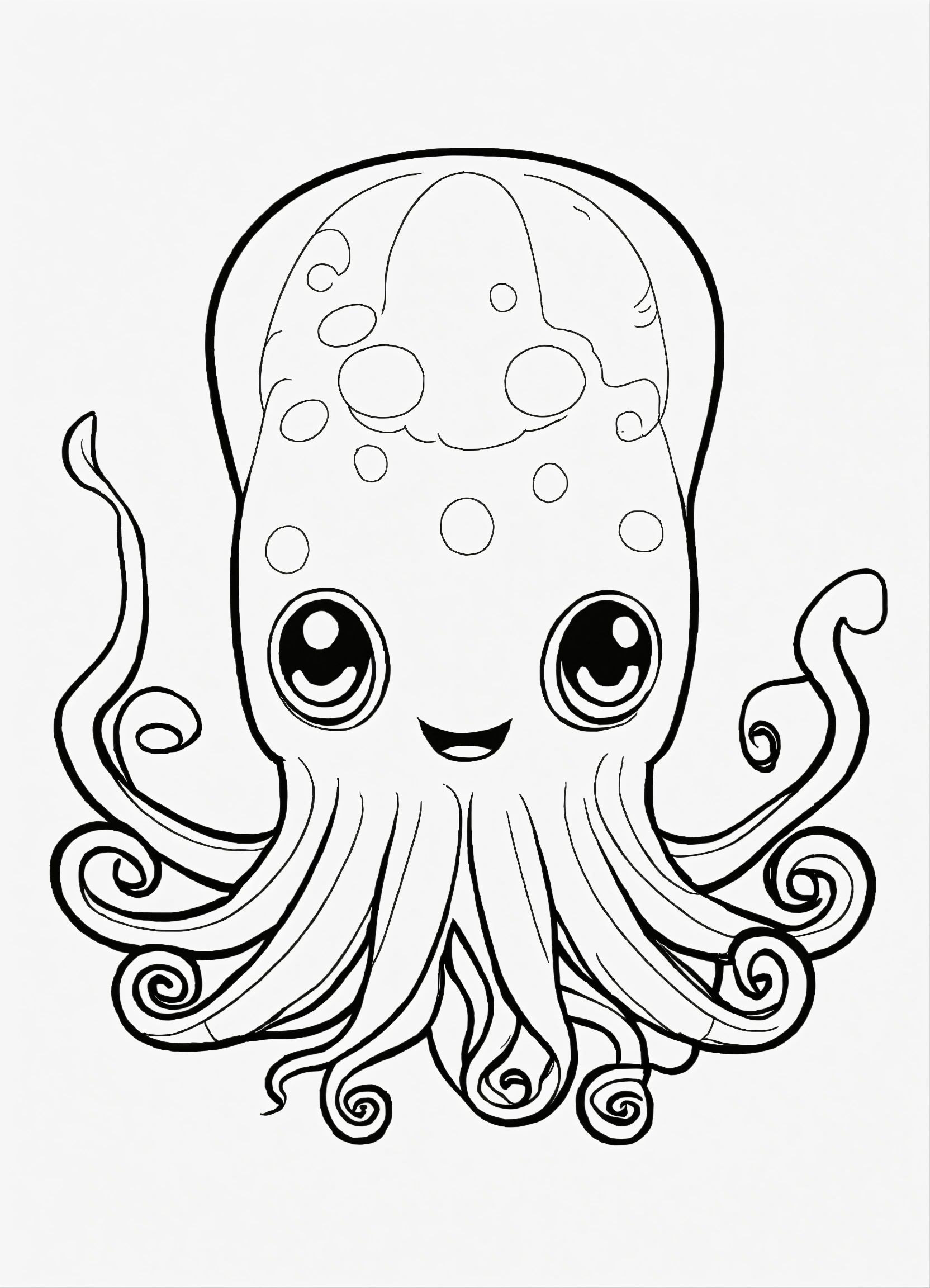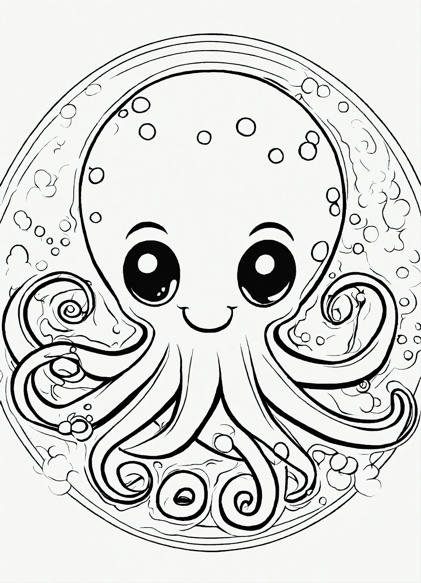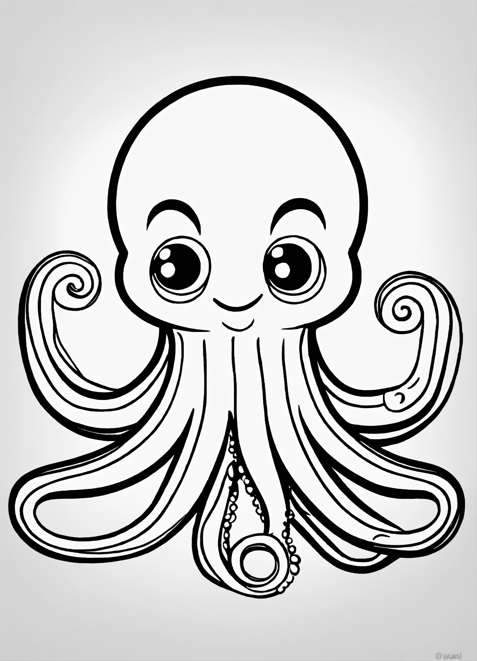 Coloring book for preschoolers, simple lines drawings, no lines inside of the drawing, baby octopus, cartoon, full body, outline of the drawing in bold line, symmetrical, white background., no background image.