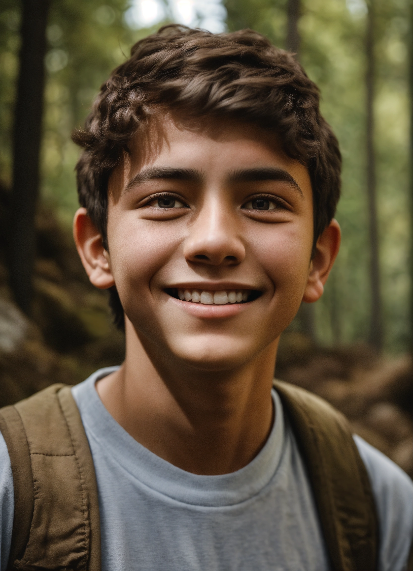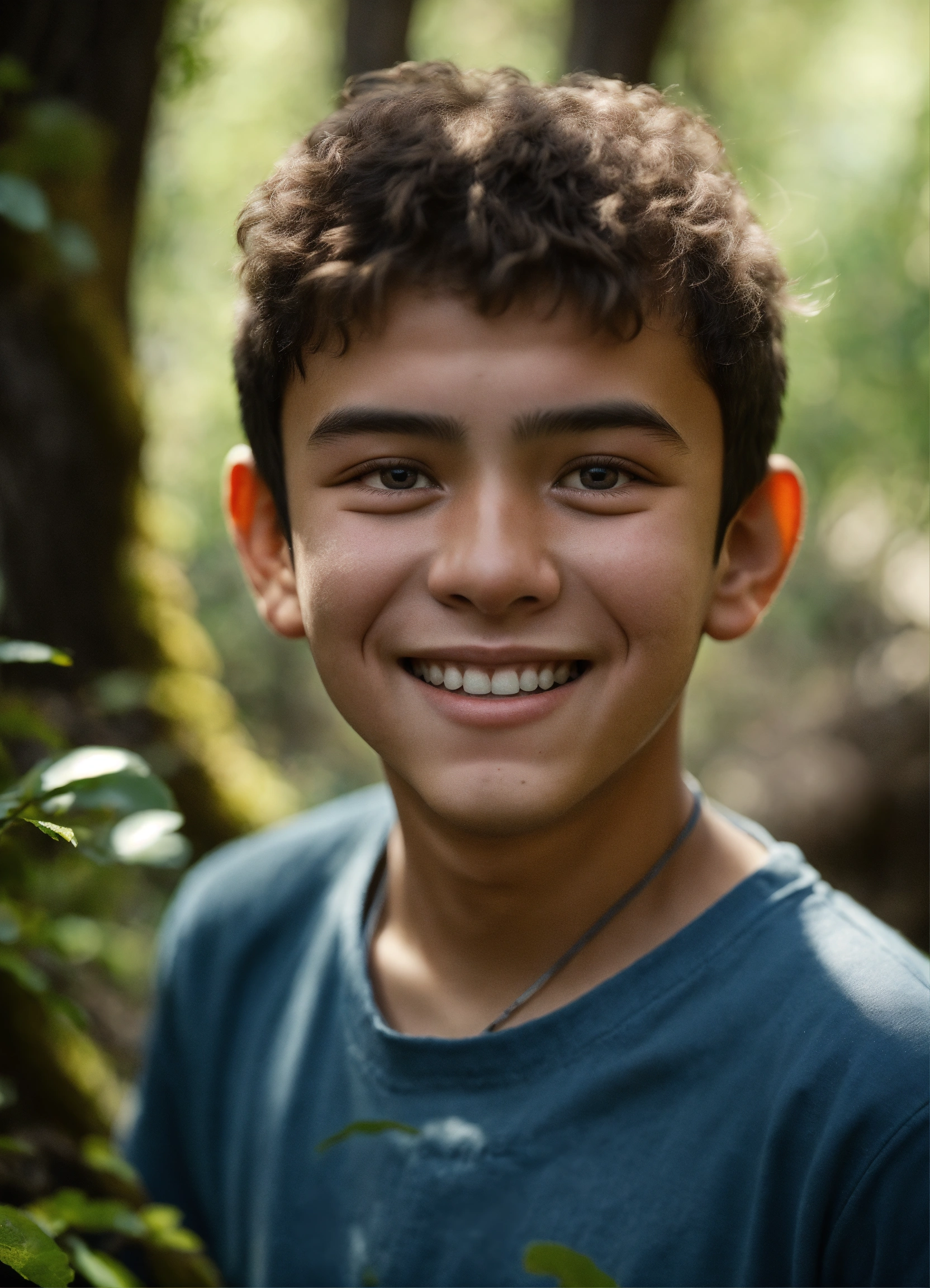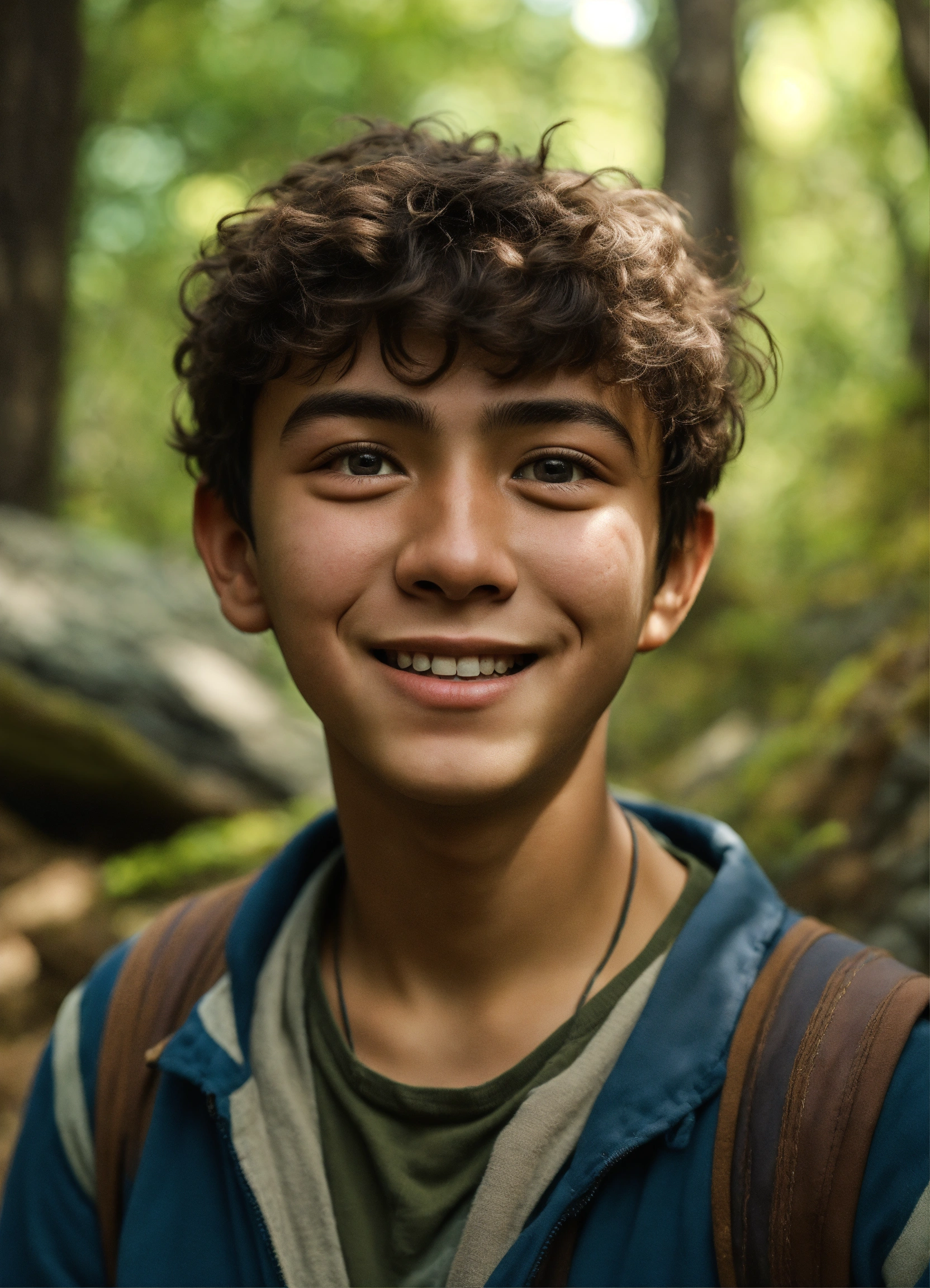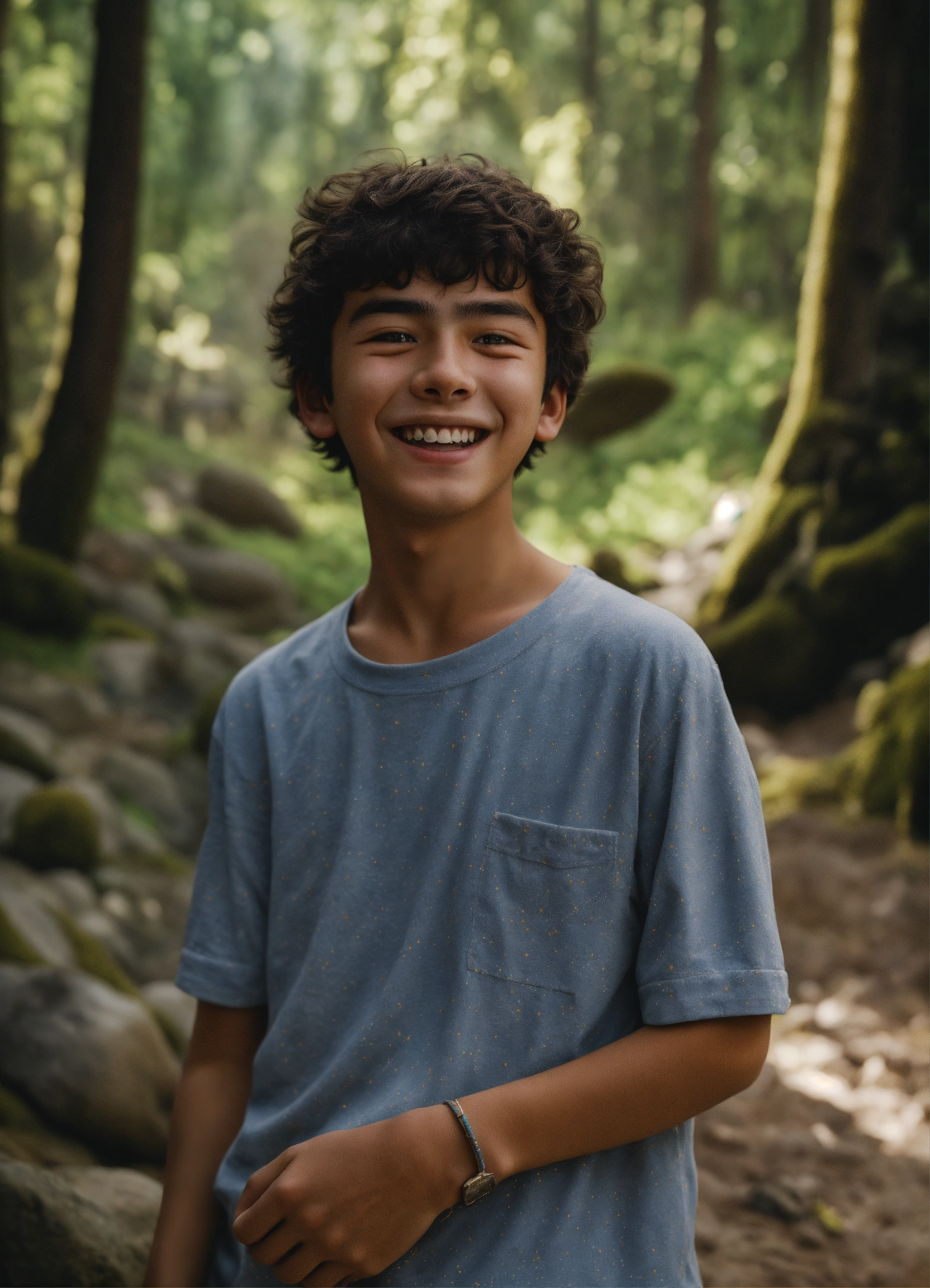 An ultrarealsitic photo of a turkish 16-year-old boy, with very little eyes, round cheeks, happy expression, in a rocky forest, hyperrealistic, hyperdetailed, 4k
