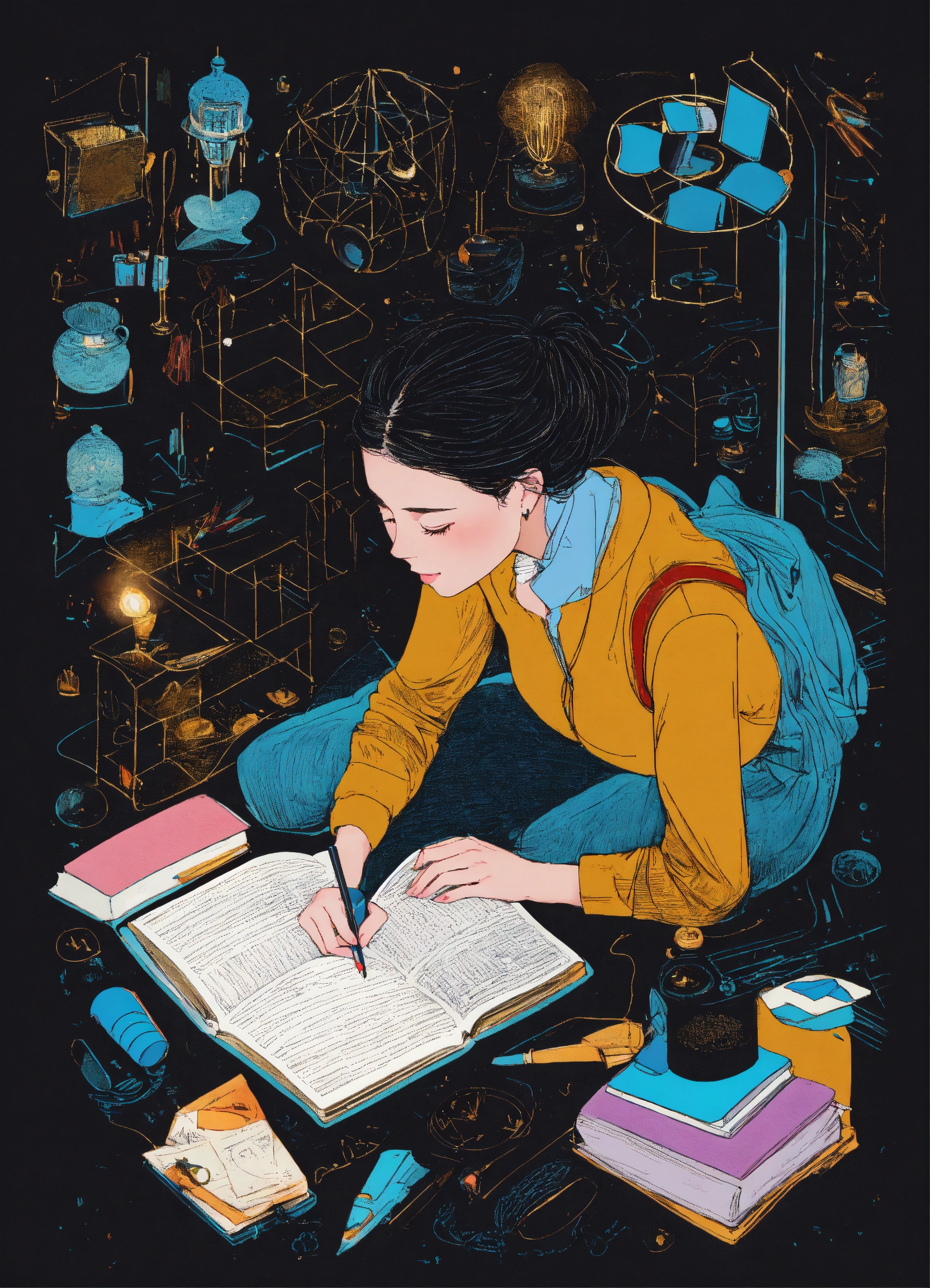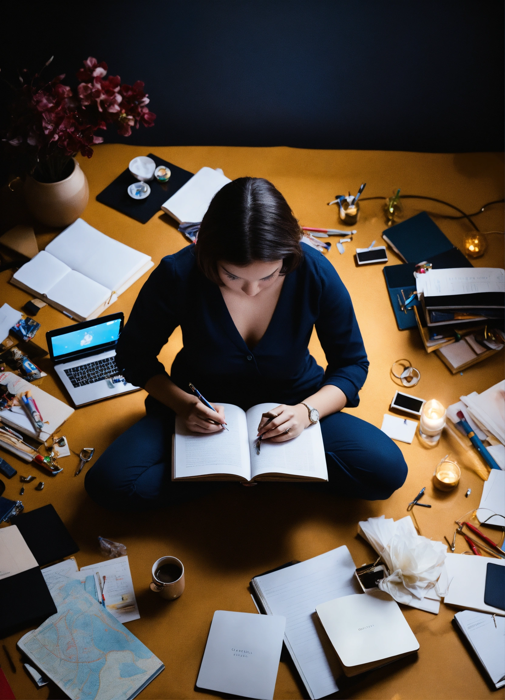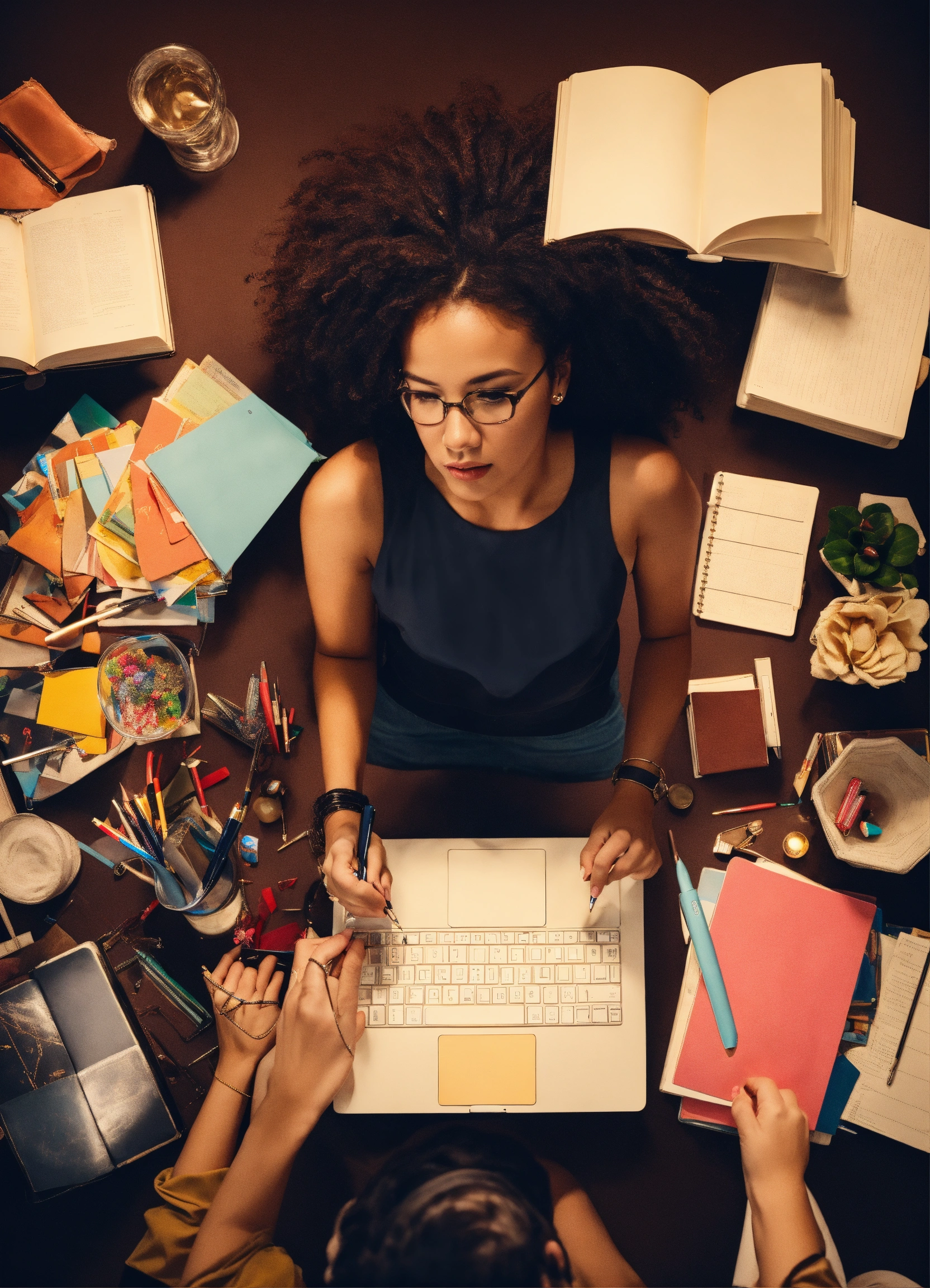 A woman who creates herself studying others from an overhead view on a black background