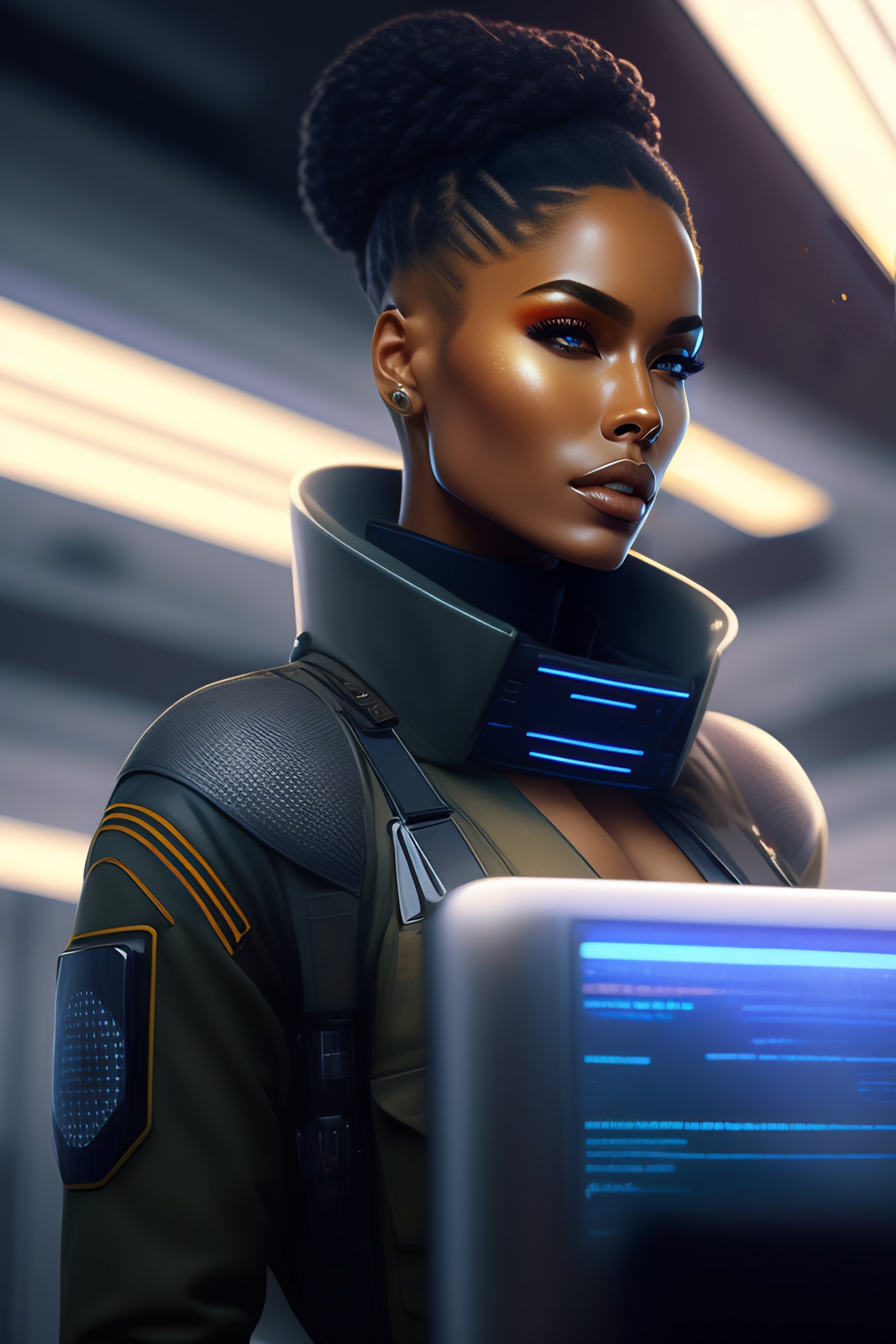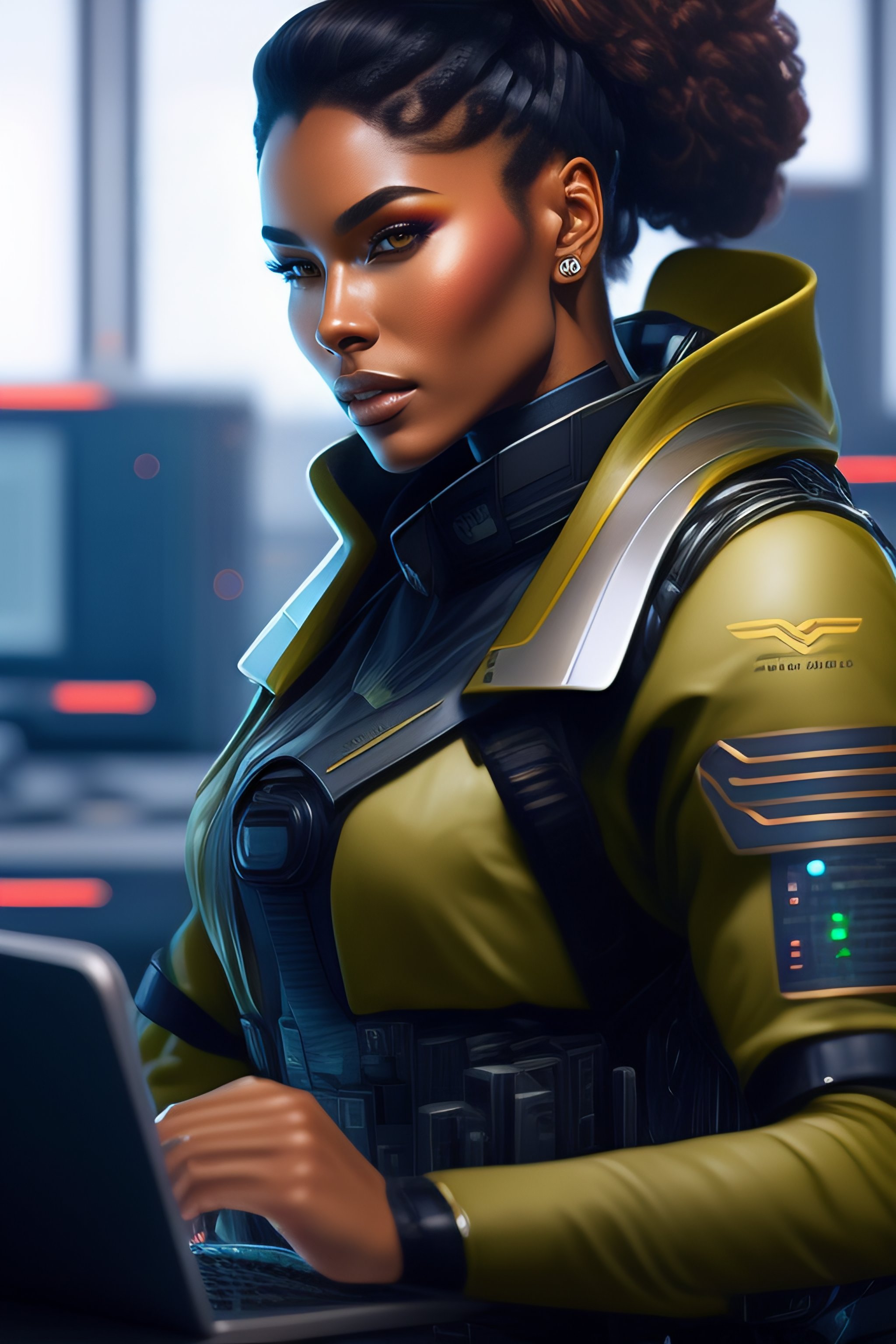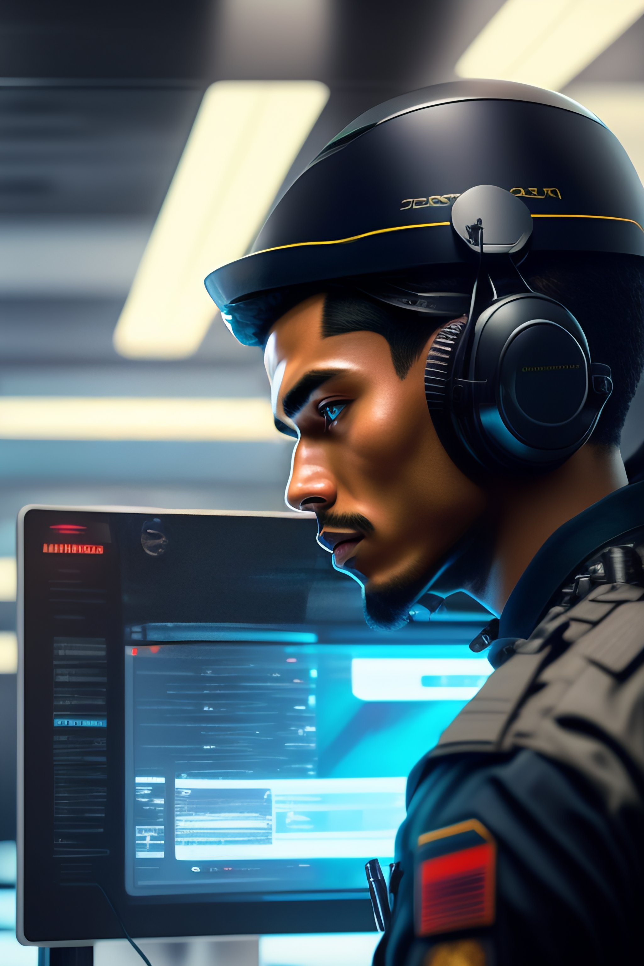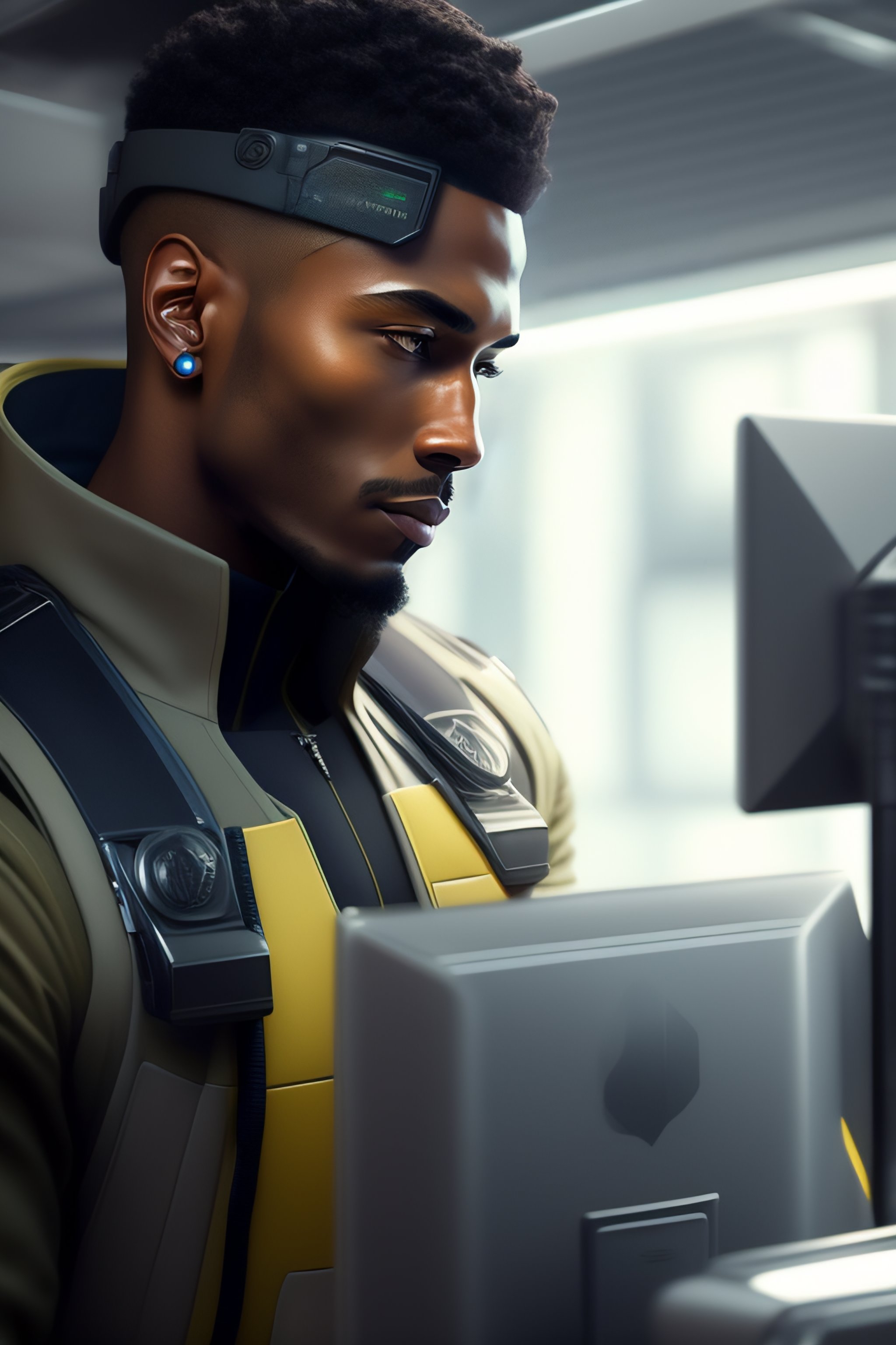 Futuristic soldier hacking a computer in a high-tech laboratory, front view, intense expression, intricate, highly detailed, digital painting, artstation, smooth, sharp focus, illustration, art by artgerm and greg rutkowski and alphonse mucha