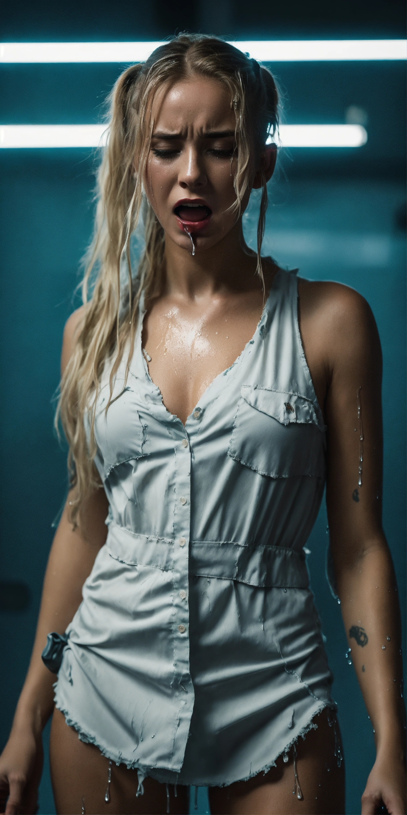 Full body, standing, gag, swimwear, shiny, wet messy long hair, prepubescent, fully unbuttoned opened tattered torn cropped dress shirt, long tube socks, crying, screaming, crying, distressed, three gorgeous young, ponytail blonde hair, white woman, pale skin, fitness influencer, highly detailed, dramatic shoot, sharp focus, 4k uhd, cinematic lighting, relaxed, prison