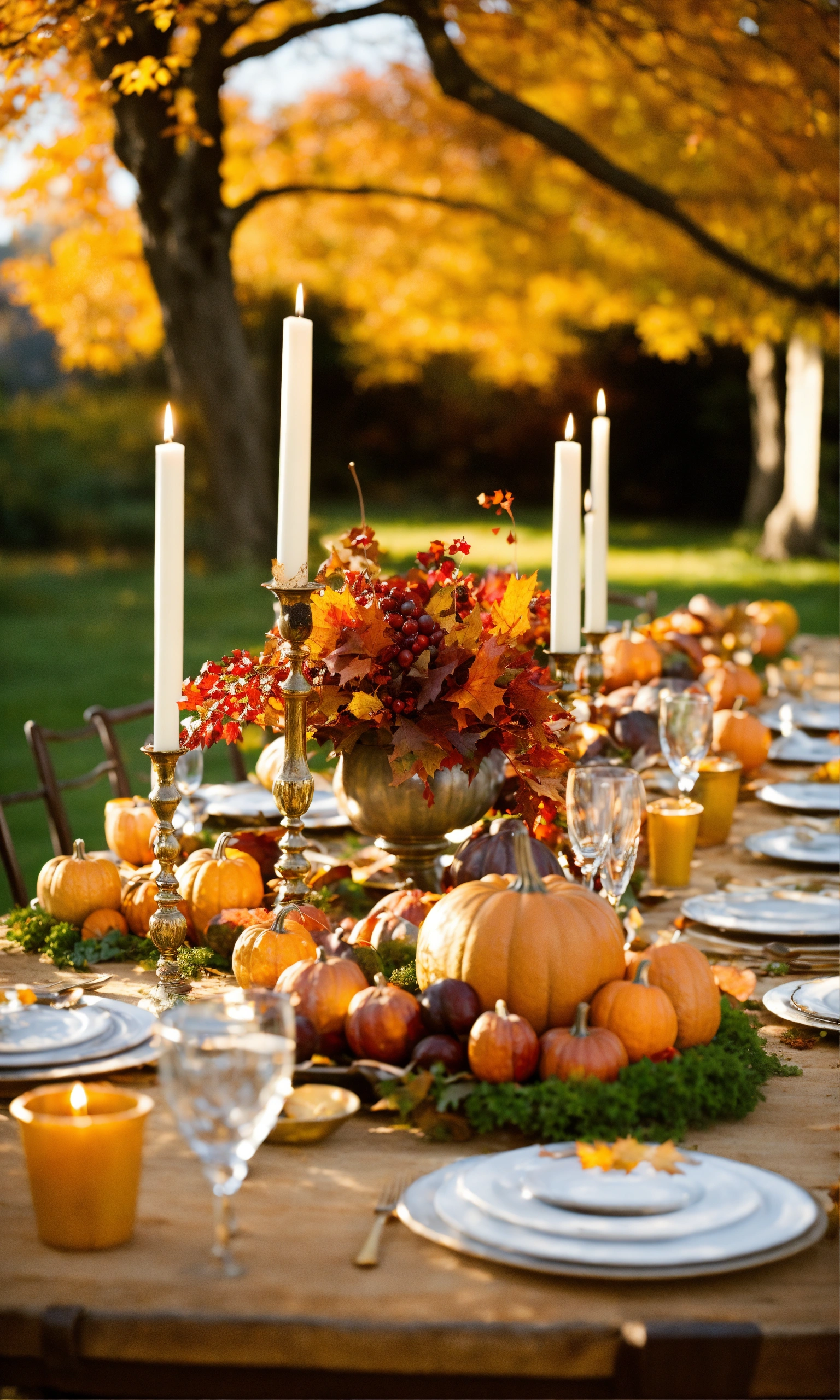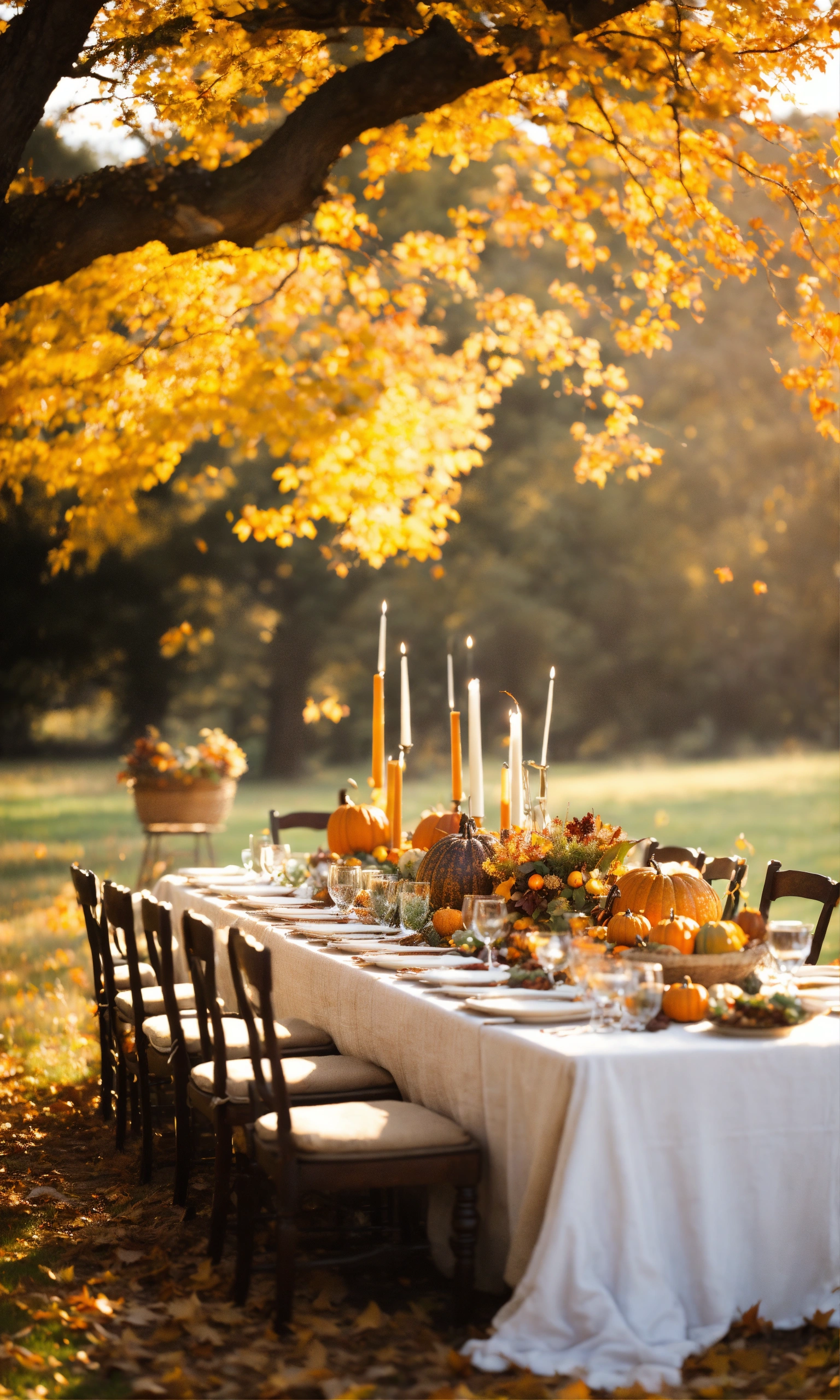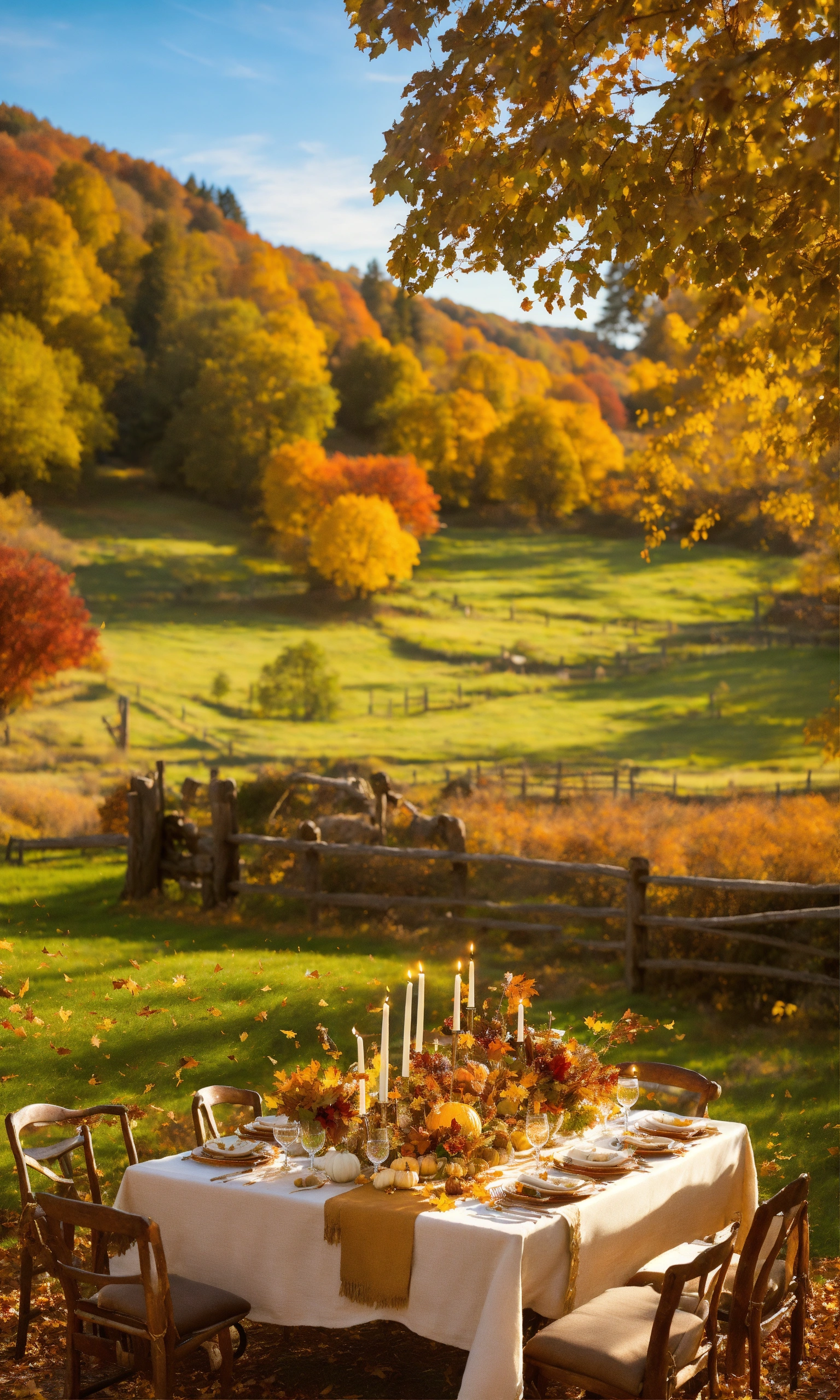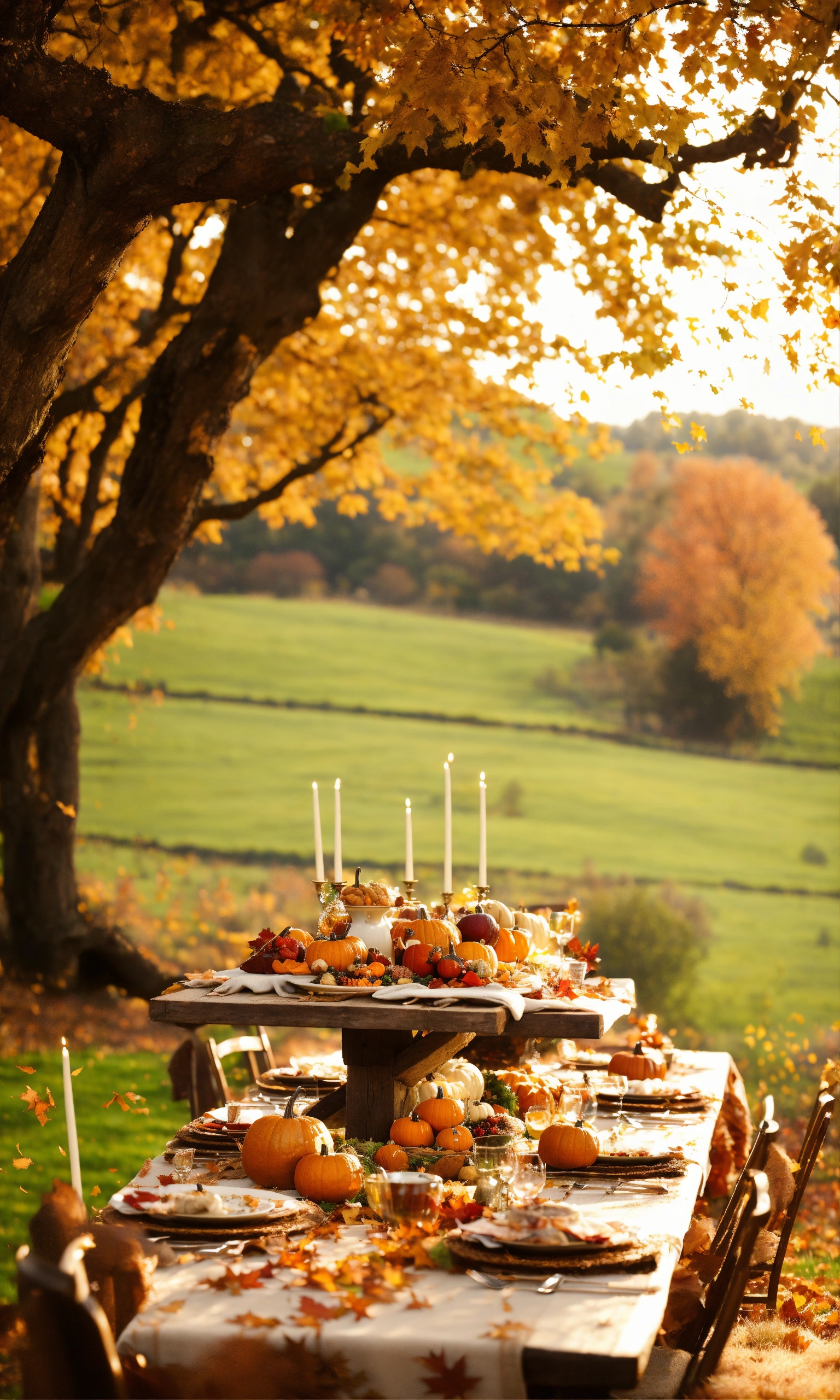 "as the golden hues of autumn adorn the landscape and the air is filled with the earthy scent of fallen leaves, envision a picturesque thanksgiving feast set in a charming countryside. the scene unfolds in a sun-drenched meadow, where a long, rustic table is adorned with the most sumptuous and beautifully arranged feast imaginable.