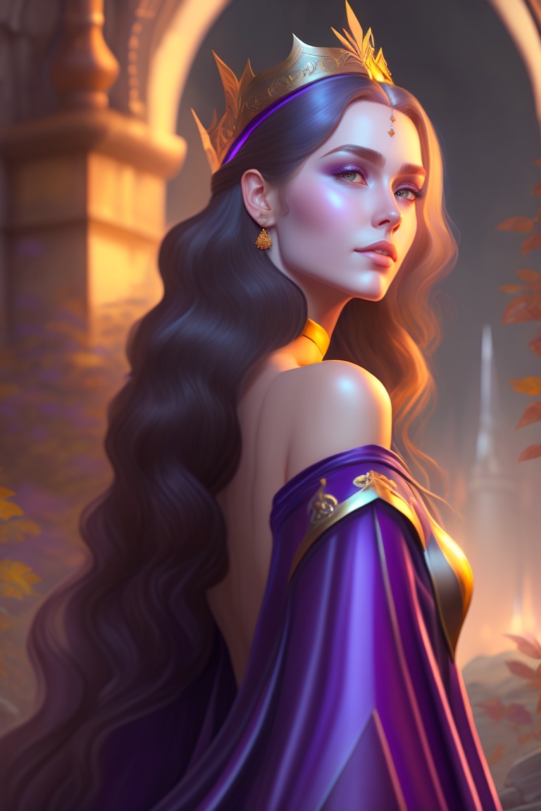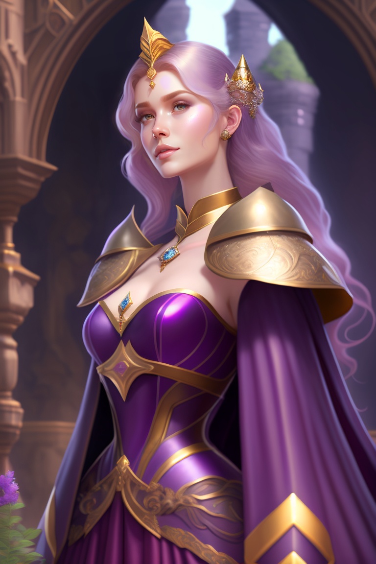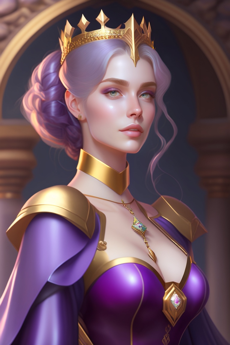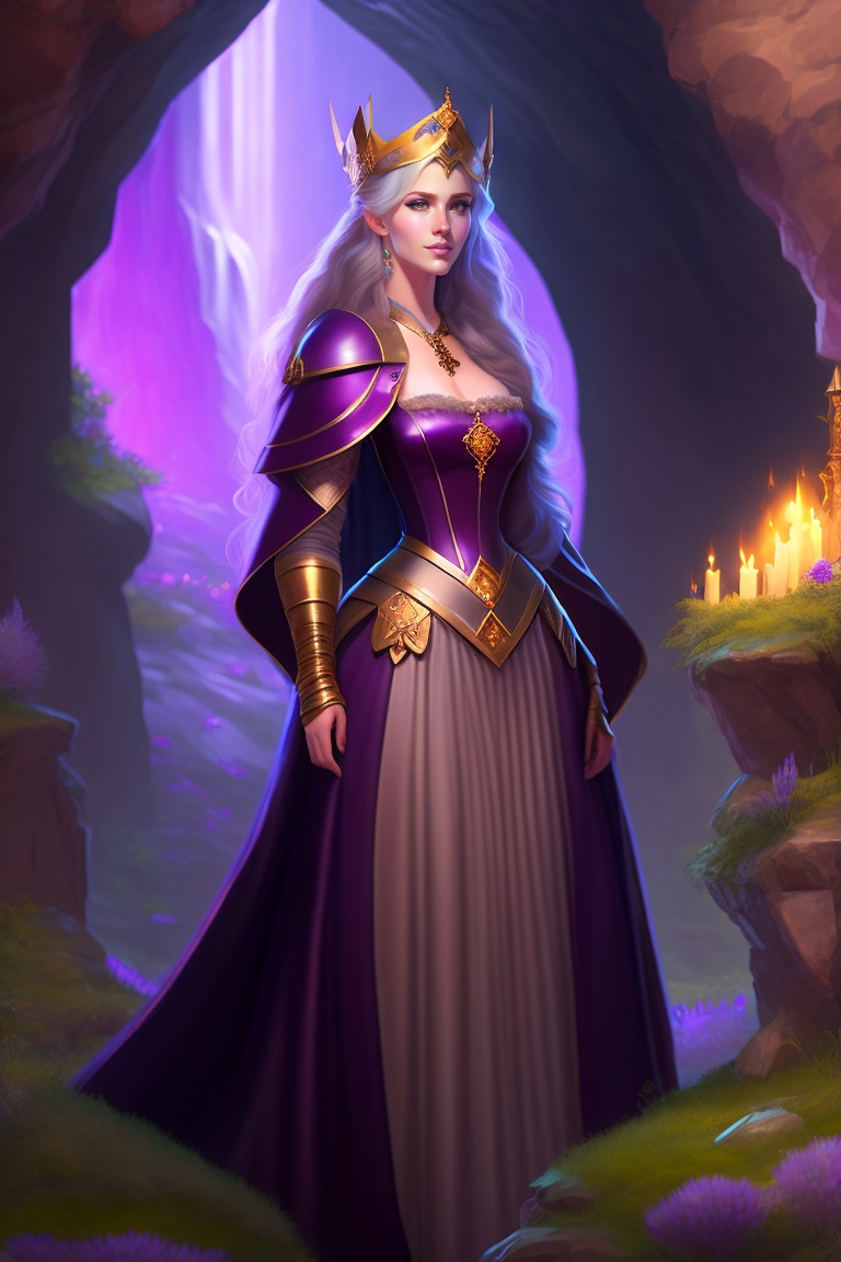 Beautiful princess, northern europe, medieval purple and gold dress, pale skin, dark caverns in the background, highly detailed, artstation, concept art, smooth, unreal engine 5, 8k, artgerm and art by greg rutkowski and alphonse mucha