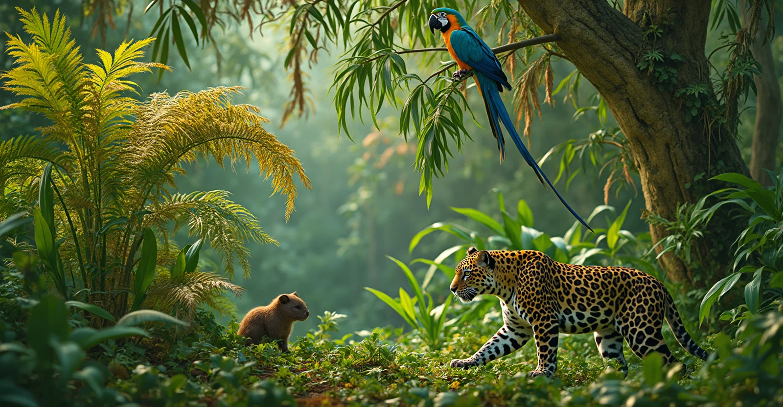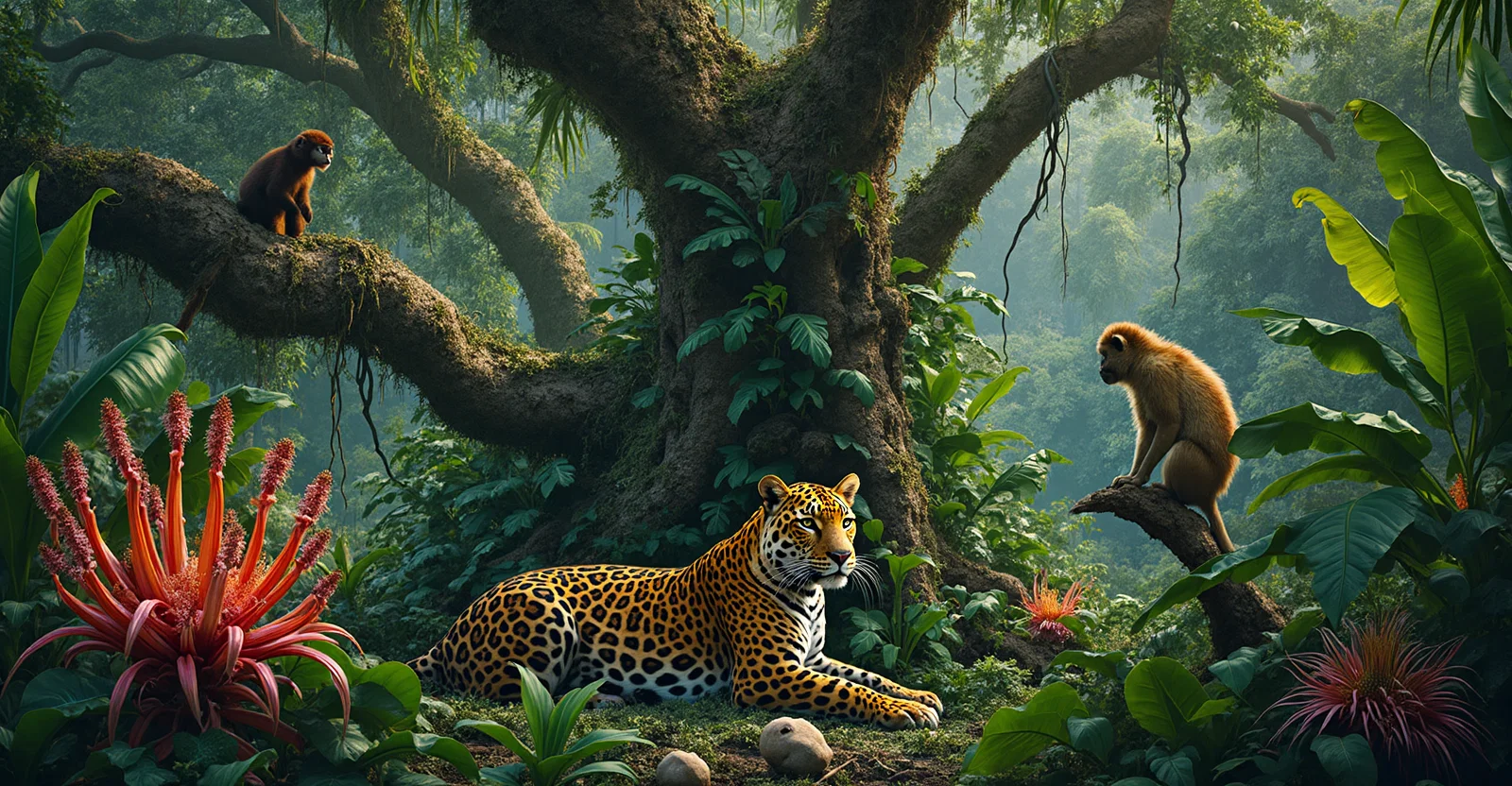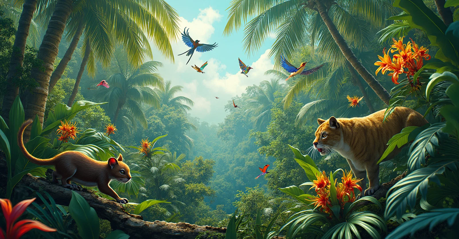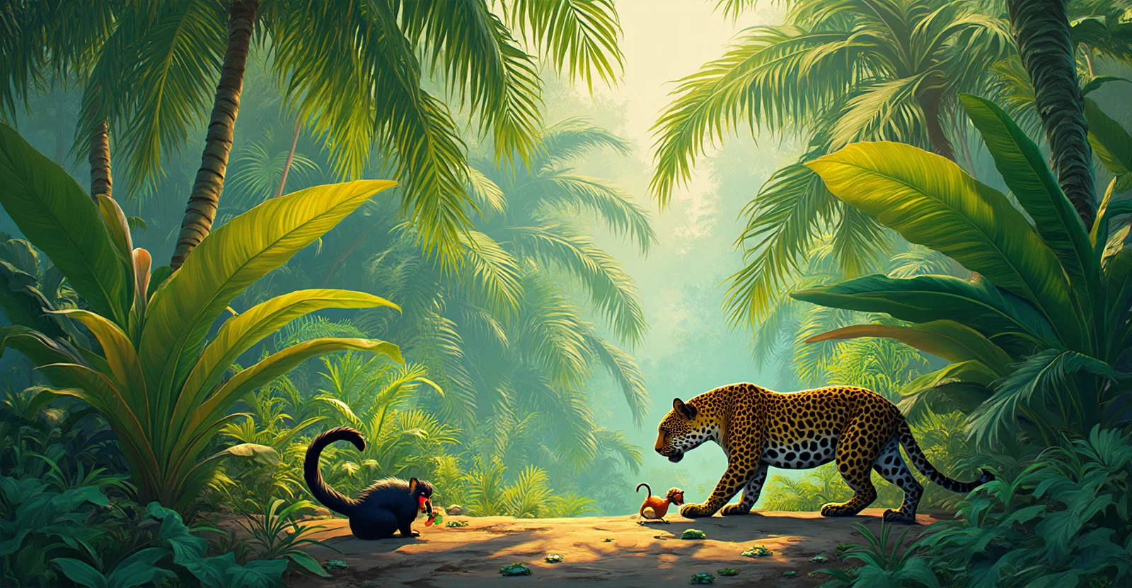 Create an image of a vibrant ecosystem. several plants of the same species compete for sunlight and water. a jaguar hunts prey, a plant provides shade for a small animal, and a bird is eating an insect in a tree. use bright colors and details that highlight the diversity of life in the ecosystem. it should look like a snapshot of a dynamic ecosystem. photographic style. natural colors.