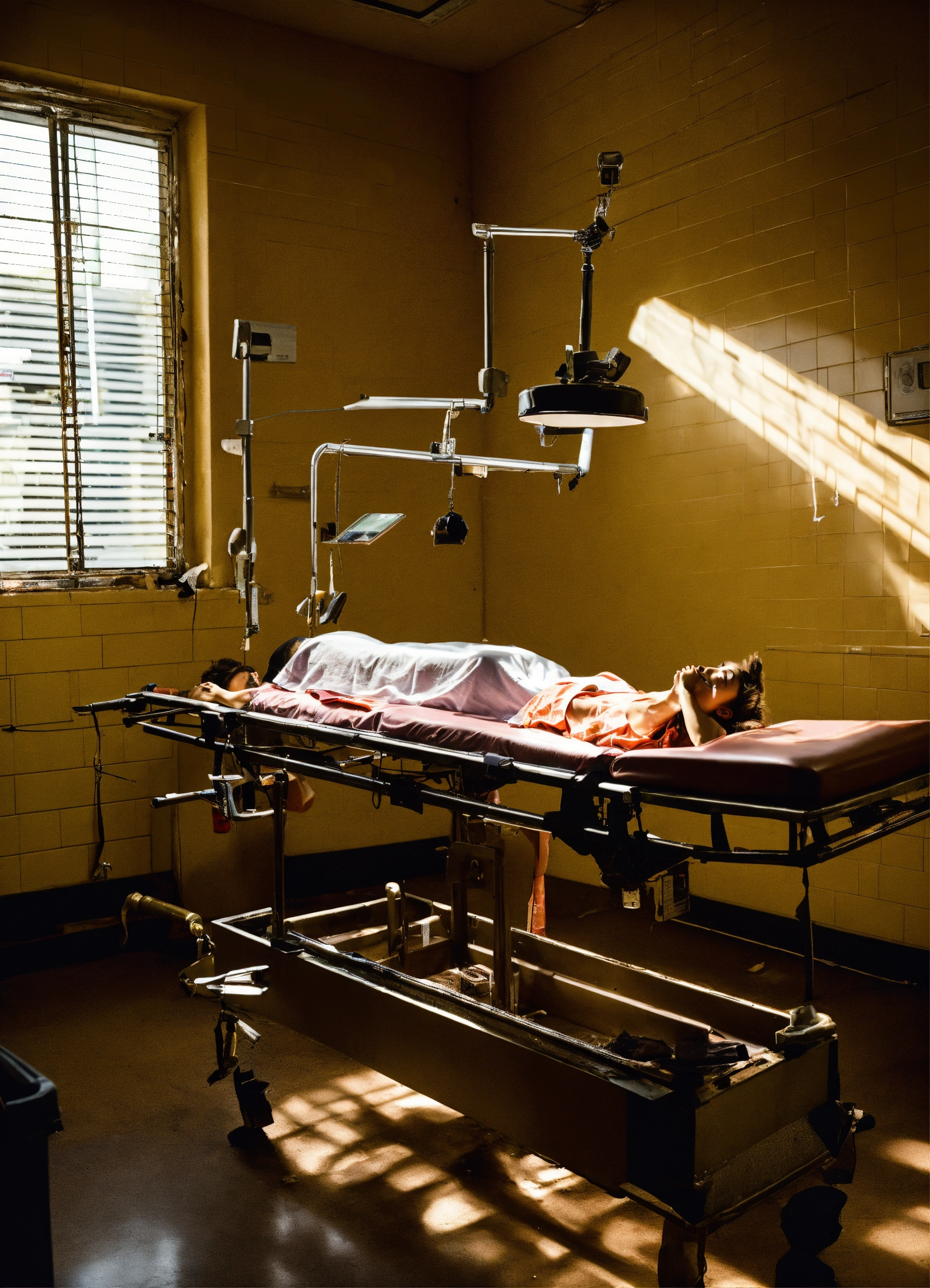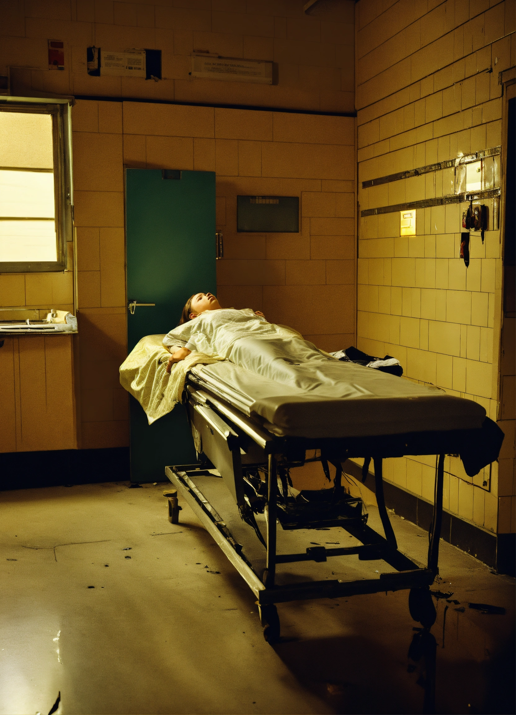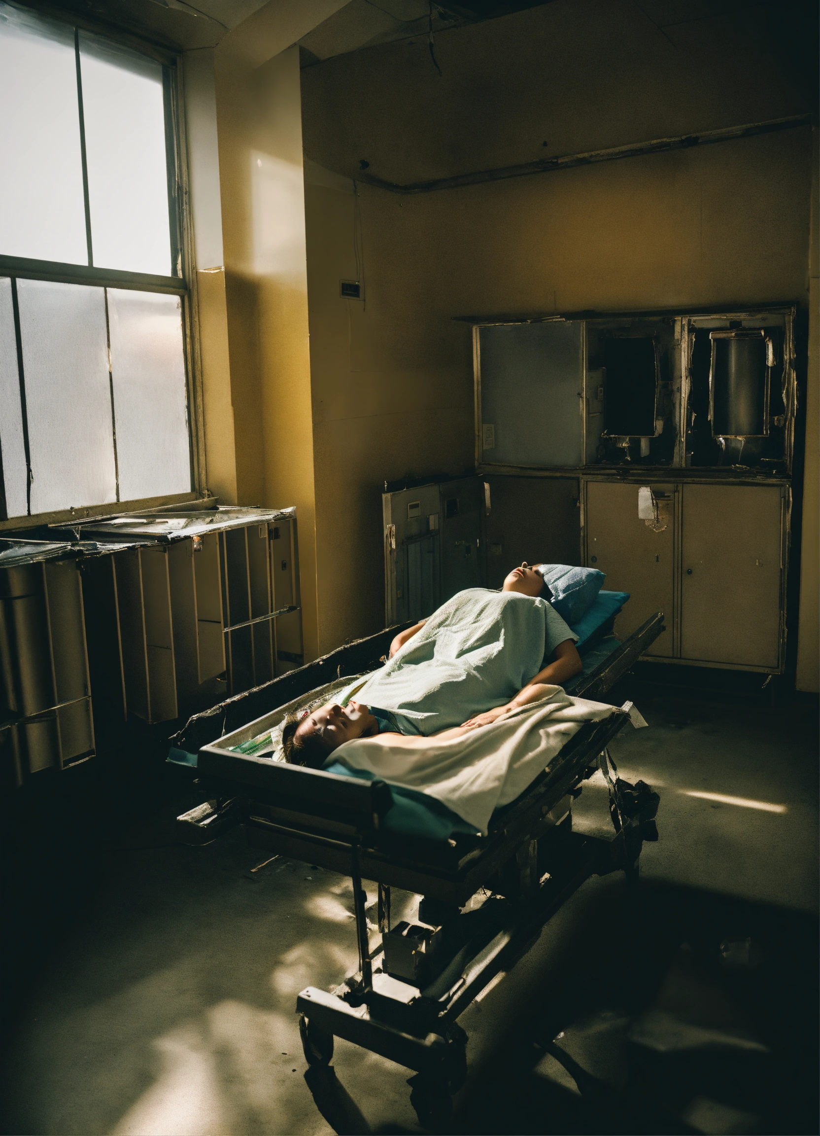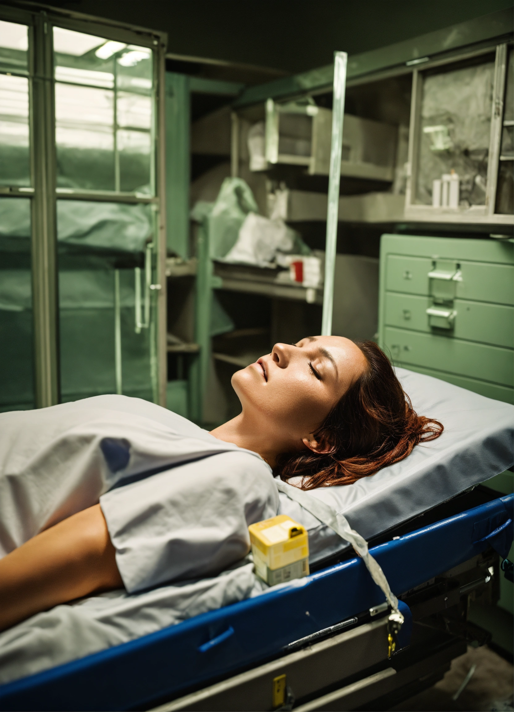 A woman in the morgue after a car accident, receiving pain management treatment and filing insurance claims.