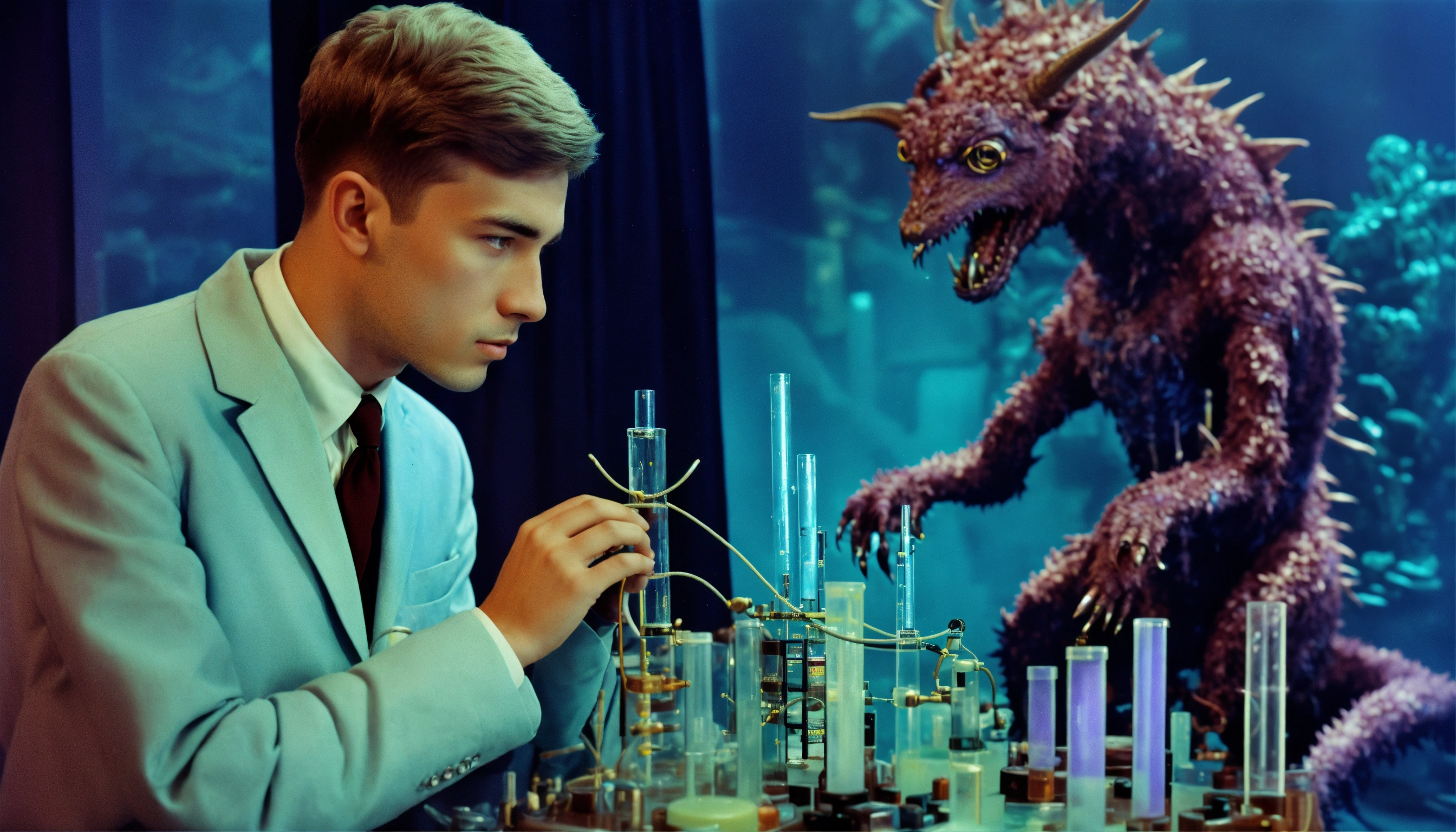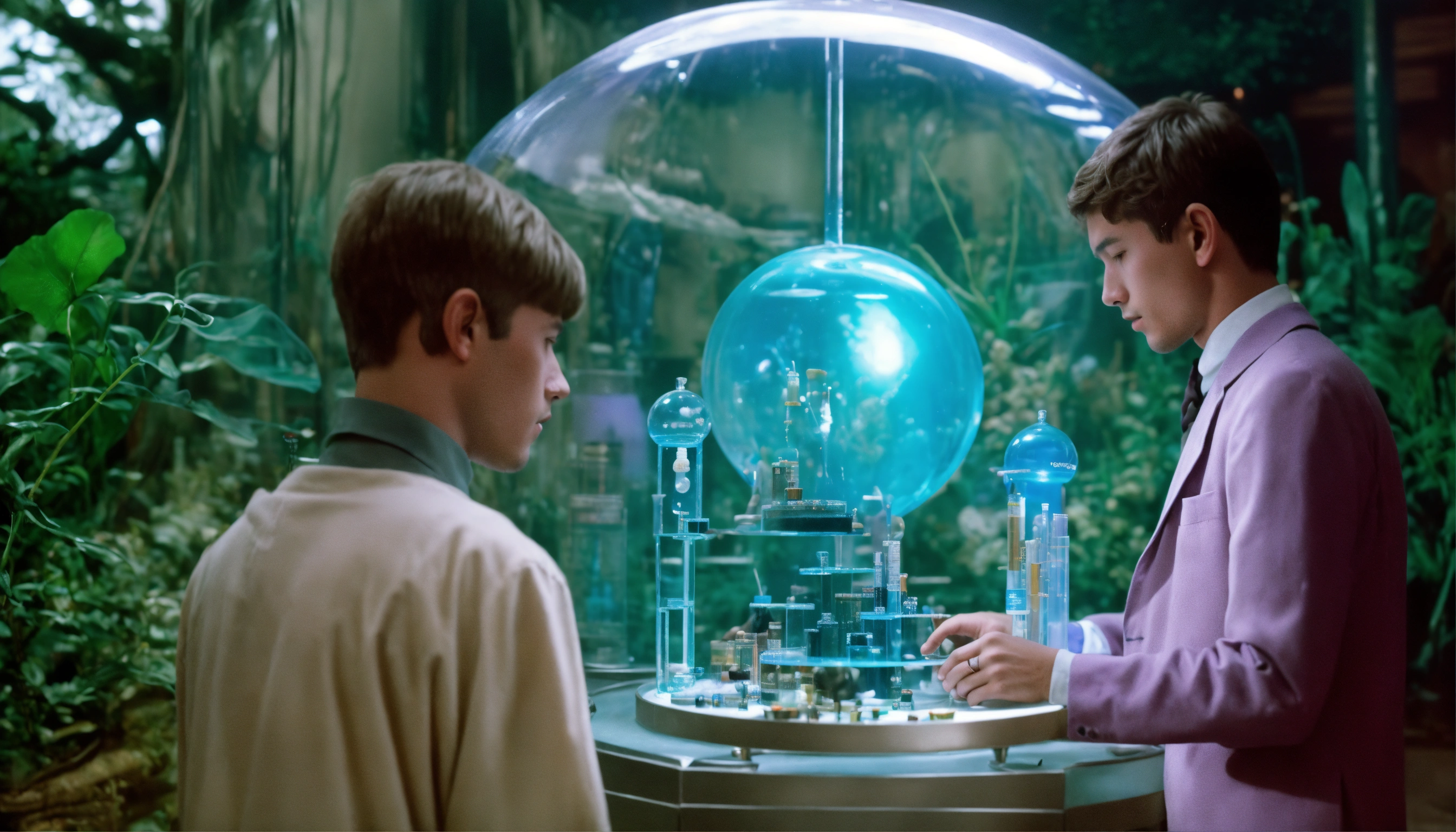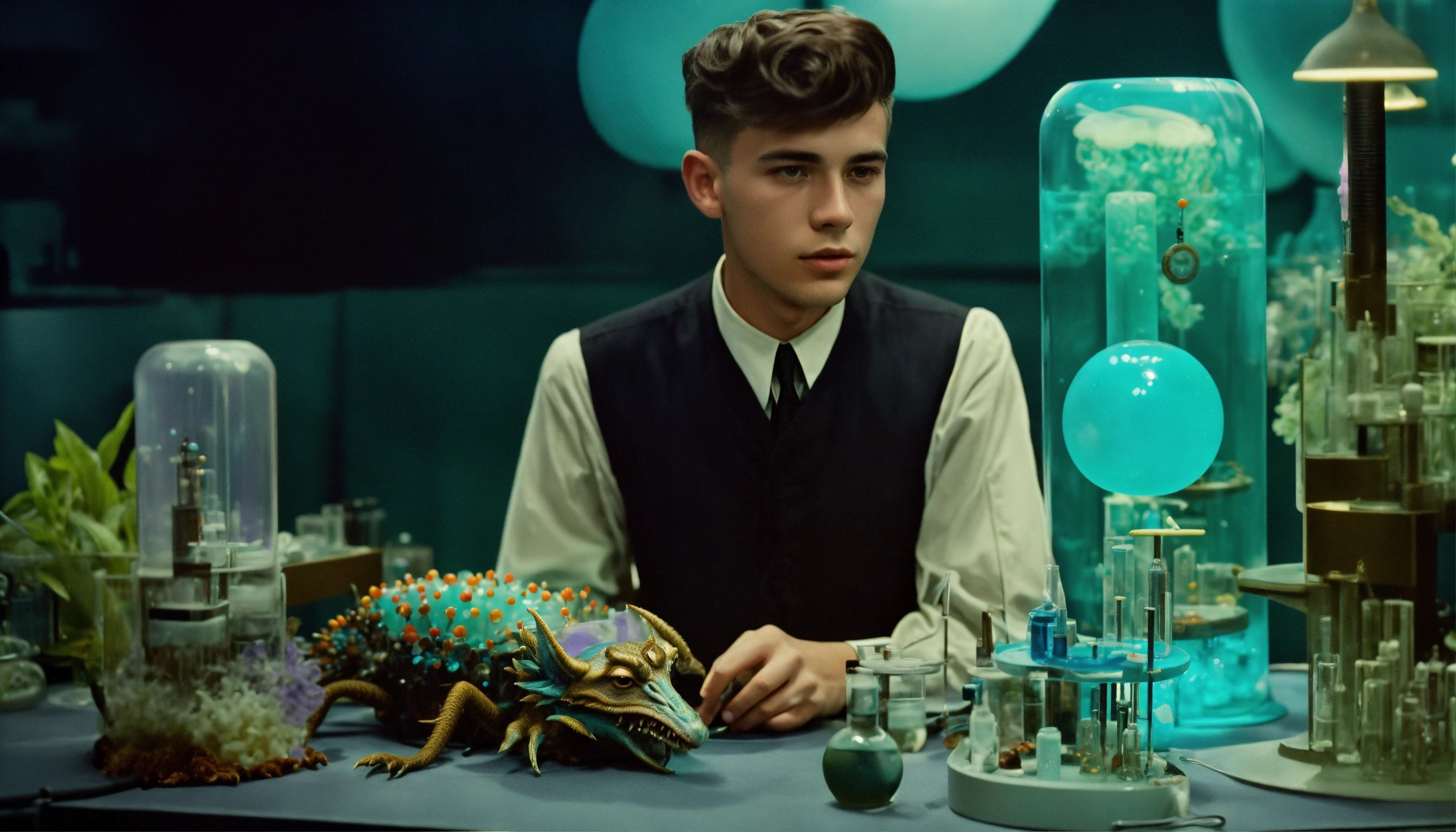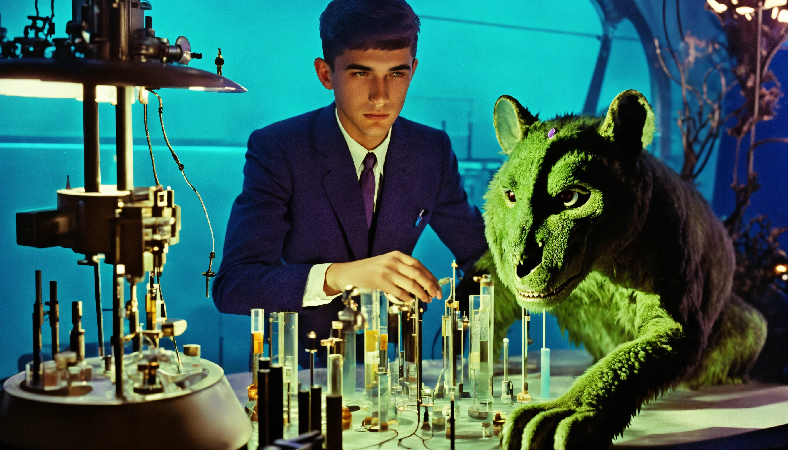 1964, old photography, kodak film colour, surreal sci fi, old film, unknown handsome 15 years old futuristic fortune teller boy with a big unknown fantasy beast monster, futuristic glass lab with myriad of research instruments, a myriad of futuristic test tubes, pale cyan blue and pale purple, regenerative plants and ai and big unknown magic beast