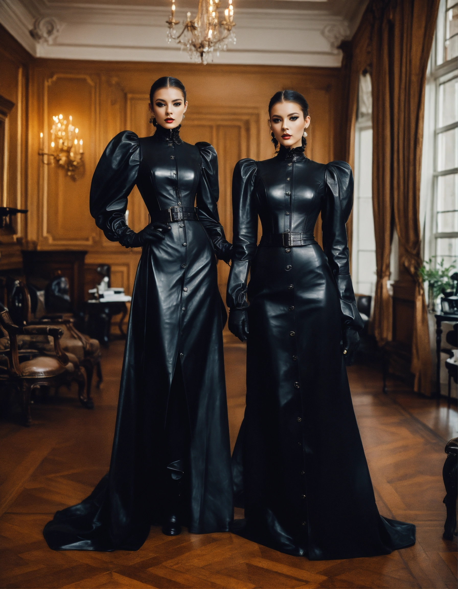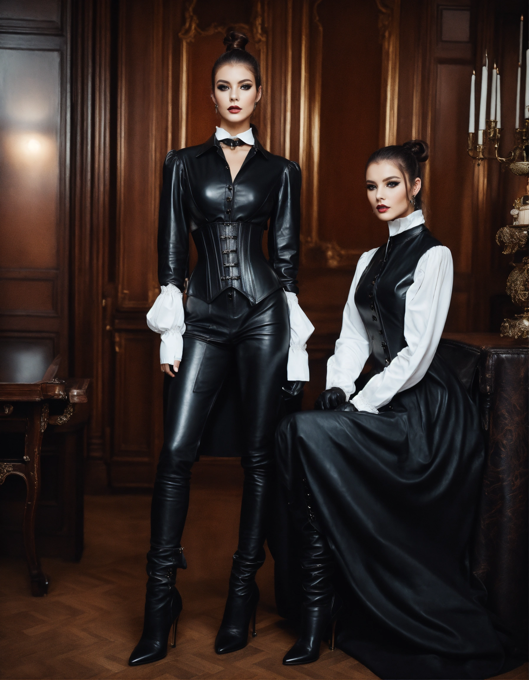 Two stunning french seductress women fashion model, brunette straight high ponytail, black leather corset, long strict victorian governess wide black long leather shirt dress with long big puff sleeves and big buttons, mansion room, white office shirt collar, leather gloves, eyeliner makeup, black leather boots