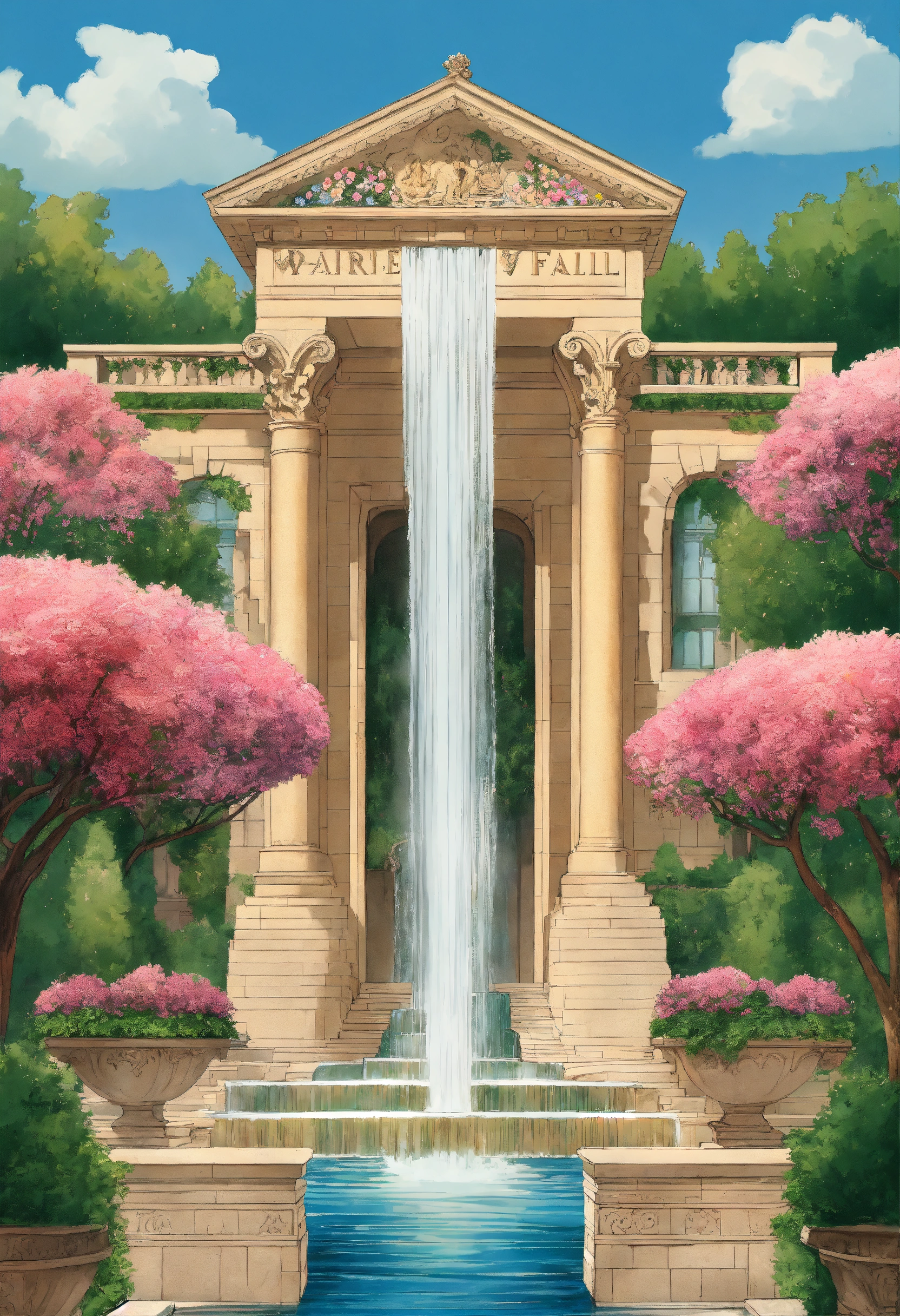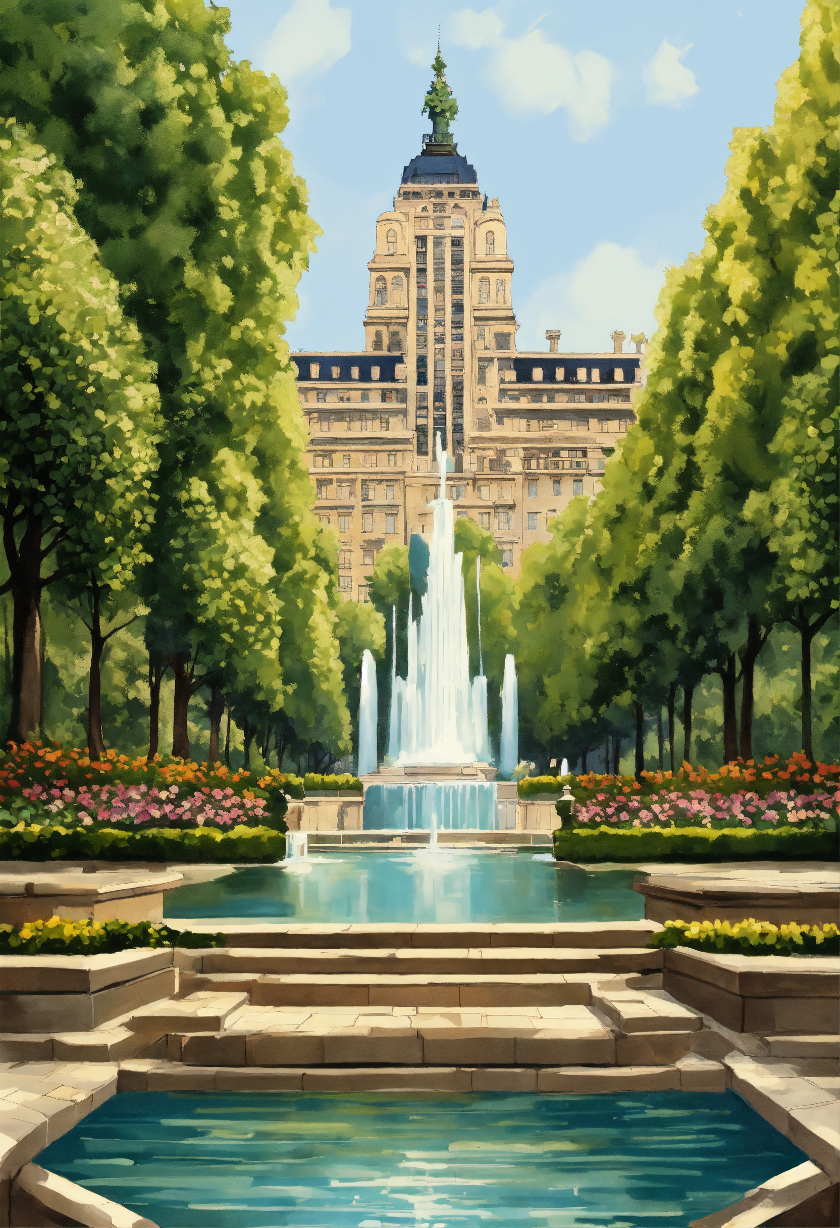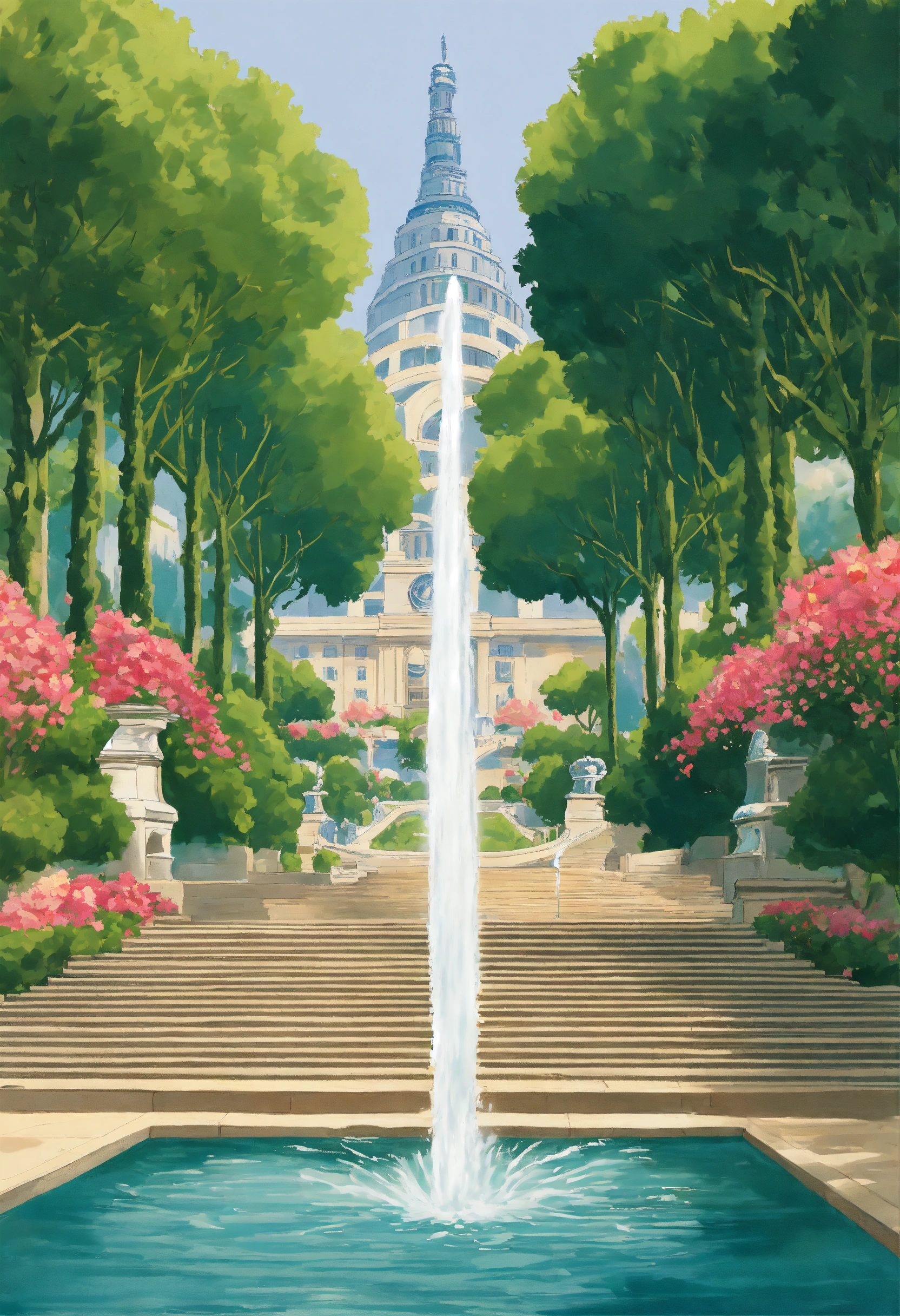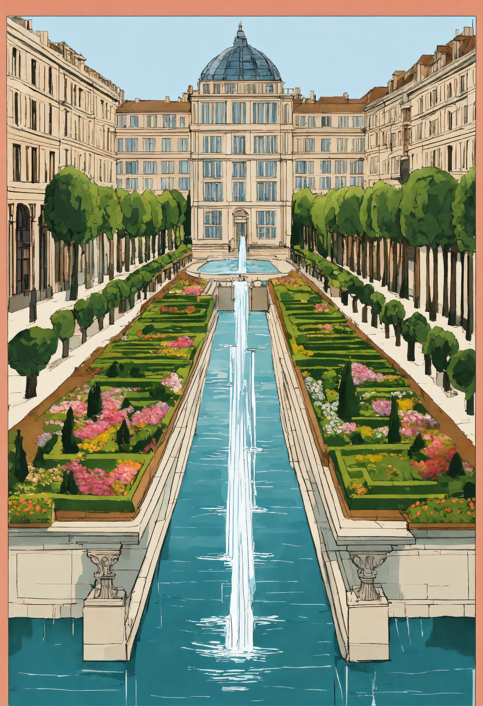 Water falls, the geneva water fountain jet d’eau, cypress trees tall, flowers, art deco pattern maze, pool canal, ornade sculpted stone masonry haussmannian parisian style empire state building with french roof tops, hérgé style illustration, symmetrical symmetry, spanish steps staircase, pillers, hanging gardens, bridges