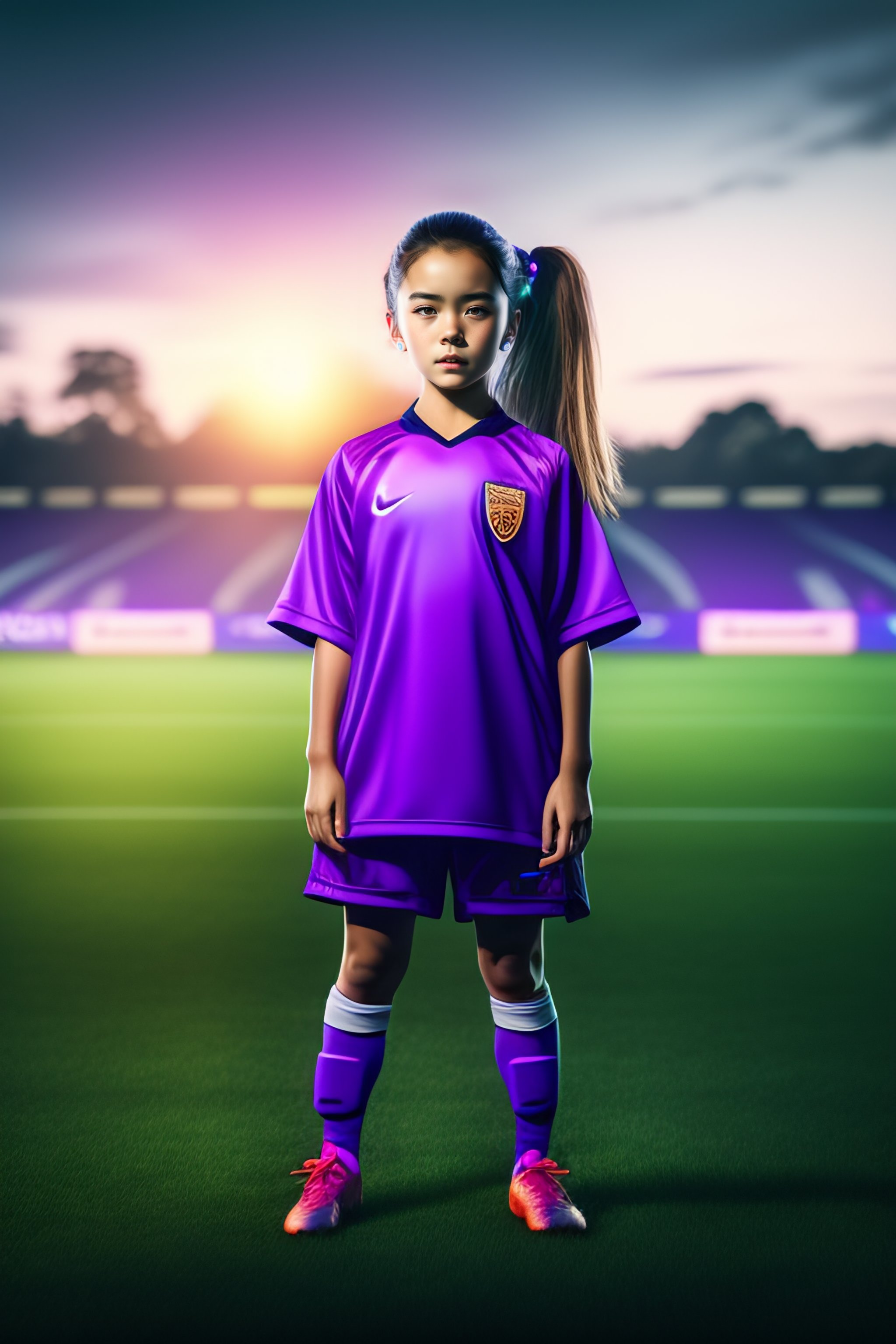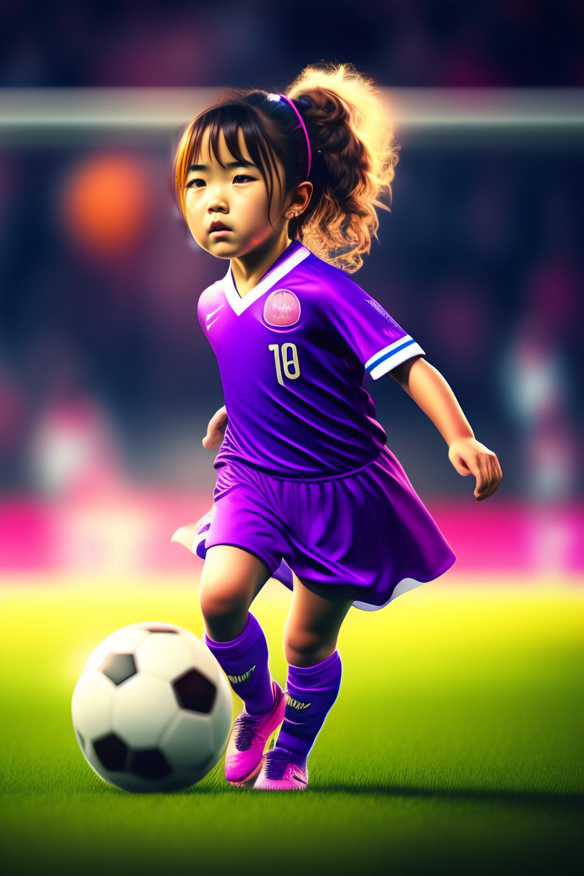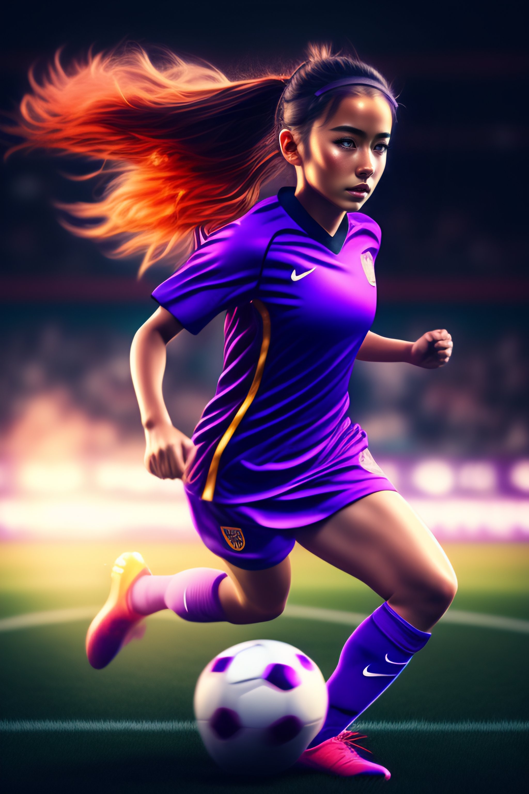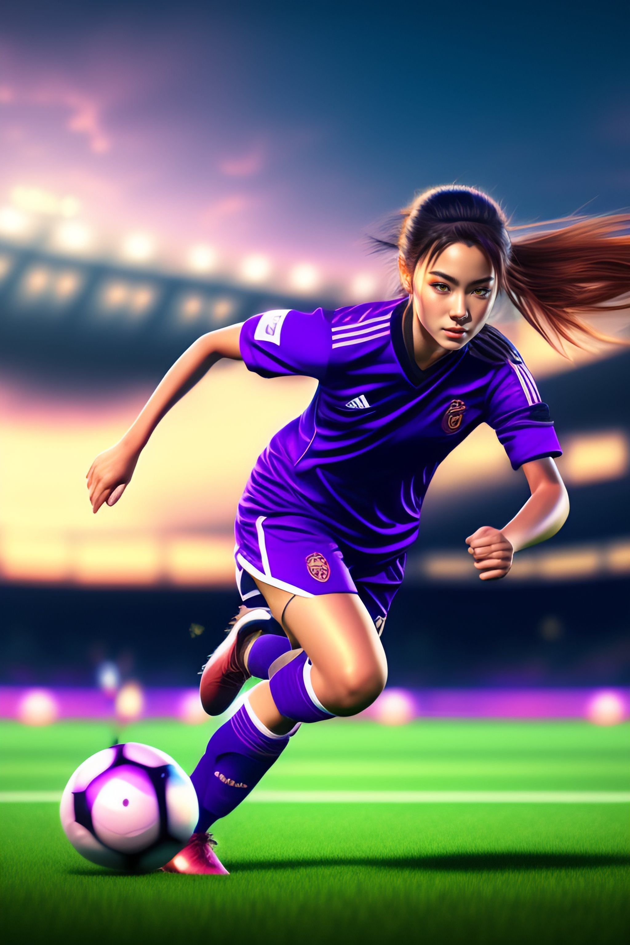 Anime girl with purple eyes playing soccer