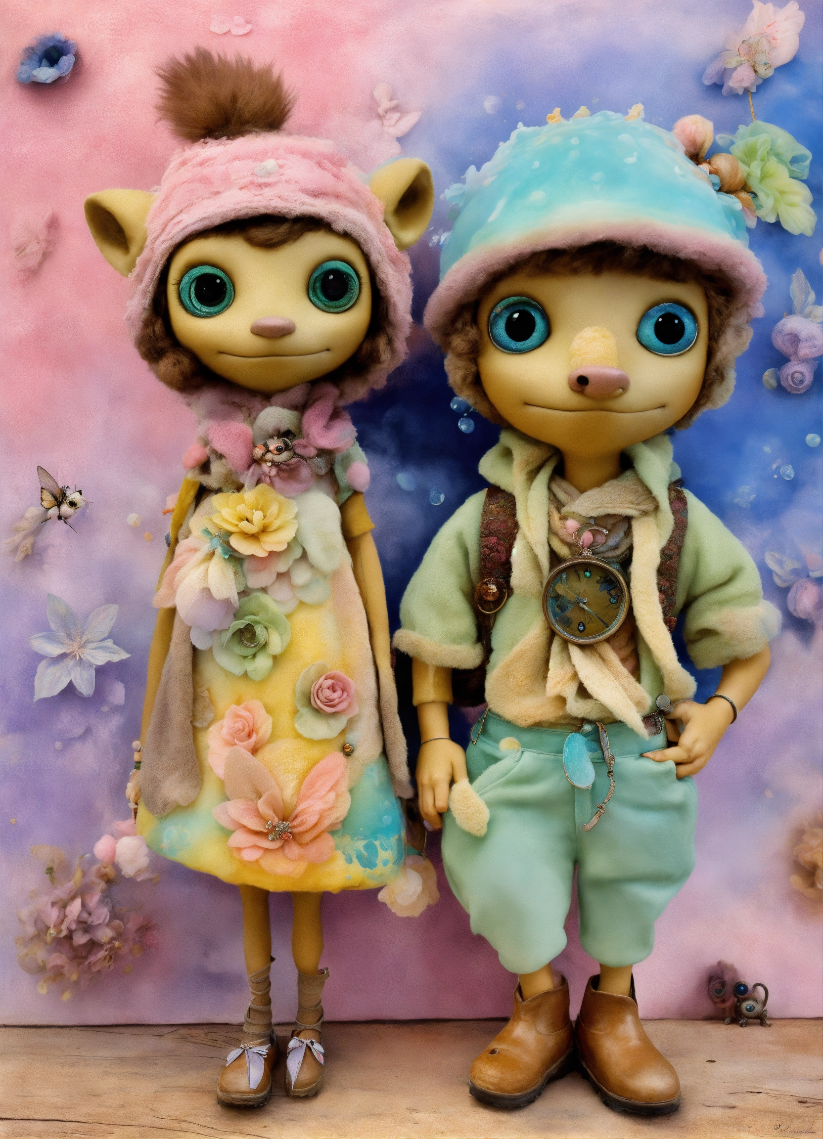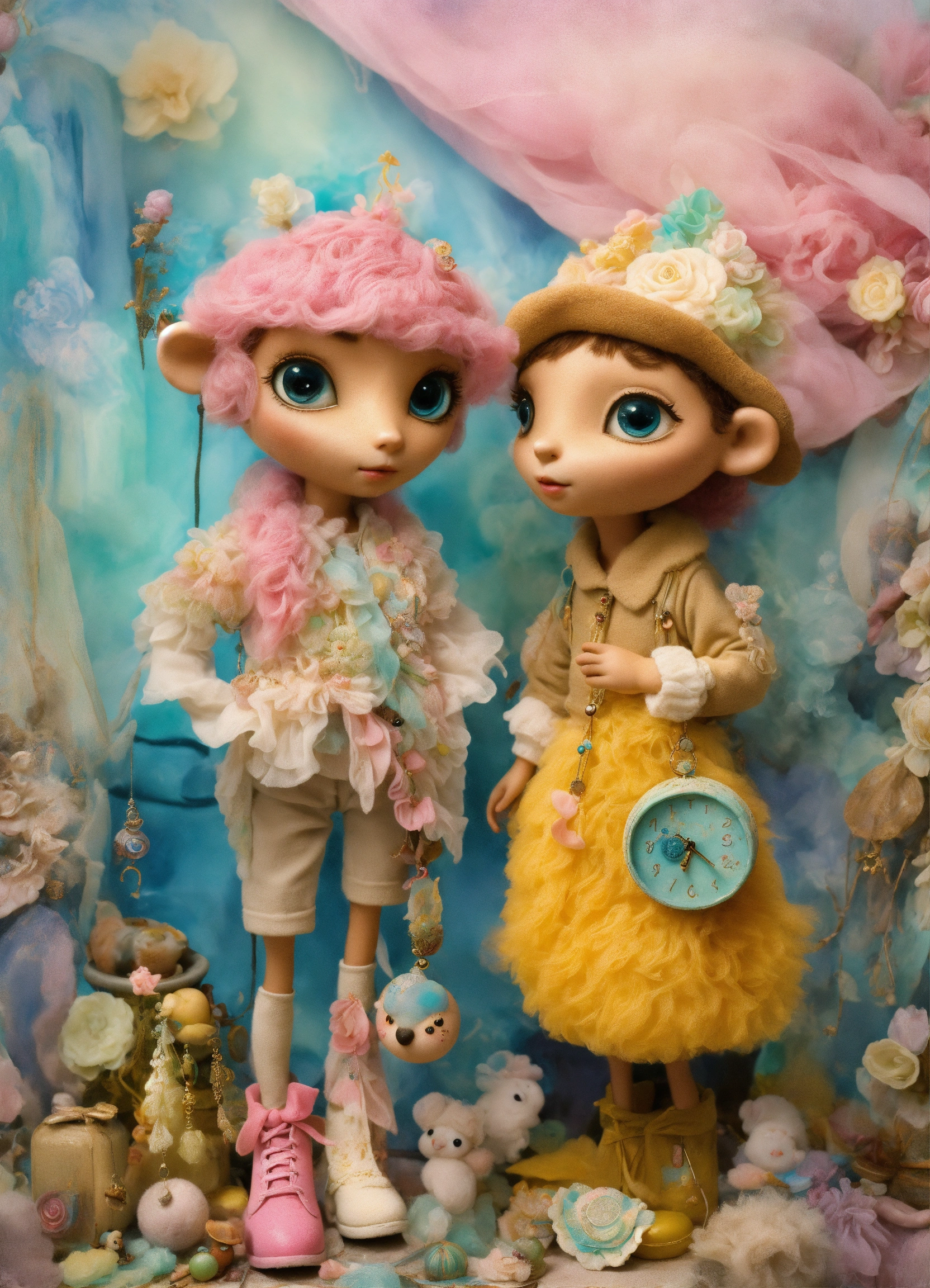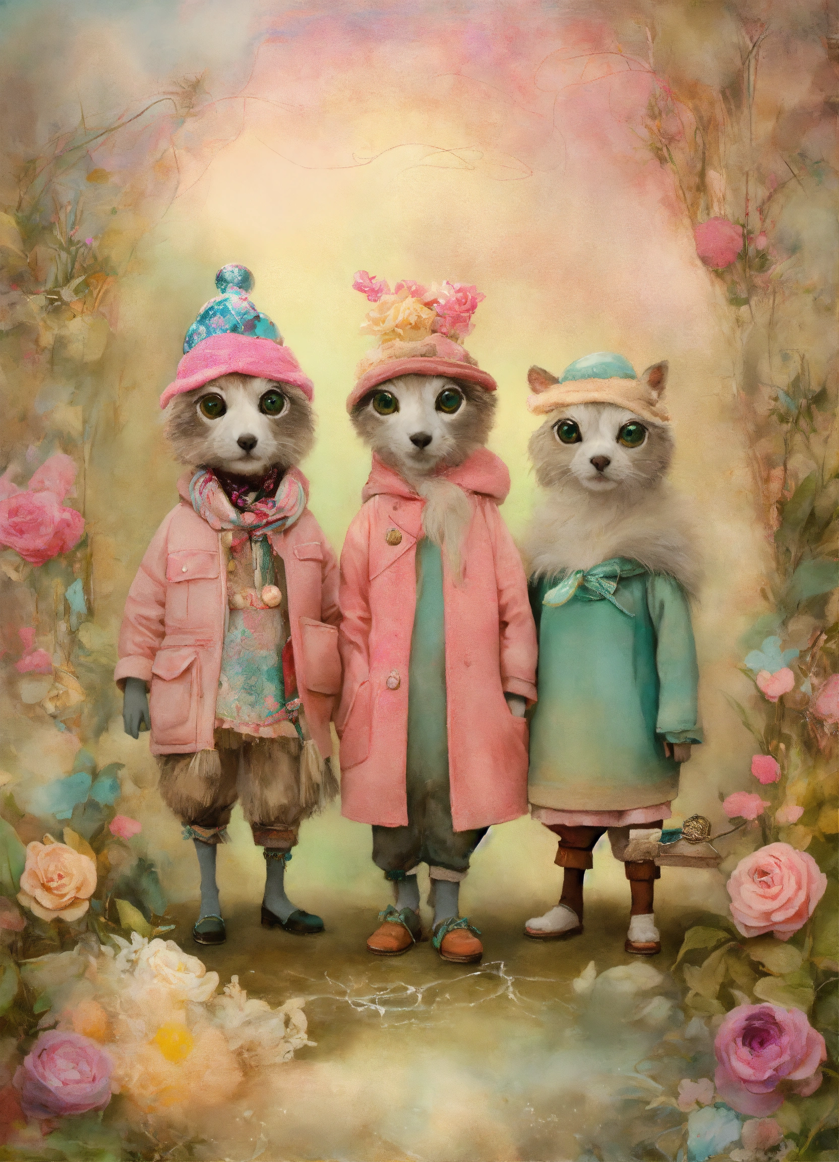 Shabby chic dreamy mist pastel junk journals whimsical cute quirky ice age style "sid and diego" with big eyes in odd clothings, tamara laporte style, swirling magical fairytale abstract art style