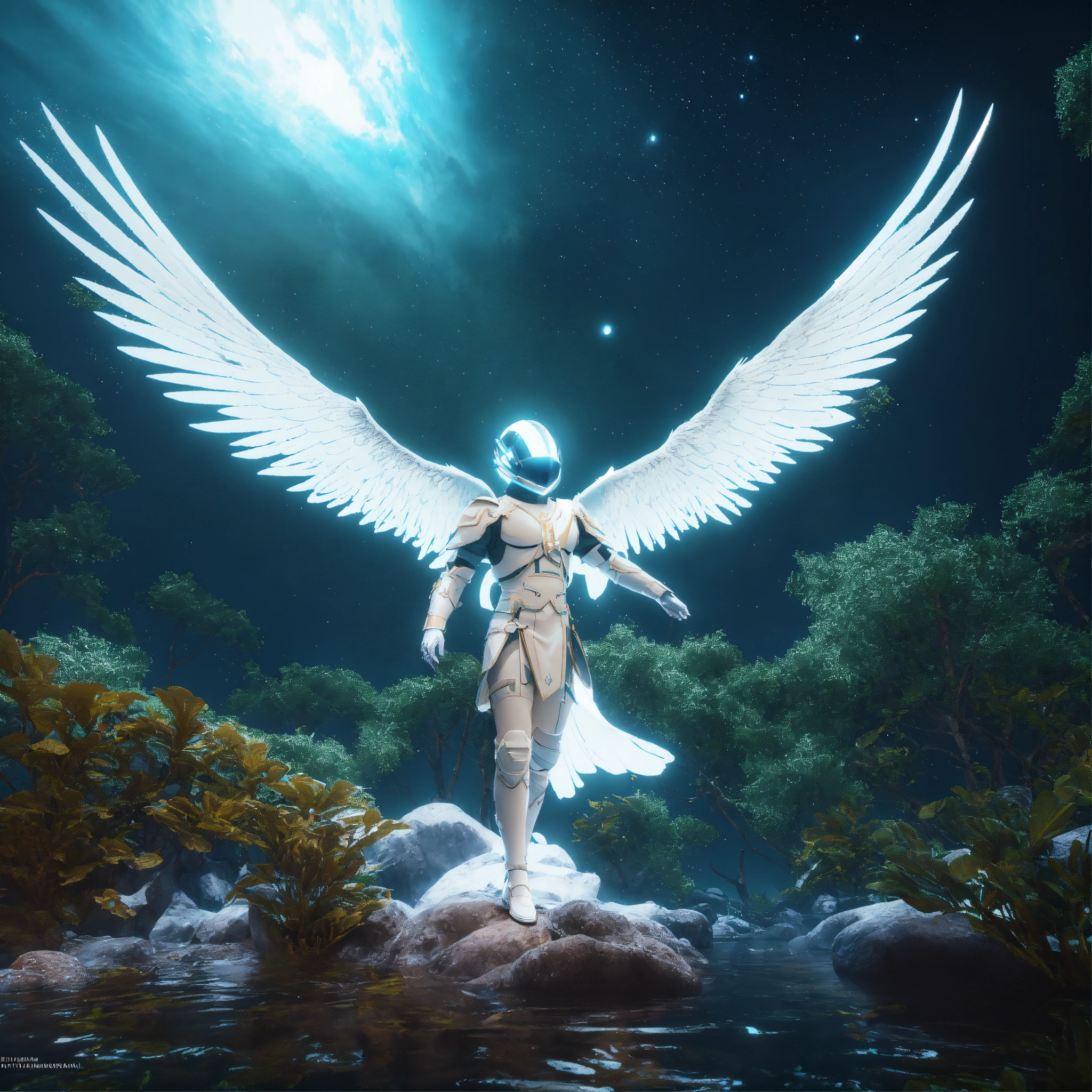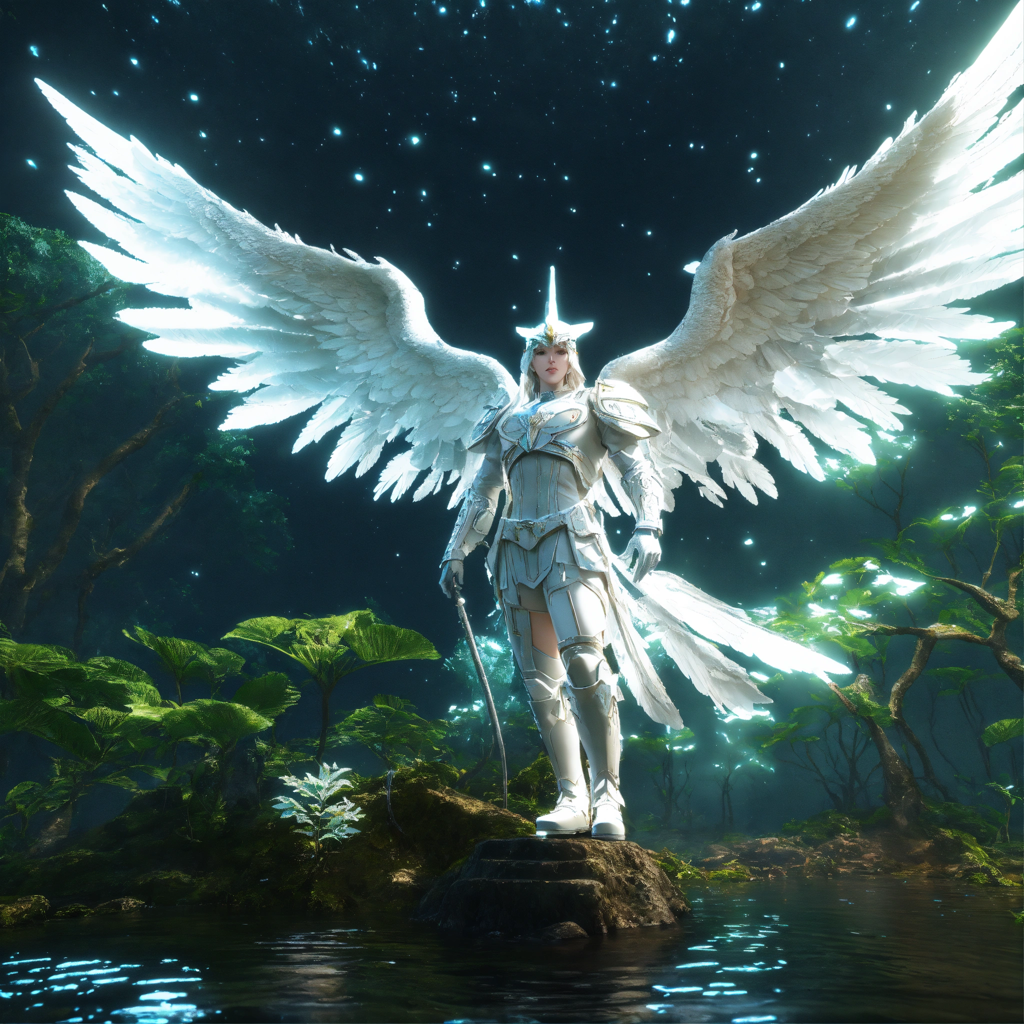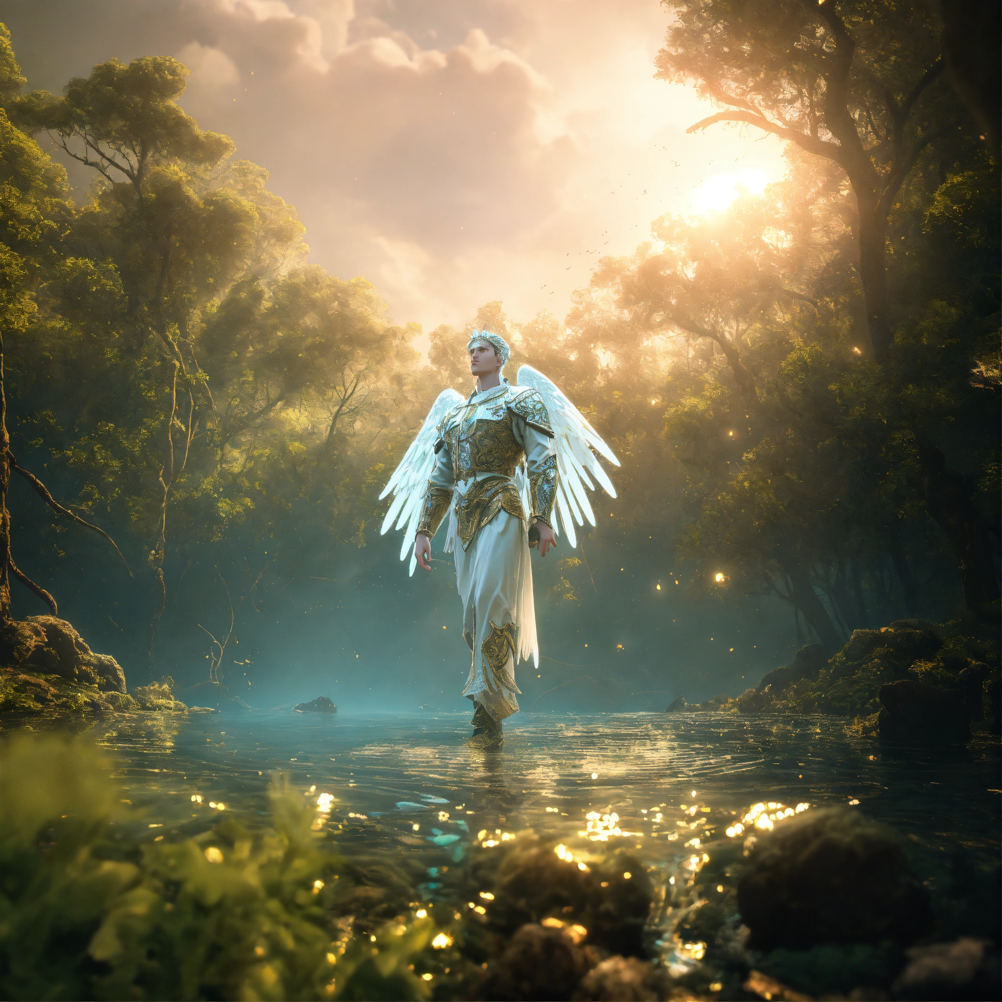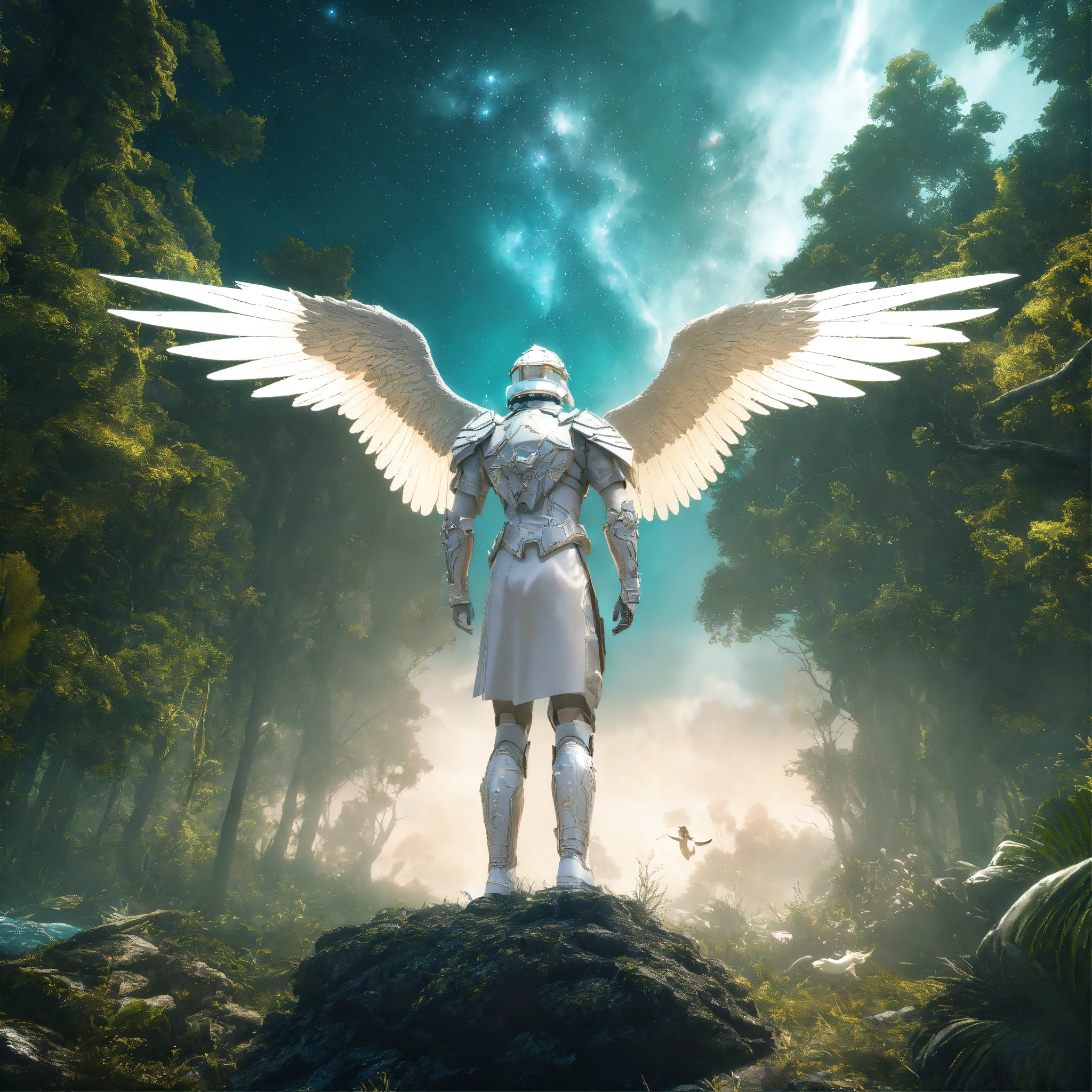 White archangel michael in dress, reptile in the forest, being reincarnated into a ocean world, sky nebula, artstation scifi 3d scene of a showing forest, maximalism, ambient occlusion, atmospheric haze, unreal engine, hyper realism, realistic shading, cinematic composition, realistic render, octane render, detailed textures, photorealistic, wide shot