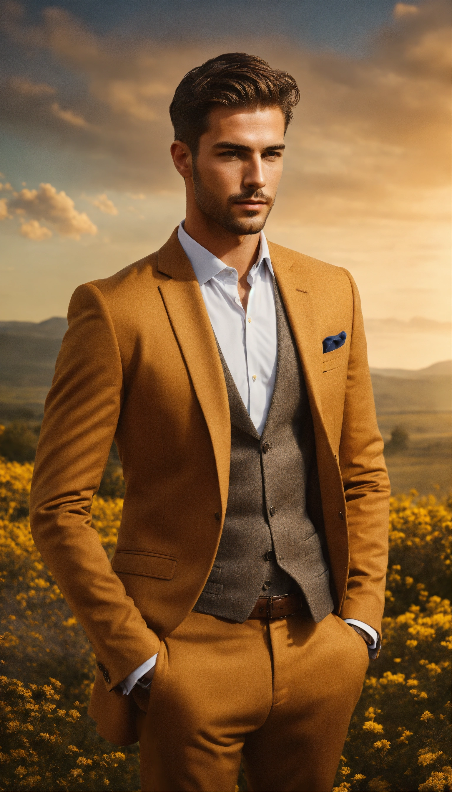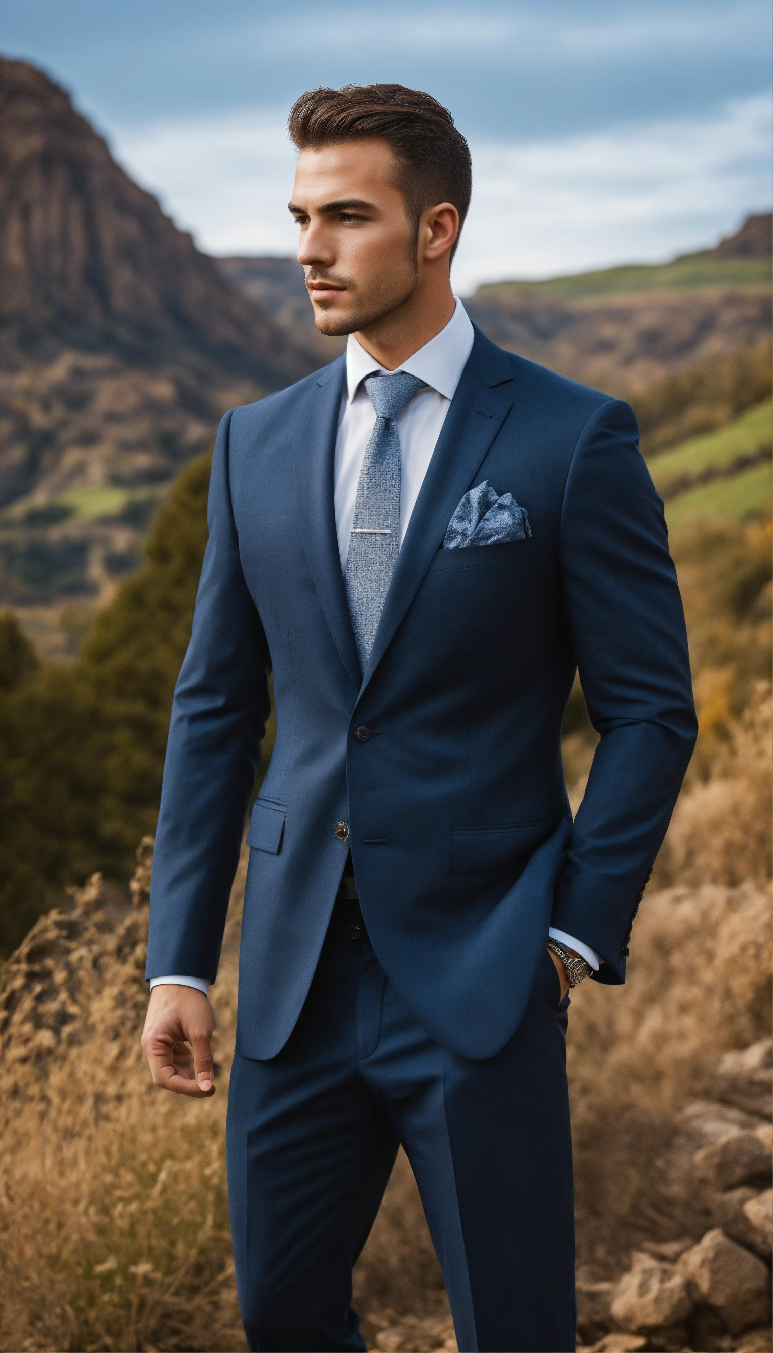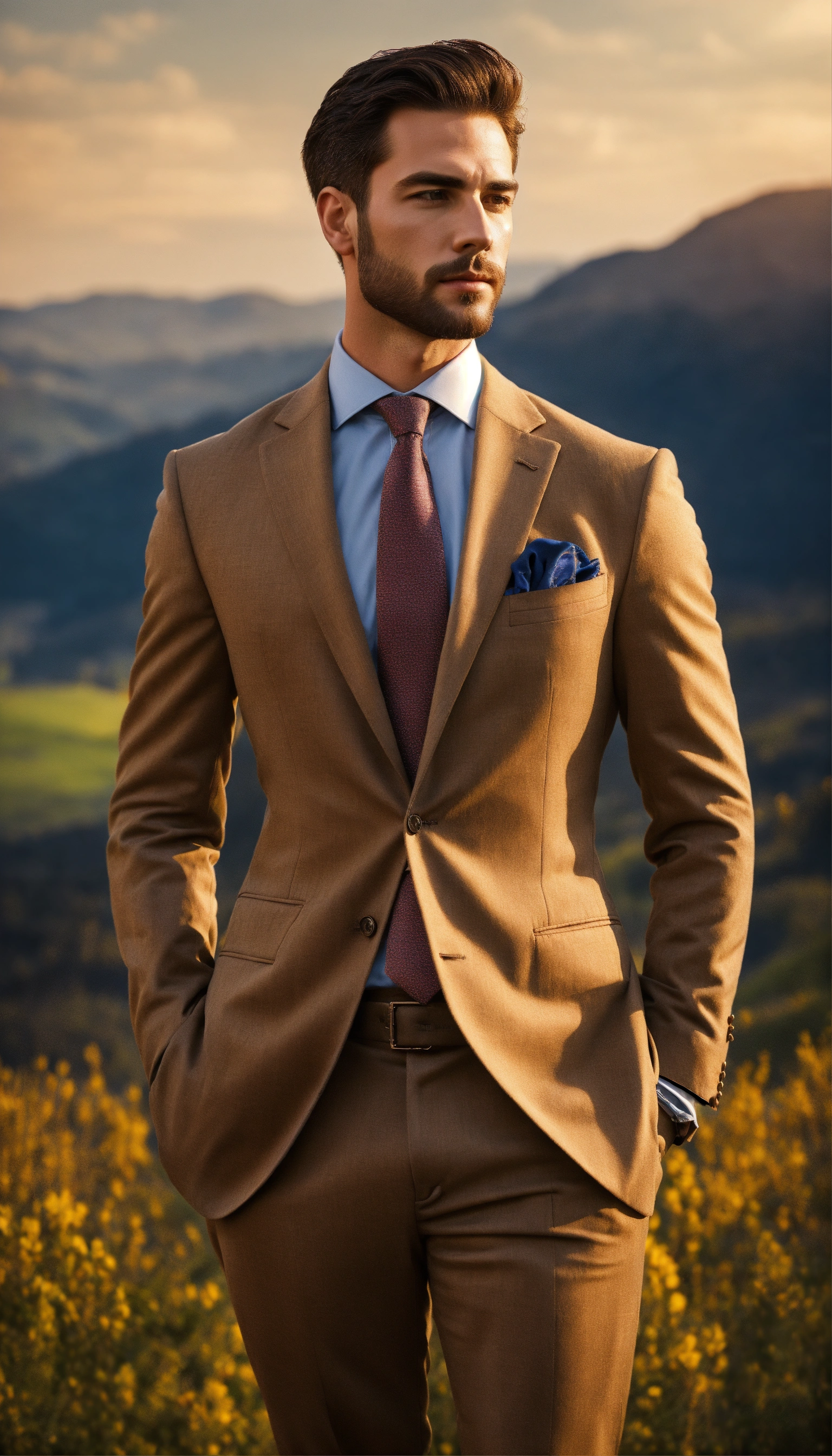 Design a compelling image, traditional and elegant, attractive man with broad shoulders, in suit. active landscape that represents the self-assurance and assertiveness. no text added.