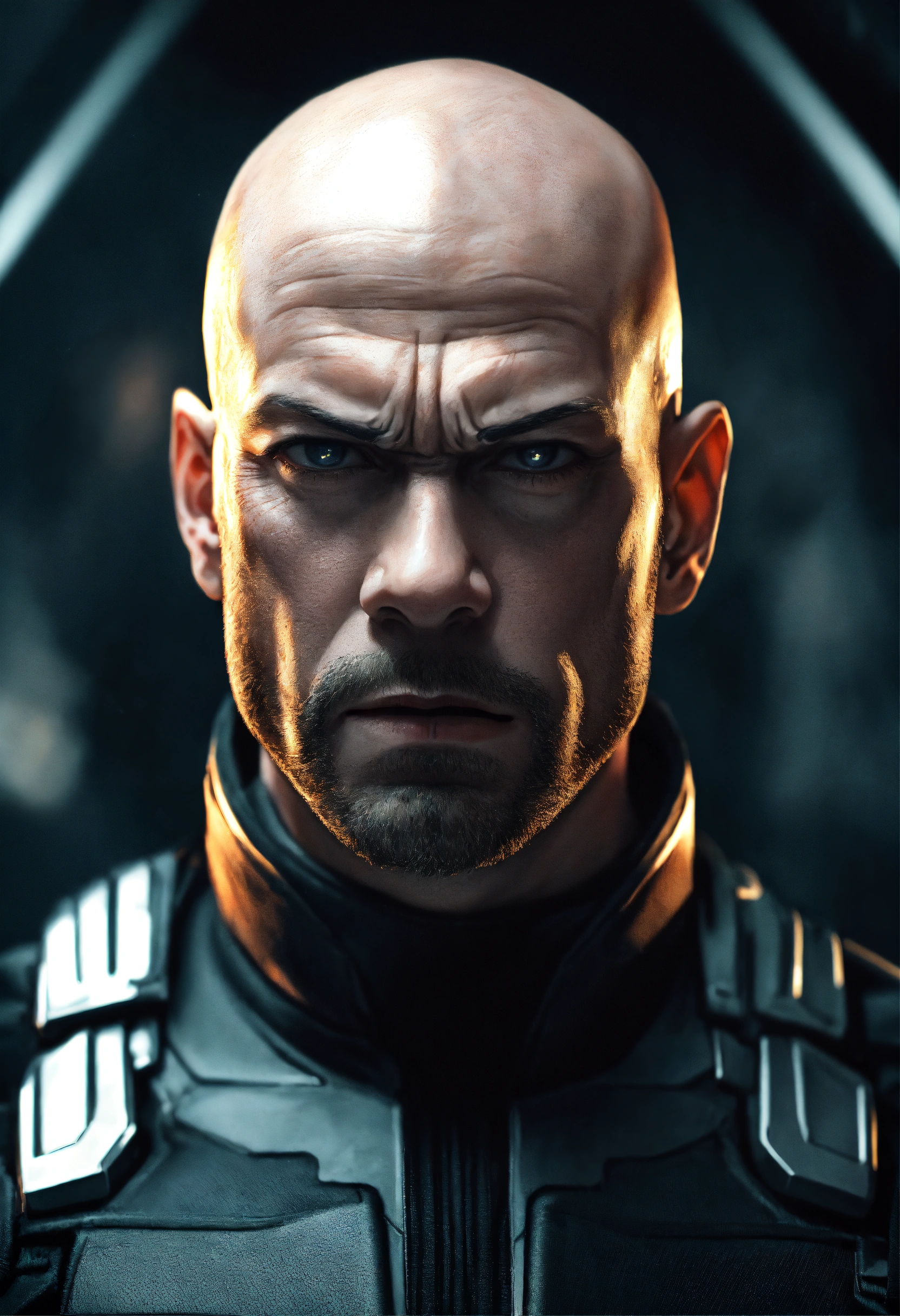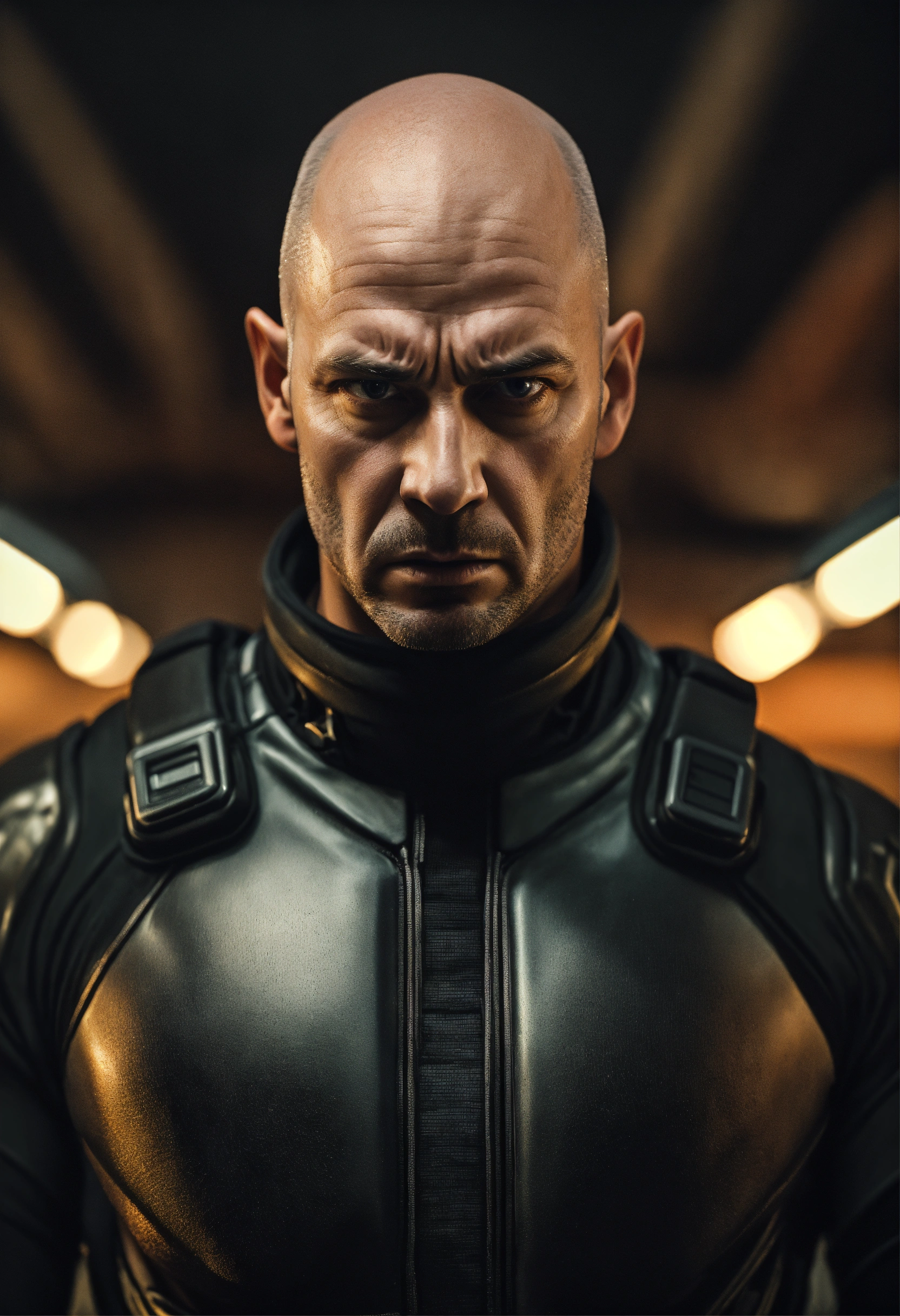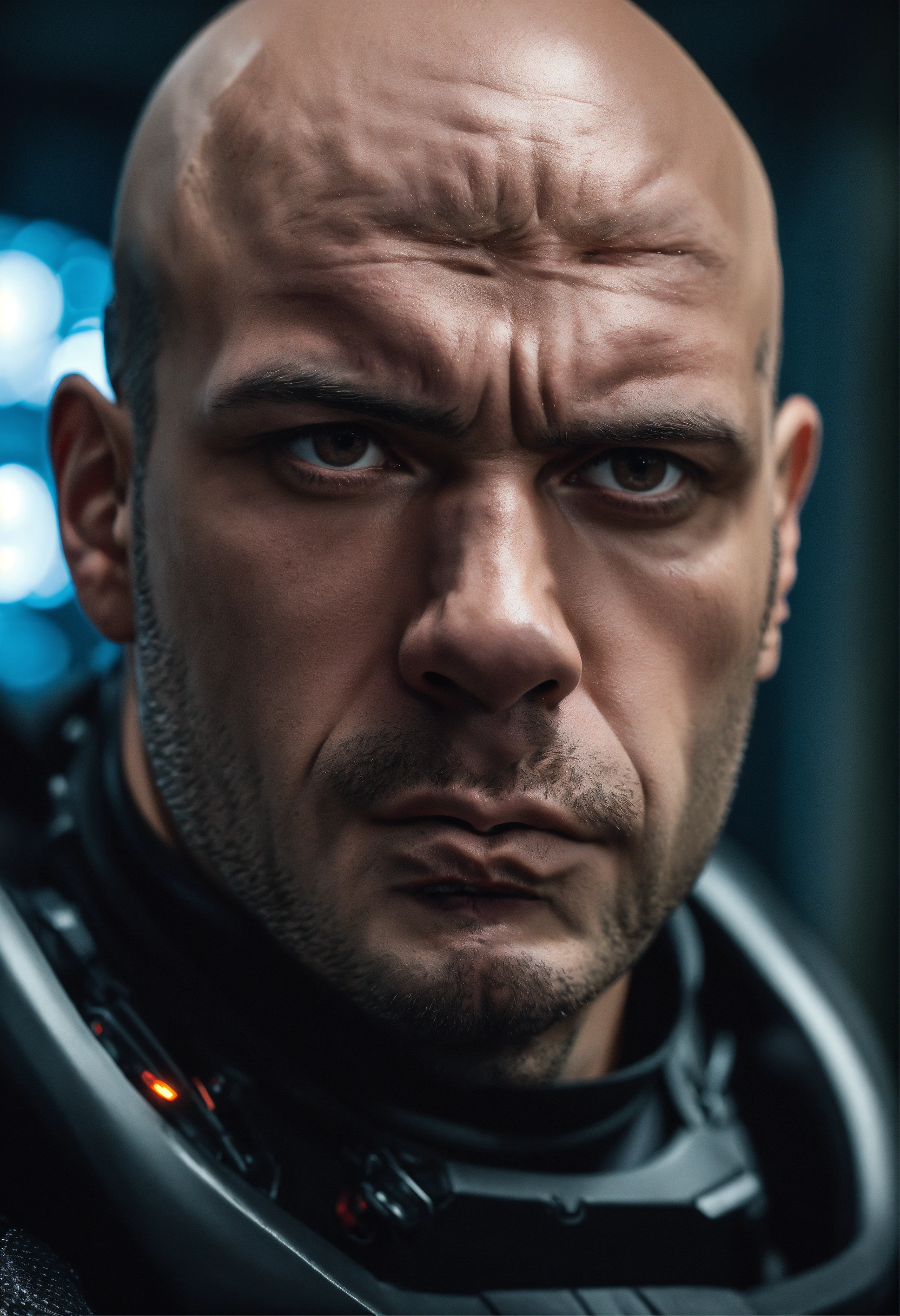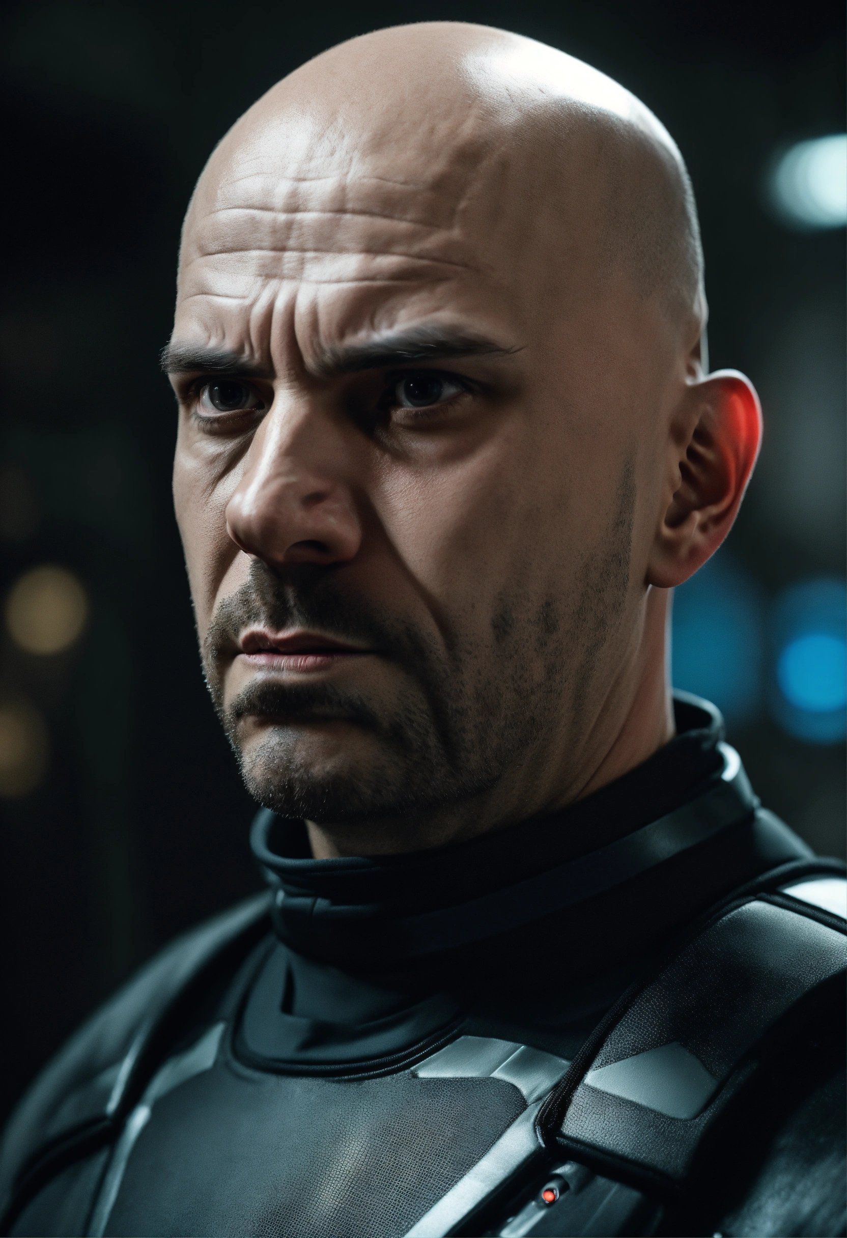 A realistic photo of an ugly 40-year-old man with dark eyes, sharp nose, white skin, almost bald, very angry expression, sour face, strong body, wearing a black polymer sci-fi training suit, dramatic ilumination, hyperrealistic, hyperdetailed, 8 k
