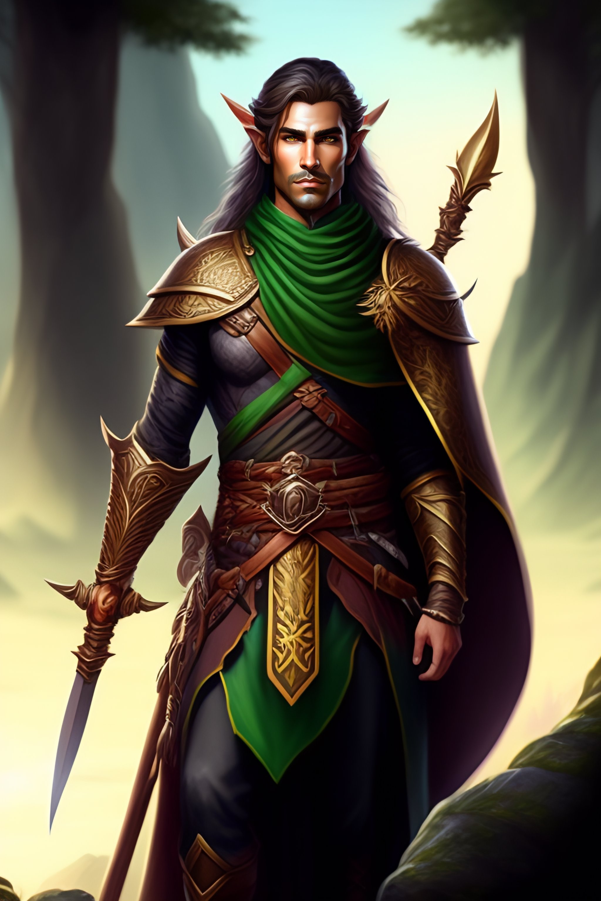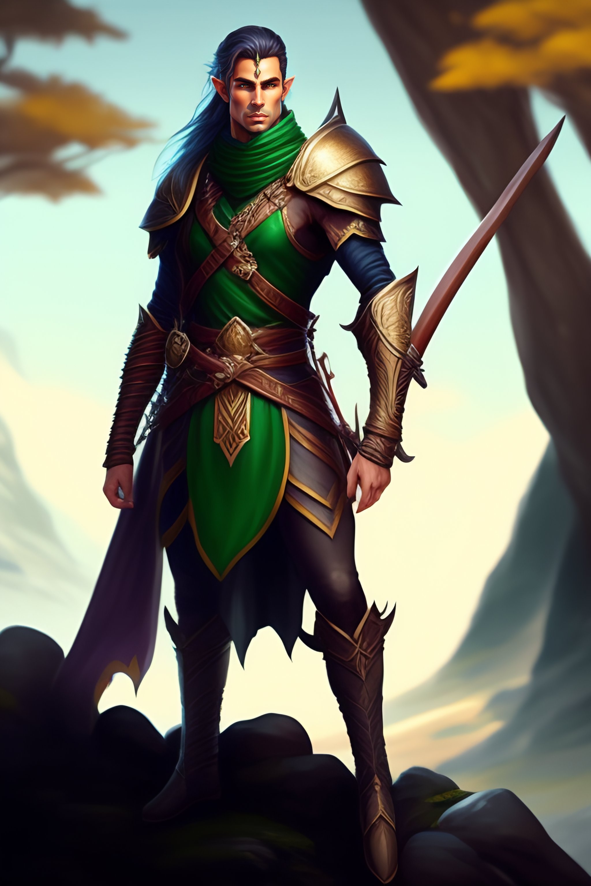 Male elf ranger standing on a rock with an elven bow in his hands, custom character art, dnd illustration, dnd art, digital drawing, character drawing