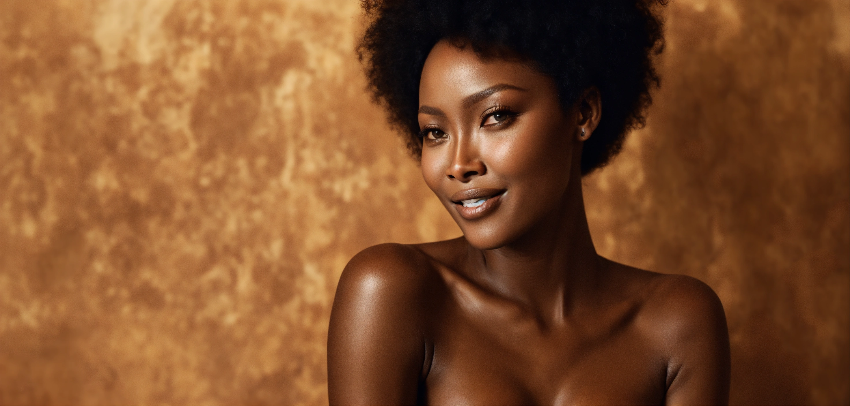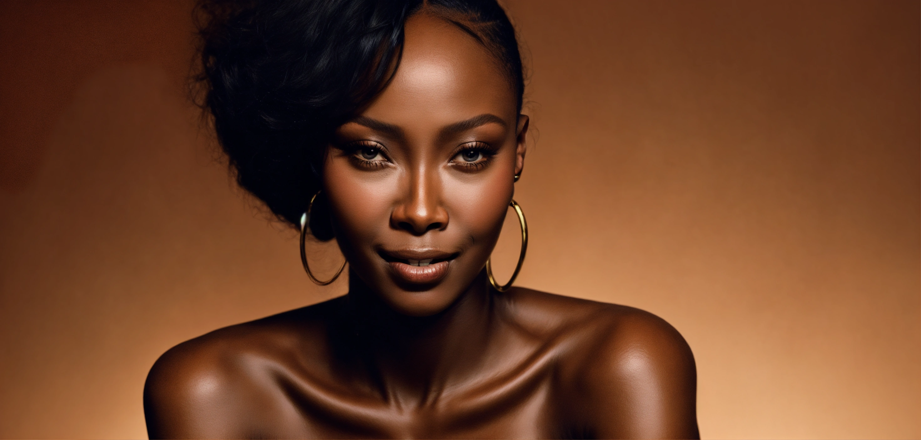 Wide-angle shot, beautiful melanated woman, young naomi campbell, african-american, dark skinned, peaceful face, smiling, abstract background in brown tones