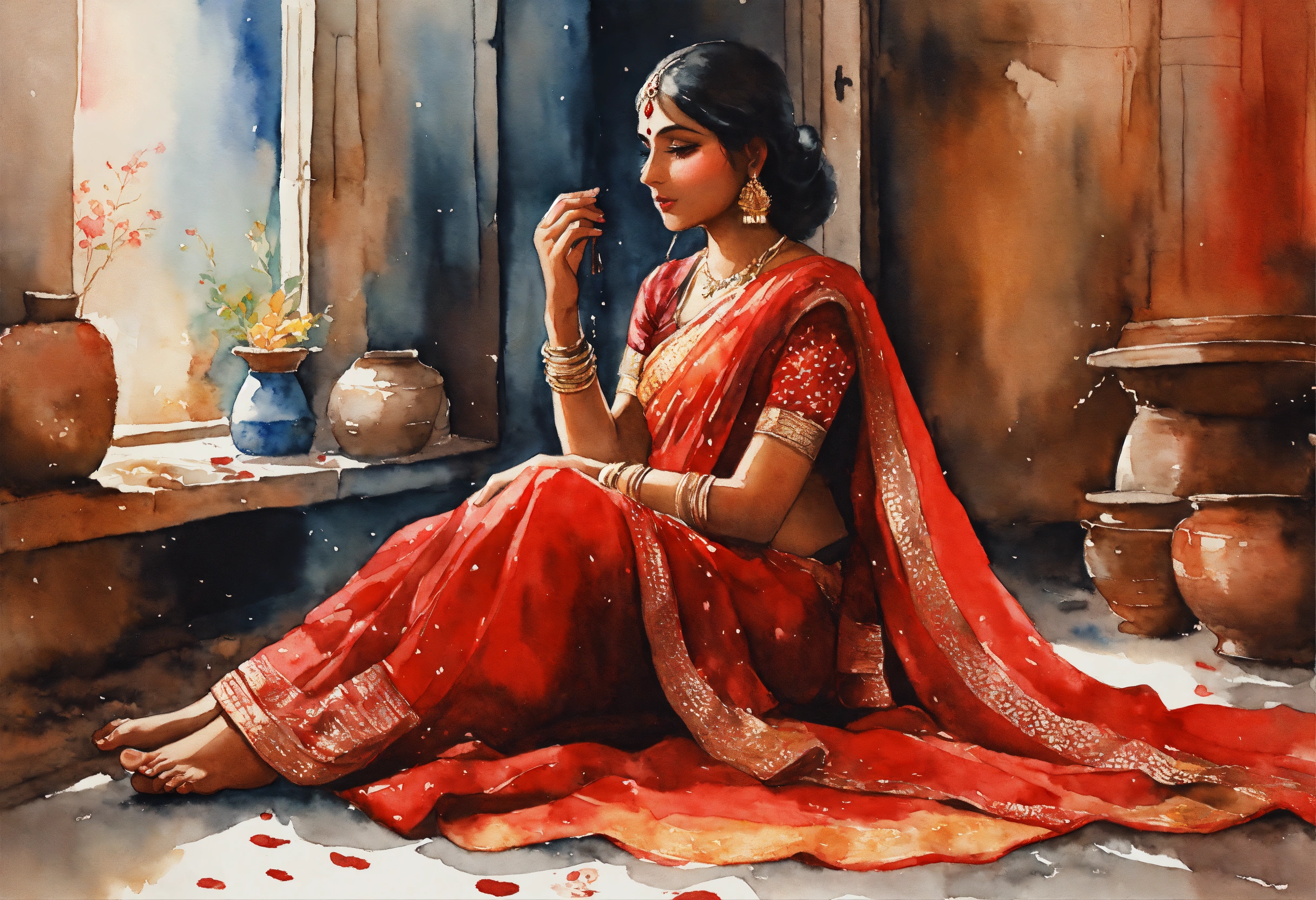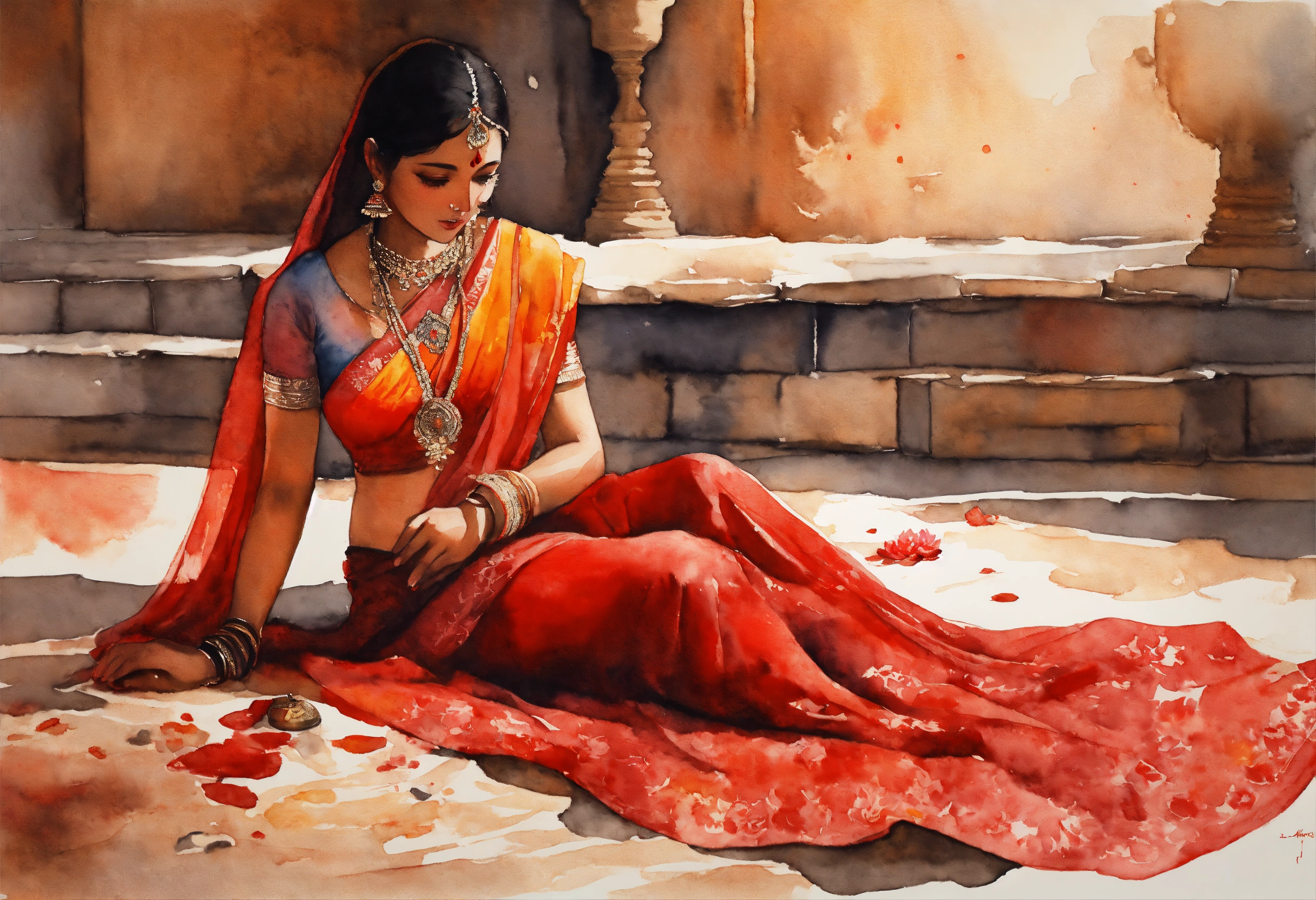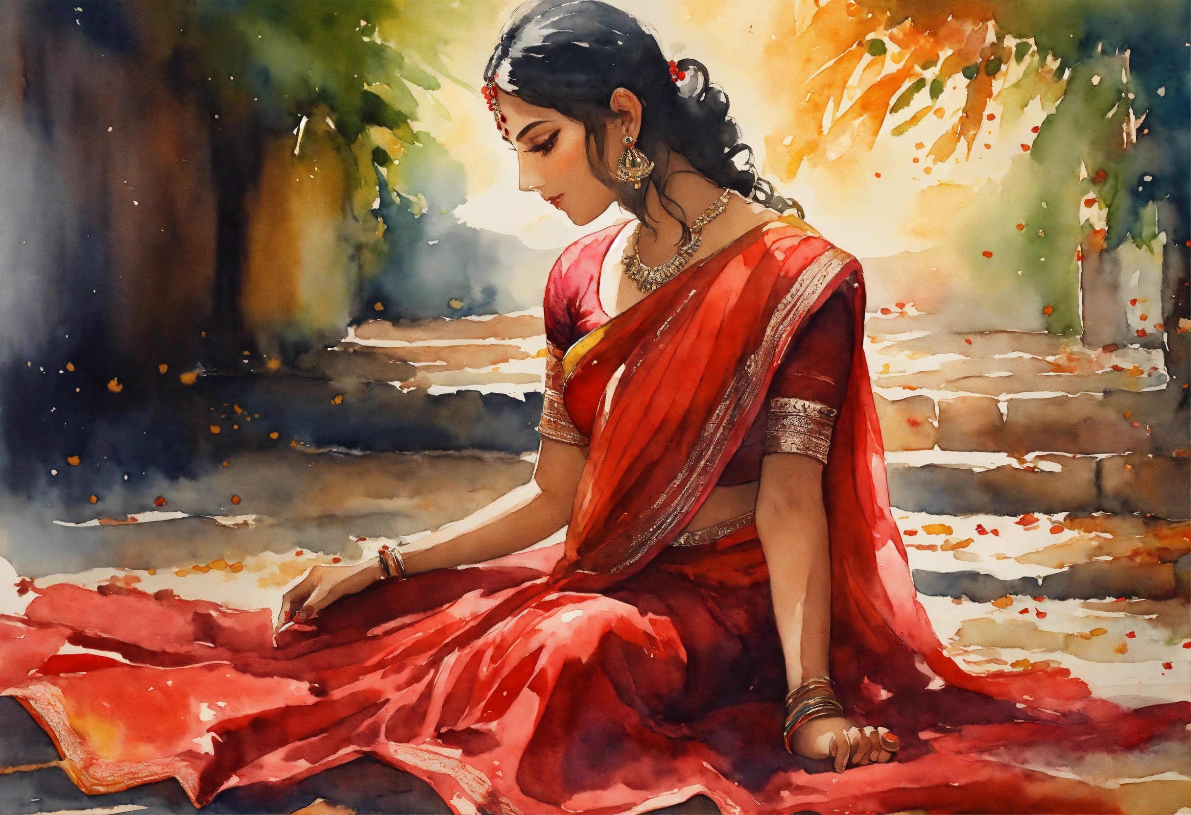 In this mesmerizing watercolor artwork, the captivating essence of an indian woman is evoked through her vibrant red saree, as her foot delicately stamps an impression upon the ground. 8k