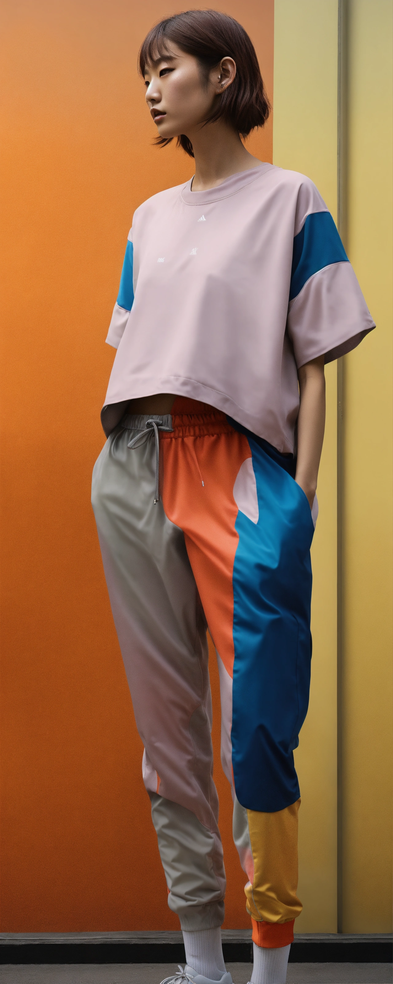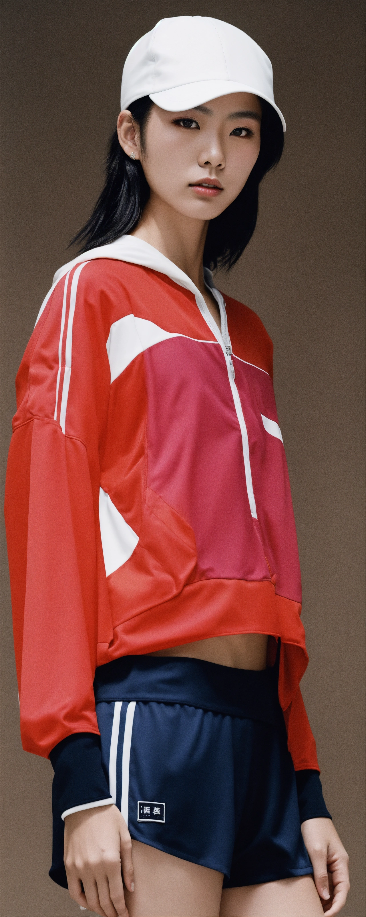 A hyper-realistic photo emulsion transfer of a japanese fashion model in sportswear outfit that only covered limited part of the body, very minimal, 256k, no text.