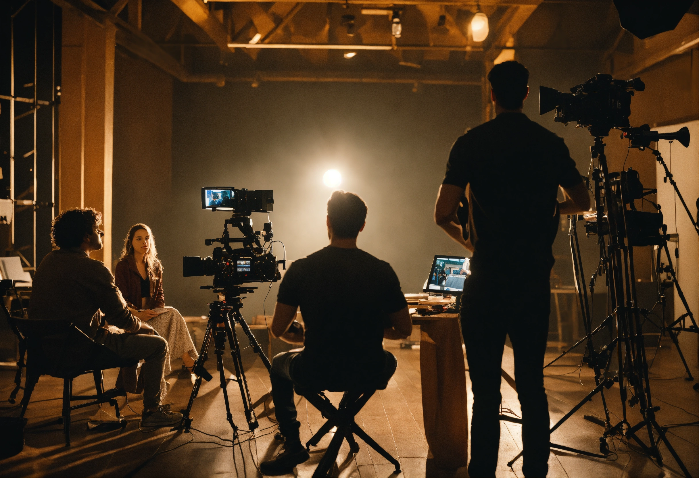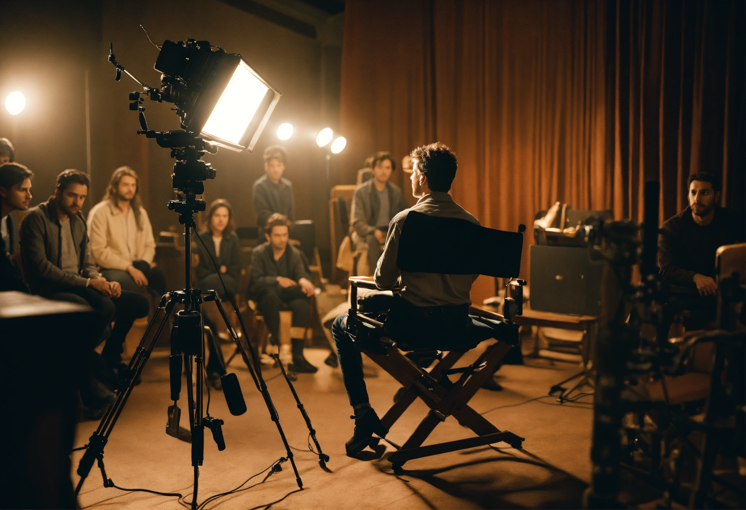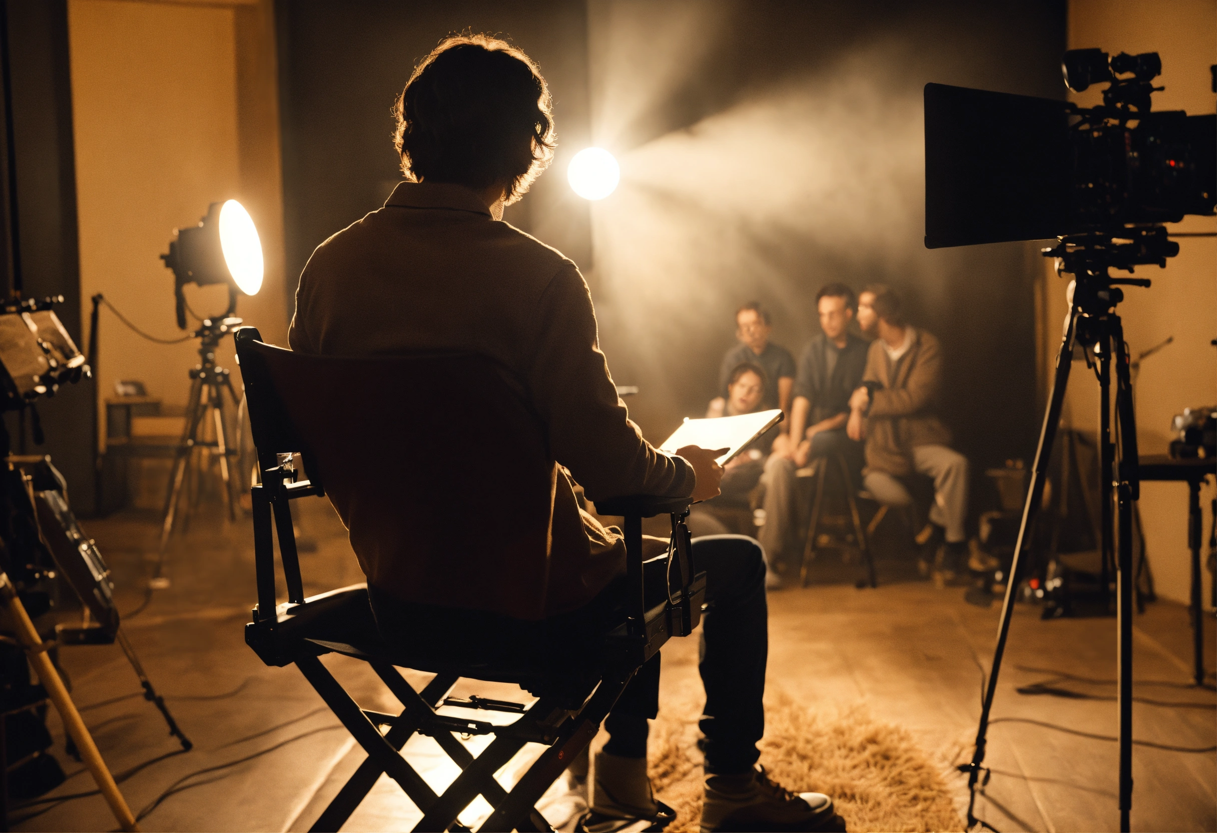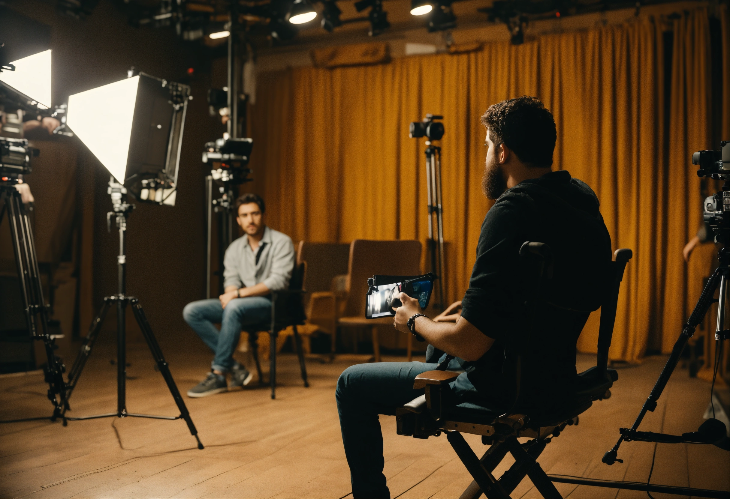 The process of directing a film. a young film director in the director's chair looks towards the set where the actors are playing their roles. the director can be seen from the back. there are 3 actors on the set and the director is sitting in a chair and directing the actors. realistic. a clear correct focus. full frame. 3d, 4k, soft light directed at the actors, complex details, depth of field, beautiful lighting. details.