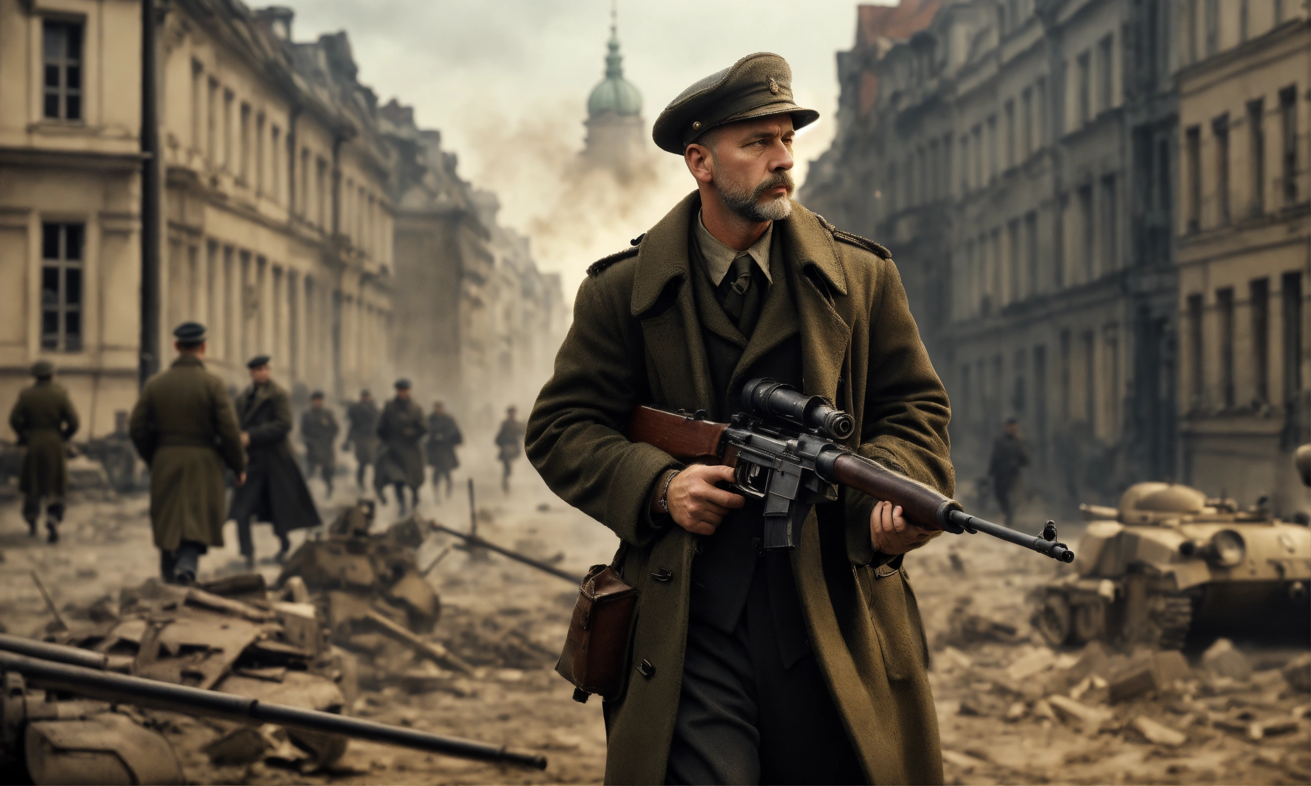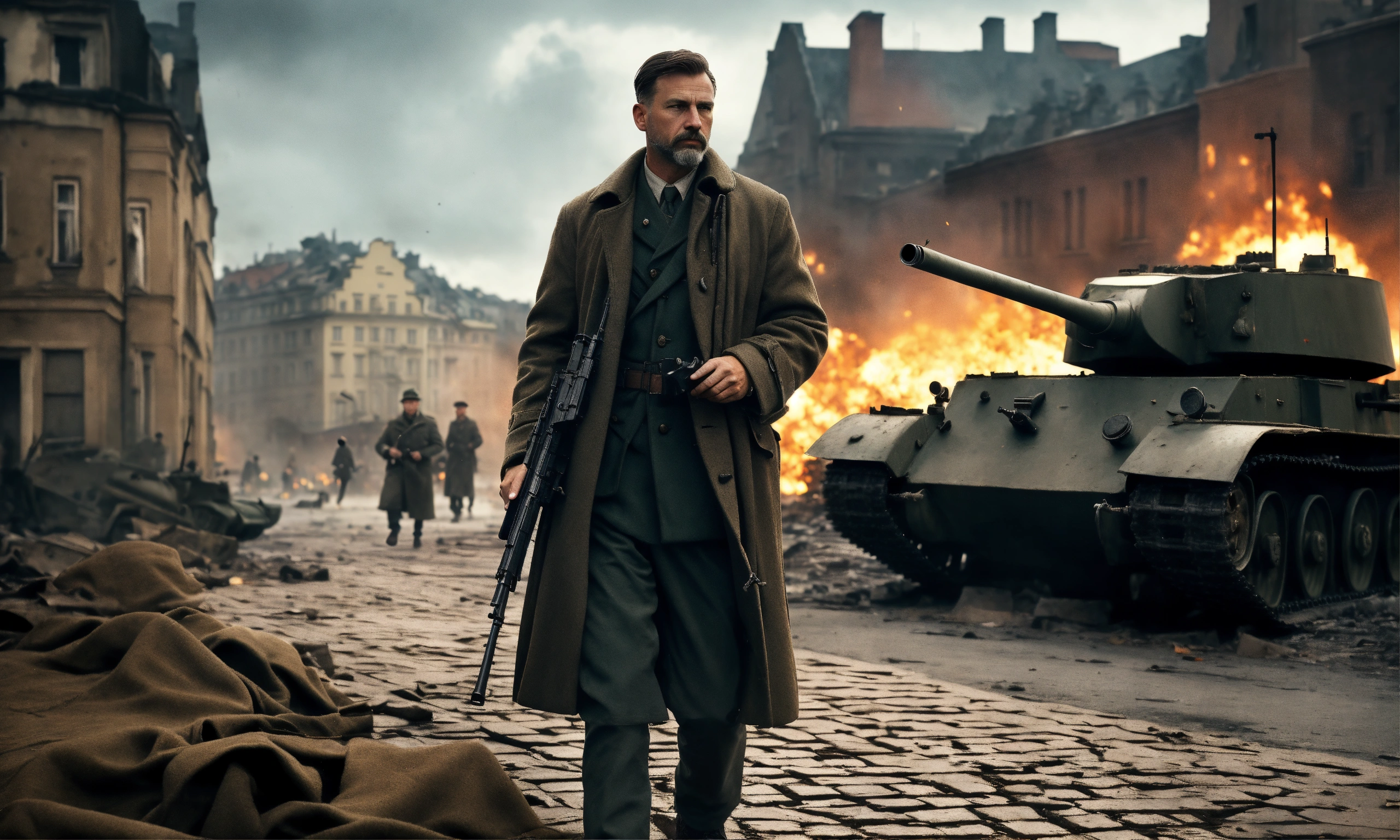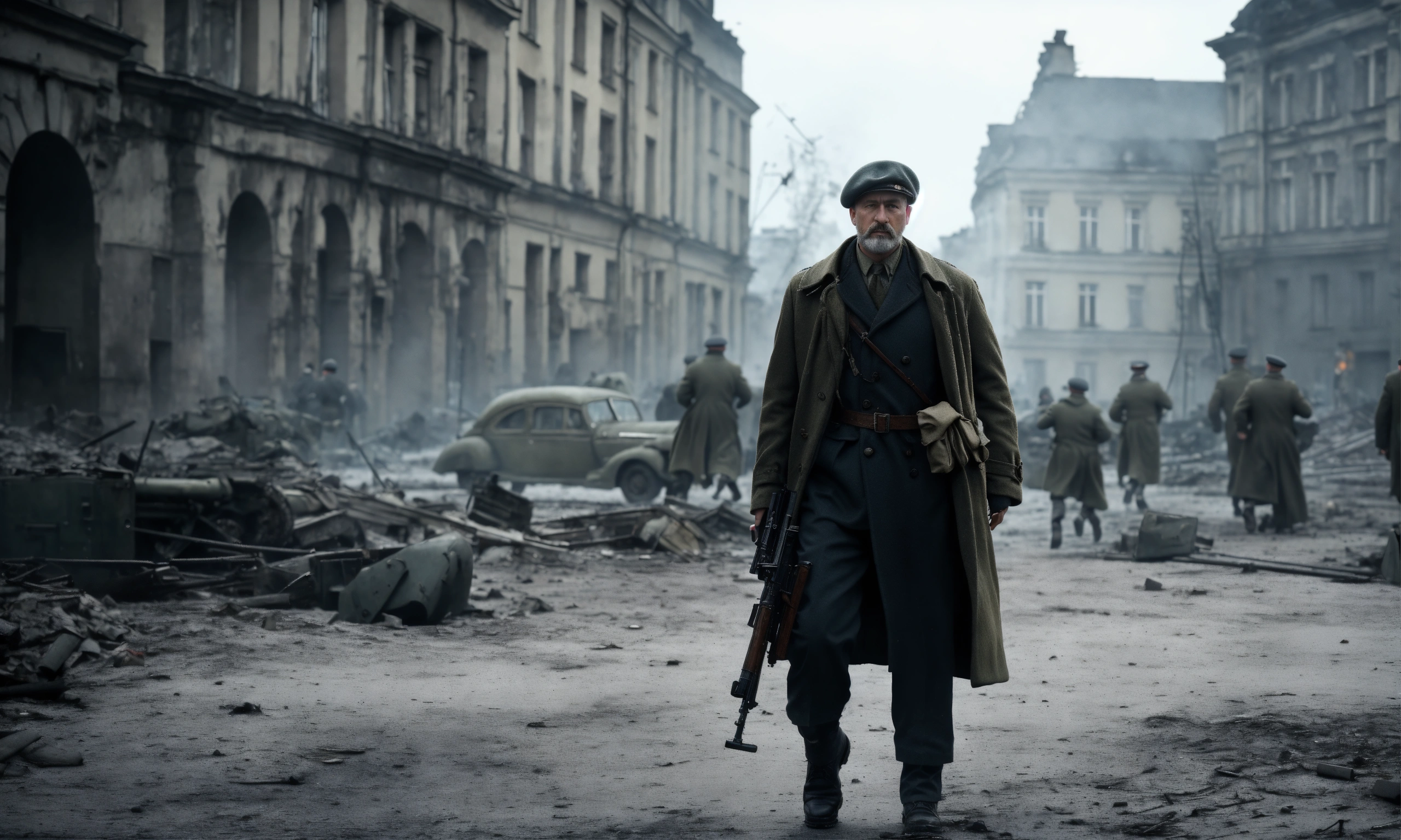 Cinematic wallpaper of a 1940s german man with an overcoat coat and cargo pants holding a machine gun, 45 years old with a short hair and a beard, realistic body proportions, in ruined warsaw poland in 1944 during the uprising with resistance fighters running in the background and a tank, cinematic, ultra detailed, grimdark, realistic, hd