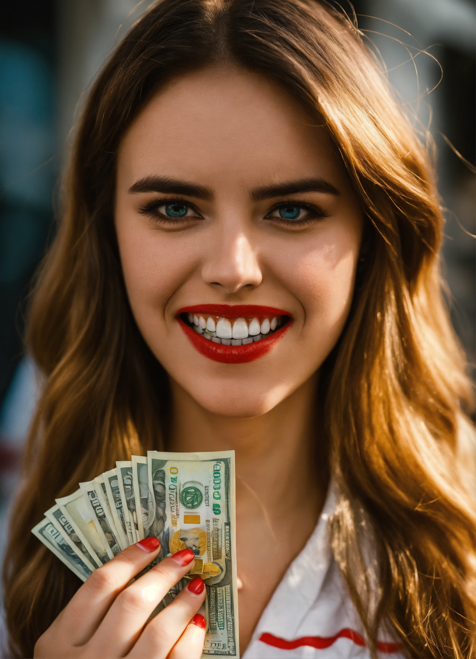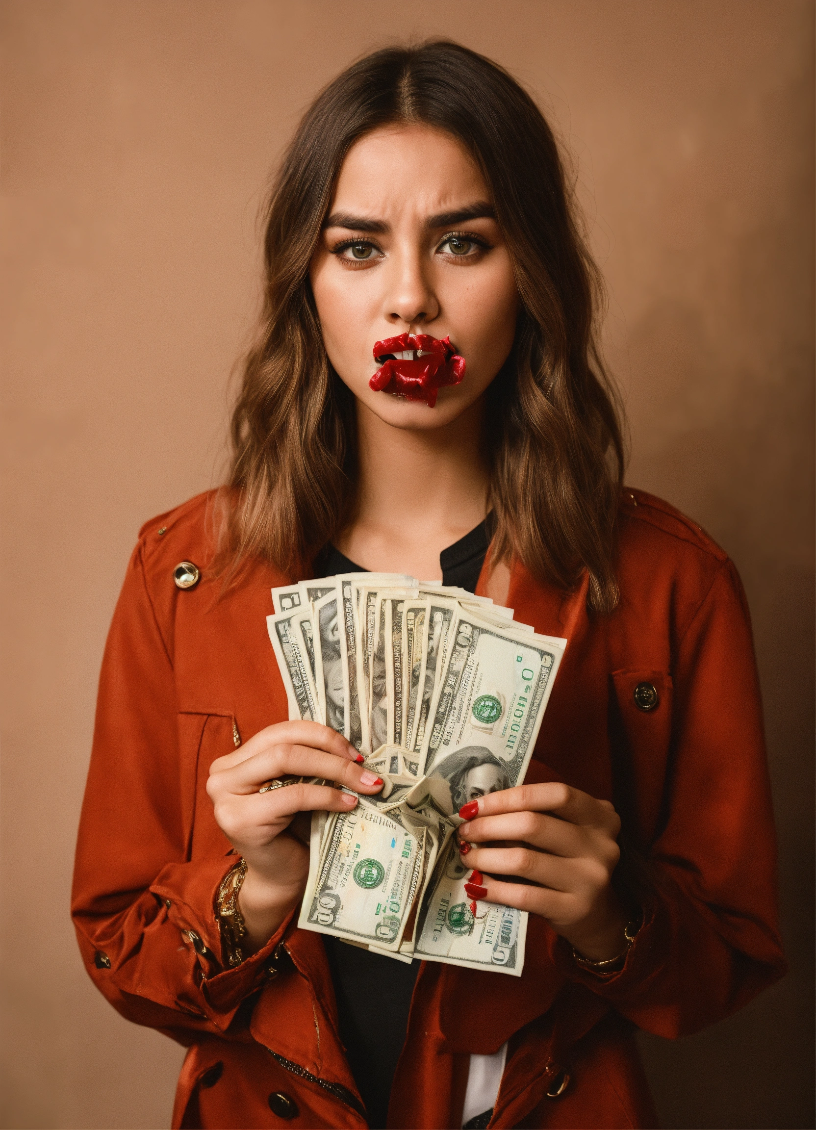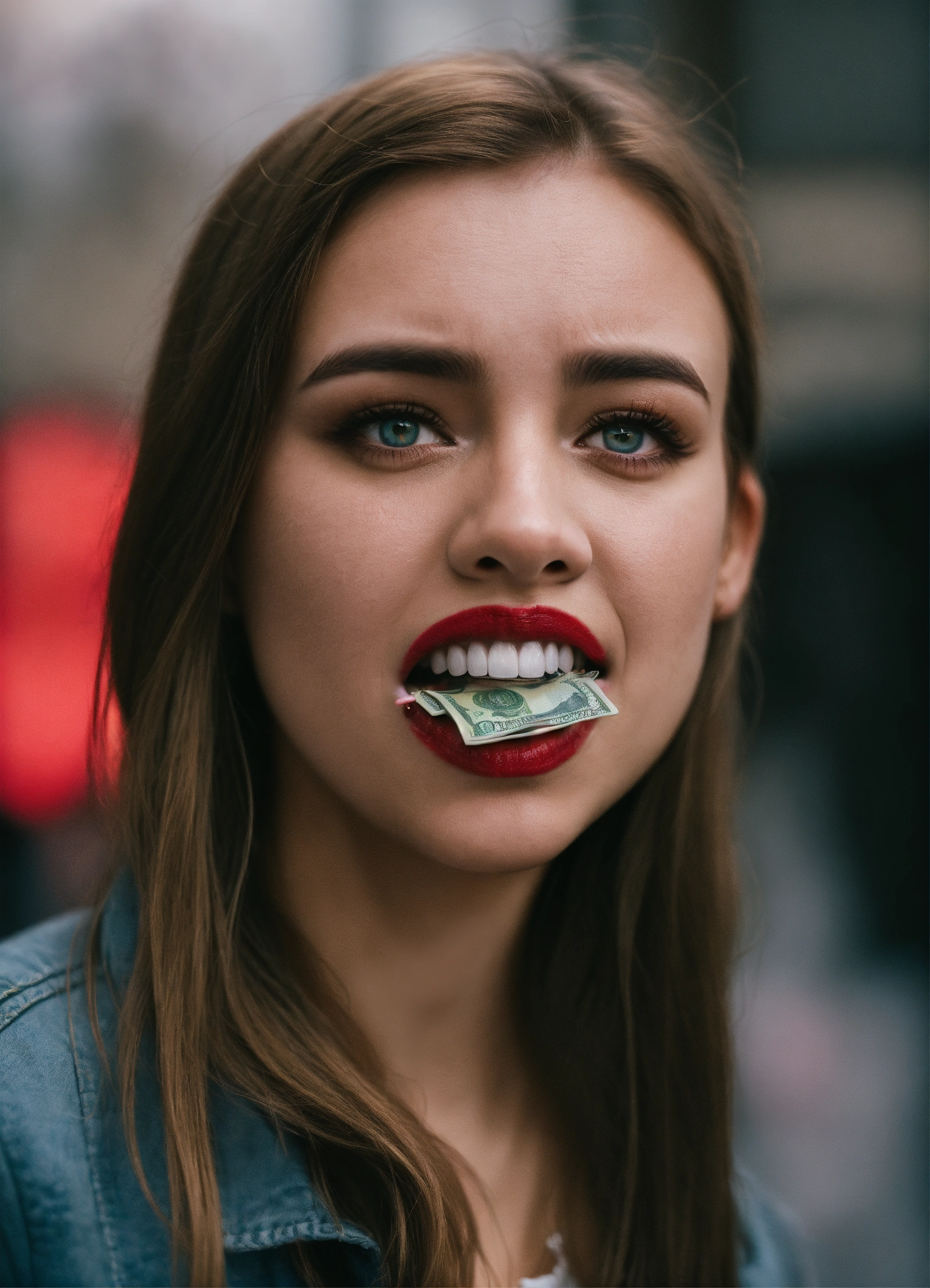 A 25-year-old woman stands with a wad of dollars in her teeth