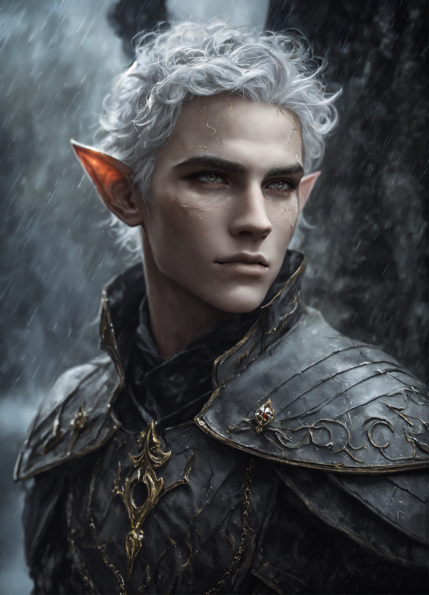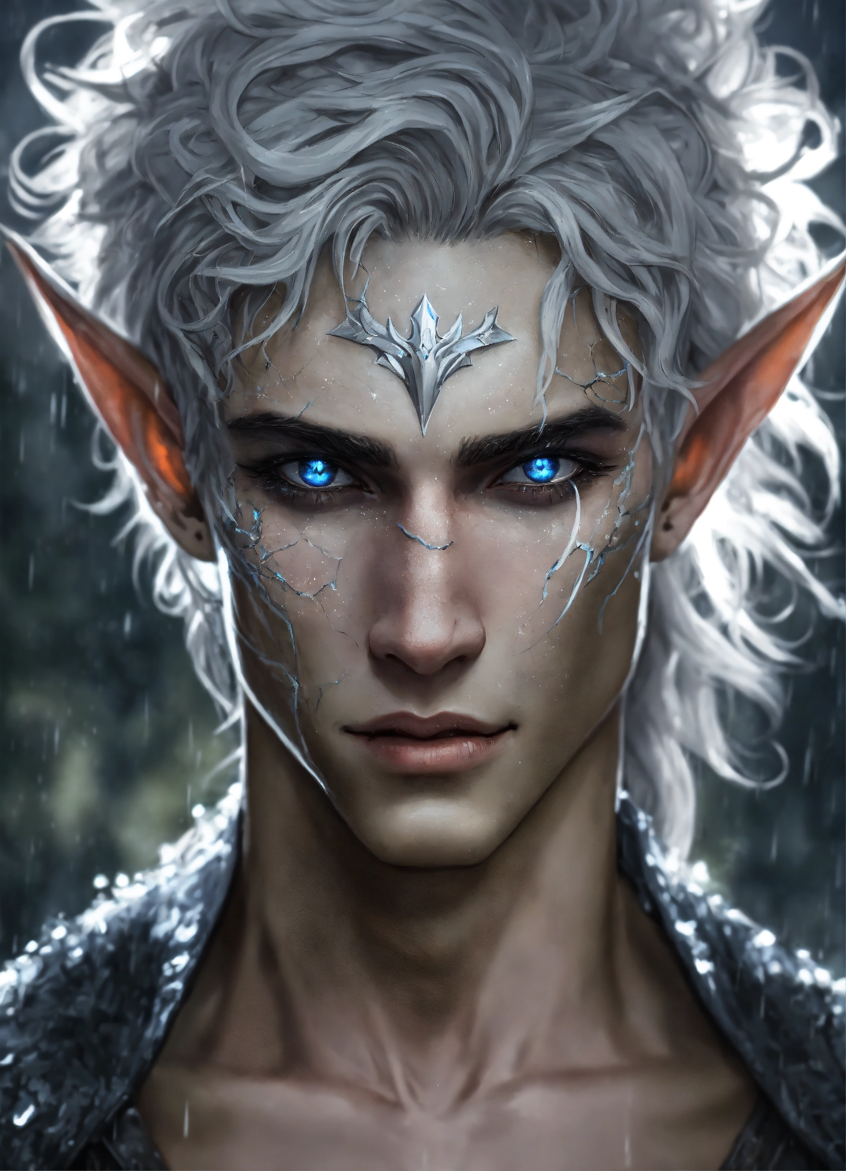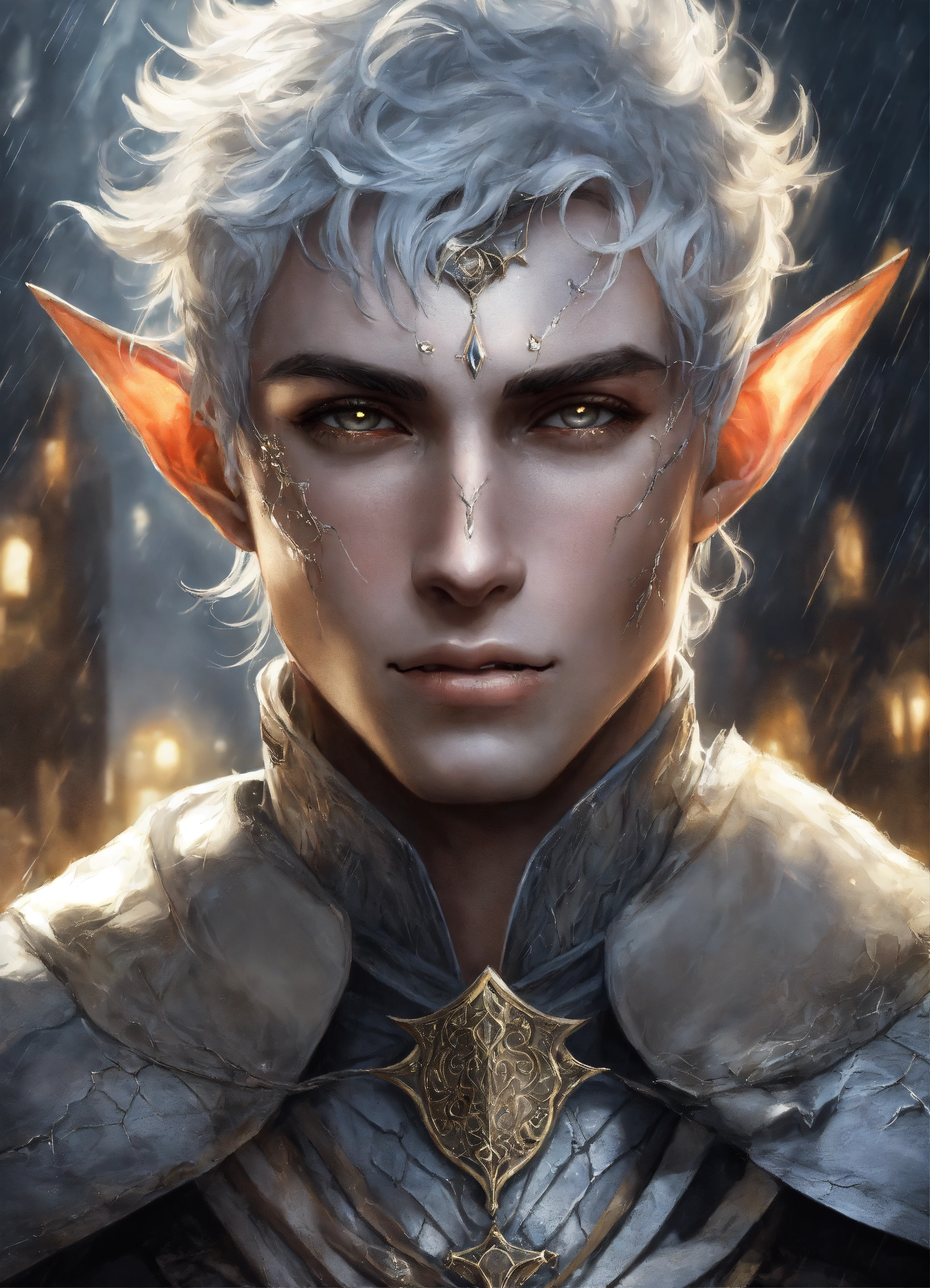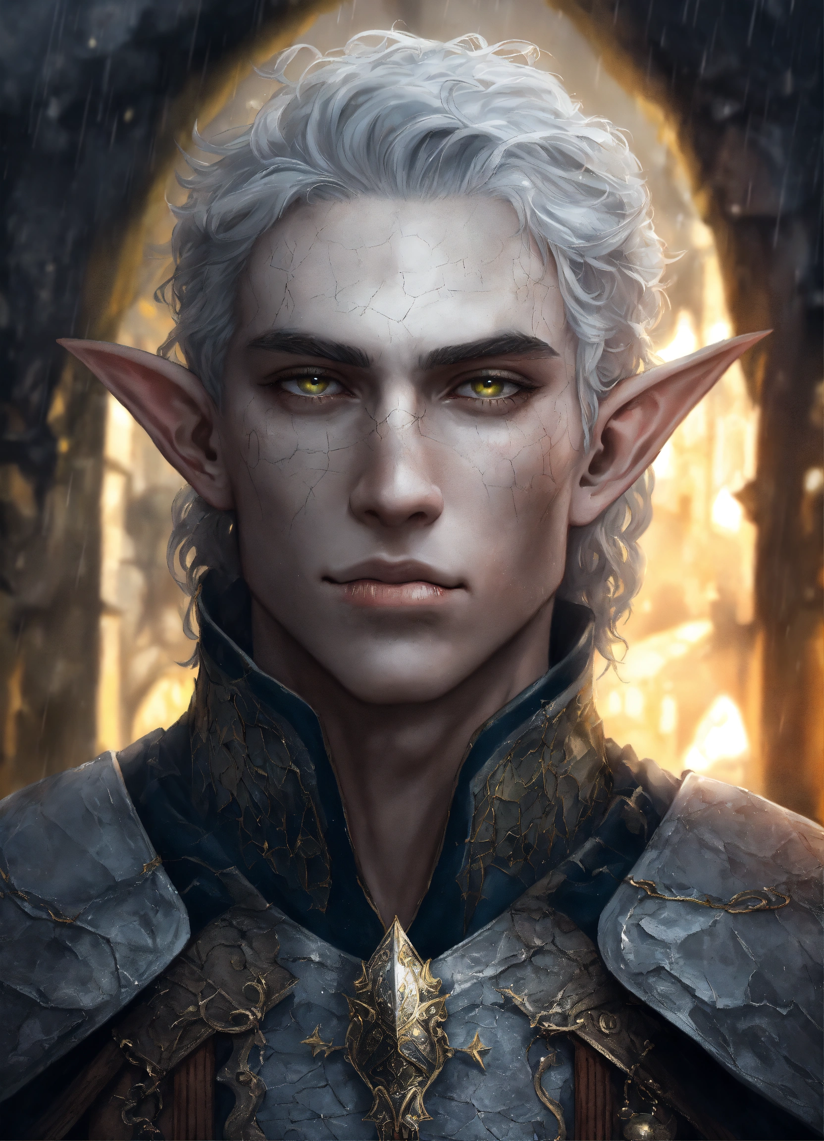 Fantasy portrait of a ash-grey skinned elf, masculine, androgynous, sorecerer, artificer, many cracks through the face, blank white eyes, sharp features, sad expression, fangs, soft smile, glowing white curly hair, rainy castle background, ultra detailed