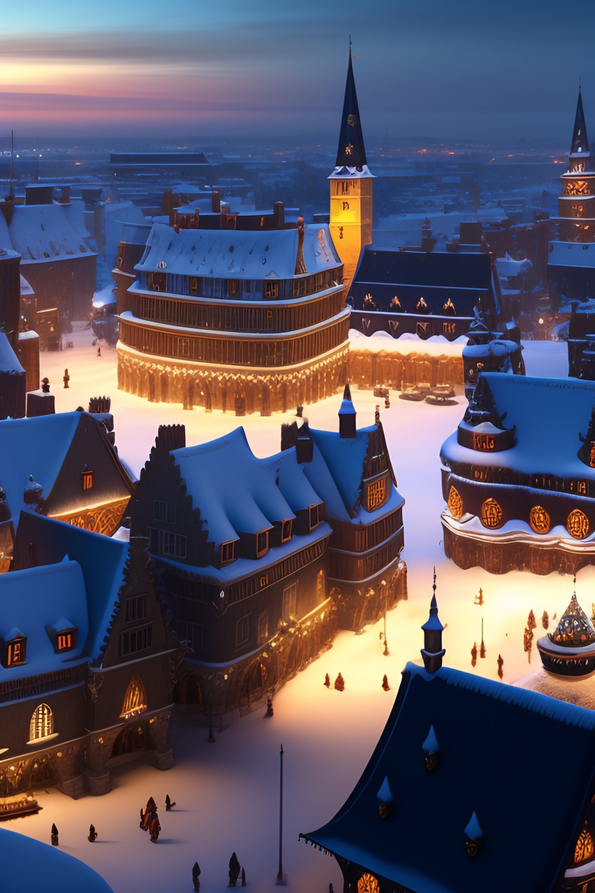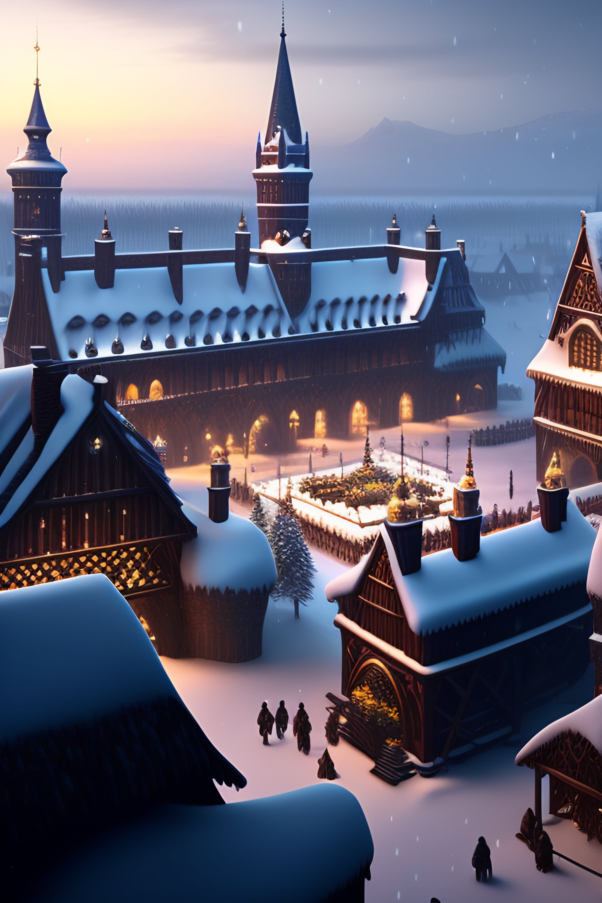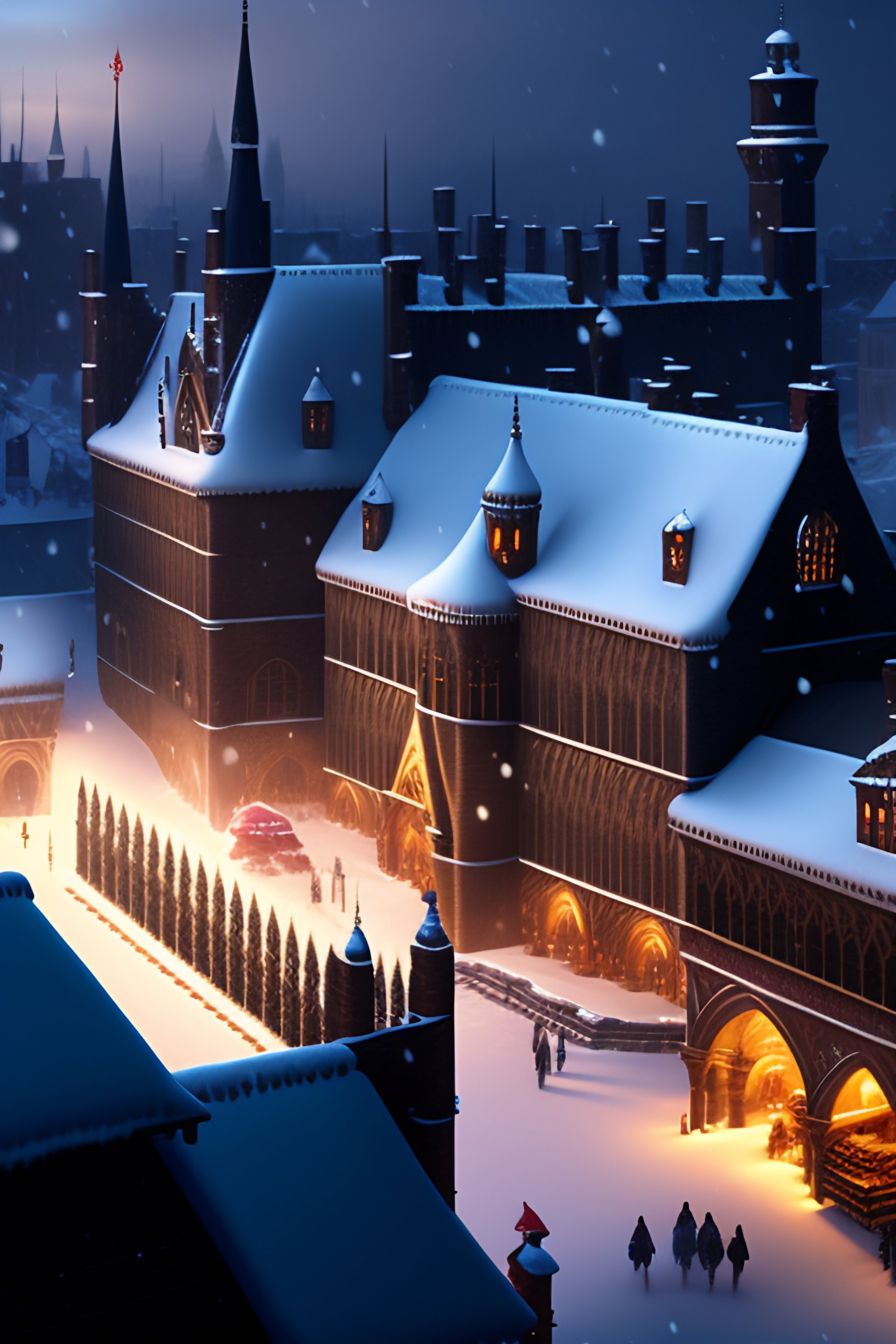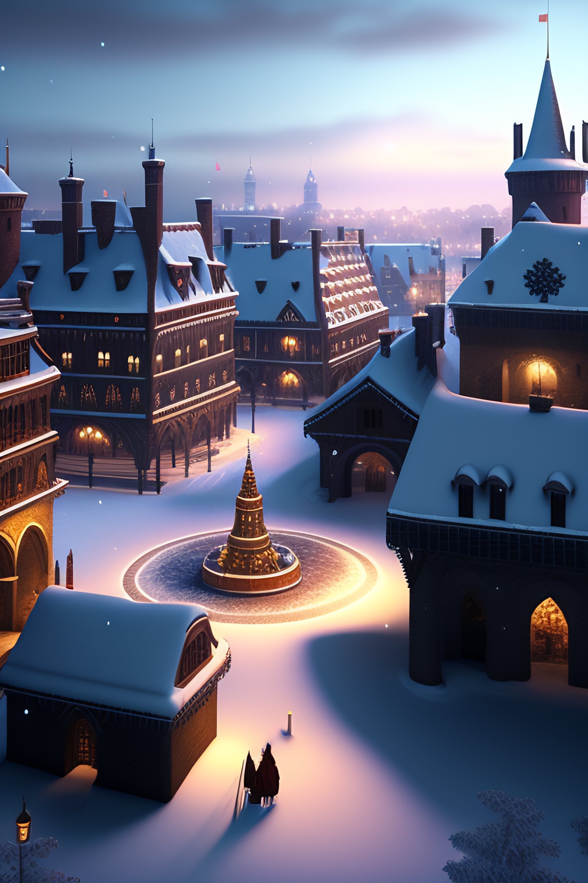 A medieval city square with a large building with spires in the center, snowing at dusk, photorealistic, high detail