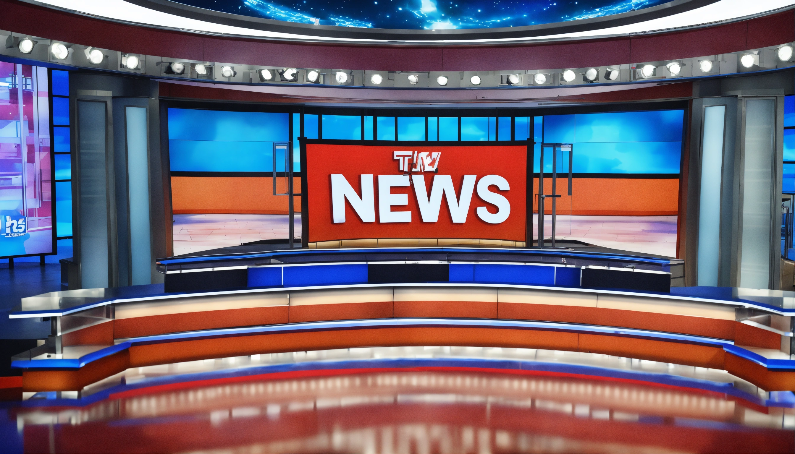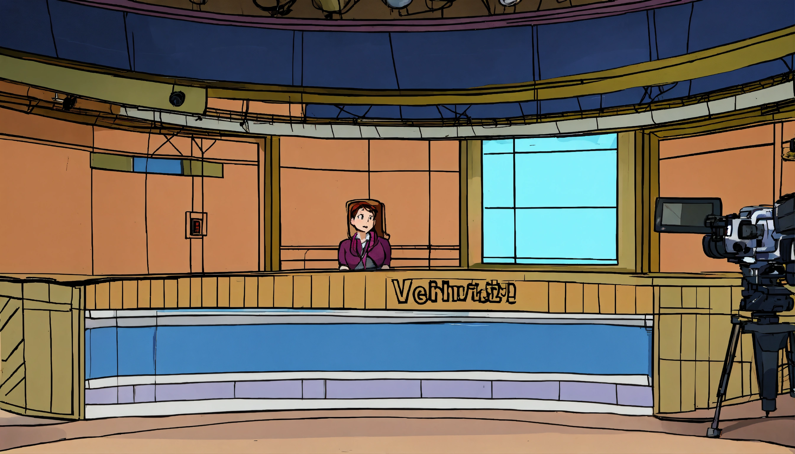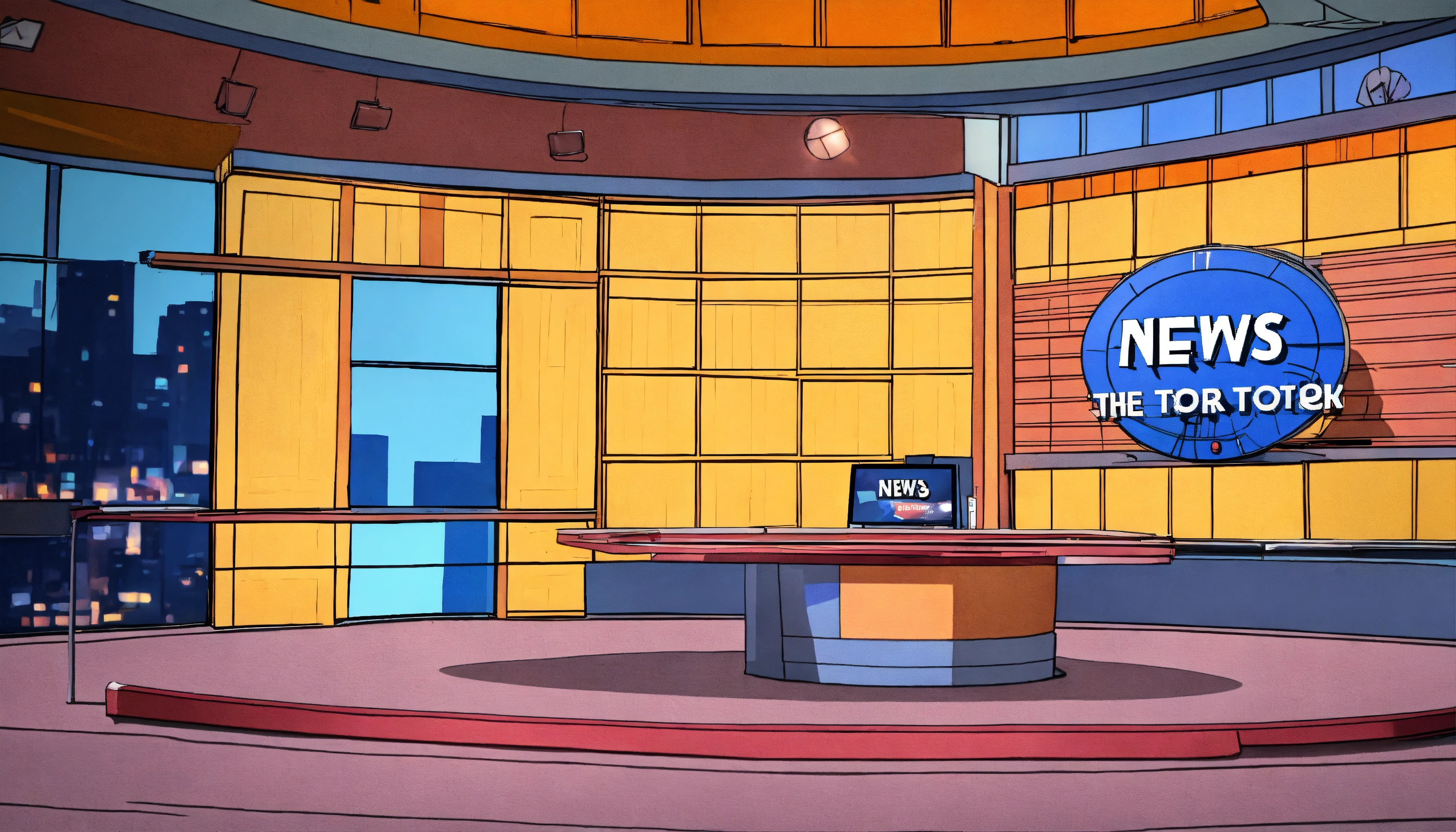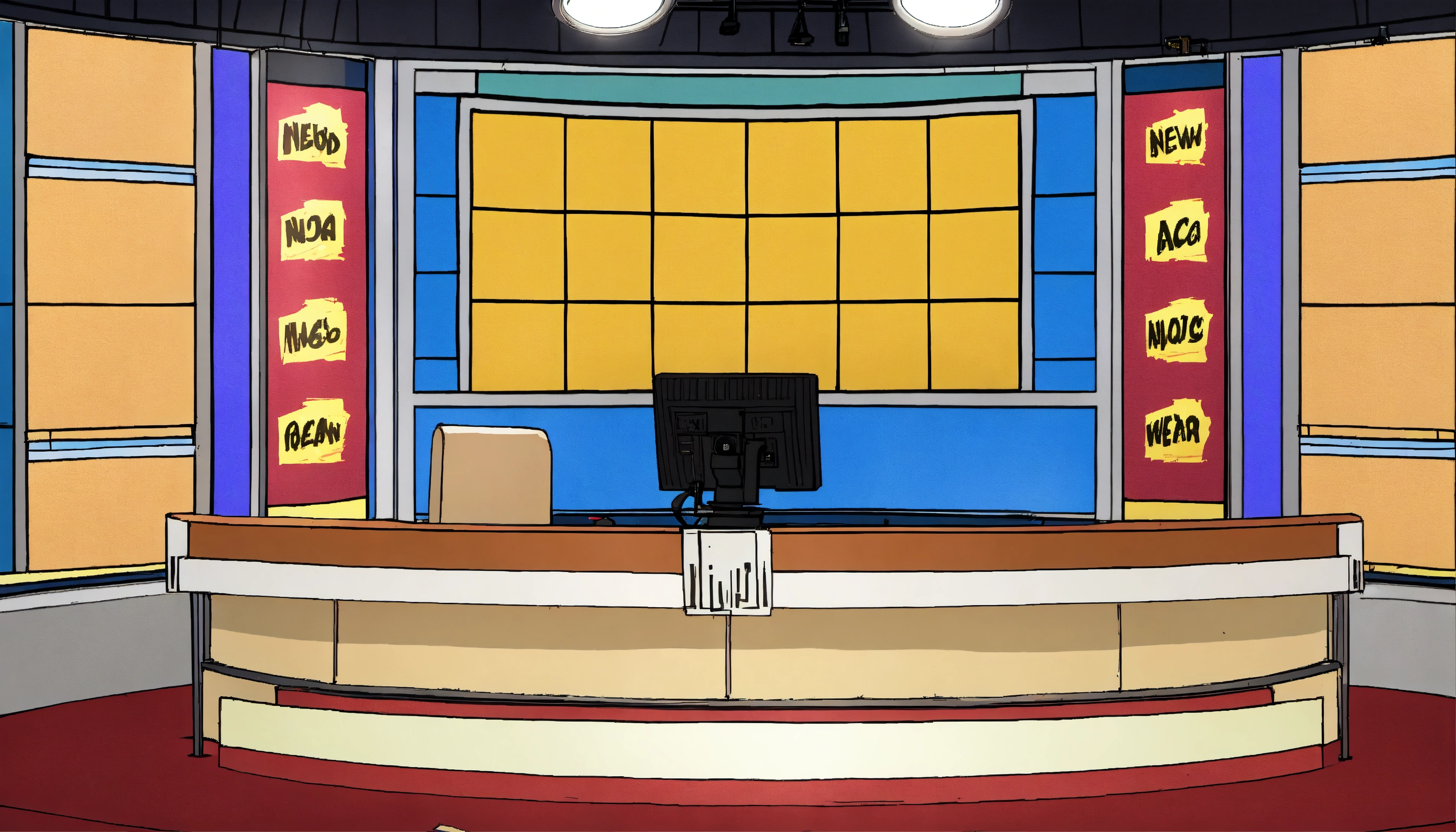 An empty cartoon news studio